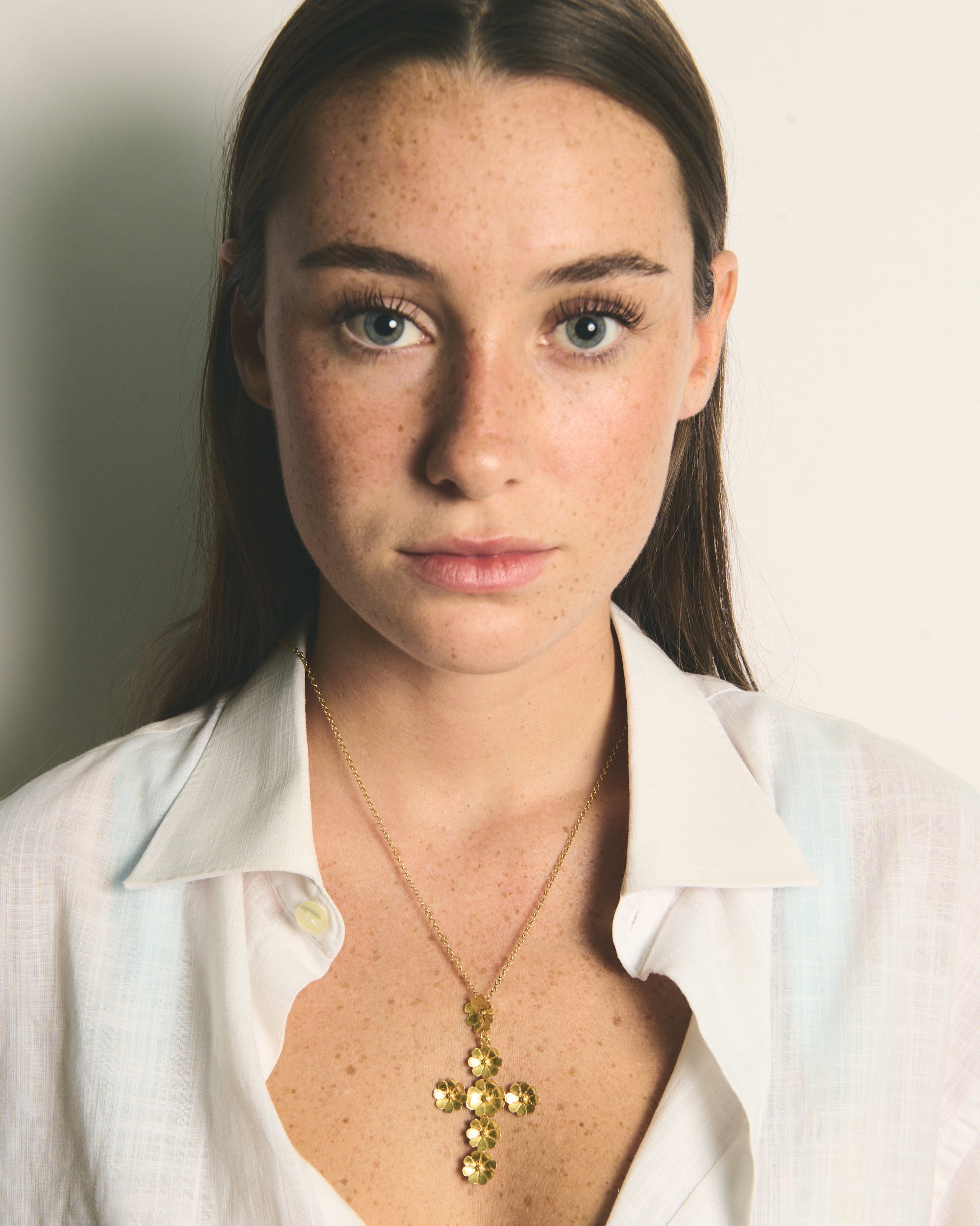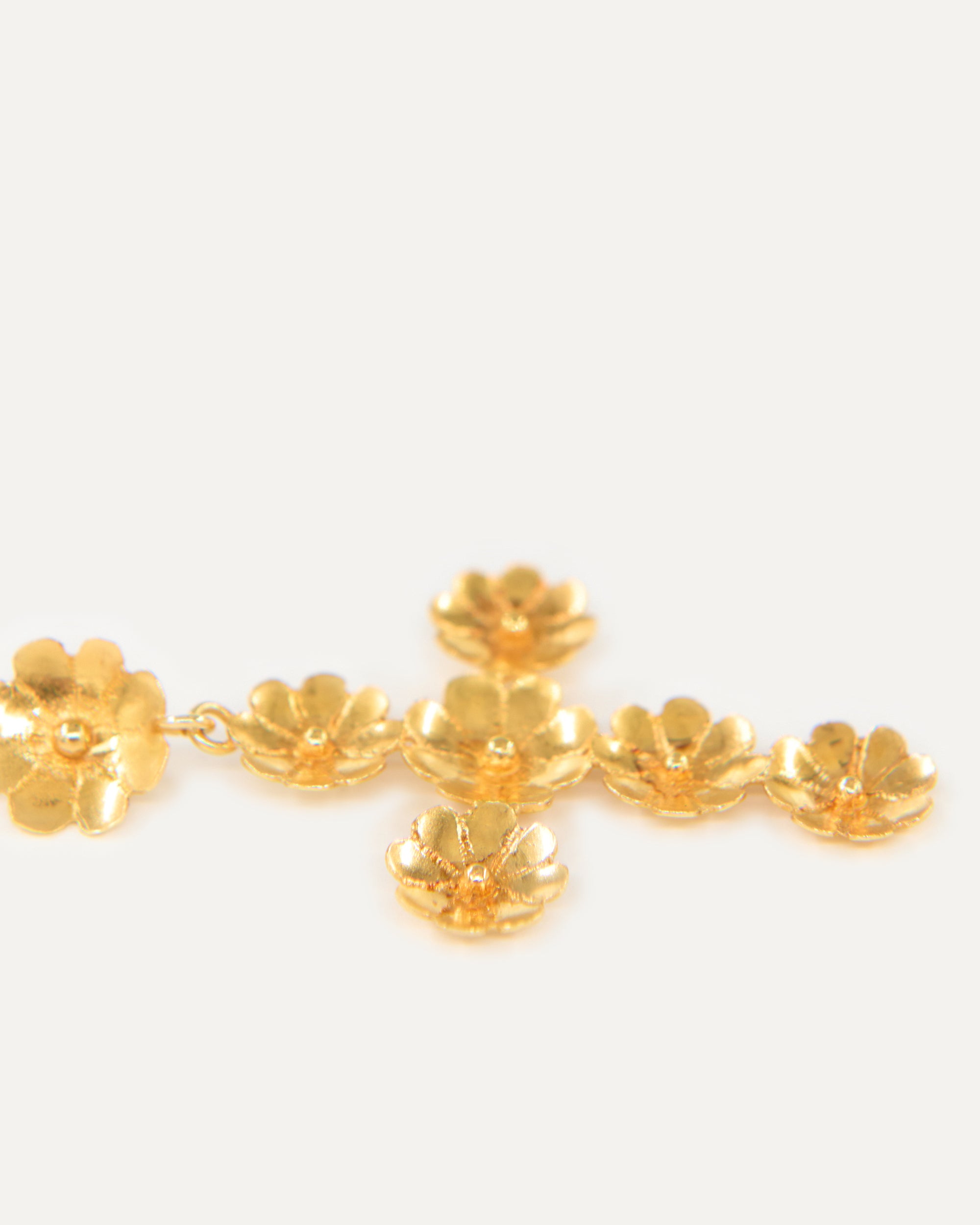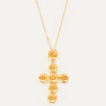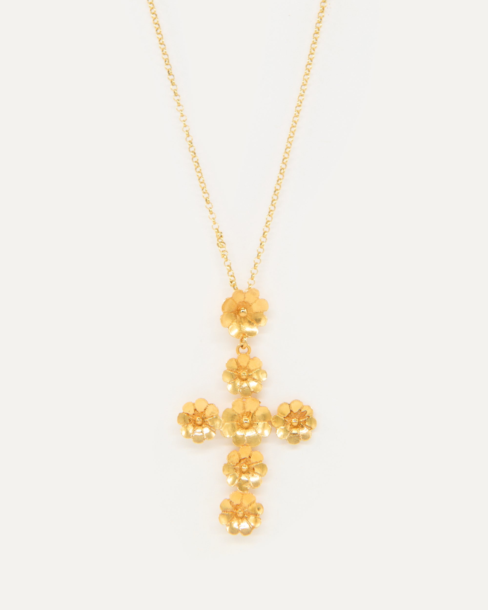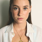 Este colgante es un diseño propio de Elisa basado en dos pilares fundamentales de la tradición ibicenca: la cruz y las flores. La diseñadora quería dedicarle esta joya a Sant Elm, la iglesia de La Marina donde vive la Virgen del Carmen, patrona y protectora de los marineros y de los amantes del mar, además de ser el lugar donde se casaron los padres de la artista ibicenca y la bautizaron a ella y a sus dos hermanas.