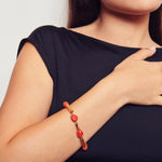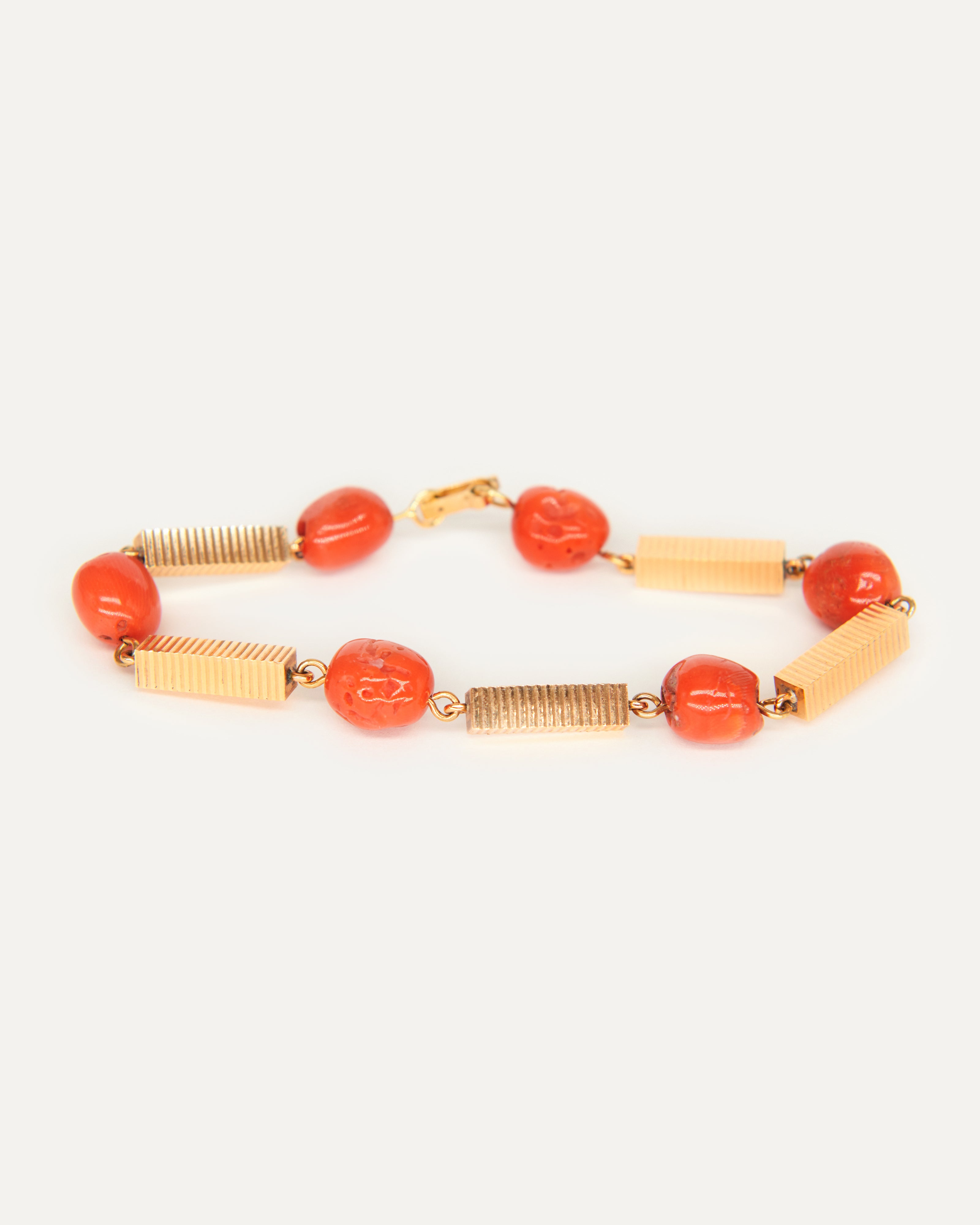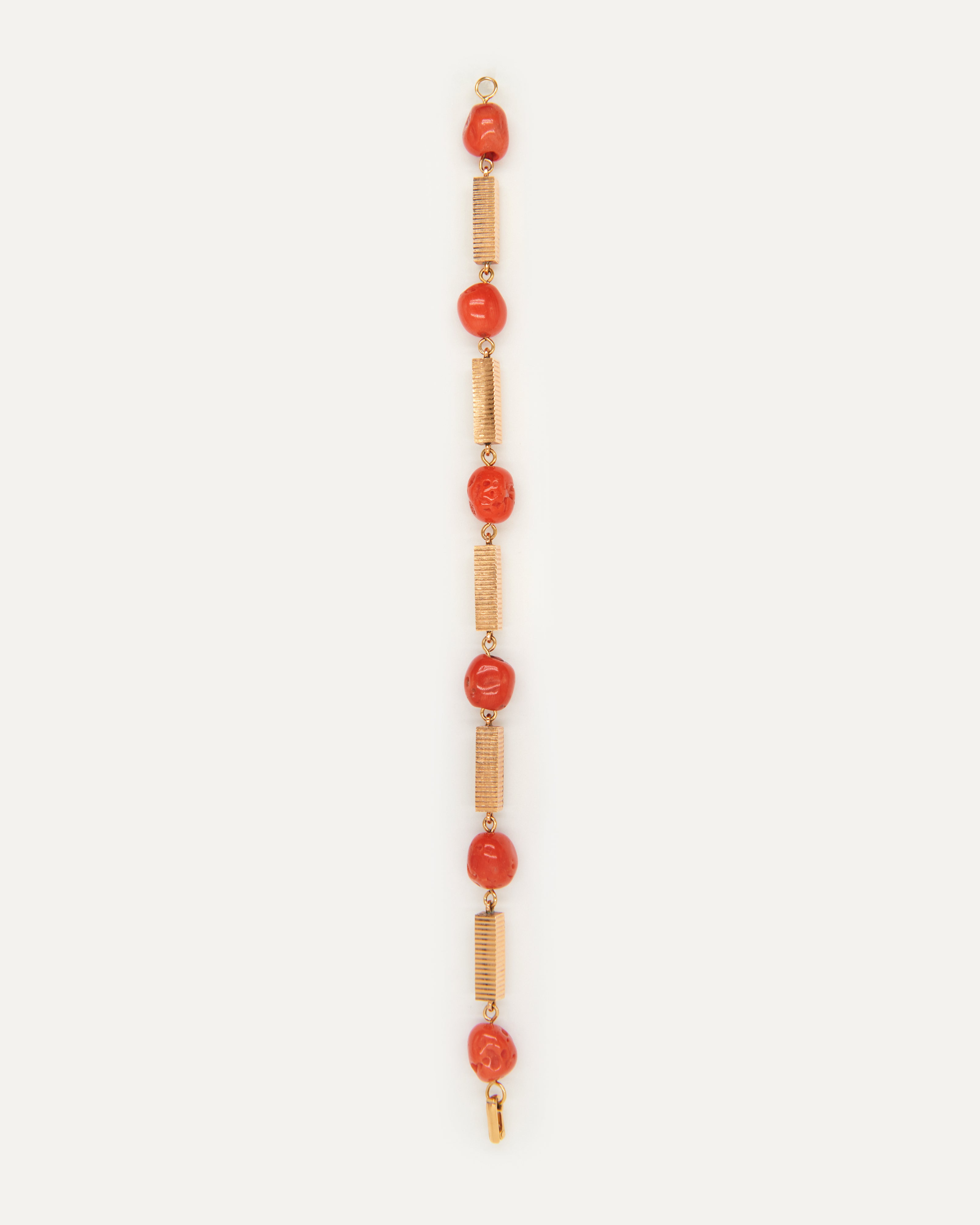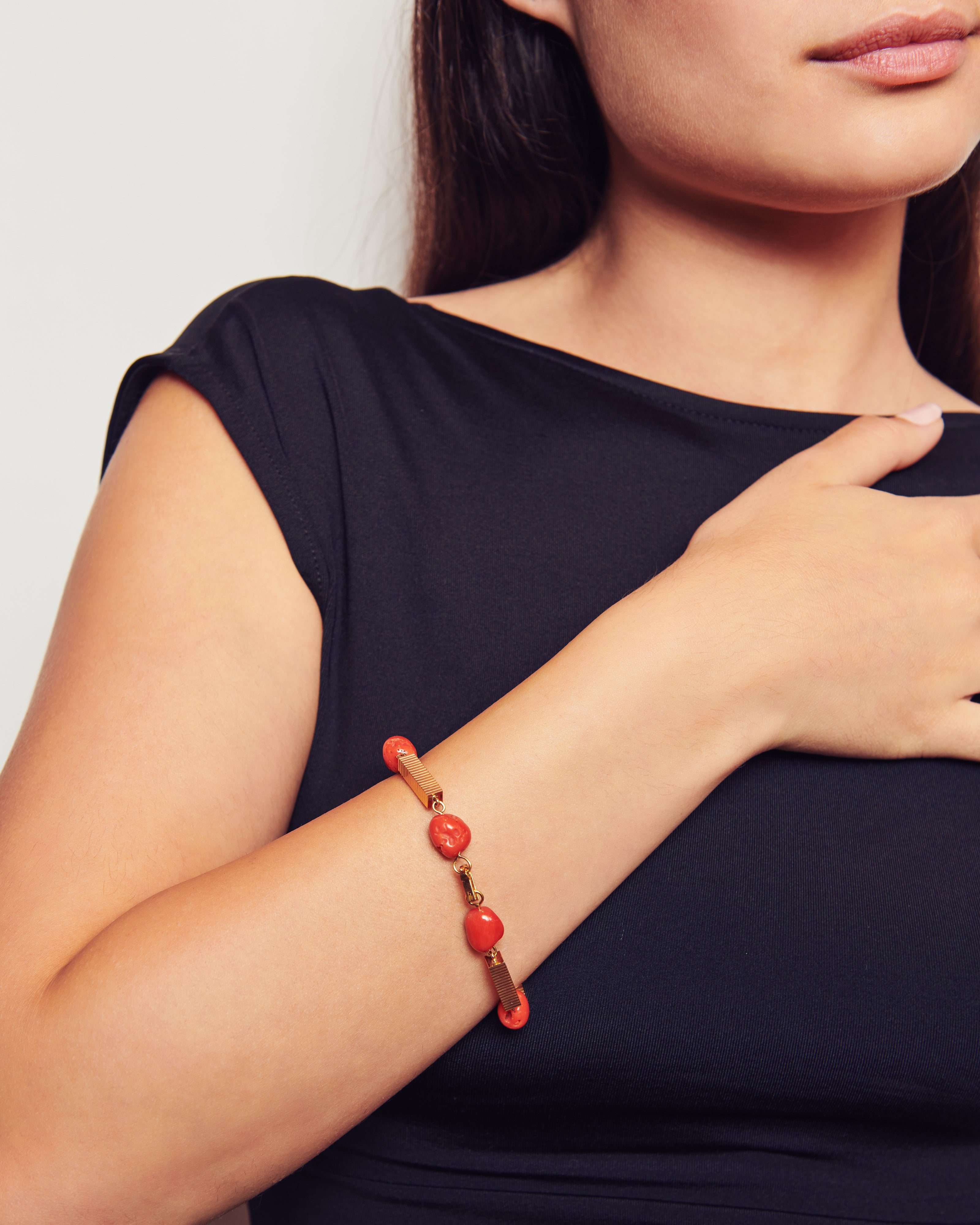 This 'vintage' bracelet from the brand is a tribute to Es Muro, a centuries-old wall connecting the harbor of Ibiza with the lighthouse, where all island residents used to walk, rest, or swim in the past. These solid gold bars simulate walls and are accompanied by coral gemstones, a common element in the Mediterranean sea.