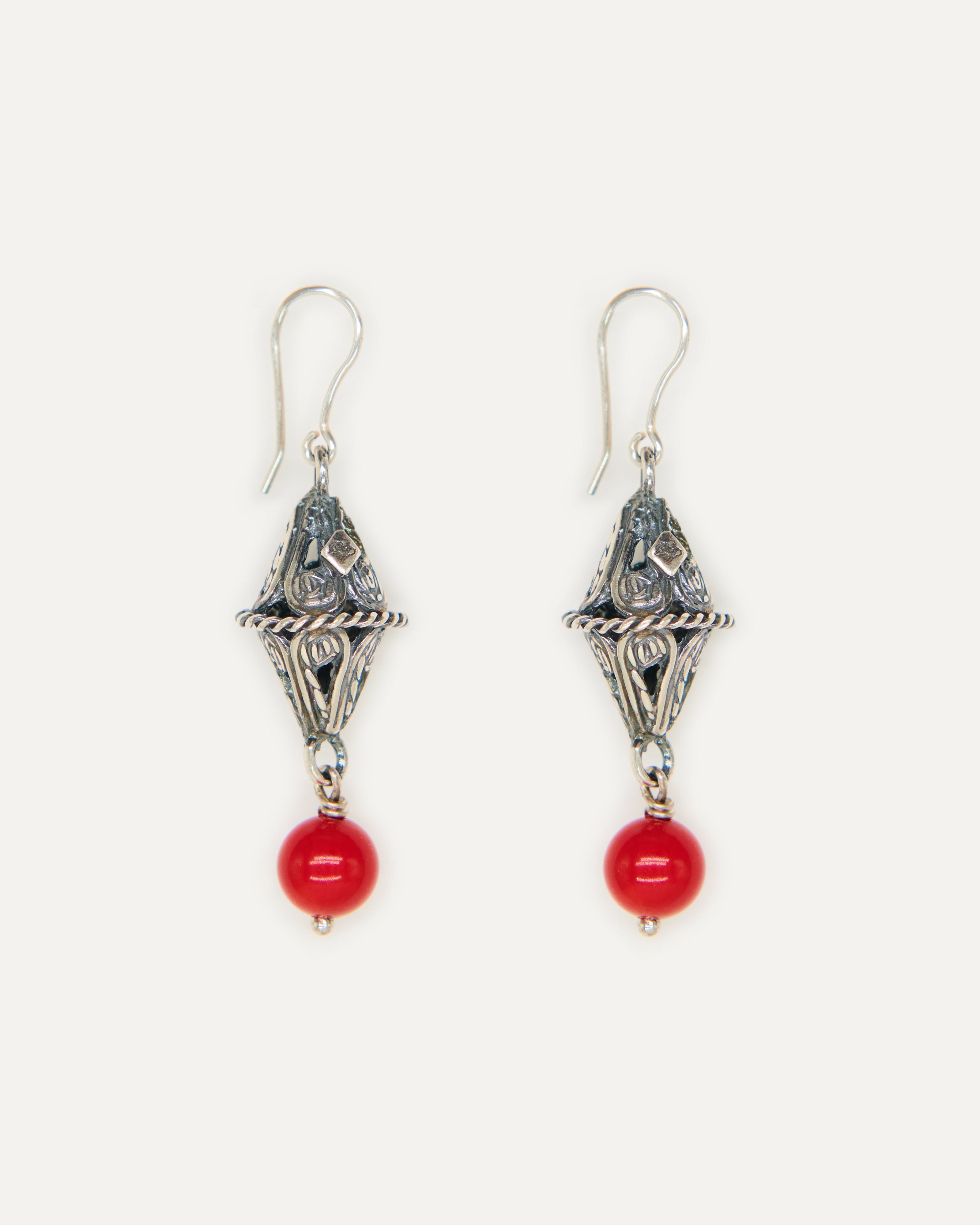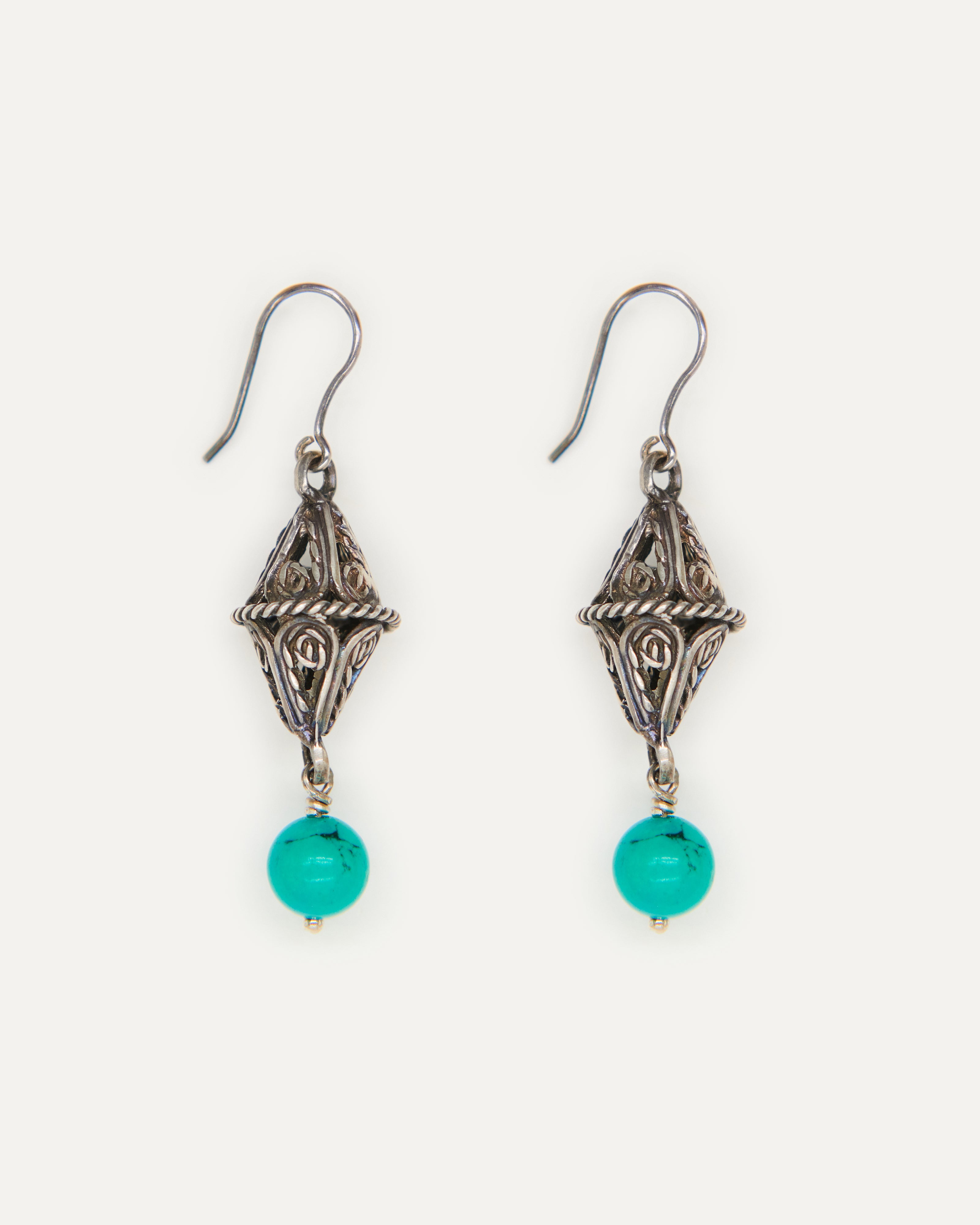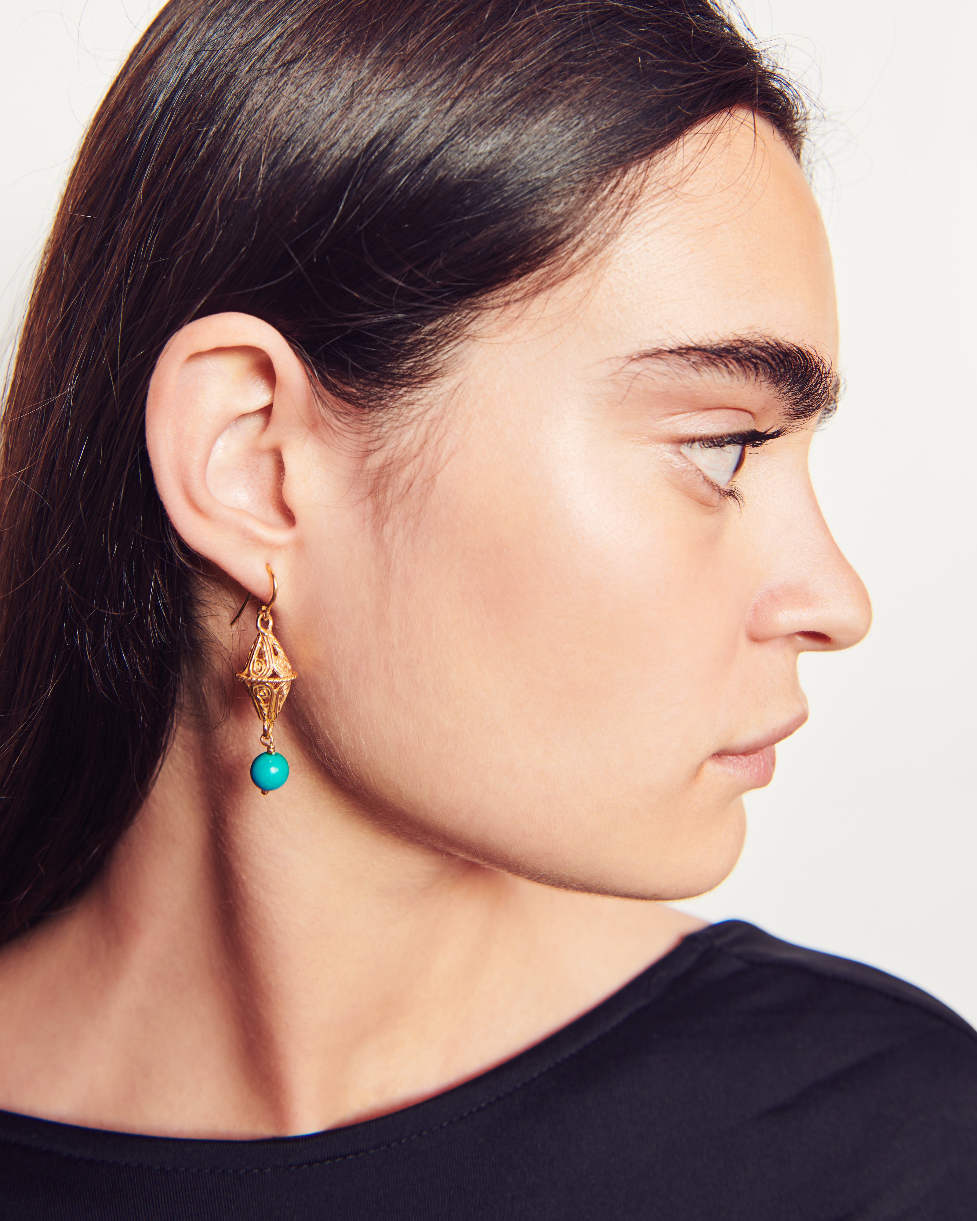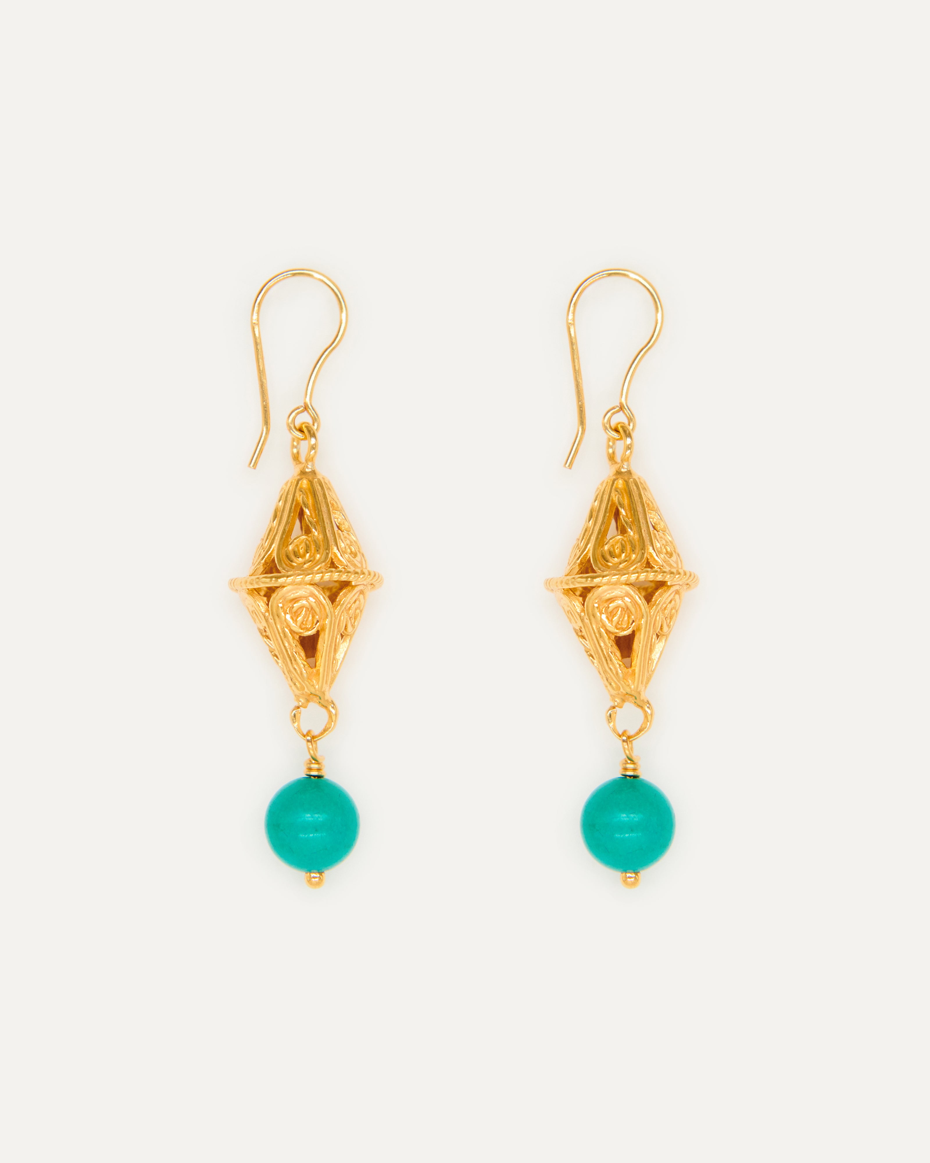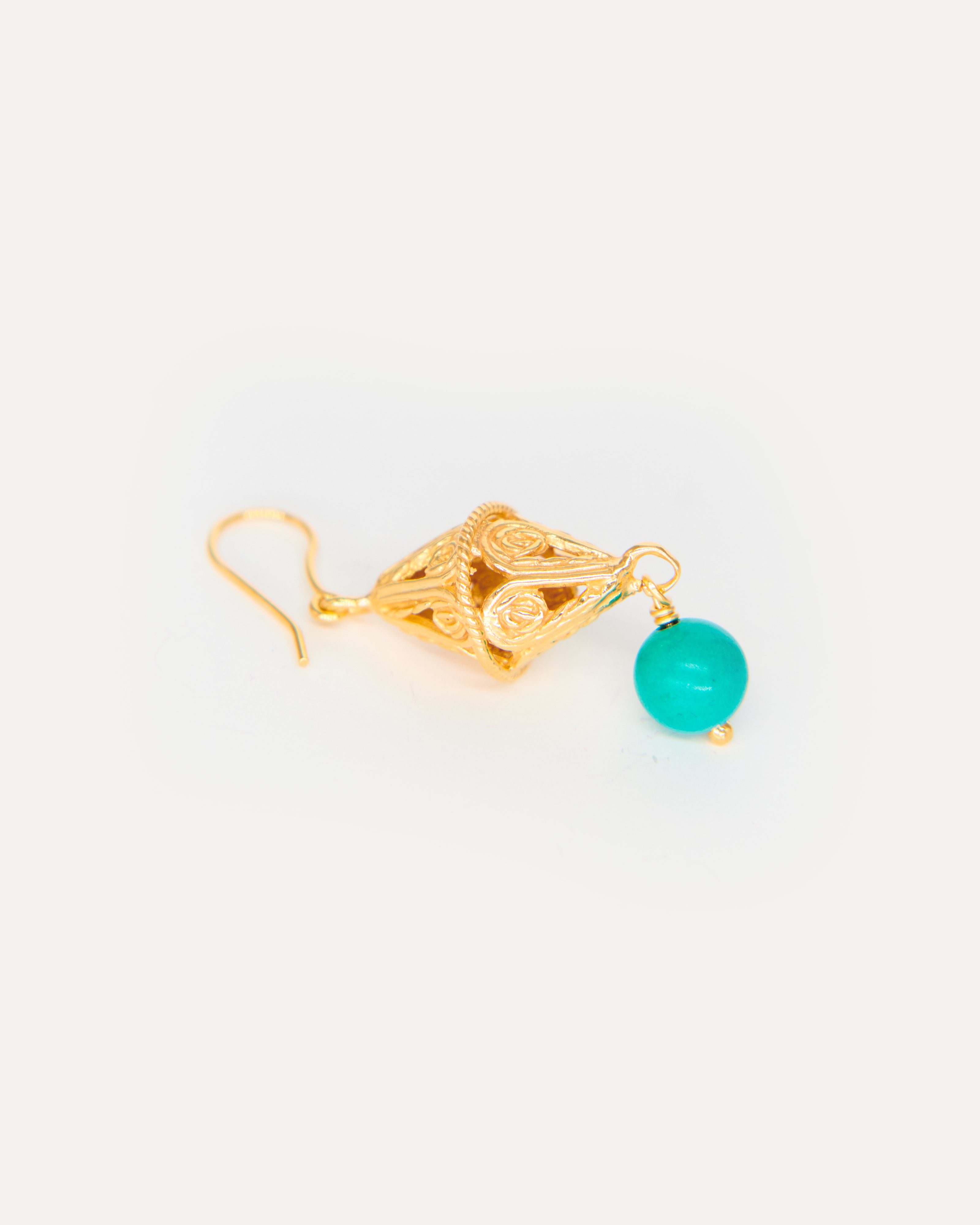 Earrings inspired by the 'Gra d'Ordi' from the Ibiza Emprendada. The name 'Gra d'Ordi' derives from the resemblance of the jewel, which is rhomboid-shaped, to the barley grain so prevalent in the fields of Ibiza. This piece features a more baroque and elaborate design due to its filigree work with thick and twisted thread, giving it this intensity. Elisa always enjoys creating colorful variations of her designs, as in this case, where she added semi-precious stones such as coral, turquoise or onyx.