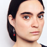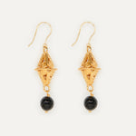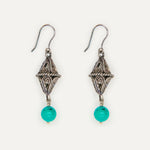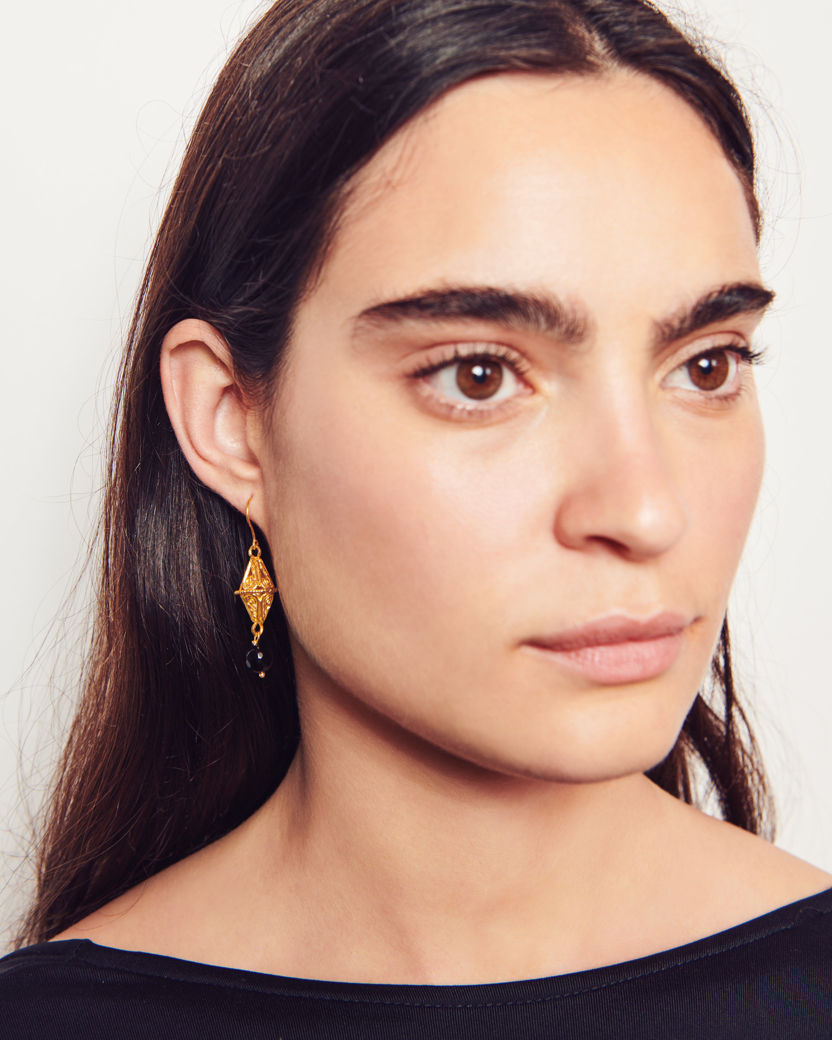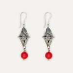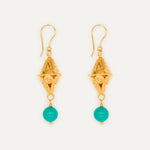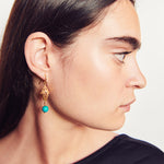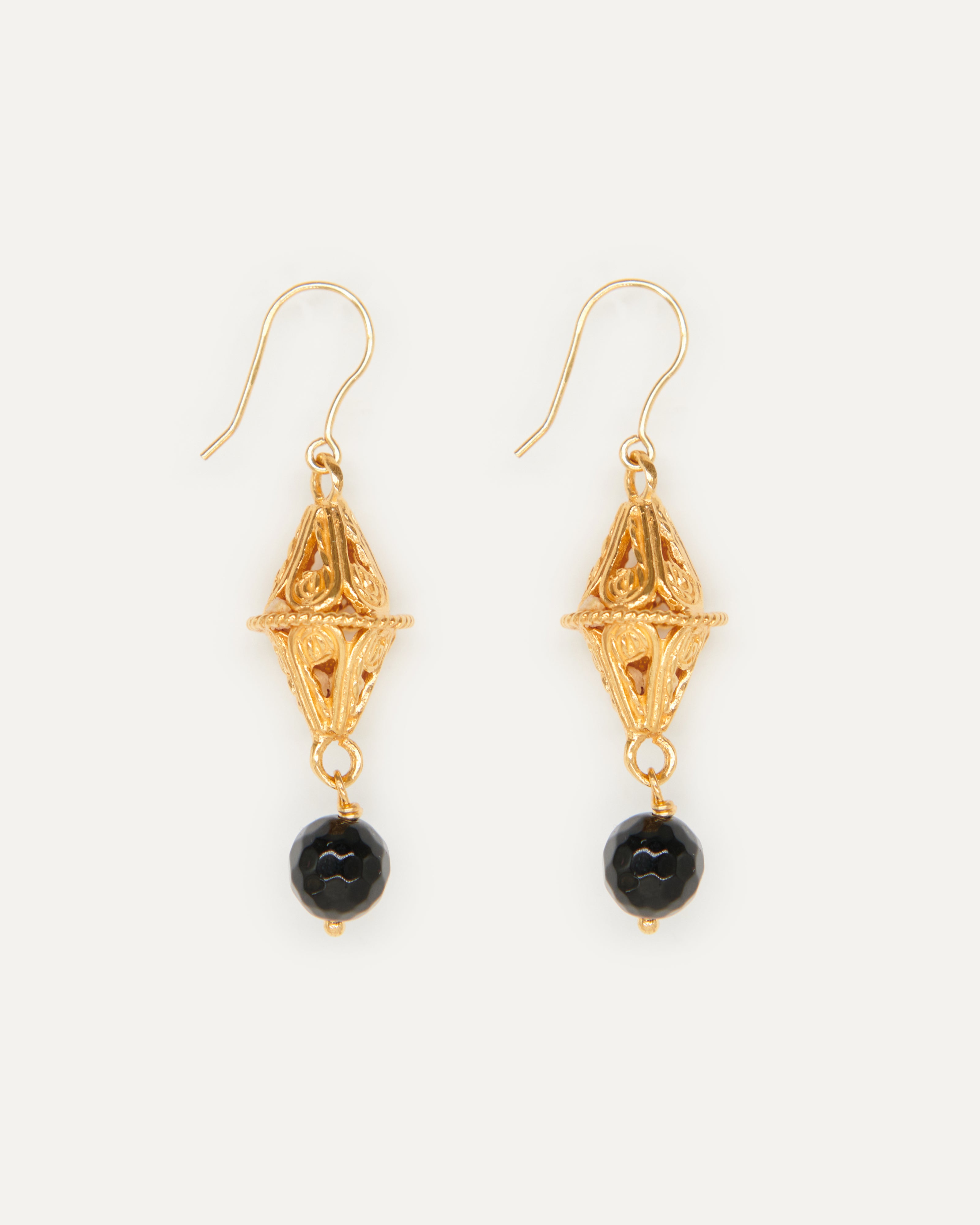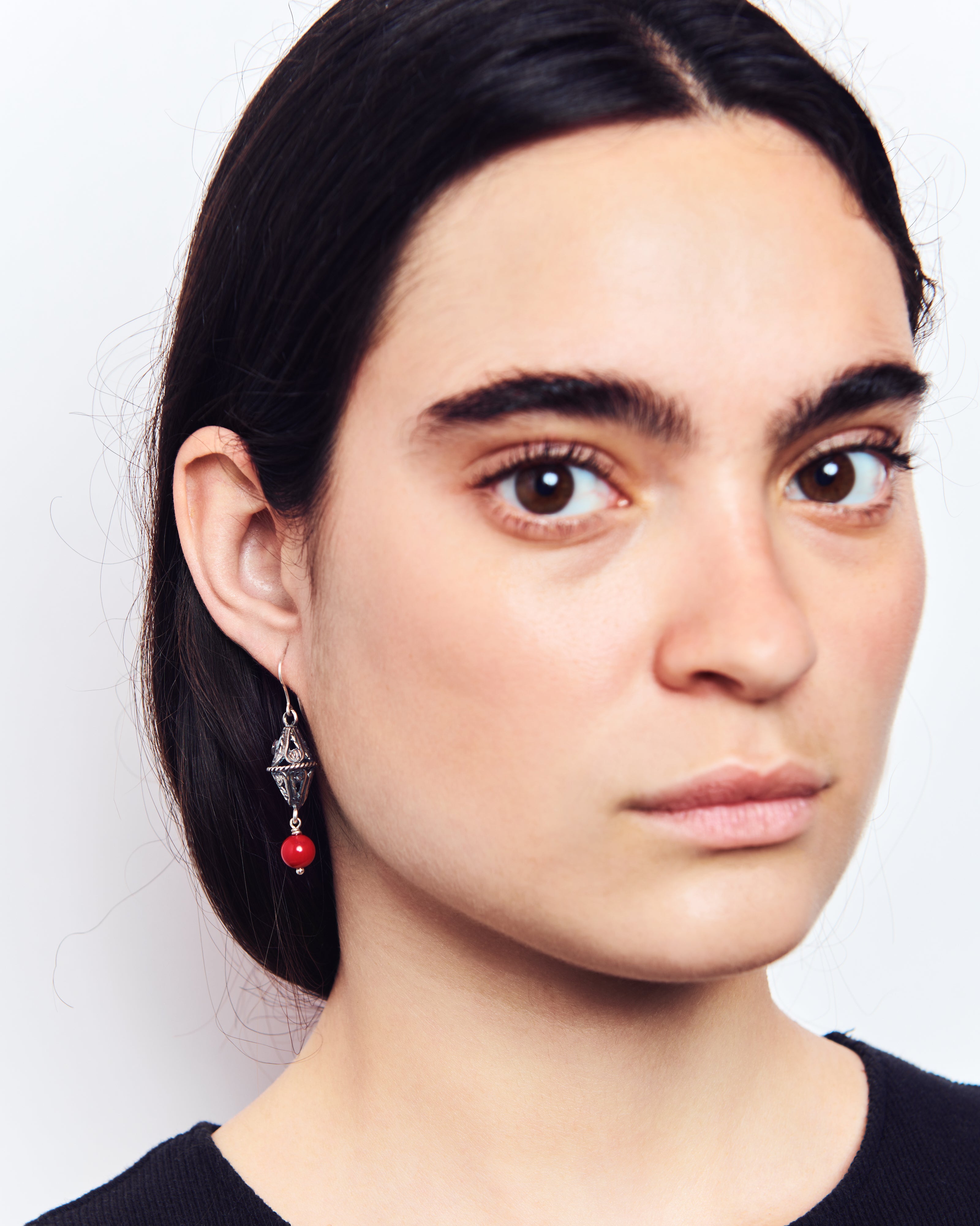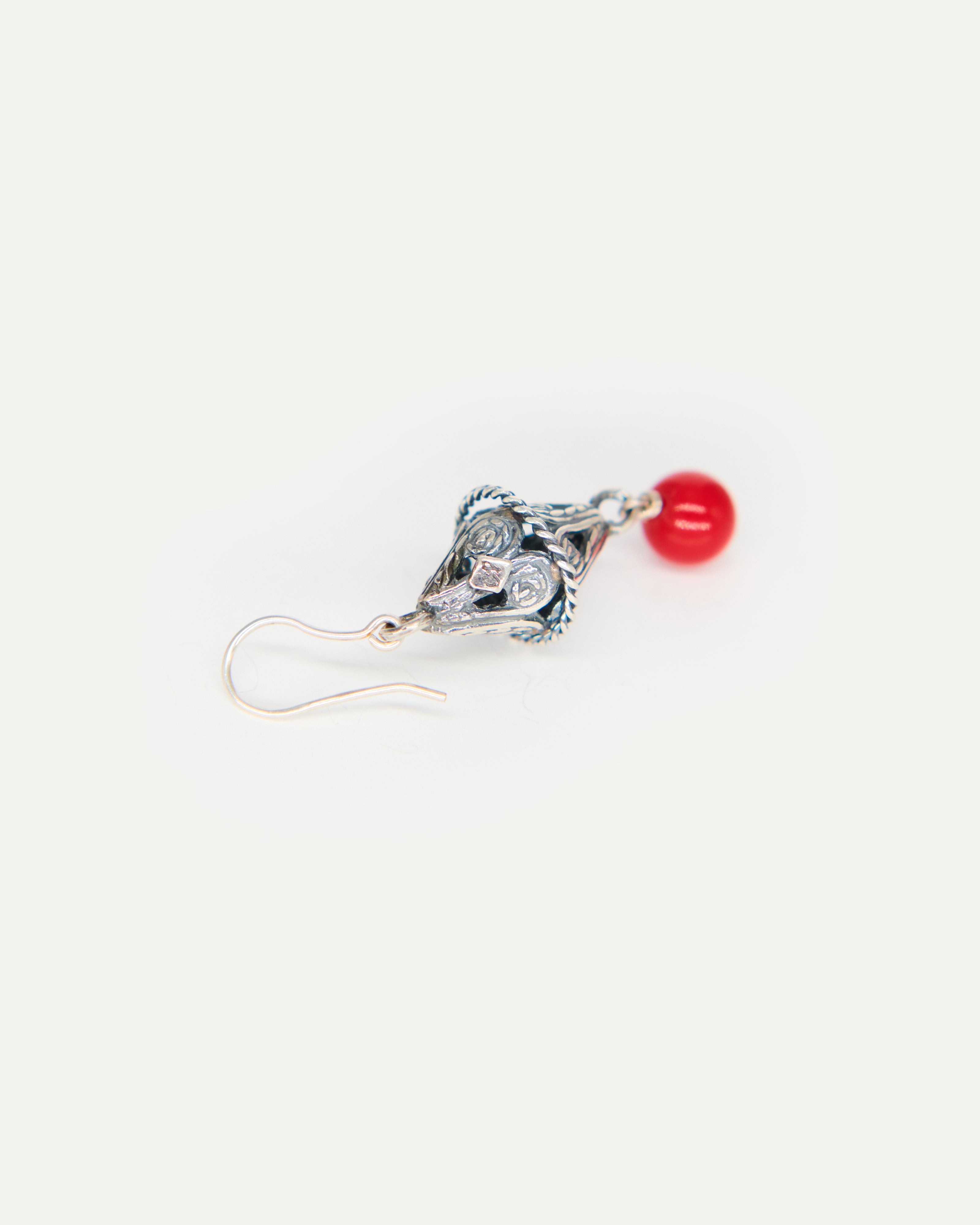 Earrings inspired by the 'Gra d'Ordi' from the Ibiza Emprendada. The name 'Gra d'Ordi' derives from the resemblance of the jewel, which is rhomboid-shaped, to the barley grain so prevalent in the fields of Ibiza. This piece features a more baroque and elaborate design due to its filigree work with thick and twisted thread, giving it this intensity. Elisa always enjoys creating colorful variations of her designs, as in this case, where she added semi-precious stones such as coral, turquoise or onyx.
