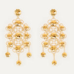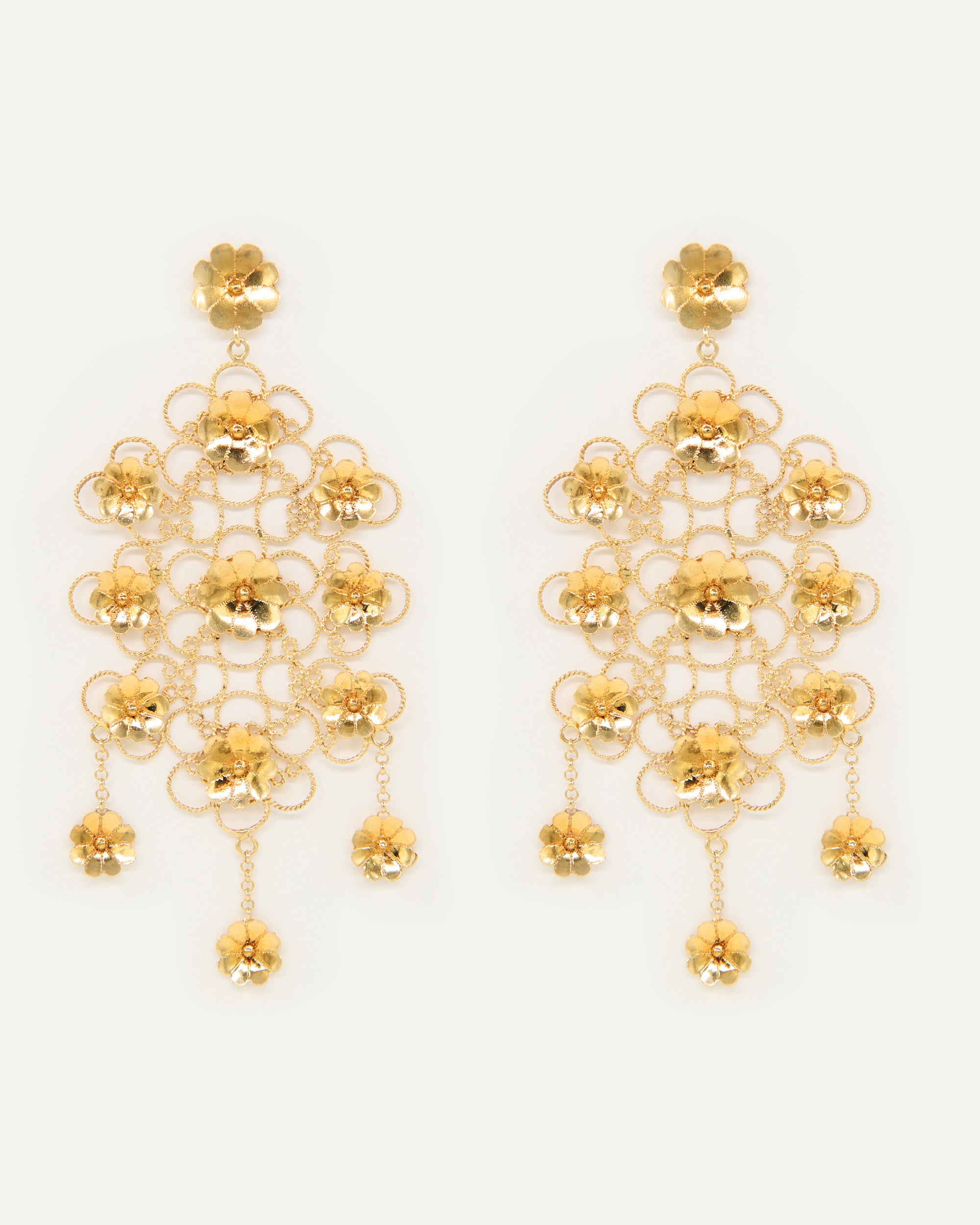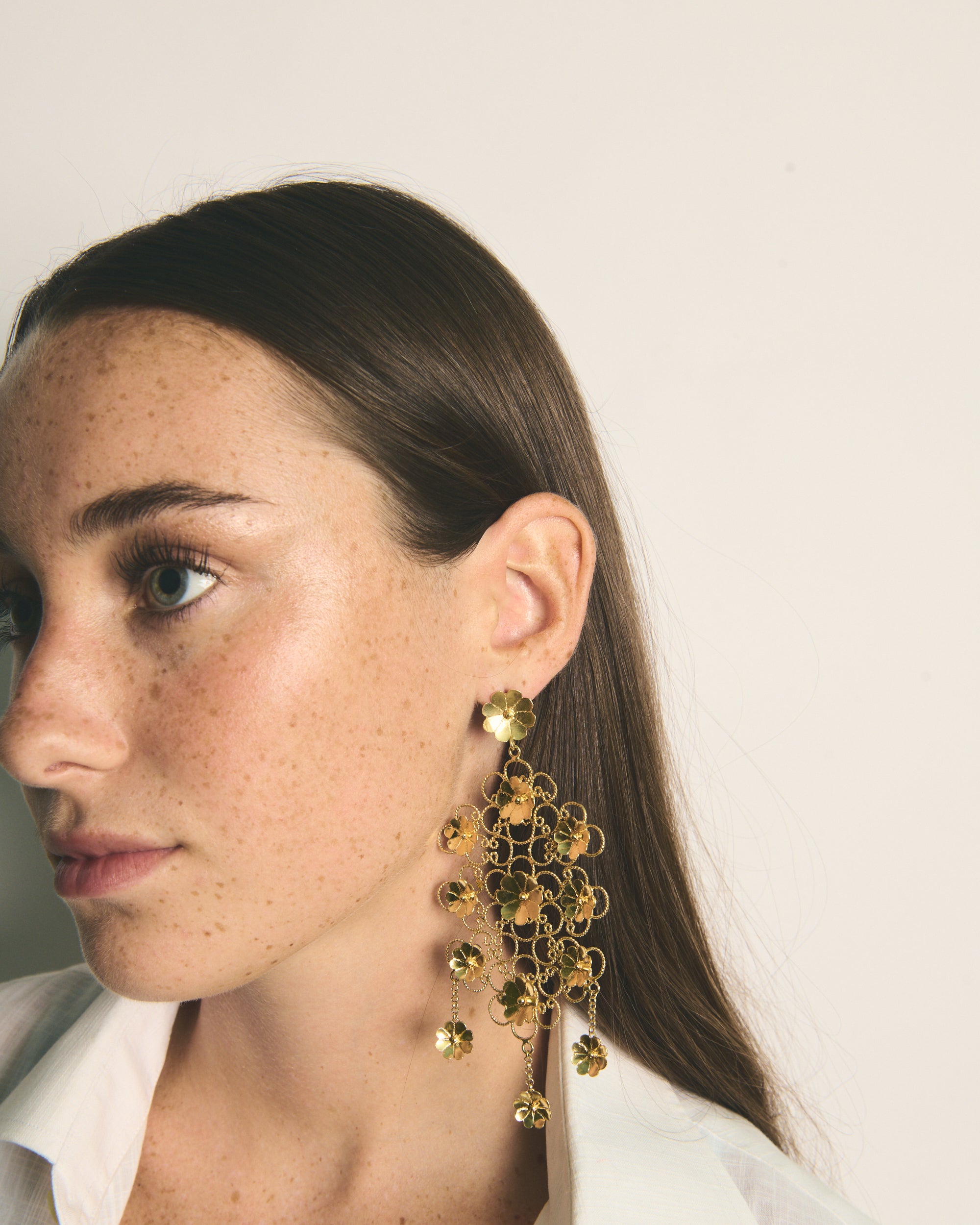 Pendientes inspirados en la Dolce Vita italiana. En estos pendientes se han combinado las flores ibicencas con un diseño extravagante y atrevido inspirándose en la vida italiana como símbolo de hermandad entre ambas culturas del mediterráneo. Desde el momento en el que comenzó a diseñarlos, Elisa se ha imaginado a Sophia Loren luciéndolos mientras conduce su Vespa azul por la Costa Amalfitana de los años 60.