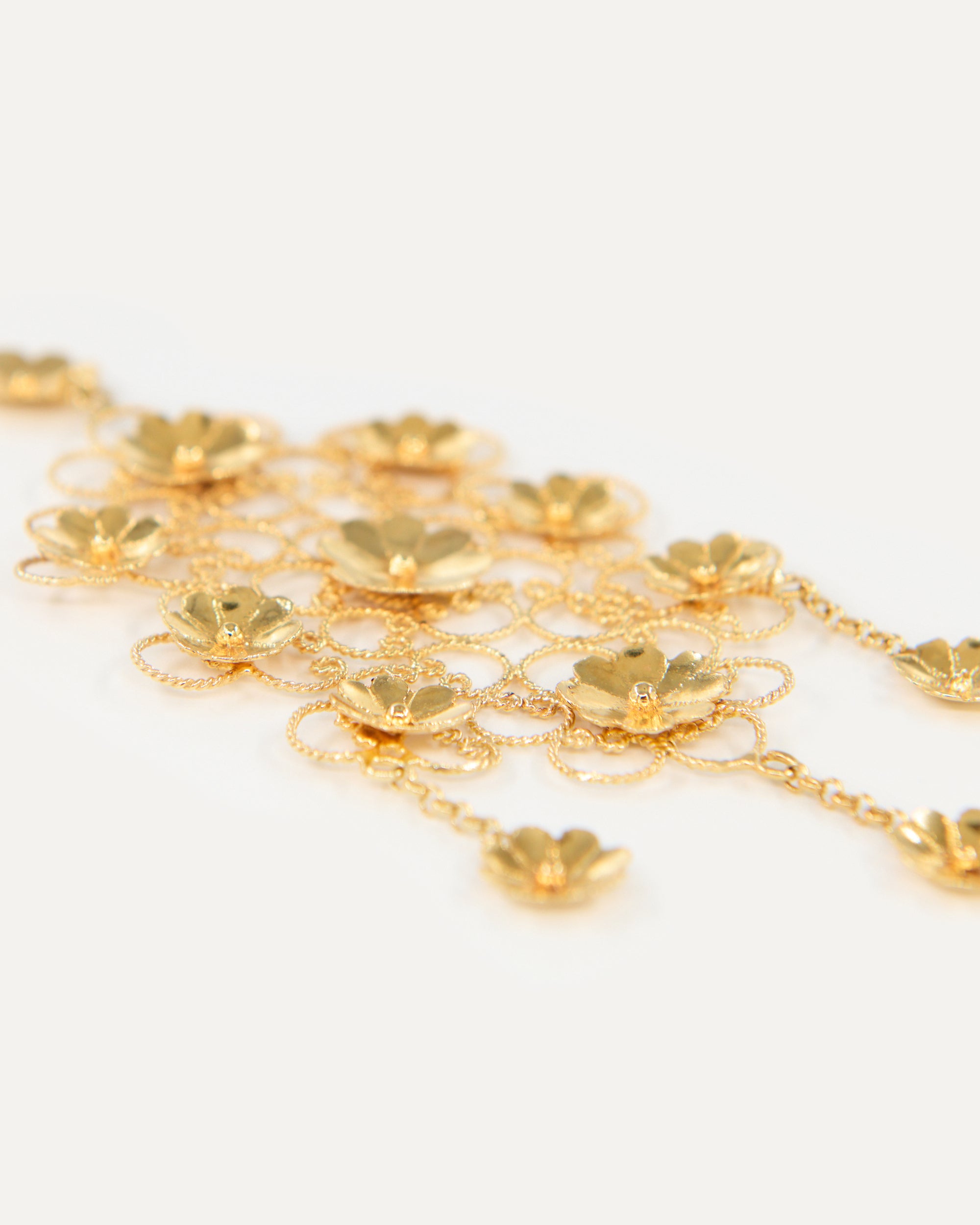 -Trabajo de filigrana con nueve flores incrustadas y tres cadenas con flores colgando