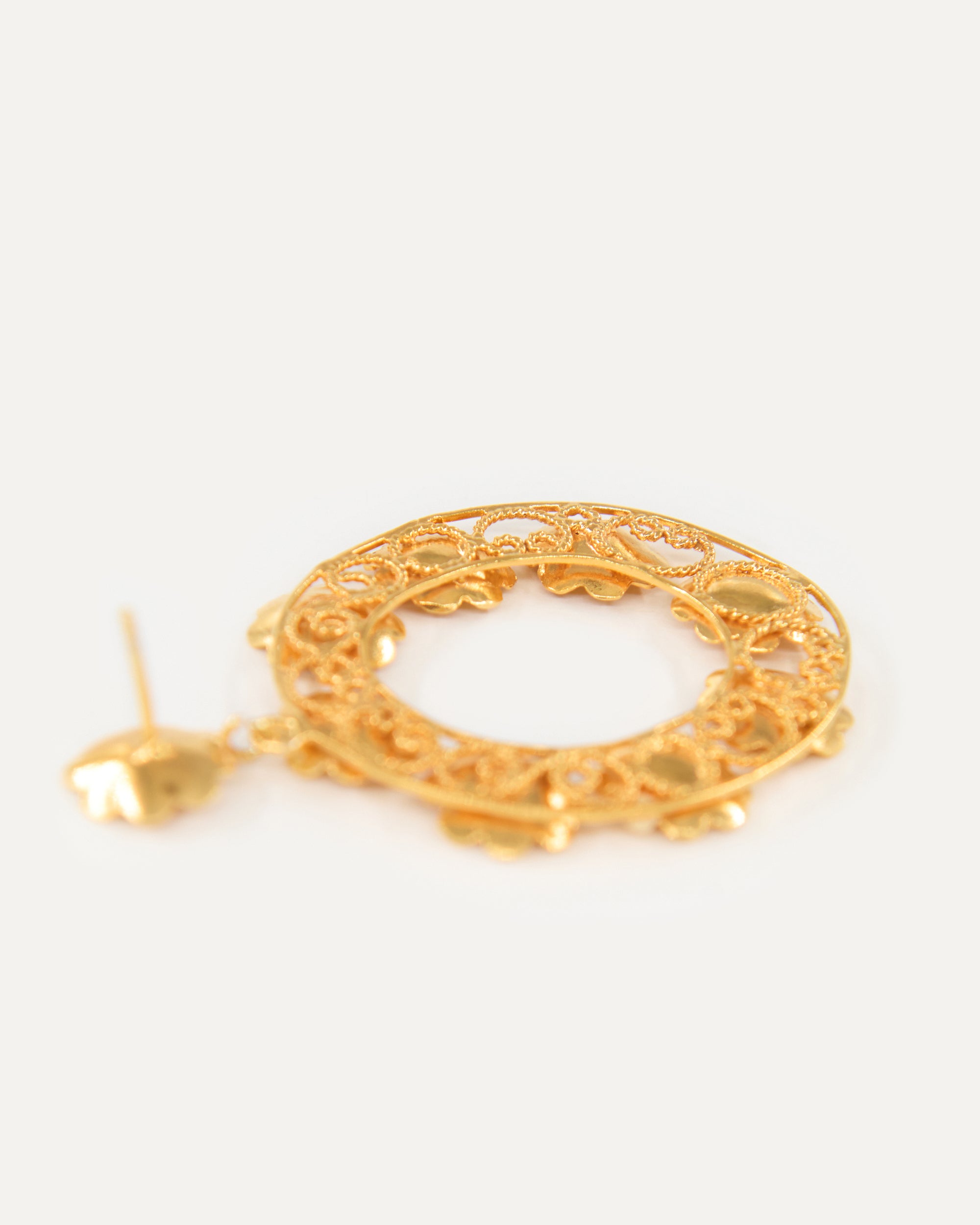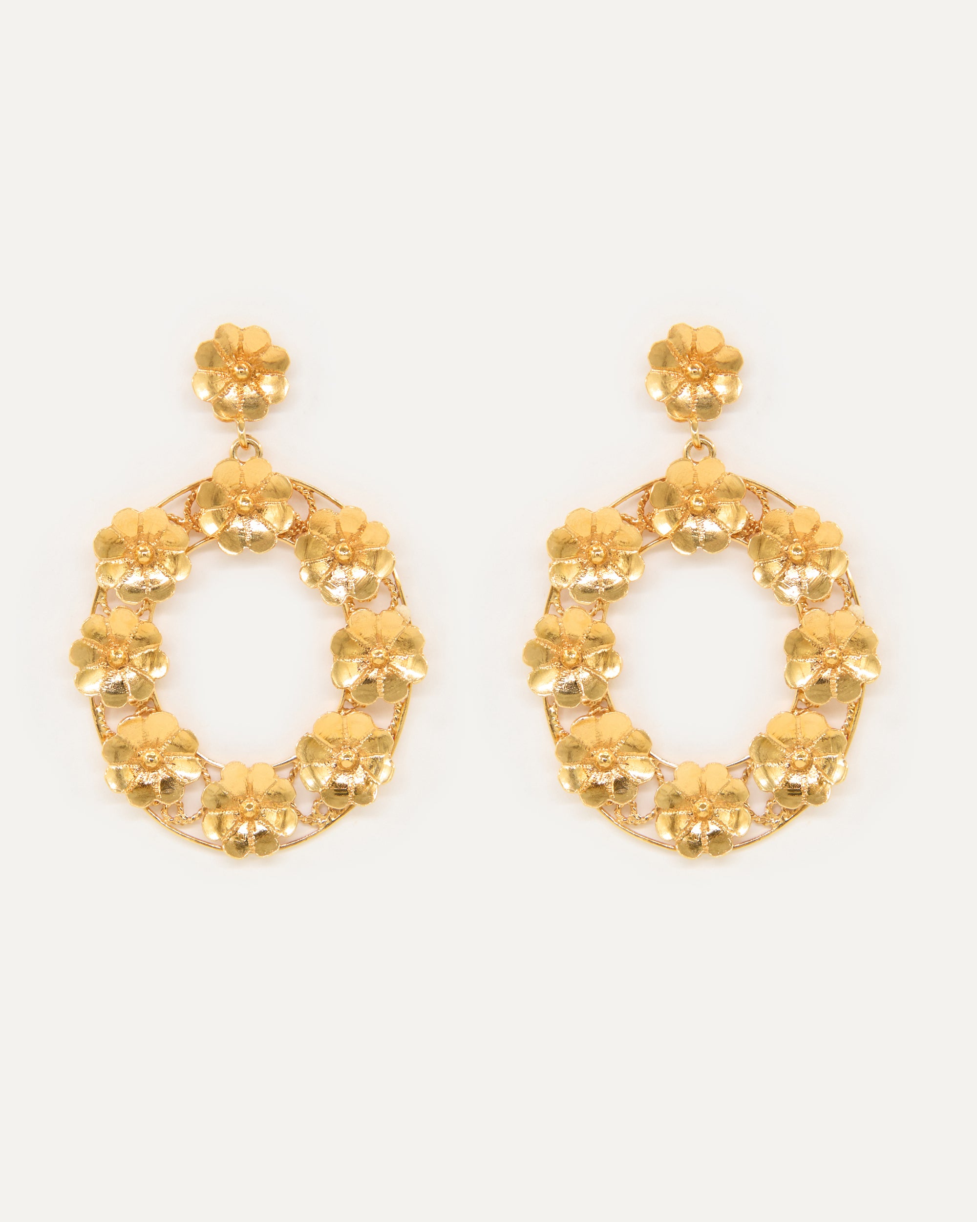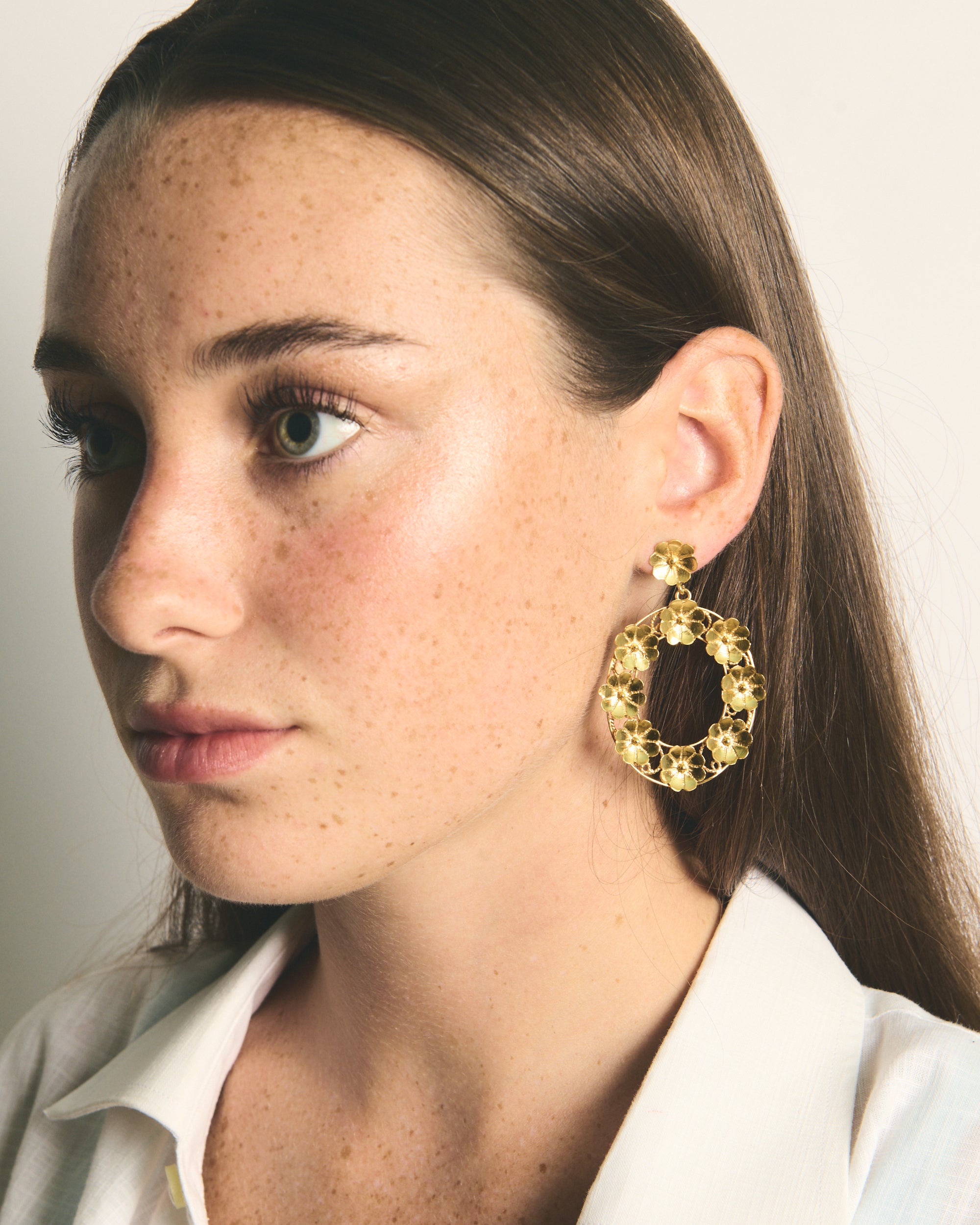 Pendientes inspirados en la clásica 'ferradura' ibicenca. A Elisa, esta tradicional pieza siempre le ha recordado a la Luna, un elemento muy influyente en el movimiento del mar, gran inspiración para la diseñadora y desencadenante de una evolución a diferentes diseños actualmente esenciales para la marca. En estos pendientes, la diseñadora ha utilizado las flores para resaltar el espacio vacío de la Luna Nueva.