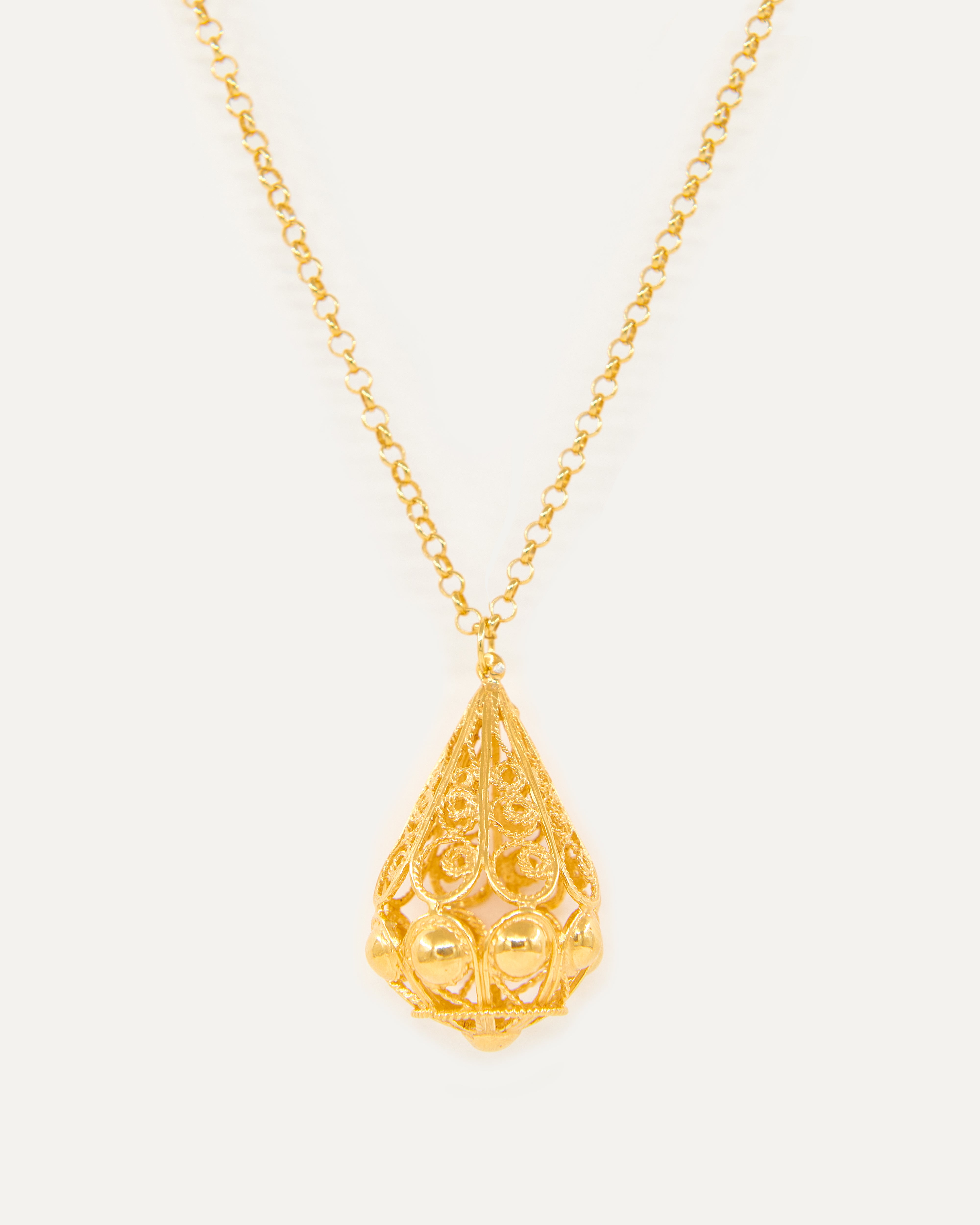Colgante inspirado en el tradicional botón de 'Jupetí'. El 'Jupetí' es el chaleco que usan los hombres para el baile tradicional ibicenco, el 'ball pagès', y que luce 24 botones de plata que van pasando de generación en generación. En este caso, Elisa ha optado por un diseño del botón más estilizado alargando su forma.