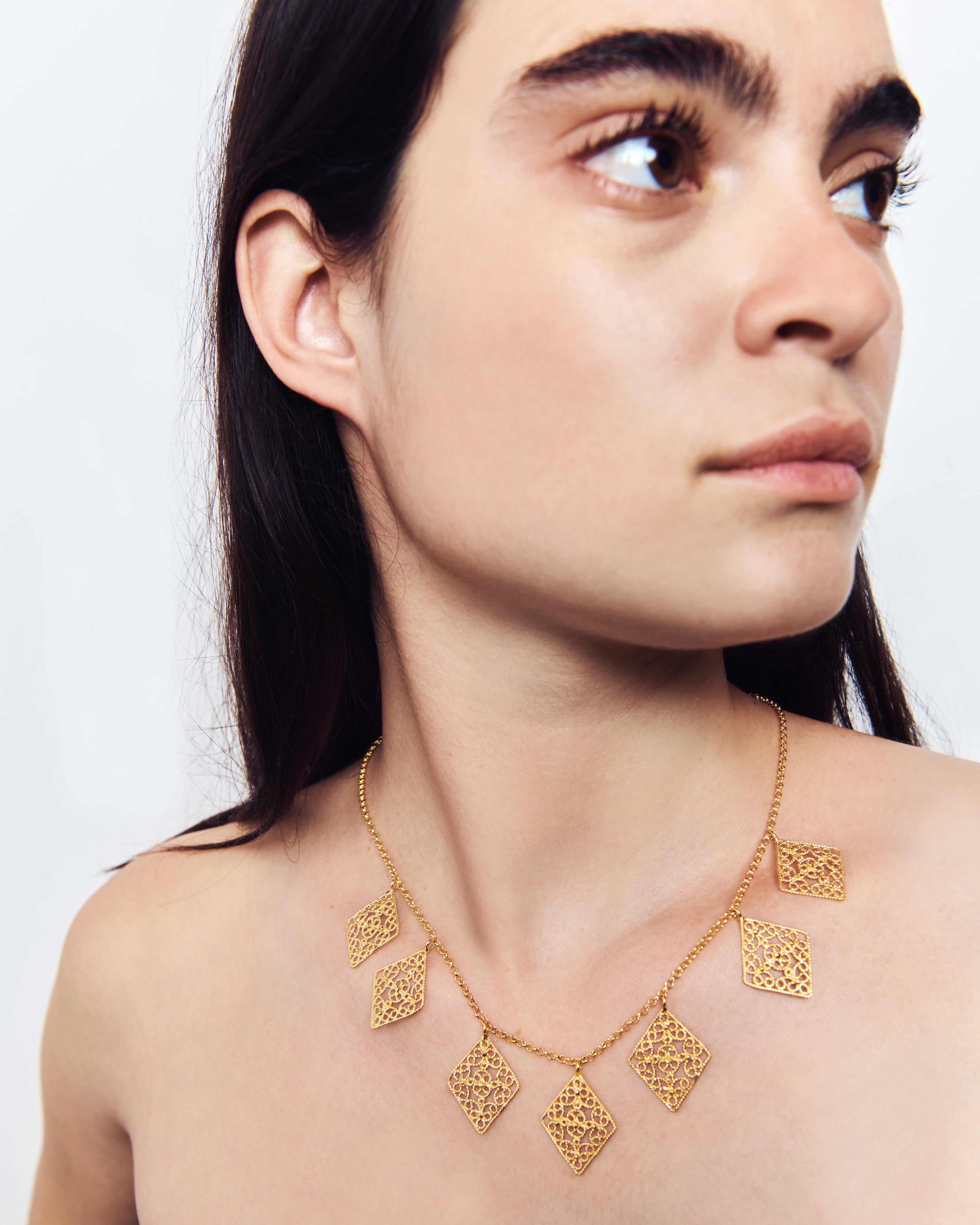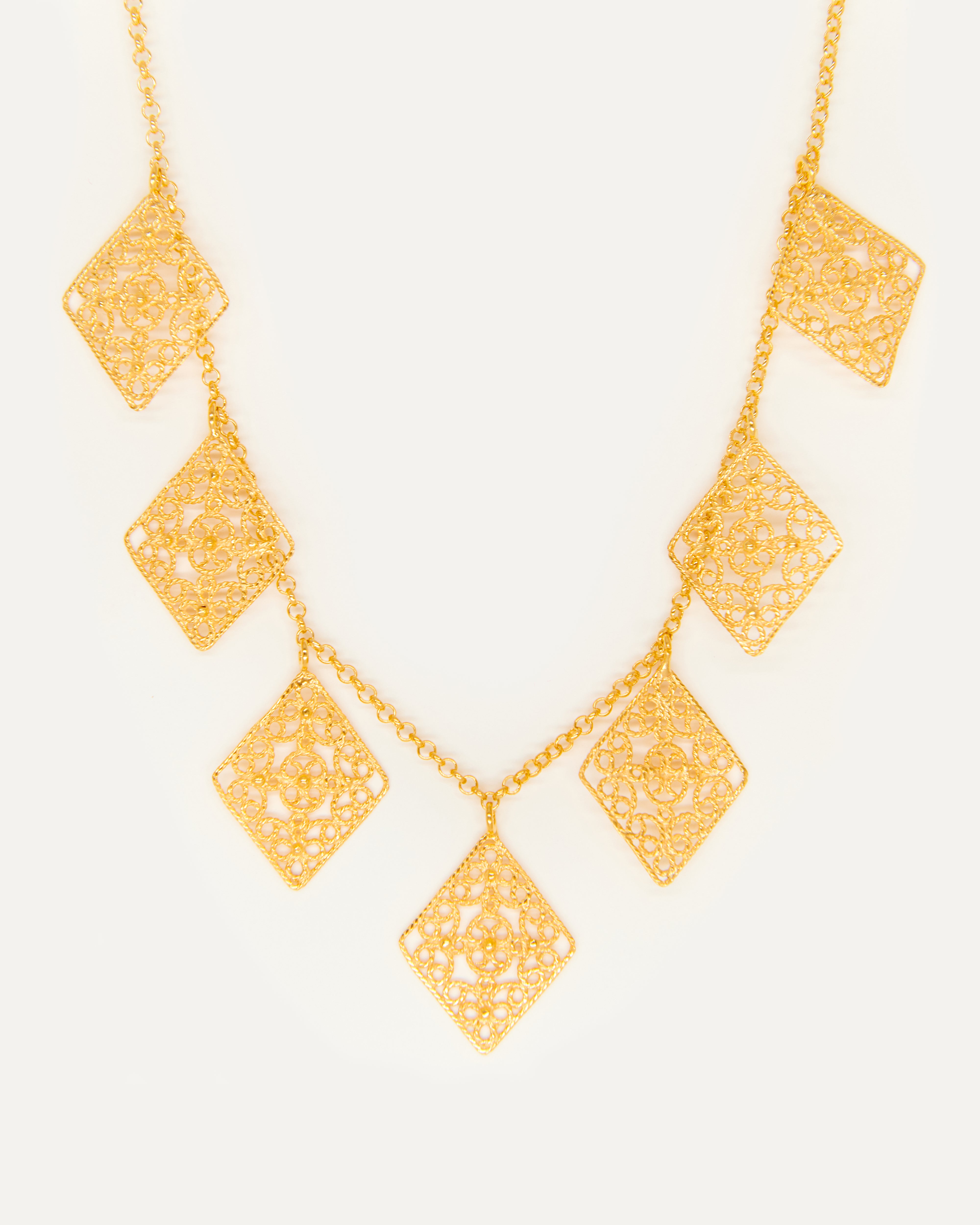 Collar con un diseño propio de Elisa e inspirados en el Gra d'Ordi de la Emprendada ibicenca. El nombre 'Gra d'Ordi' se debe a la similitud de la joya, que tiene forma de rombo, con el grano de la cebada que tan frecuentada era en los campos ibicencos. En este caso, la diseñadora ideó la filigrana plana con el objetivo de simplificar un trabajo tan elaborado como la filigrana que había usado en sus diseños anteriores. Además, lo convierte en collar a modo de amuleto y de homenaje a los collares que lucía Tanit, diosa fenicia de Ibiza.