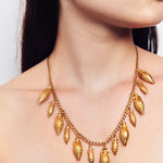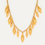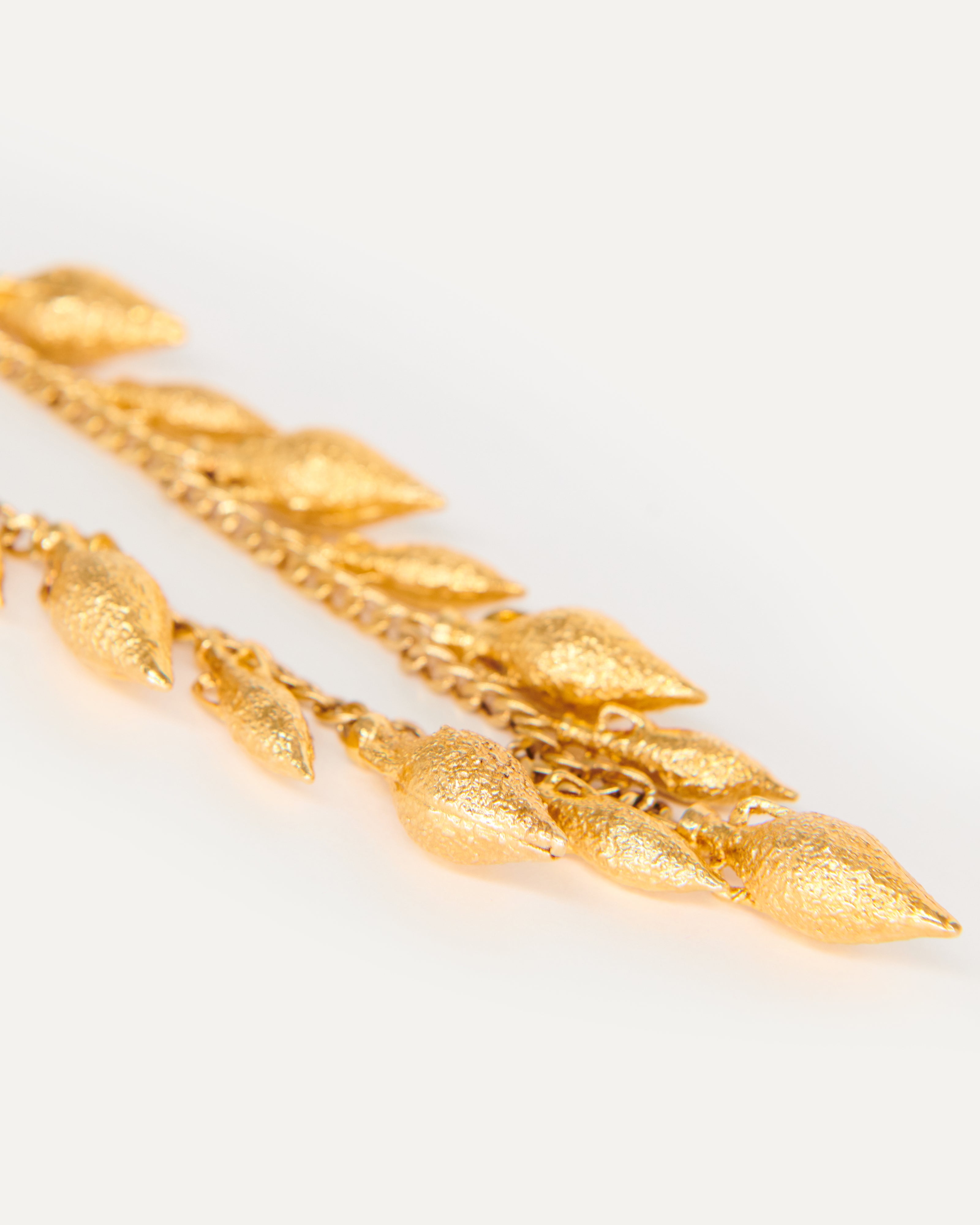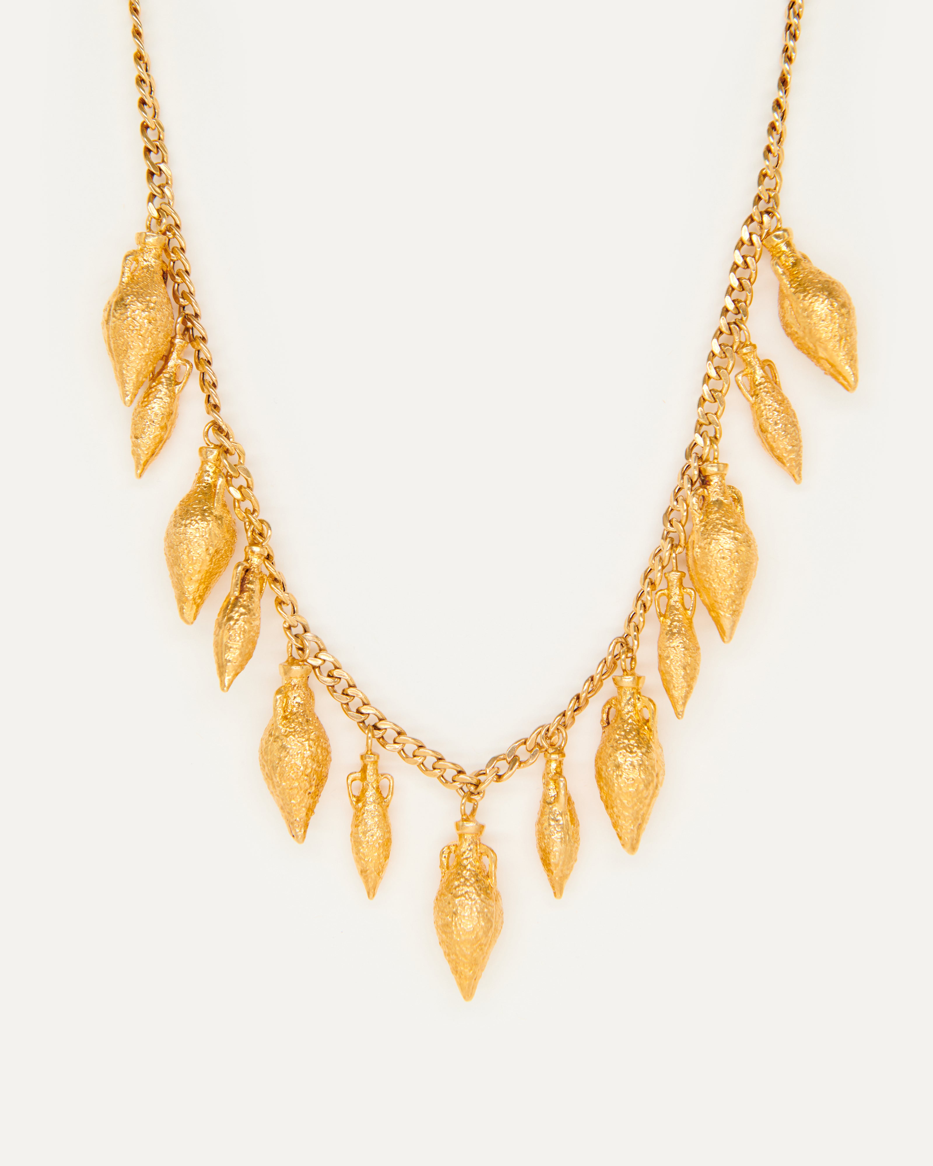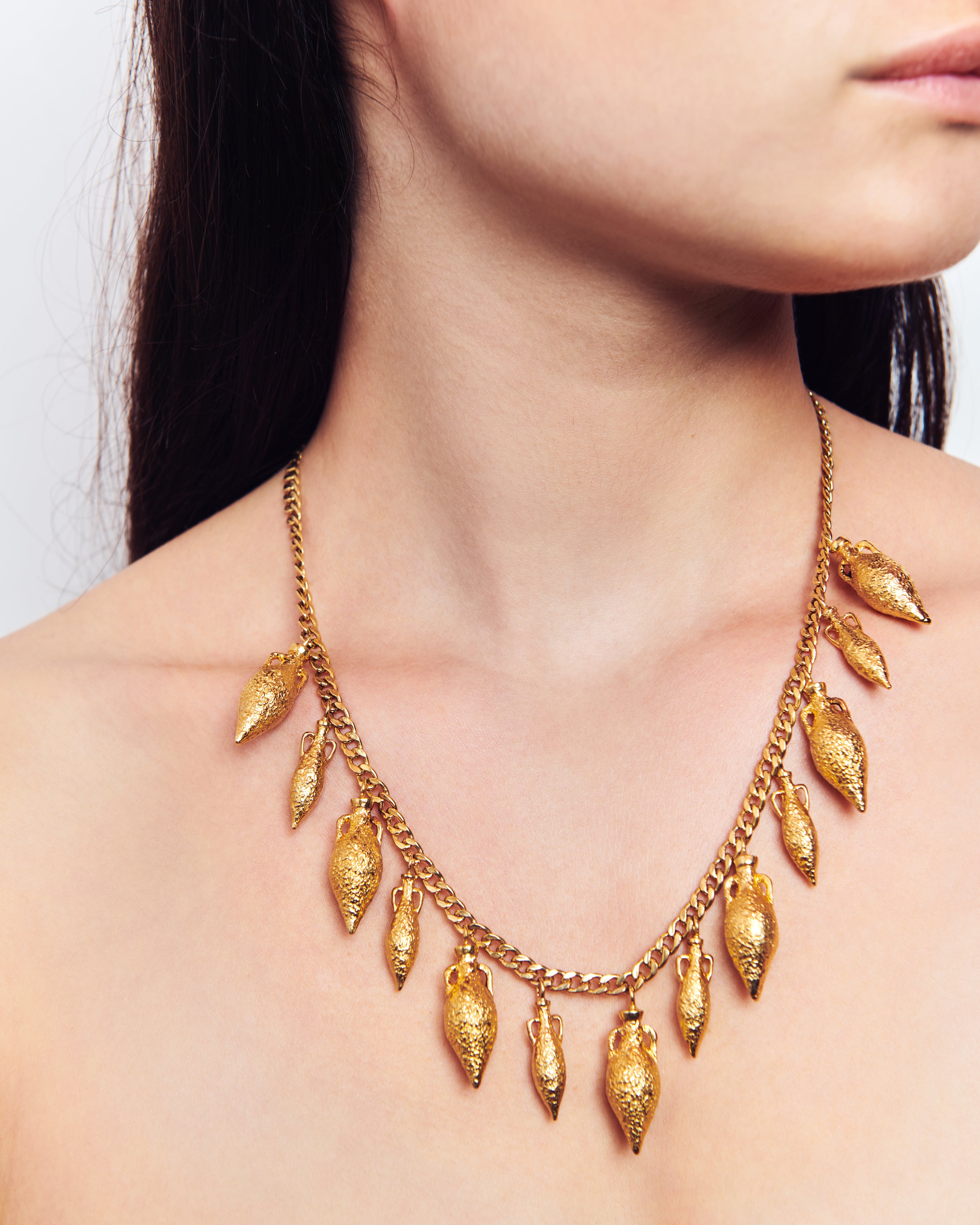 Este diseño propio de Elisa está inspirado en las ánforas, el tesoro del mar pitiuso. Antiguamente, los barcos que naufragaban dejaban en el fondo del mar estos objetos de gran valor en la actualidad. La diseñadora ha convertido estas reliquias de Ibiza y Formentera en un collar impactante compuesto por una cadena gruesa y trece ánforas de distintos tamaños.