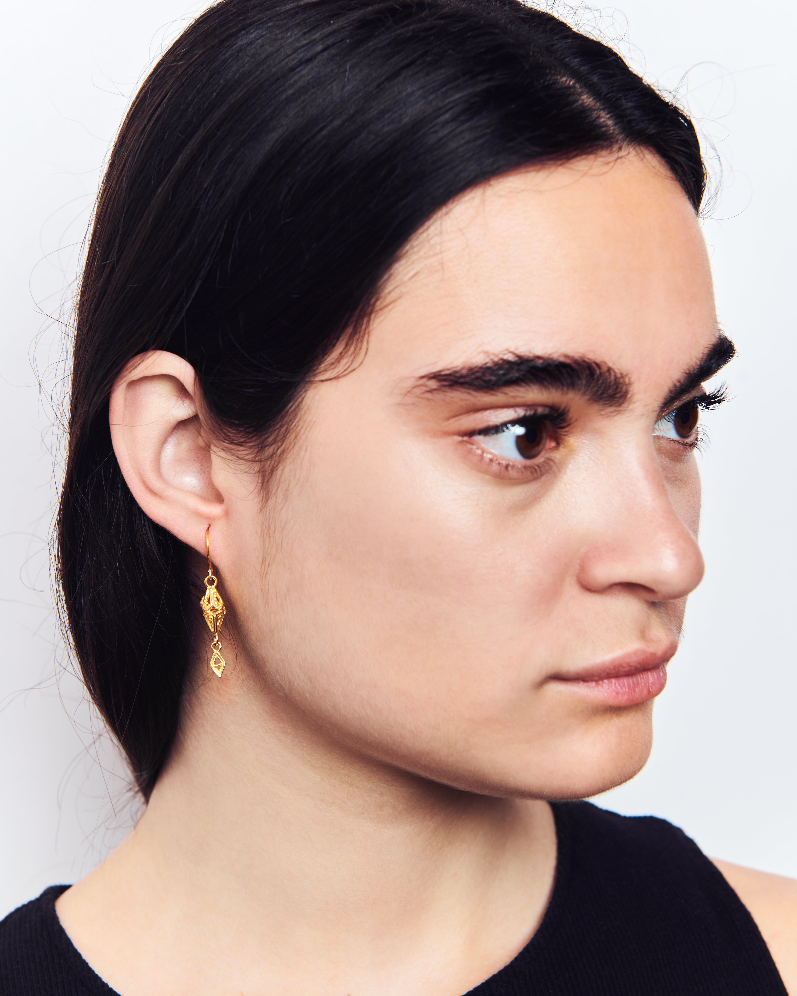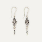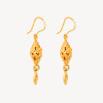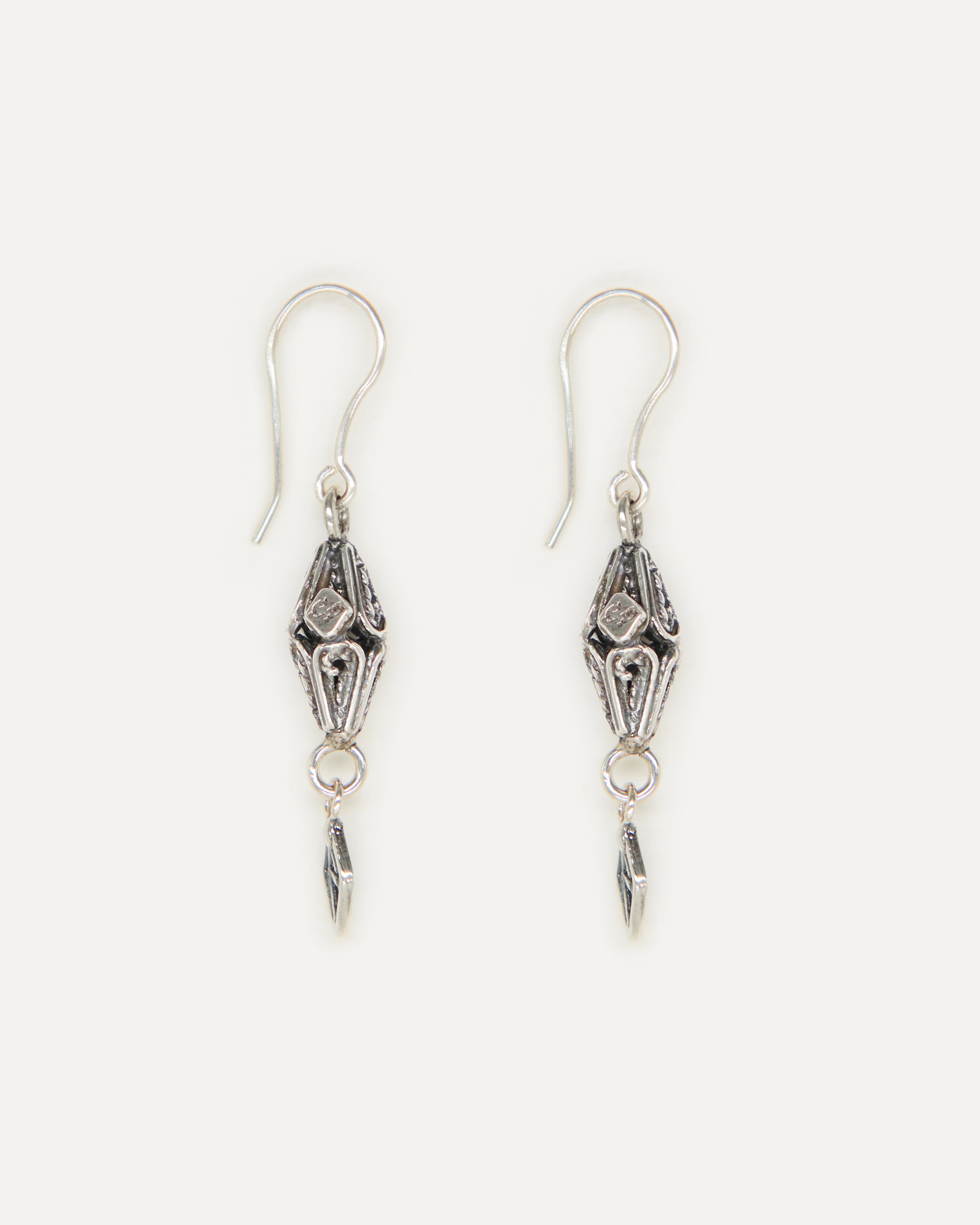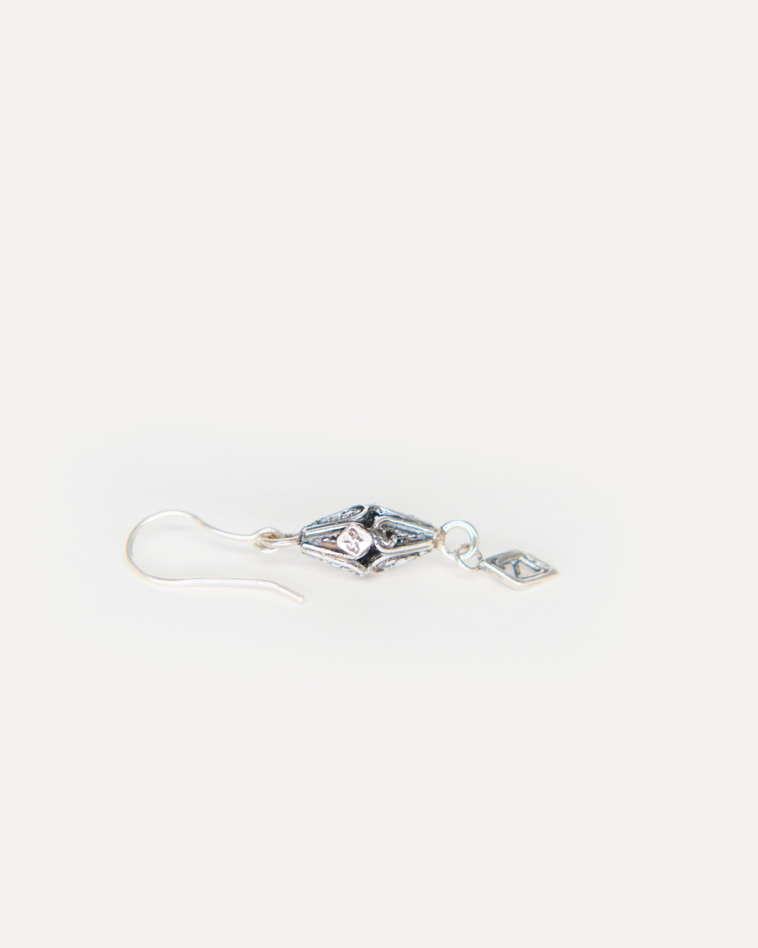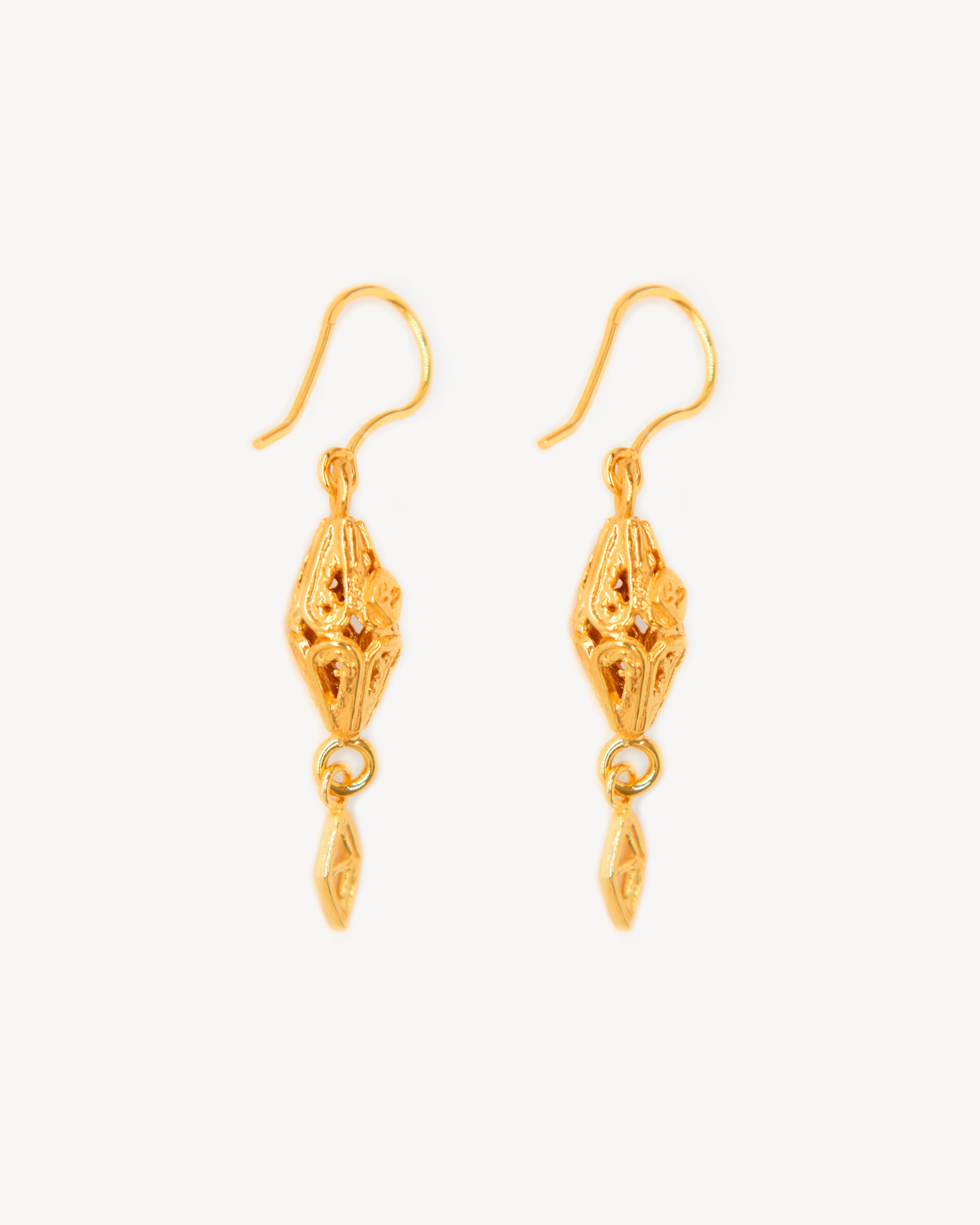 Pendientes inspirados en el Gra d'Ordi de la Emprendada. El nombre 'Gra d'Ordi' se debe a la similitud del la joya, que tiene forma de rombo, con el grano de la cebada que tan frecuentada era en los campos ibicencos. Esta pieza tiene un diseño más barroco y elaborado debido a su trabajo de filigrana con hilo grueso y retorcido que le da esta intensidad.