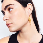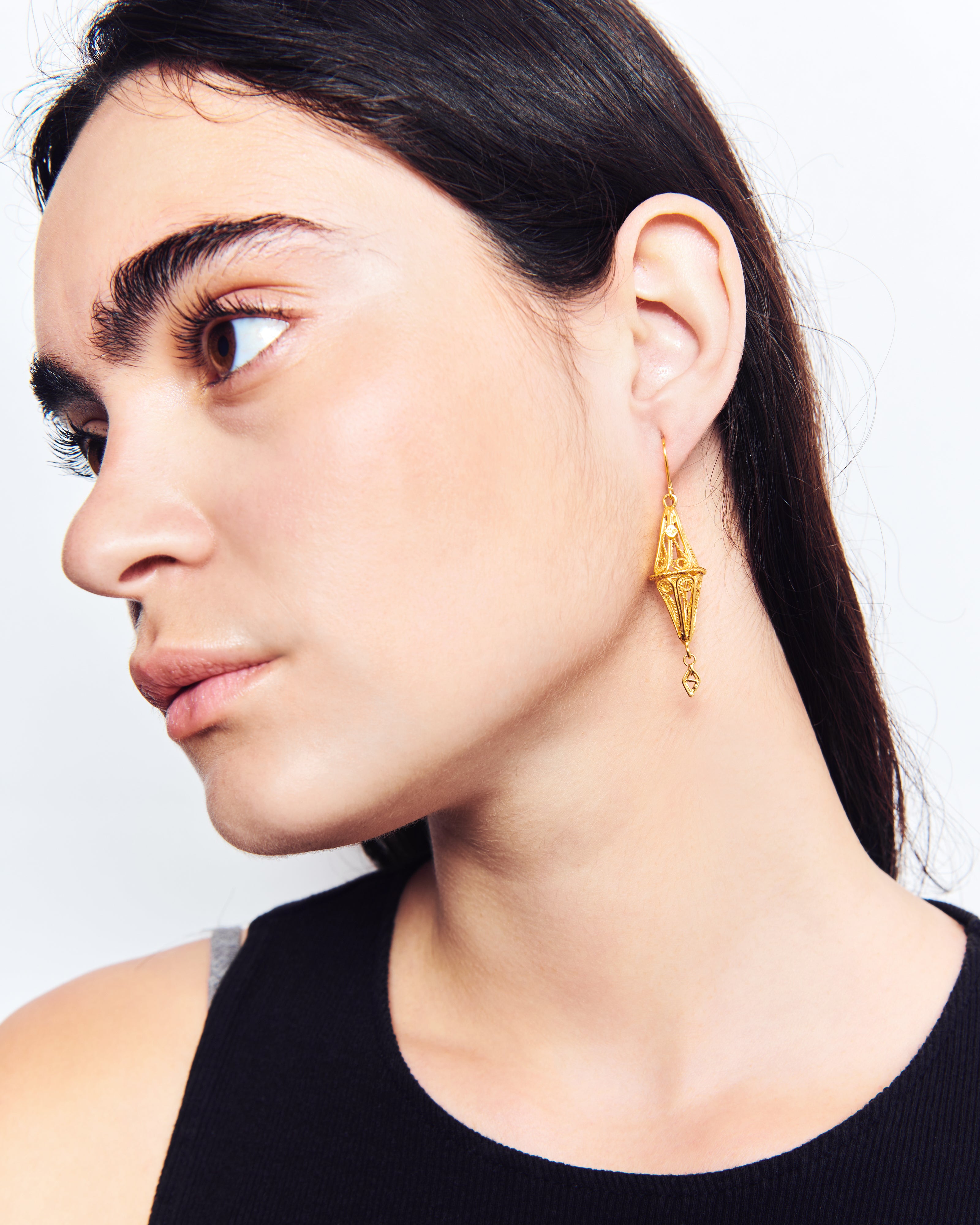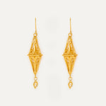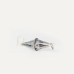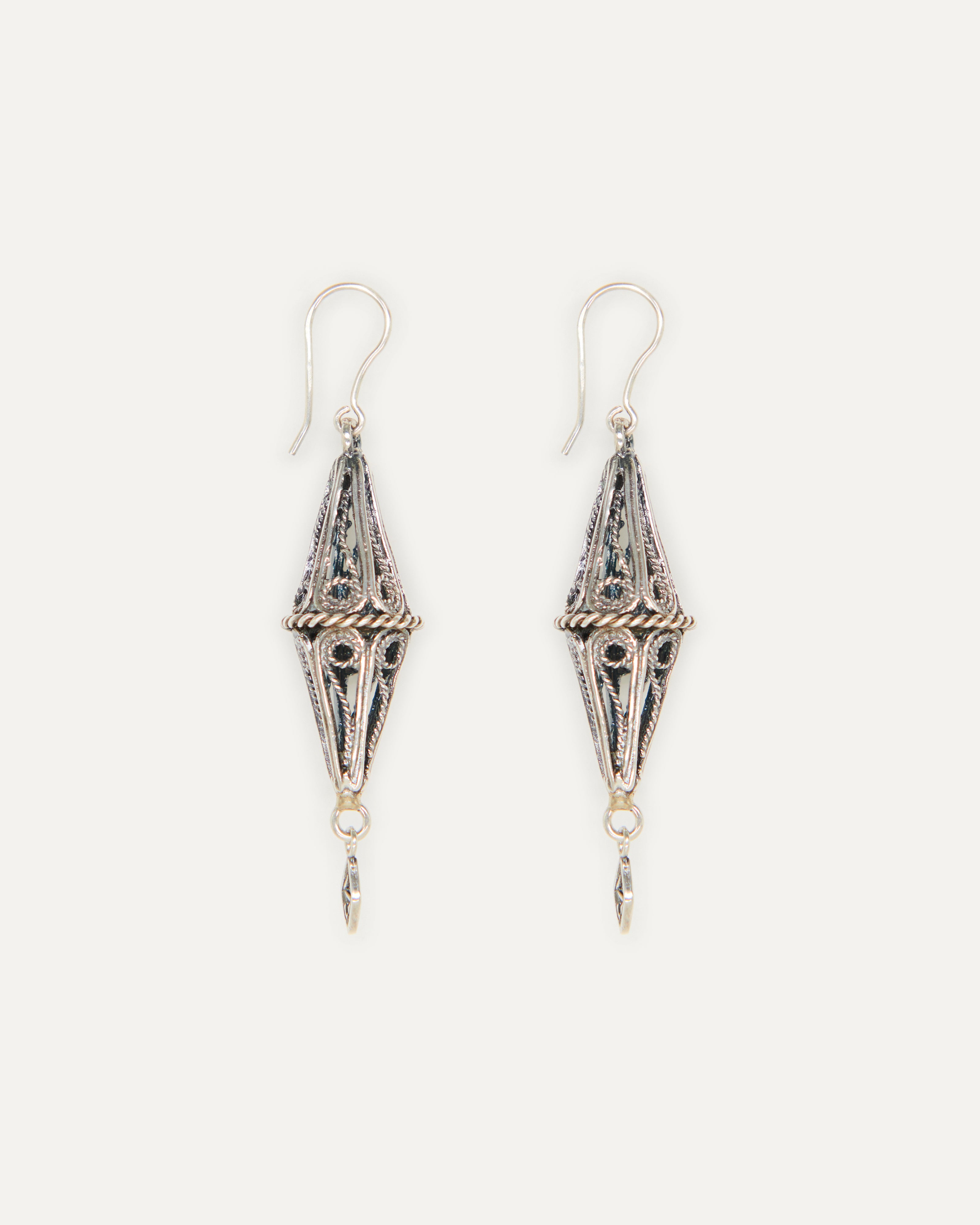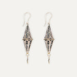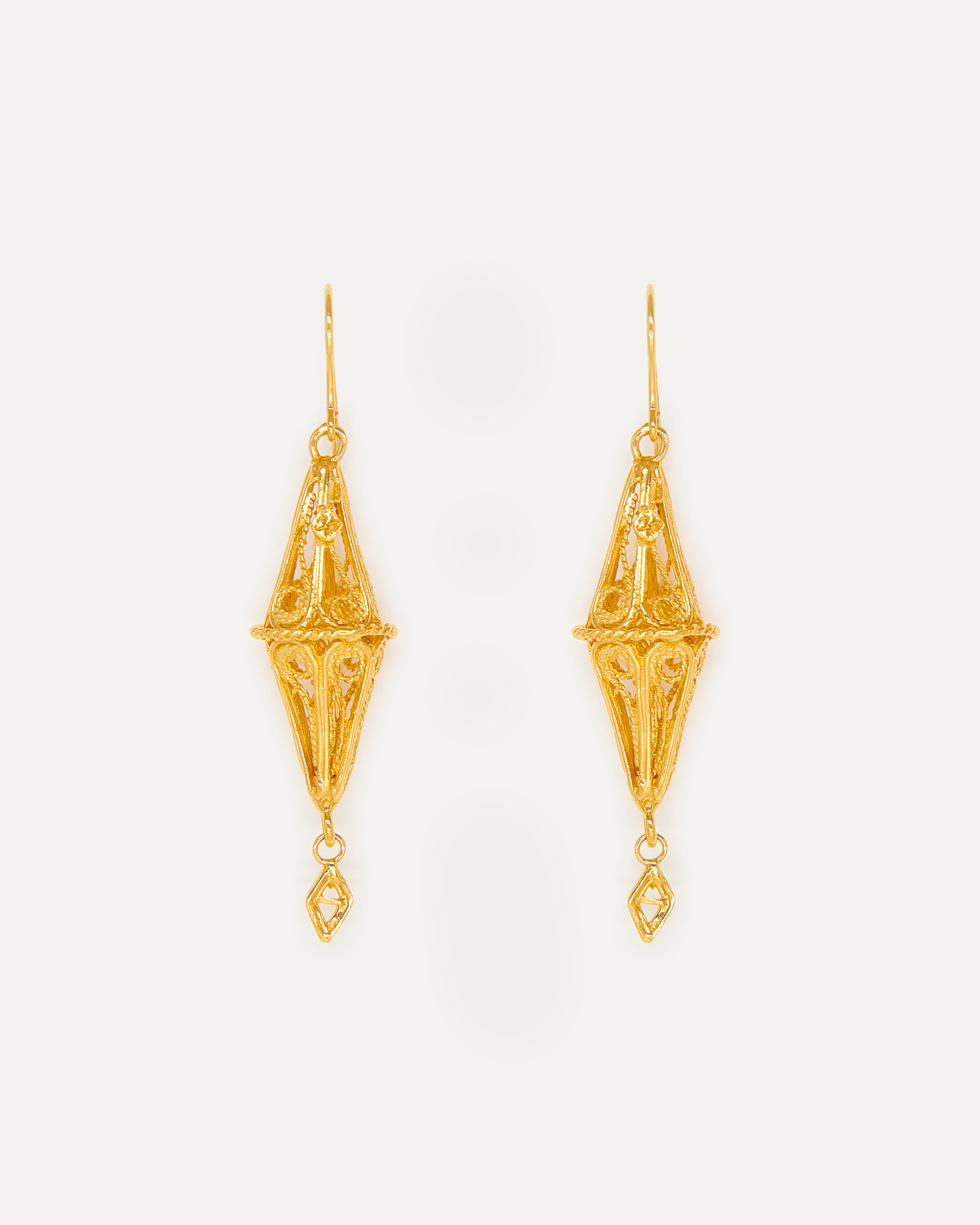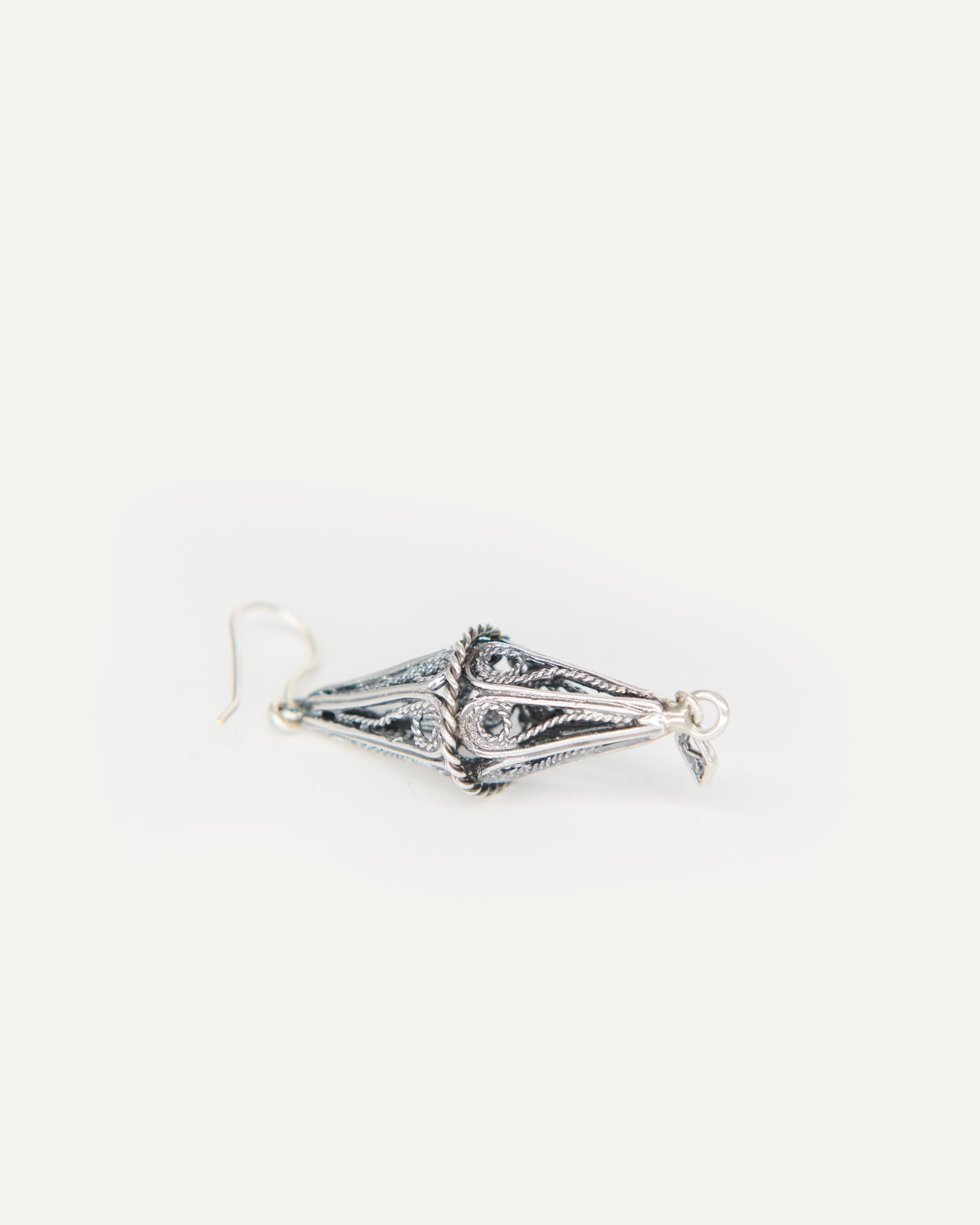 Pendientes inspirados en el Gra d'Ordi de la Emprendada. El nombre 'Gra d'Ordi' se debe a la similitud del la joya, que tiene forma de rombo, con el grano de la cebada que tan frecuentada era en los campos ibicencos. Con este diseño, Elisa quiere hacer una forma más estilizada del tradicional rombo alargándolo y crear una pieza más barroca con un trabajo de filigrana con hilo grueso y retorcido que le da esta intensidad.