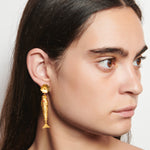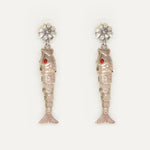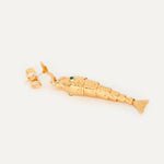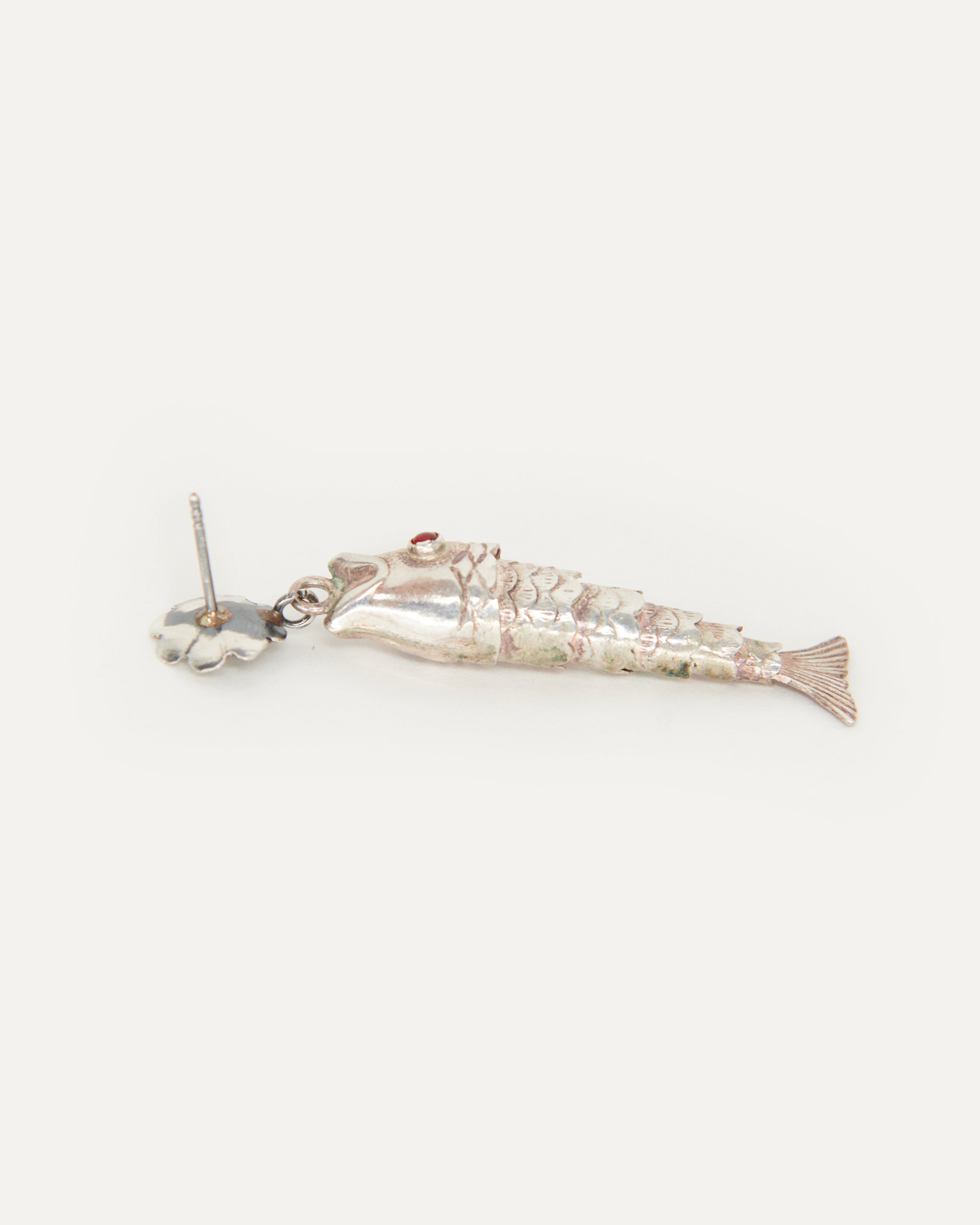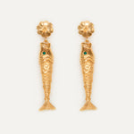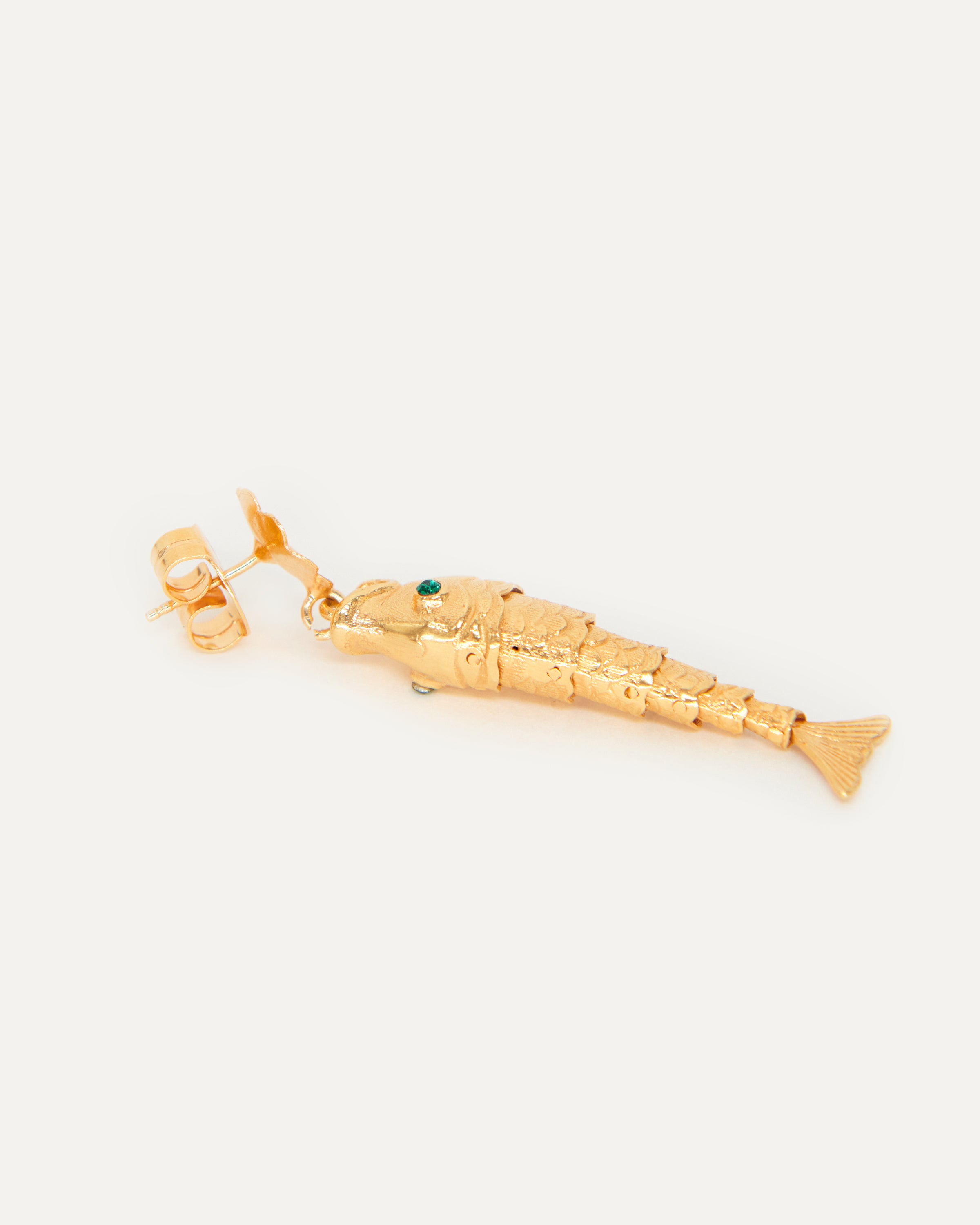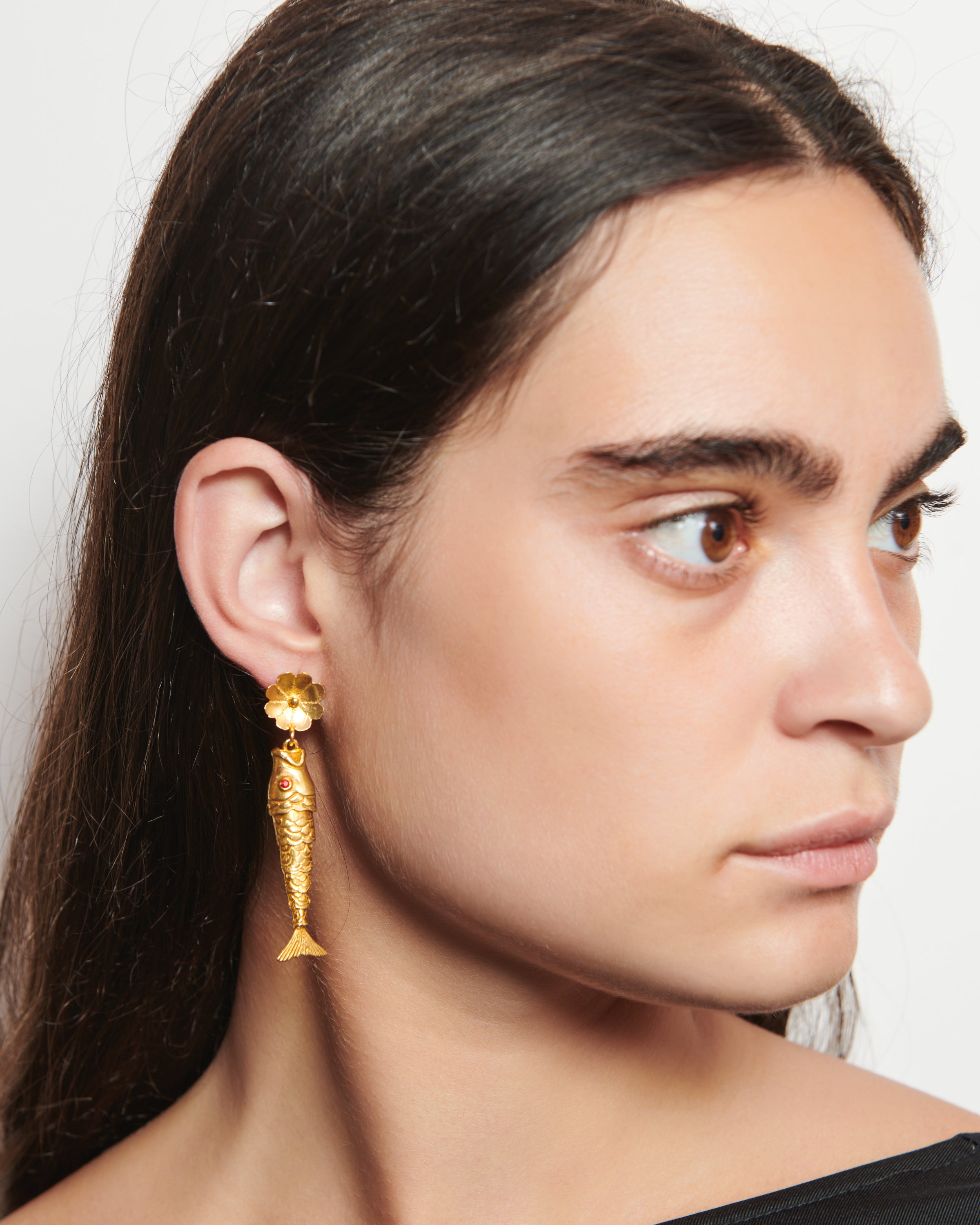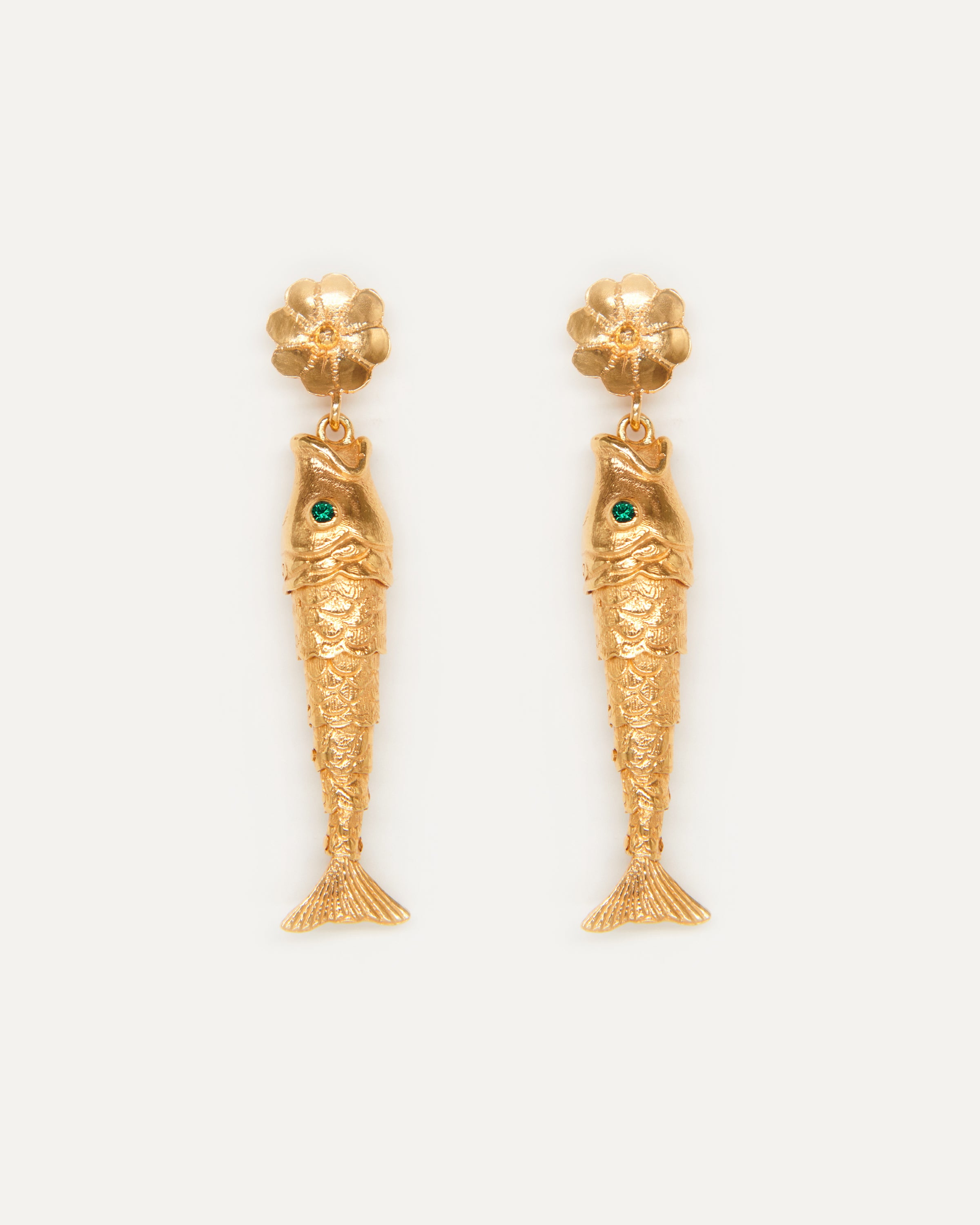 Estos pendientes son una versión del pez que Pepín, padre de Elisa, le regaló a su hija cuando apenas tenía cinco años como amuleto. Actualmente, Elisa ha transformado esta pieza y le ha dado el nombre de Posidonio, inspirado en el filósofo griego que estudiaba los mares y en honor a los campos de 'posidònia' que hacen que los mares de Ibiza y Formentera sean así de cristalinos. En este diseño, Elisa opta por el cierre en forma de flor, uno de los cierres favoritos de la marca.