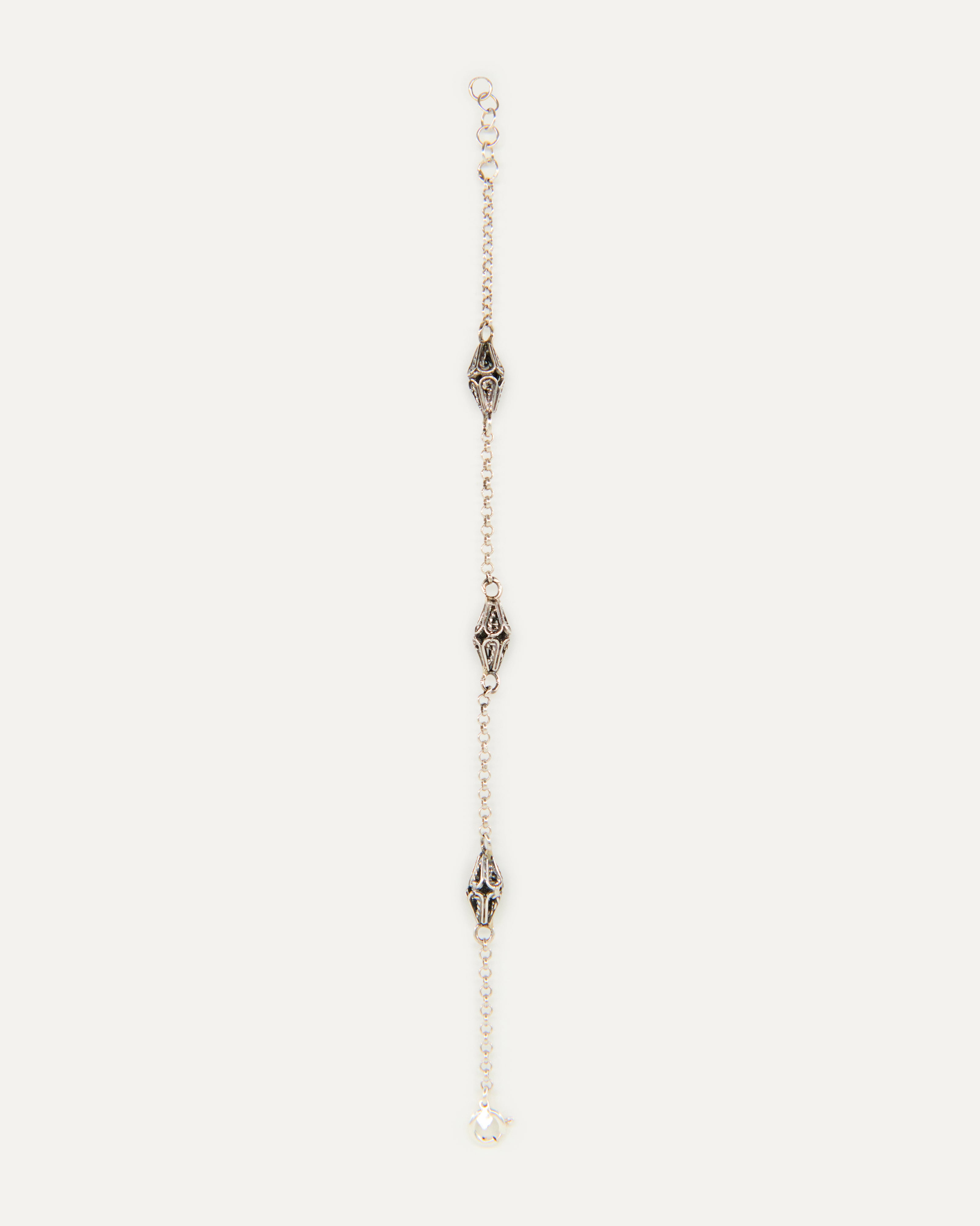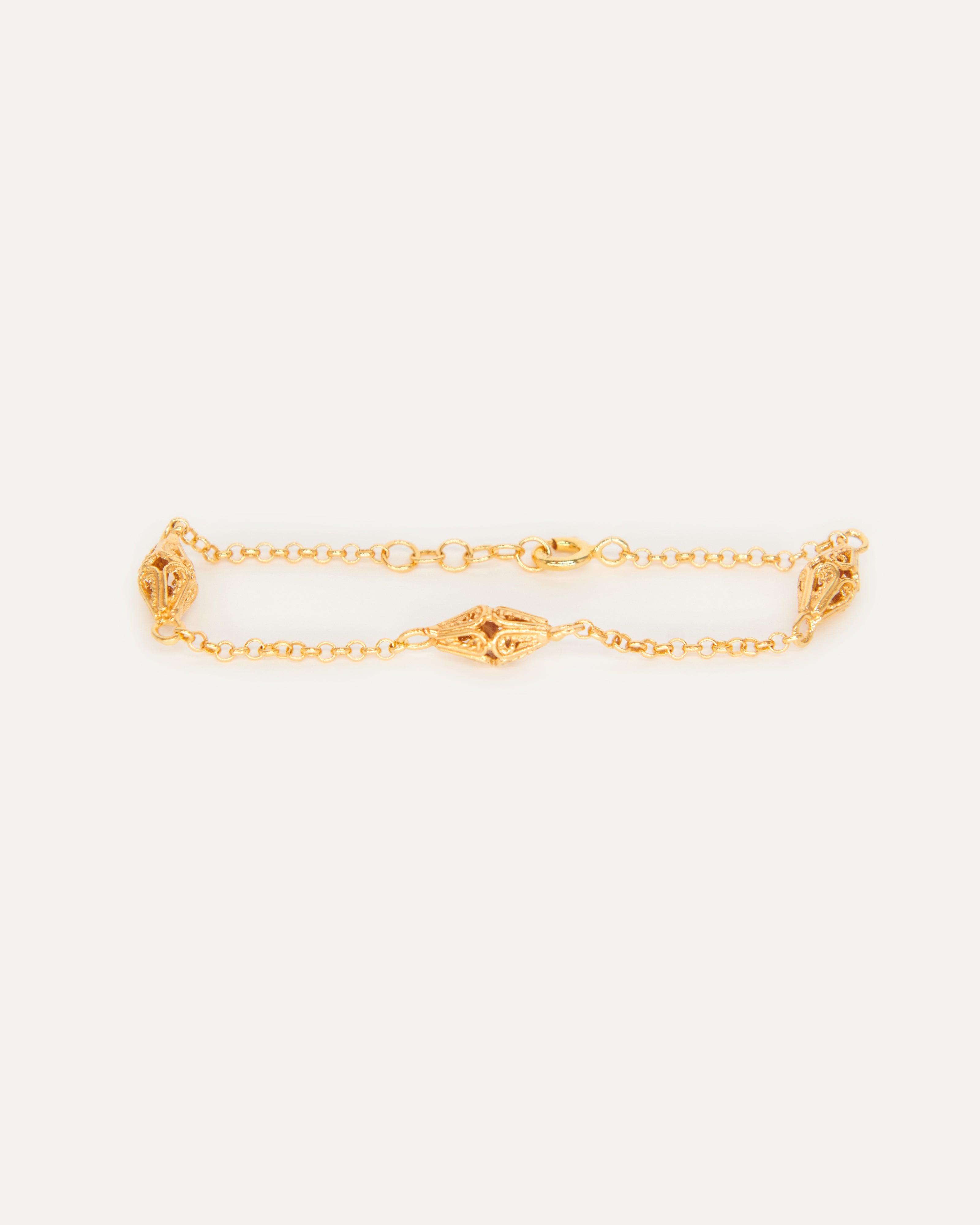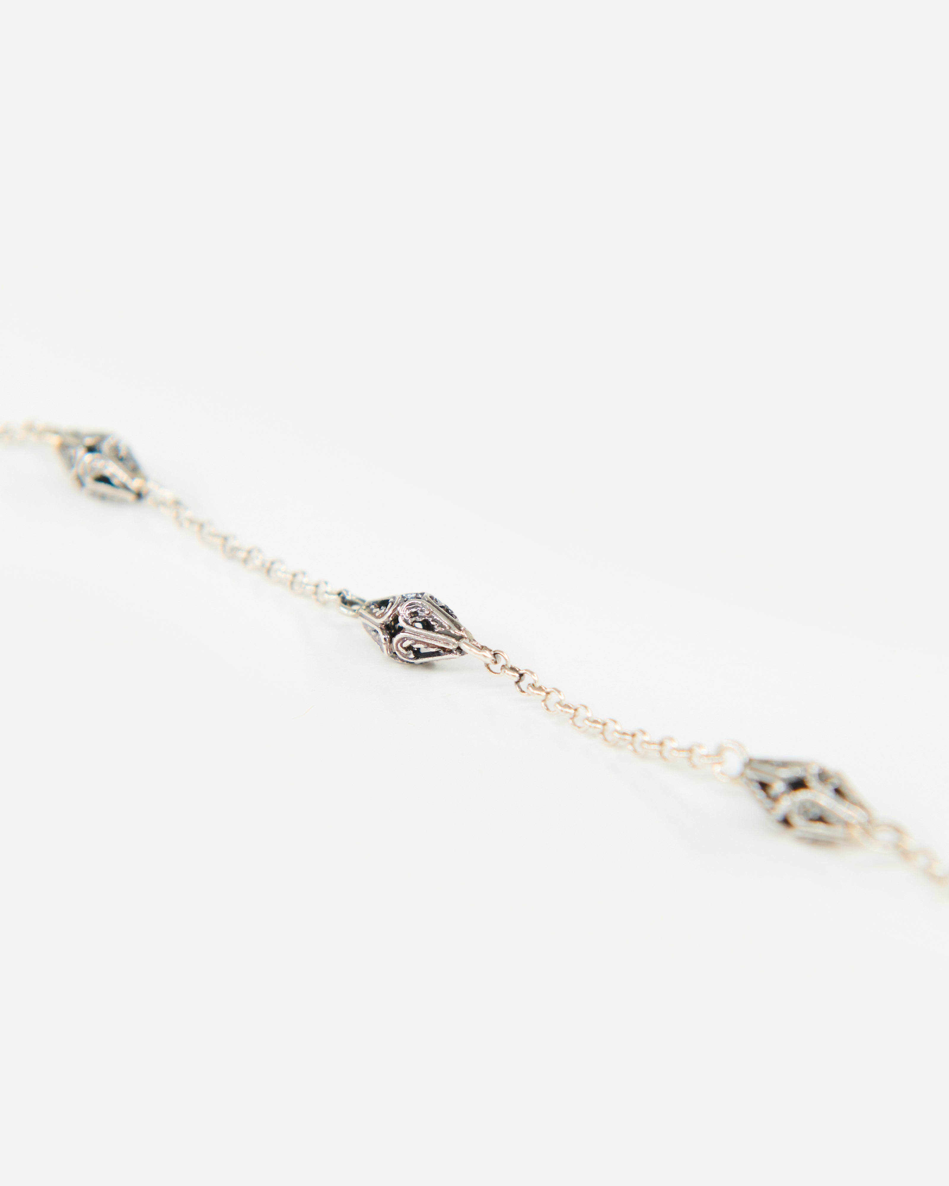 Pulsera inspirada en el Gra d'Ordi de la Emprendada. El nombre 'Gra d'Ordi' se debe a la similitud de la joya, que tiene forma de rombo, con el grano de la cebada que tan frecuentada era en los campos ibicencos. Esta pieza tiene un diseño más barroco y elaborado debido a su trabajo de filigrana con hilo grueso y retorcido que le da esta intensidad. Elisa transforma el collar de Gra d'Ordi en todo tipo de piezas diferentes: colgantes, pulseras, pendientes o anillos.