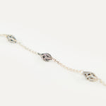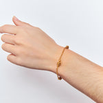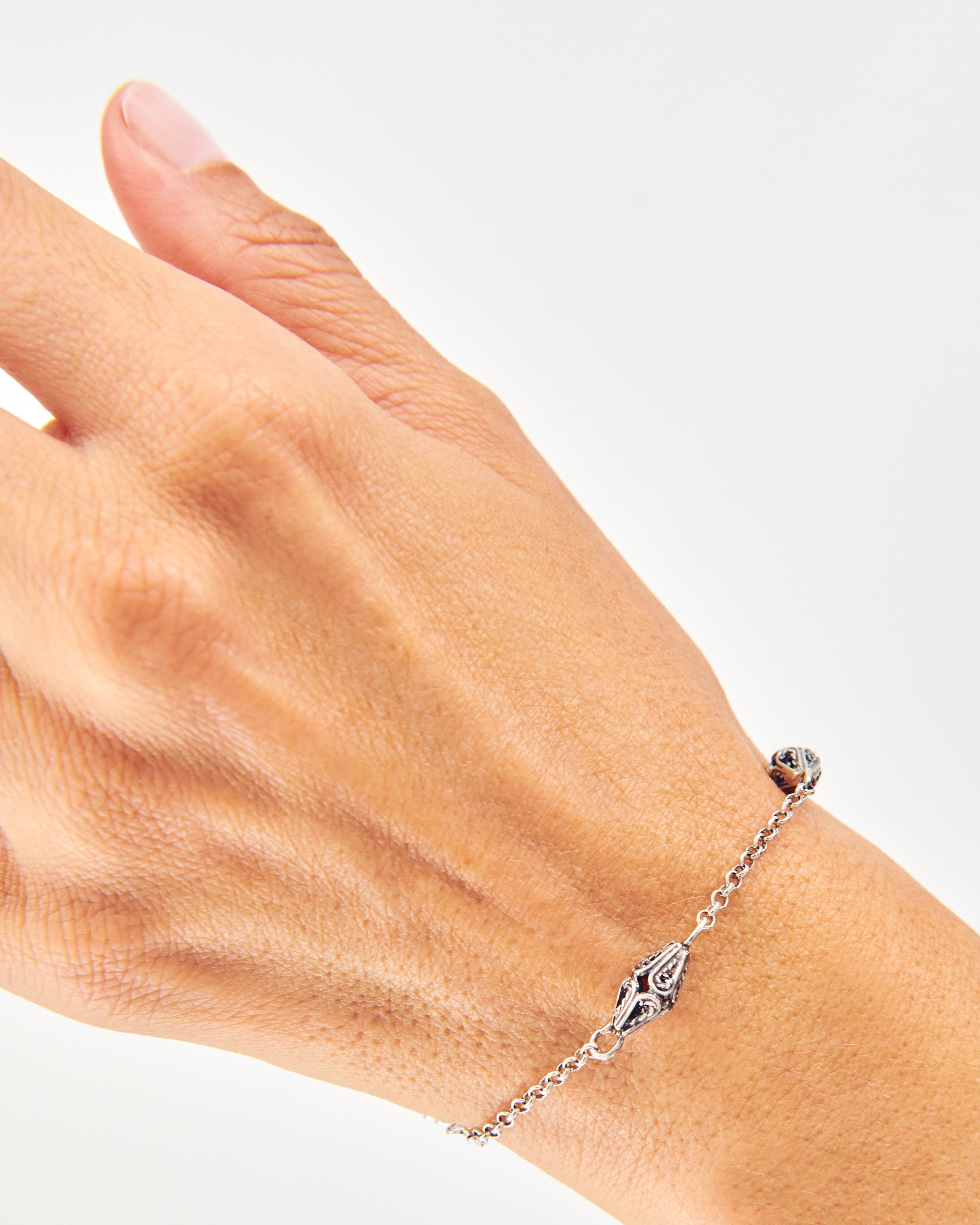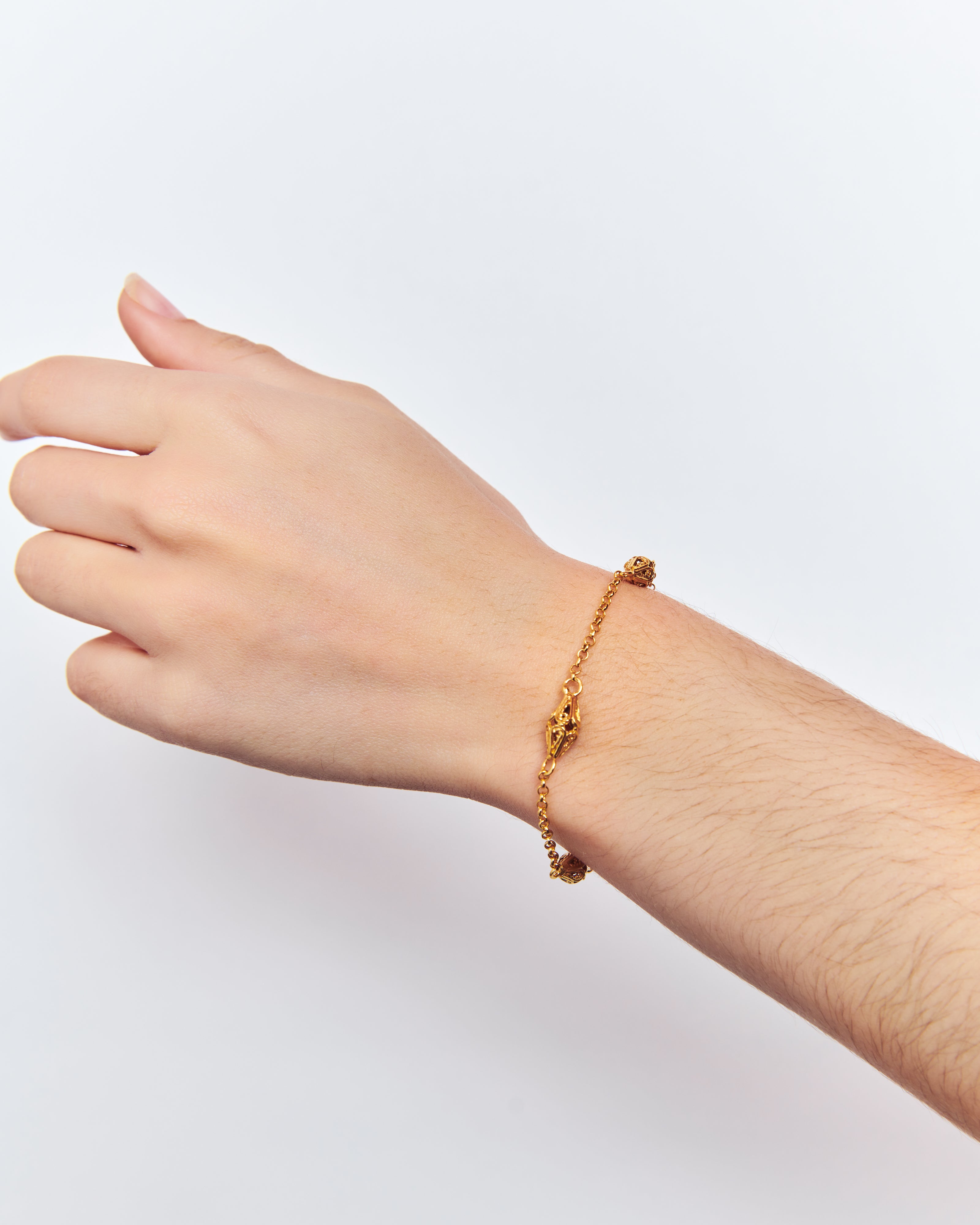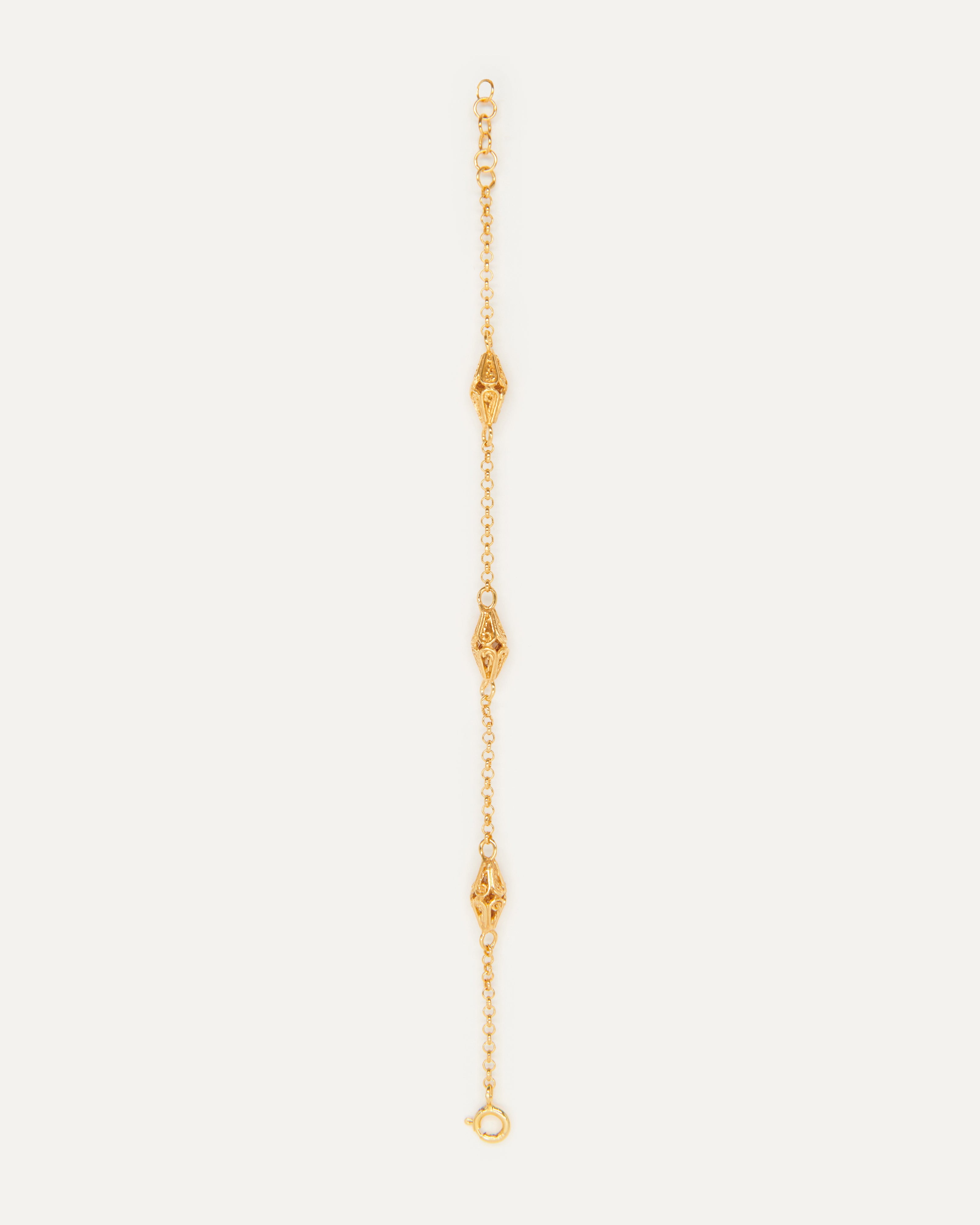 Pulsera inspirada en el Gra d'Ordi de la Emprendada. El nombre 'Gra d'Ordi' se debe a la similitud de la joya, que tiene forma de rombo, con el grano de la cebada que tan frecuentada era en los campos ibicencos. Esta pieza tiene un diseño más barroco y elaborado debido a su trabajo de filigrana con hilo grueso y retorcido que le da esta intensidad. Elisa transforma el collar de Gra d'Ordi en todo tipo de piezas diferentes: colgantes, pulseras, pendientes o anillos.