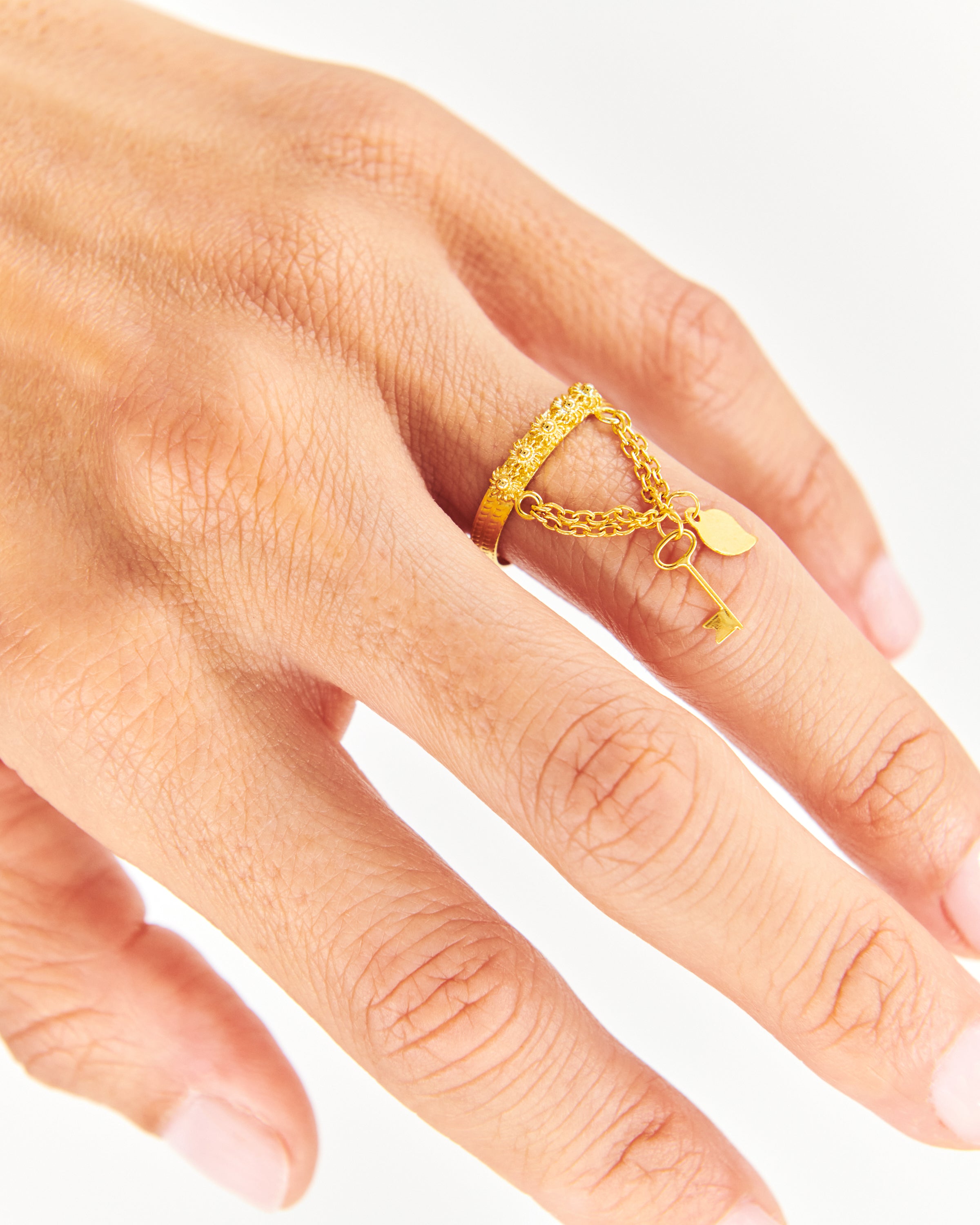 Este anillo está inspirado en el clásico 'anell de borró' de la Emprendada ibicenca. Cuenta la historia que cuando el padre del novio iba a pedir la mano de la 'al·lota', llevaba a esta el mayor número posible de anillos. El anillo de 'borró', desde el primer momento, ya quedaba en propiedad exclusiva de la novia y el resto seguían perteneciendo a la familia del novio. Como en el diseño tradicional, lleva una cadena pequeña con una llave y un corazón para abrir la puerta del amor.