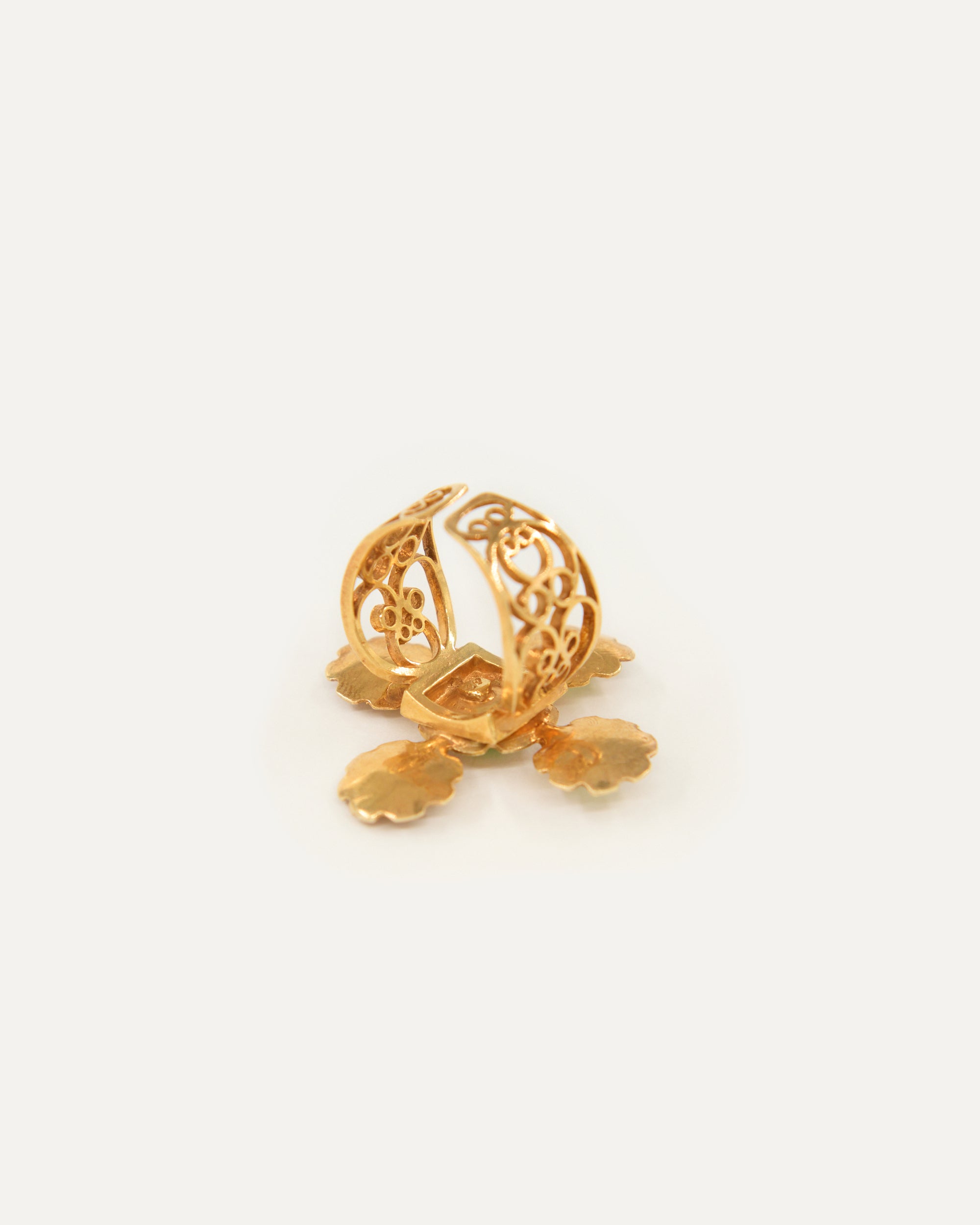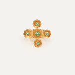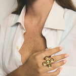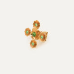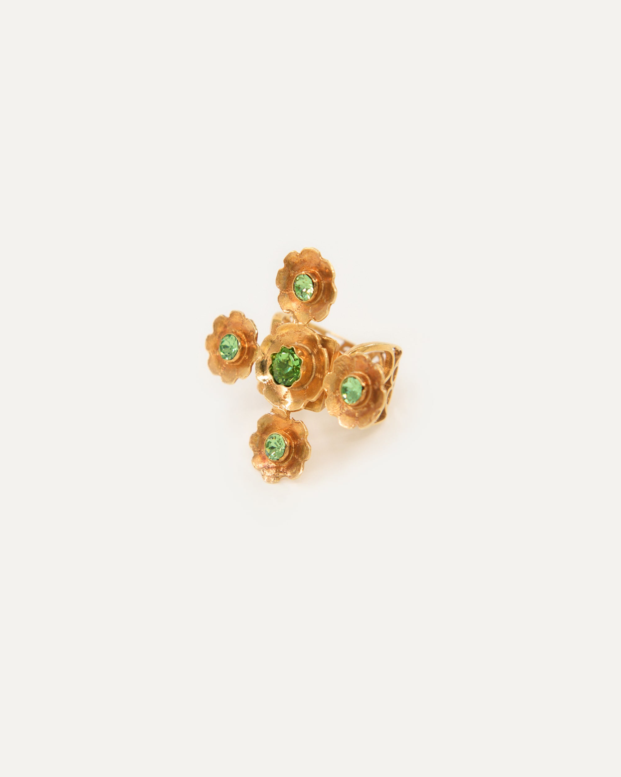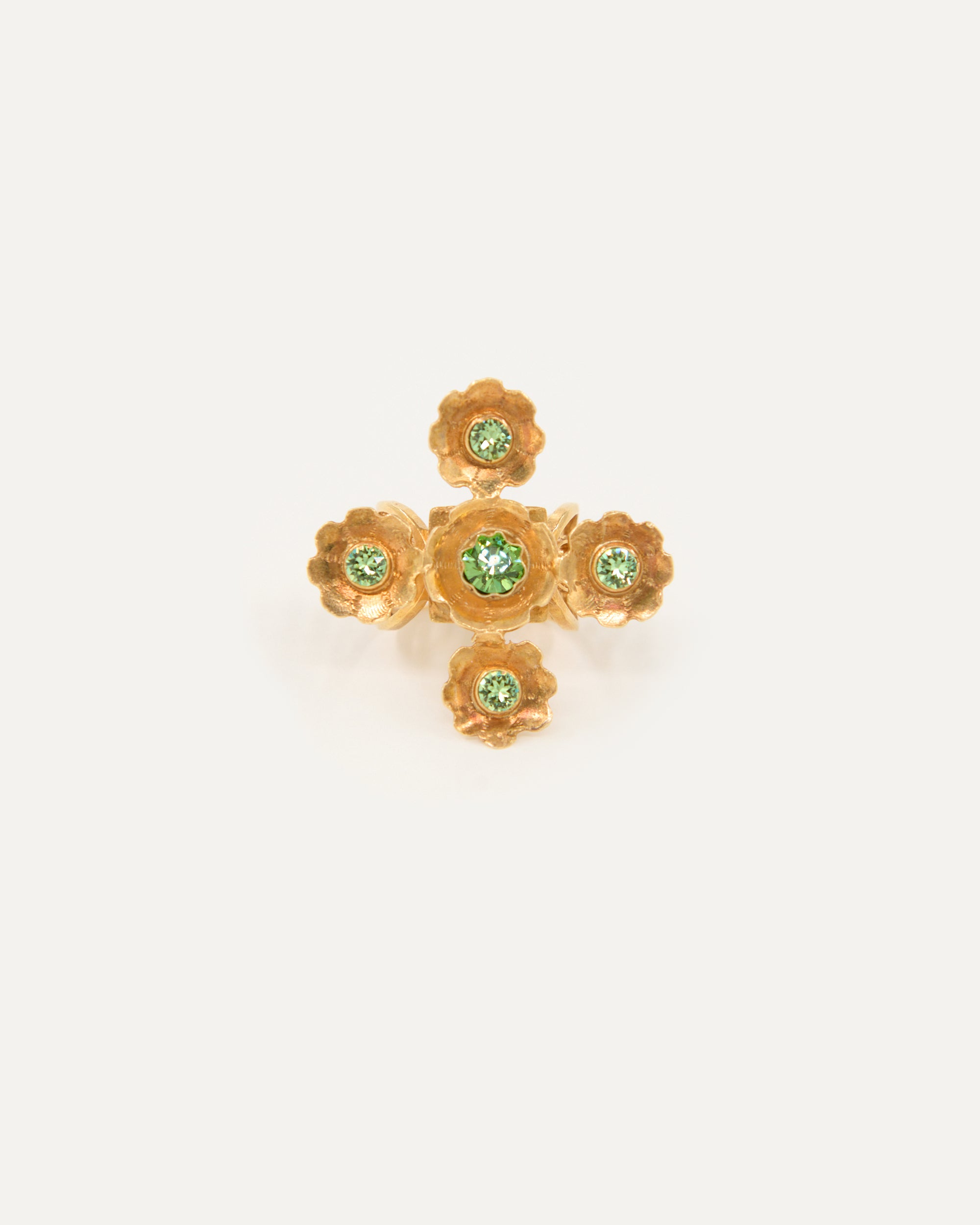 Este anillo es un diseño propio de Elisa basado en dos pilares fundamentales de la tradición ibicenca: la cruz y las flores. Una pieza protagonista de la edición 'Florecer', que celebra la expansión y la belleza de florecer, capturando la esencia silvestre y libre de Ibiza.