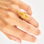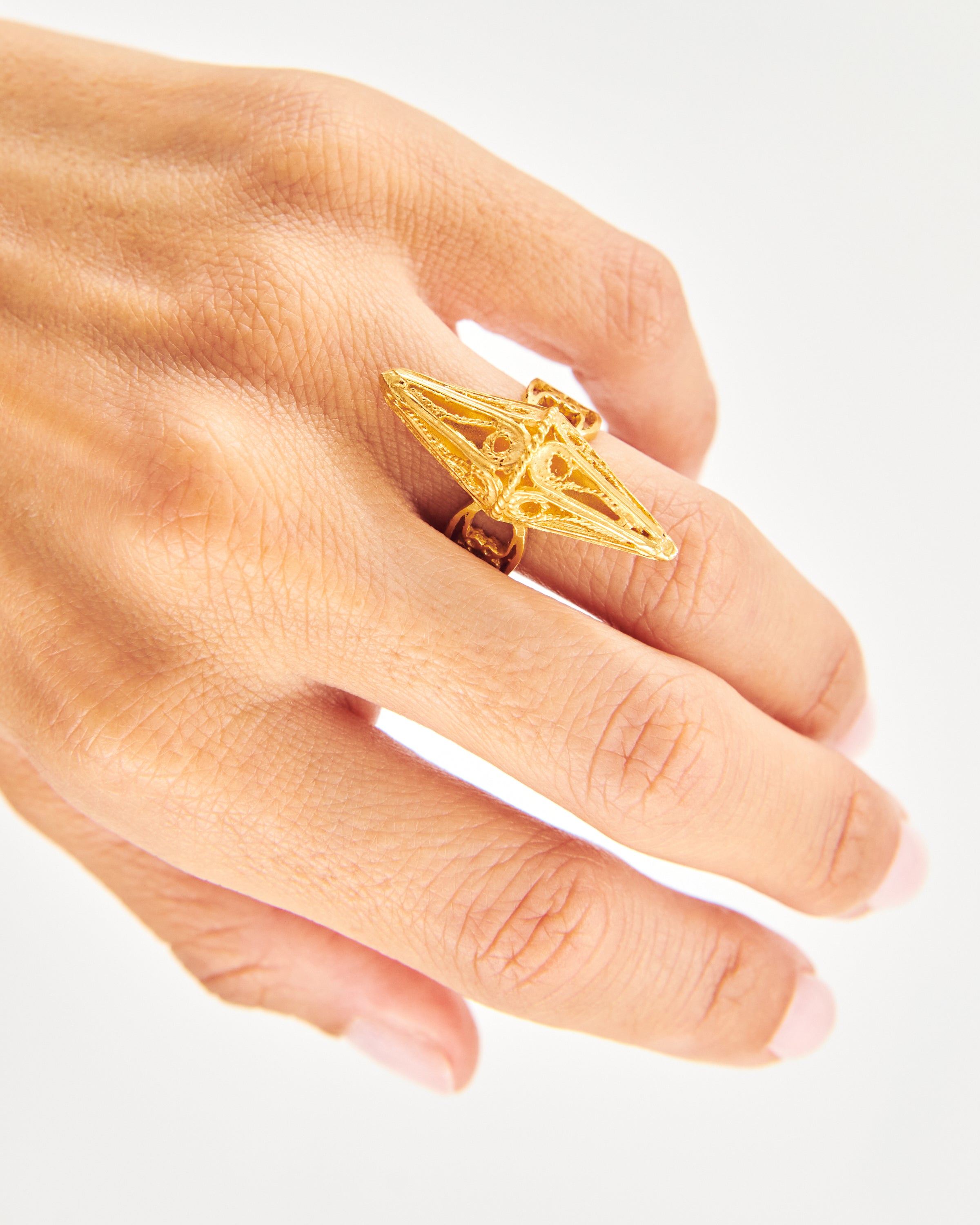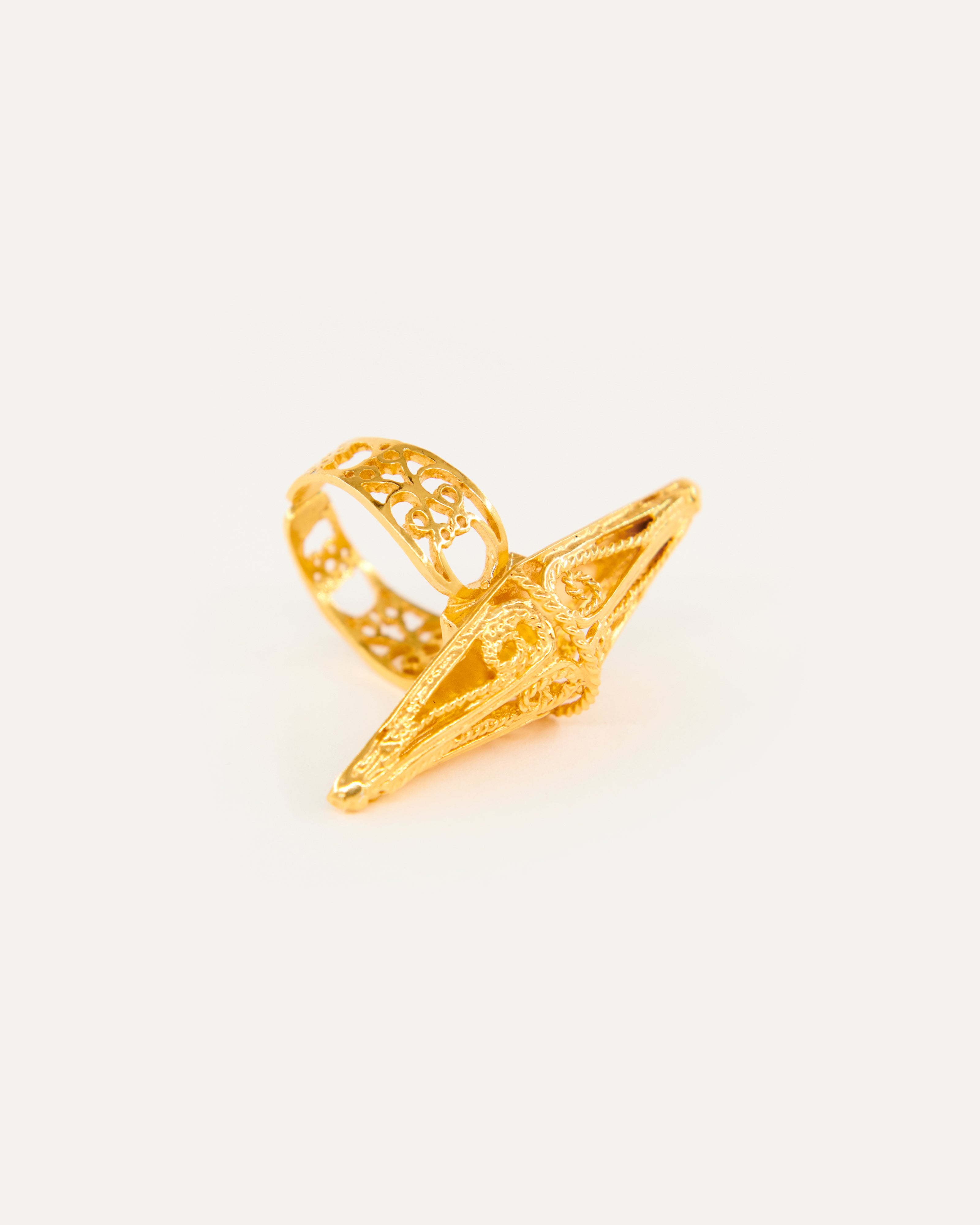Anillo inspirado en el Gra d'Ordi de la Emprendada. El nombre 'Gra d'Ordi' se debe a la similitud del la joya, que tiene forma de rombo, con el grano de la cebada que tan frecuentada era en los campos ibicencos. Con este diseño, Elisa quiere hacer una forma más estilizada del tradicional rombo alargándolo y crear una pieza más barroca con un trabajo de filigrana con hilo grueso y retorcido que le da esta intensidad.