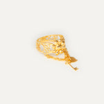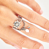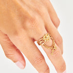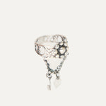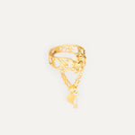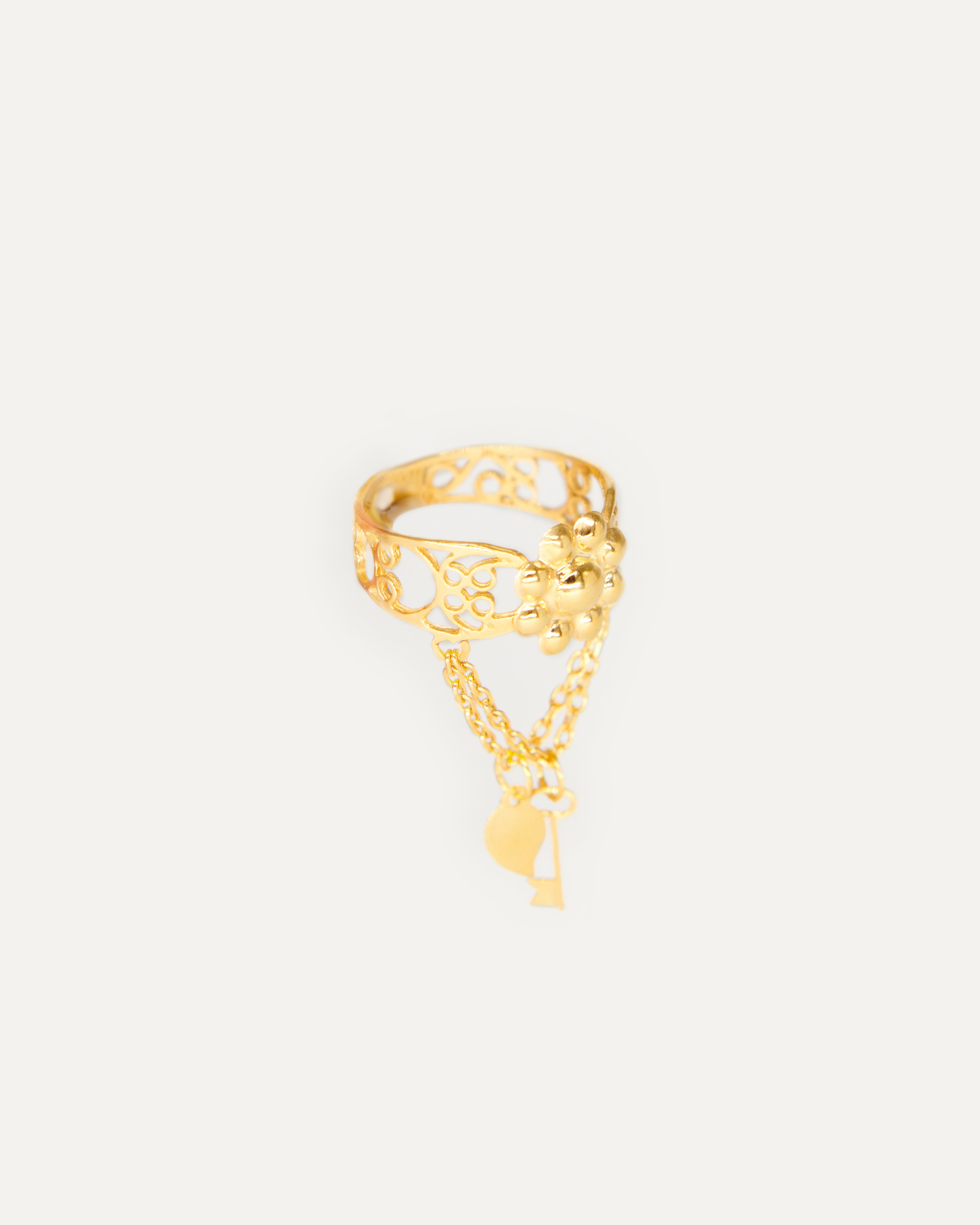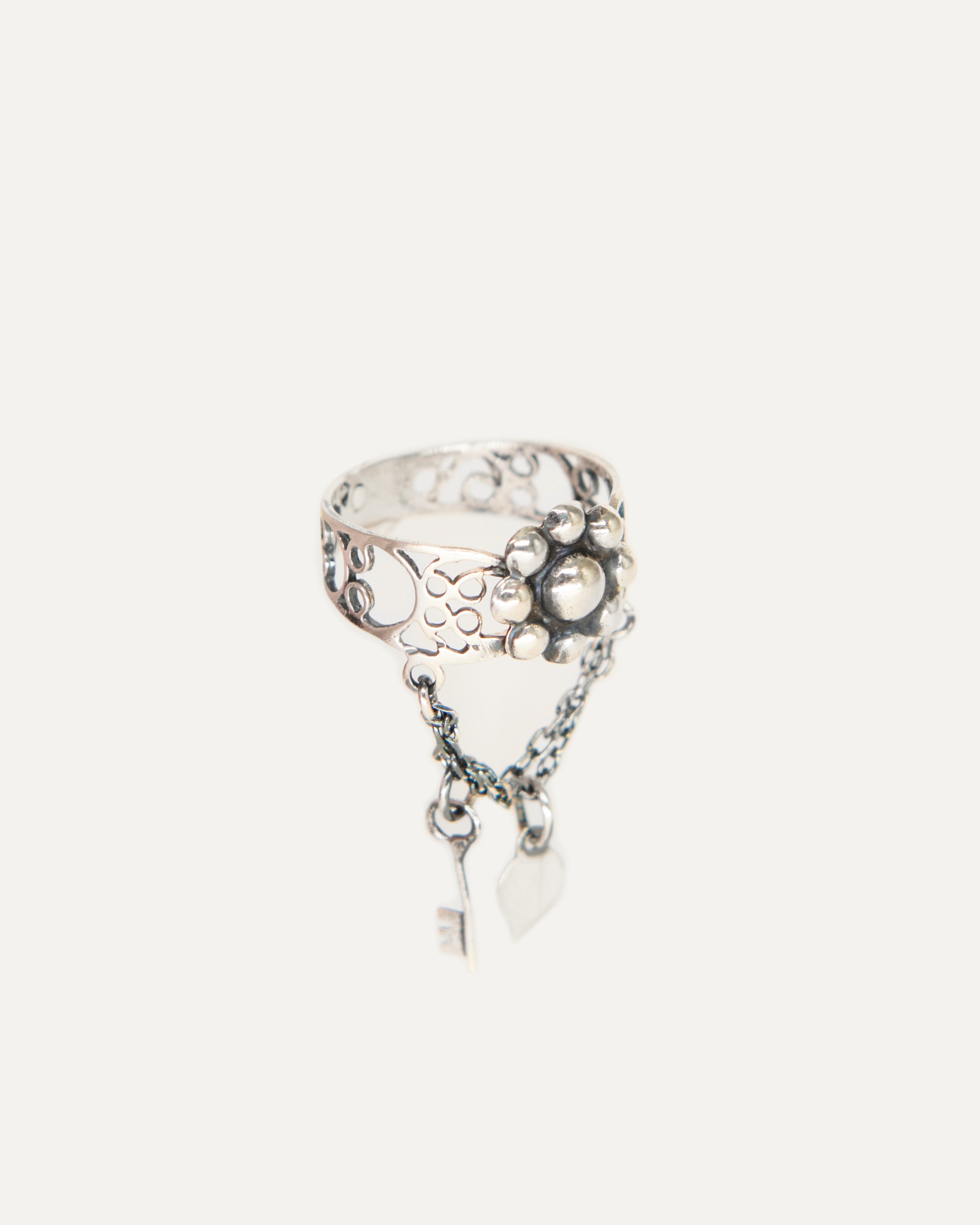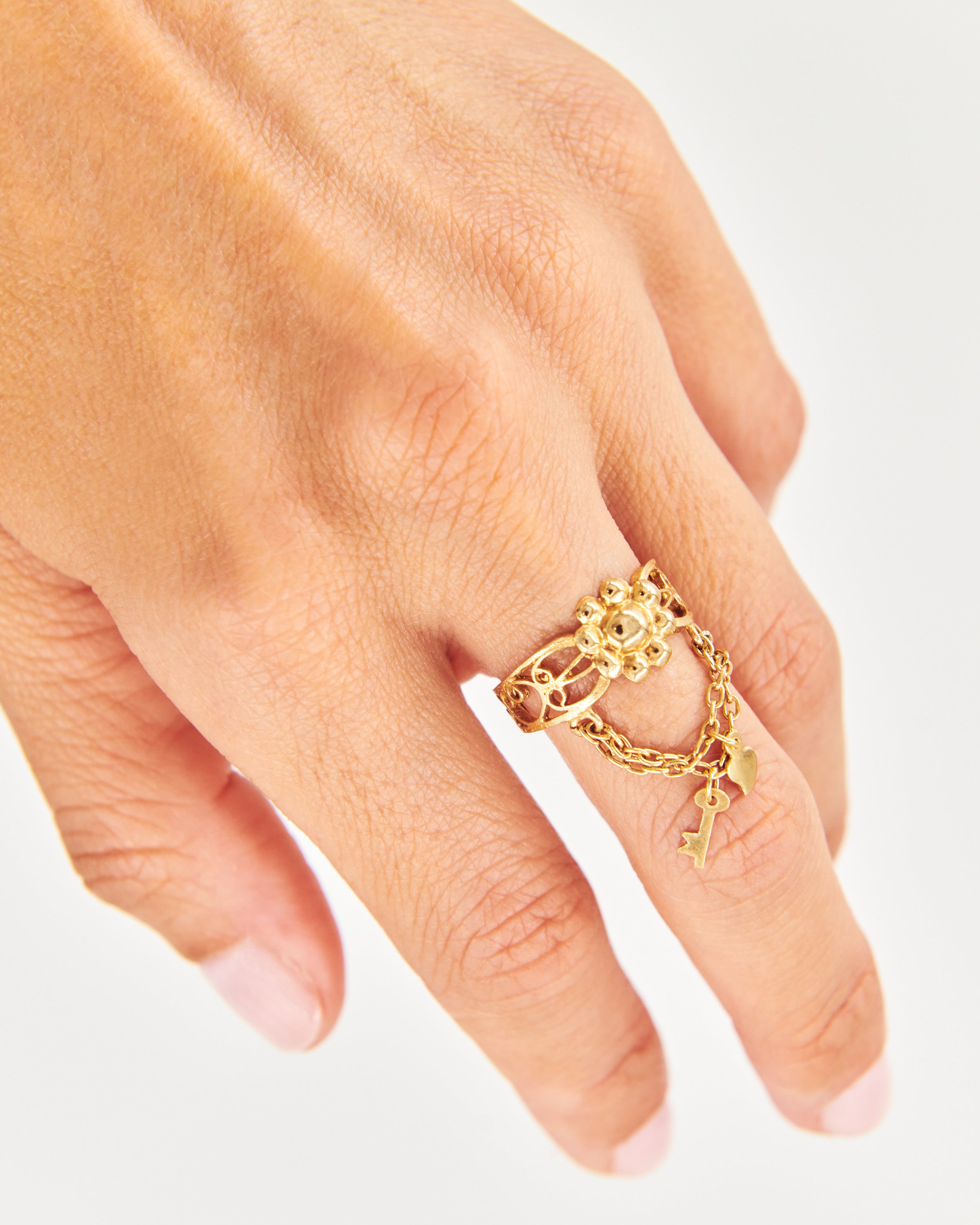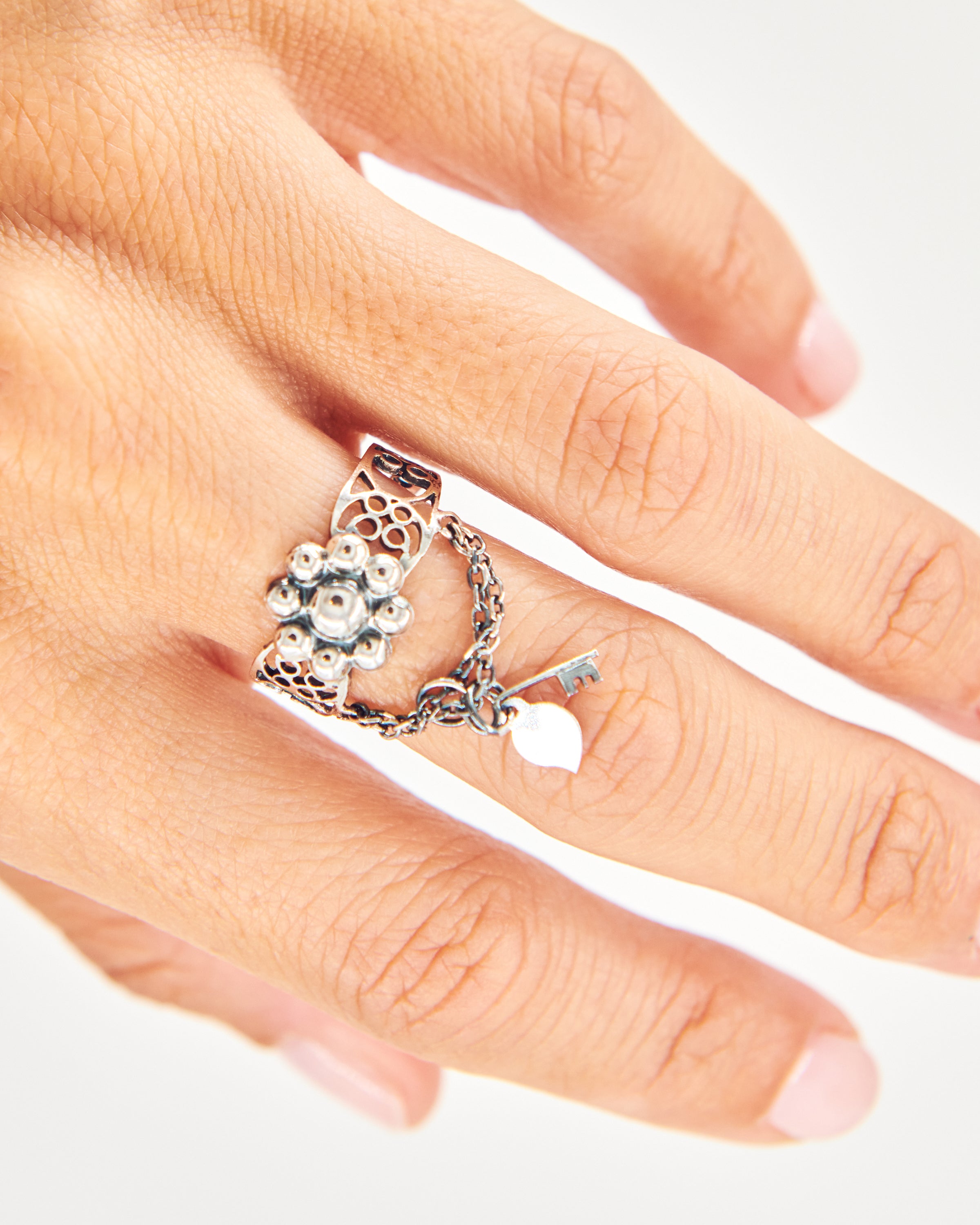 El anillo Flor d'Eivissa es uno de los anillos tradicionales que forma parte del conjunto de 24 sortijas que luce la mujer ibicenca. Tradicionalmente, estos anillos eran el lenguaje visual que utilizaba la 'muchacha' para comunicar al resto de sus cortejadores de que el 'festeig' había finalizado. Esta pieza lleva una cadena pequeña con una llave y un corazón para abrir la puerta del amor.