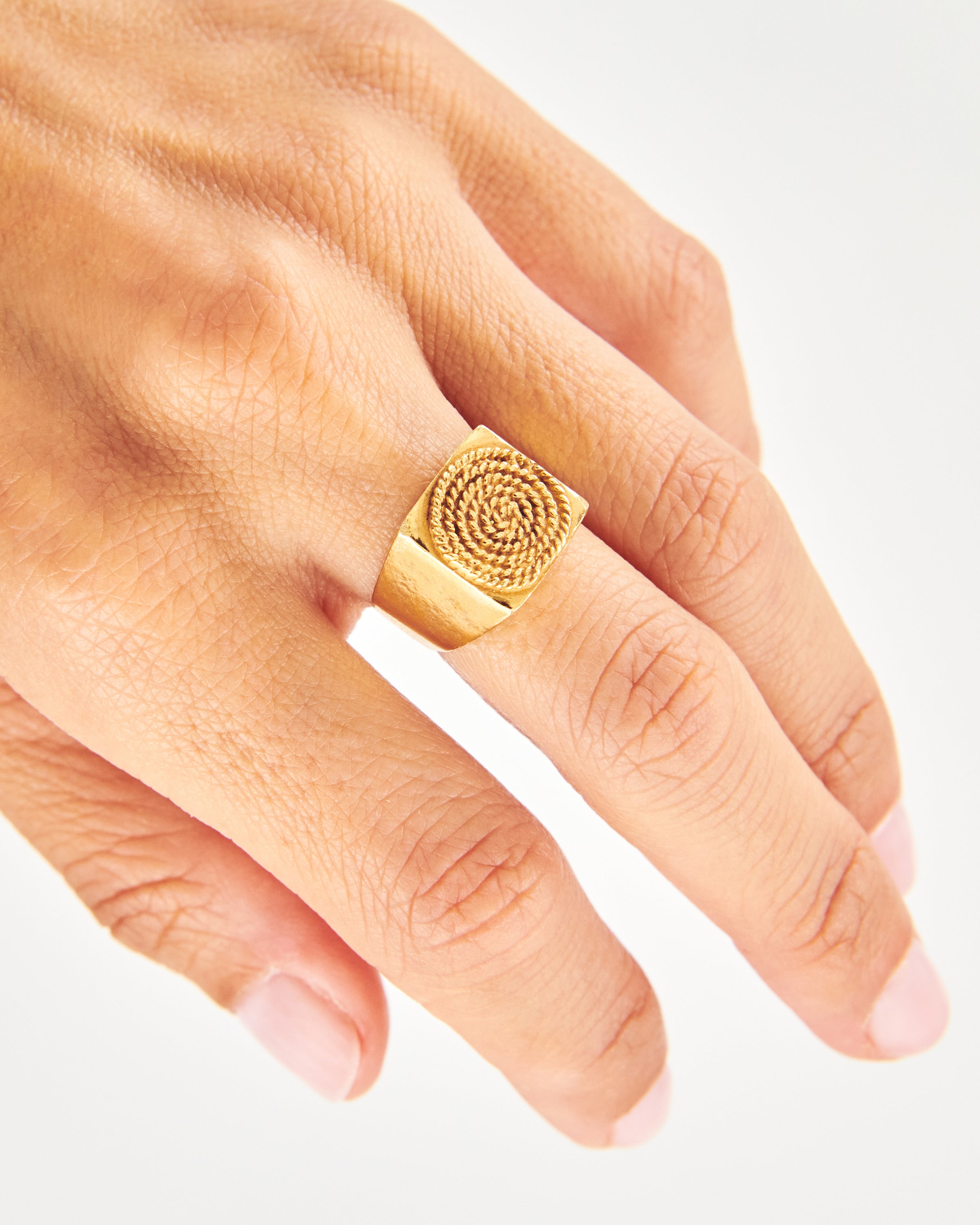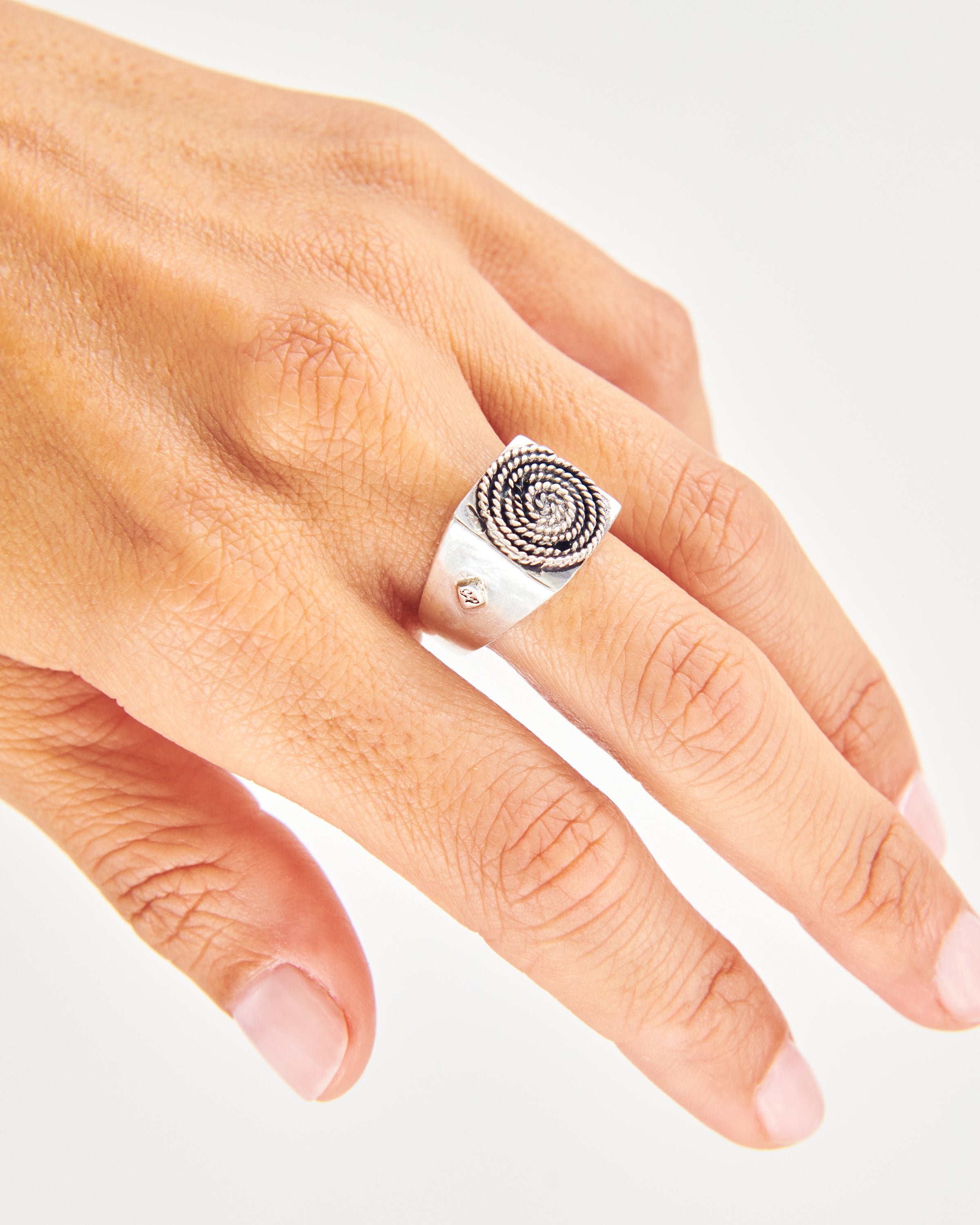 Esta joya propia de Elisa está inspirada por la nostalgia de la antigua Ibiza. Su diseño basado en un grabado de espiral representa los cabos que adujan los marineros para dejar zarpar al Joven Dolores, el único barco que hacía el trayecto Ibiza - Formentera en los años 60.
