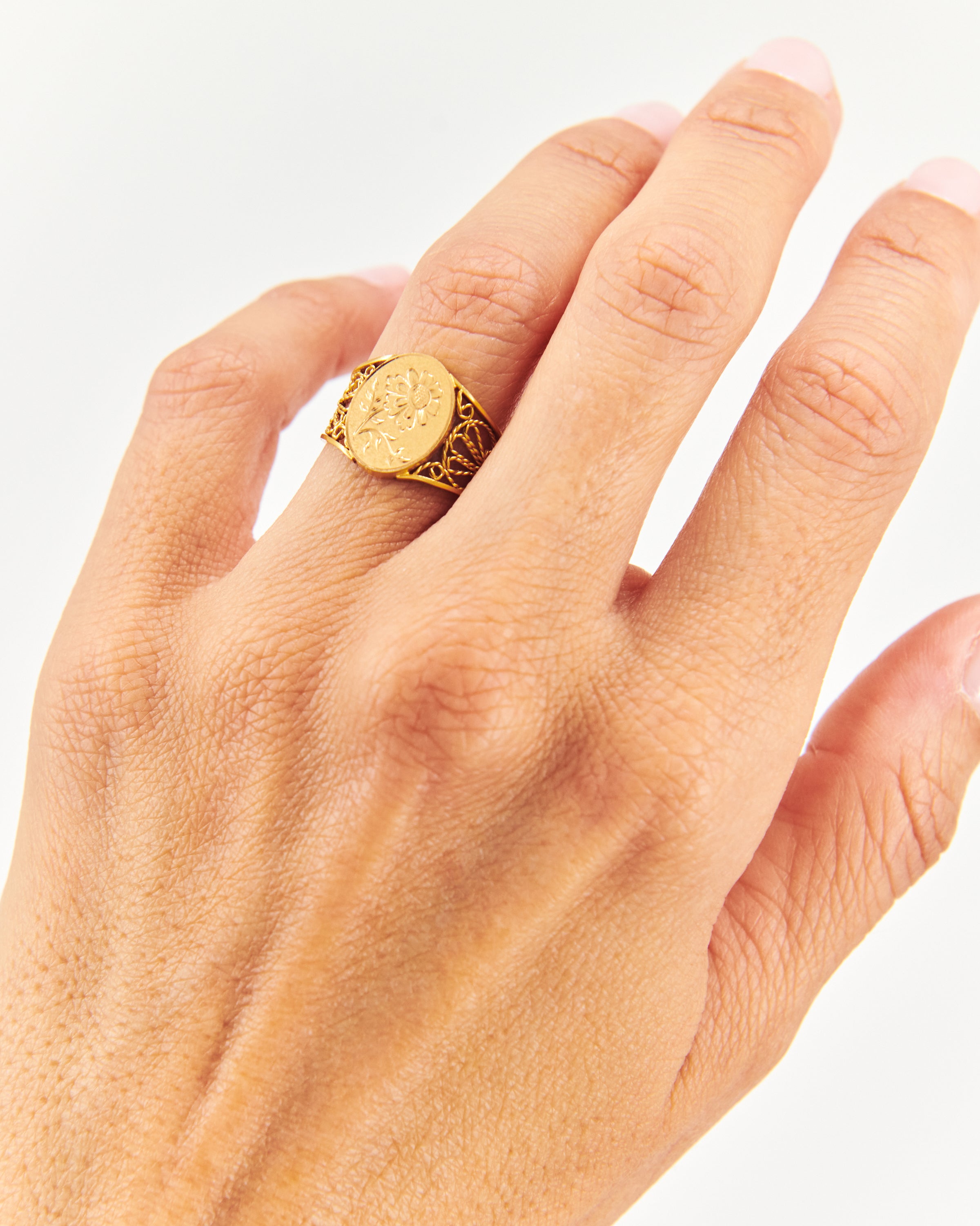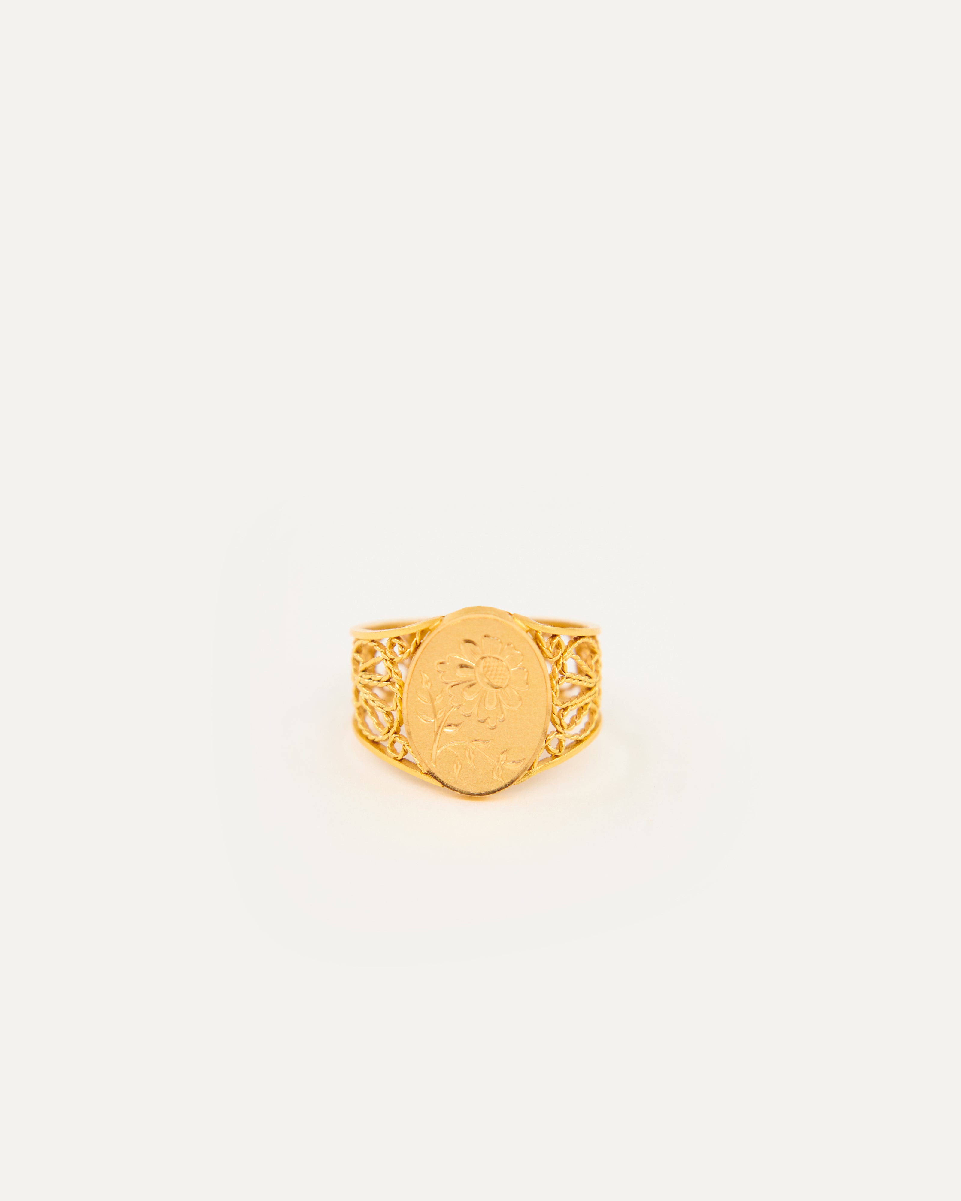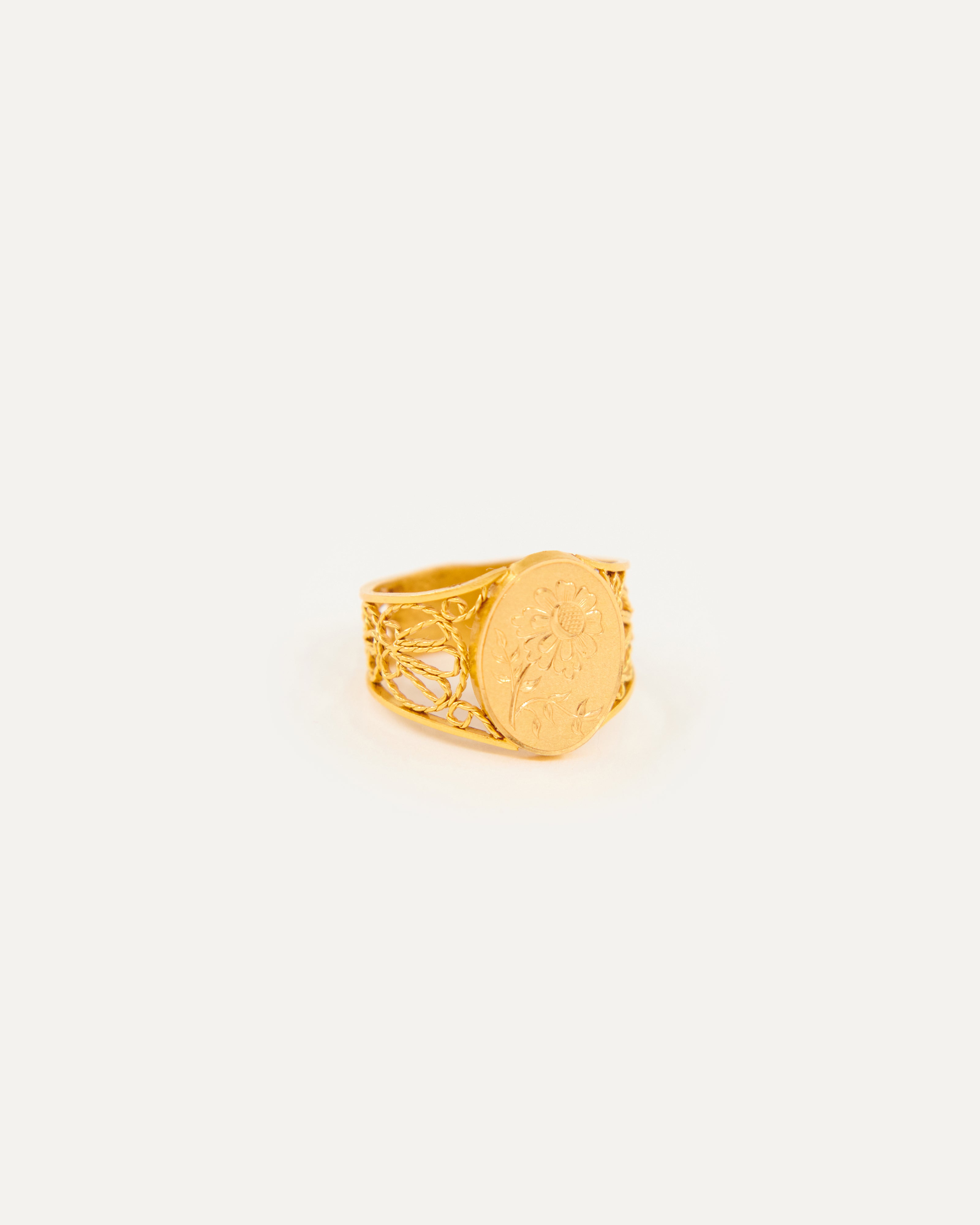 Este sello es una evolución de los anillos tradicionales basado en un óvalo plano envuelto por un brazo de exquisita filigrana. Uno de los principales grabados de la marca es el grabado floral, inspirado en las flores del campo ibicenco a principios de la primavera que comienzan a despertar después de un corto invierno en la isla.