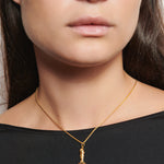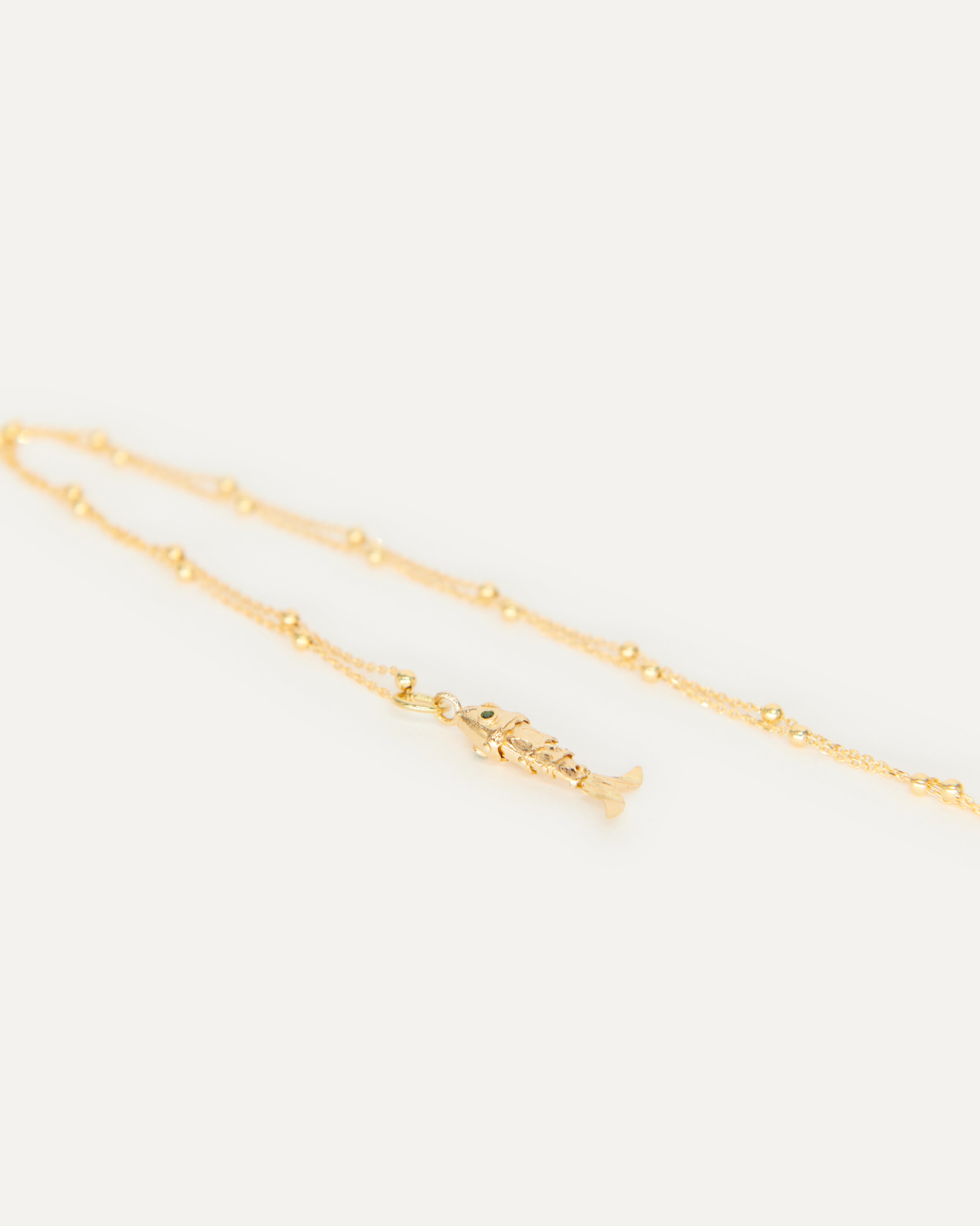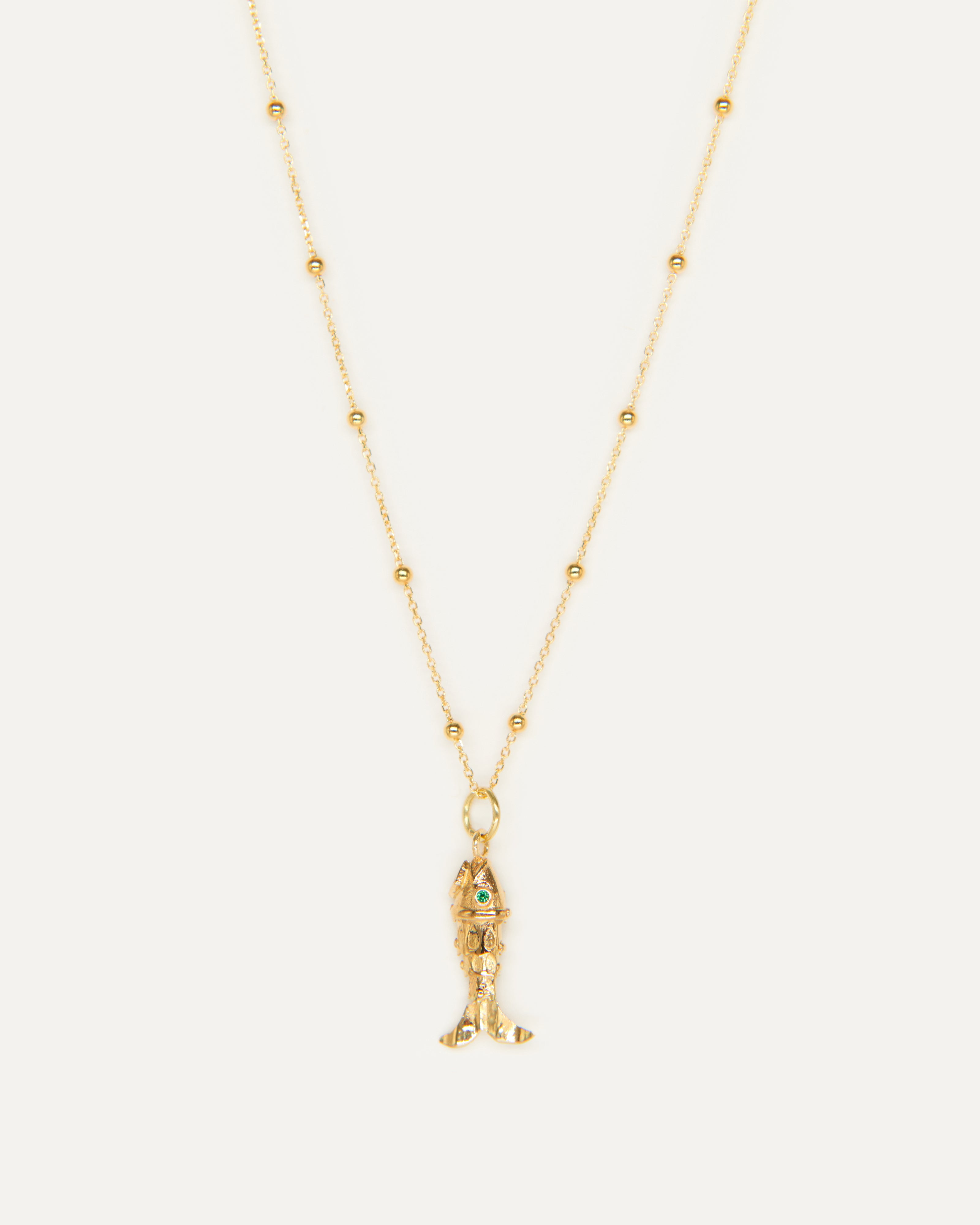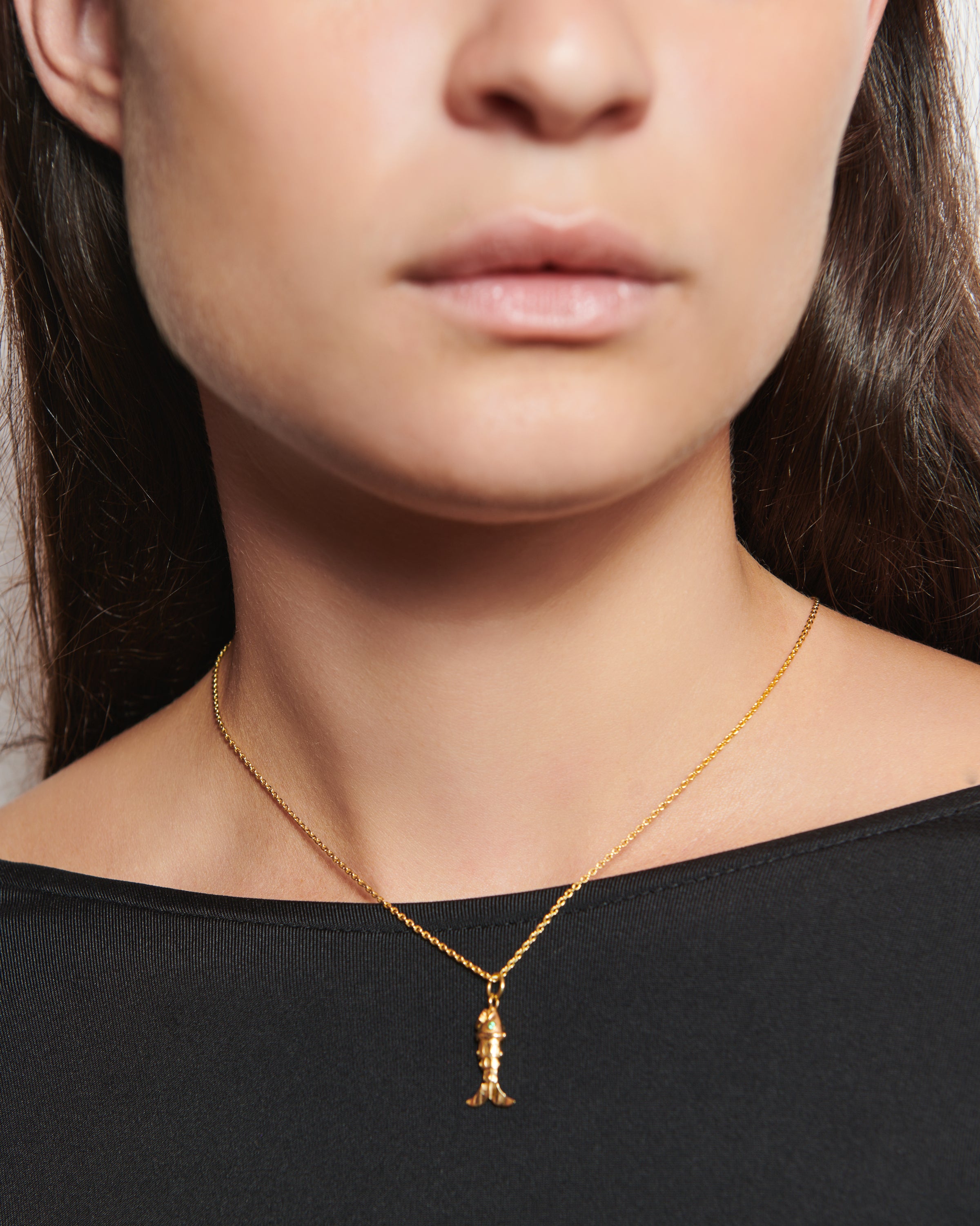 Este colgante es una versión del pez que Pepín, padre de Elisa, le regaló a su hija cuando apenas tenía cinco años como amuleto. Actualmente, Elisa ha transformado esta pieza y le ha dado el nombre de Posidonio, inspirado en el filósofo griego que estudiaba los mares y en honor a los campos de 'posidònia' que hacen que los mares de Ibiza y Formentera sean así de cristalinos. Este diseño de menor tamaño está pensado para las personas que quieren usarlo en su día a día