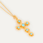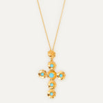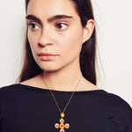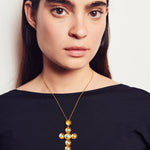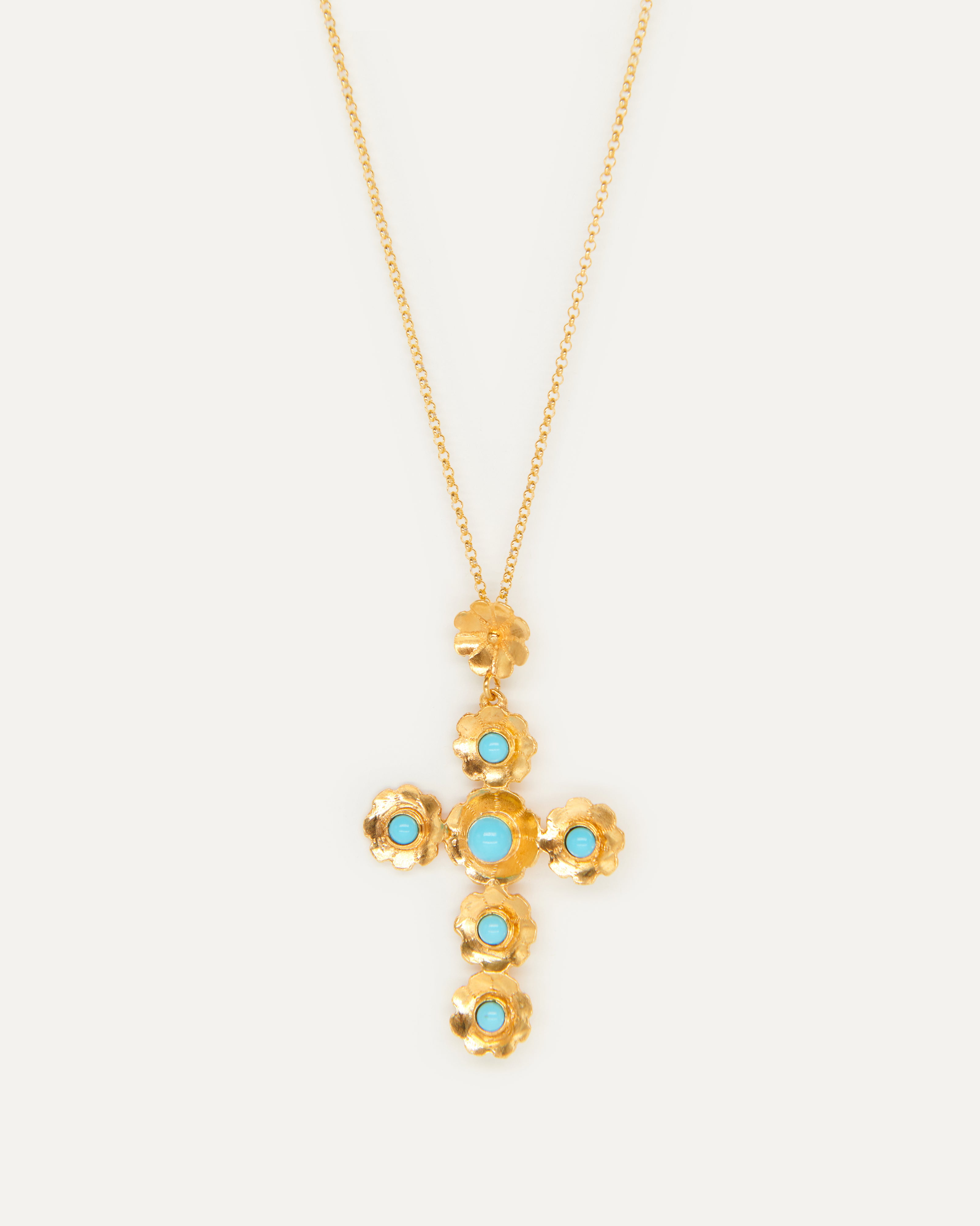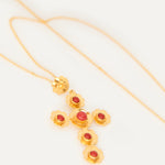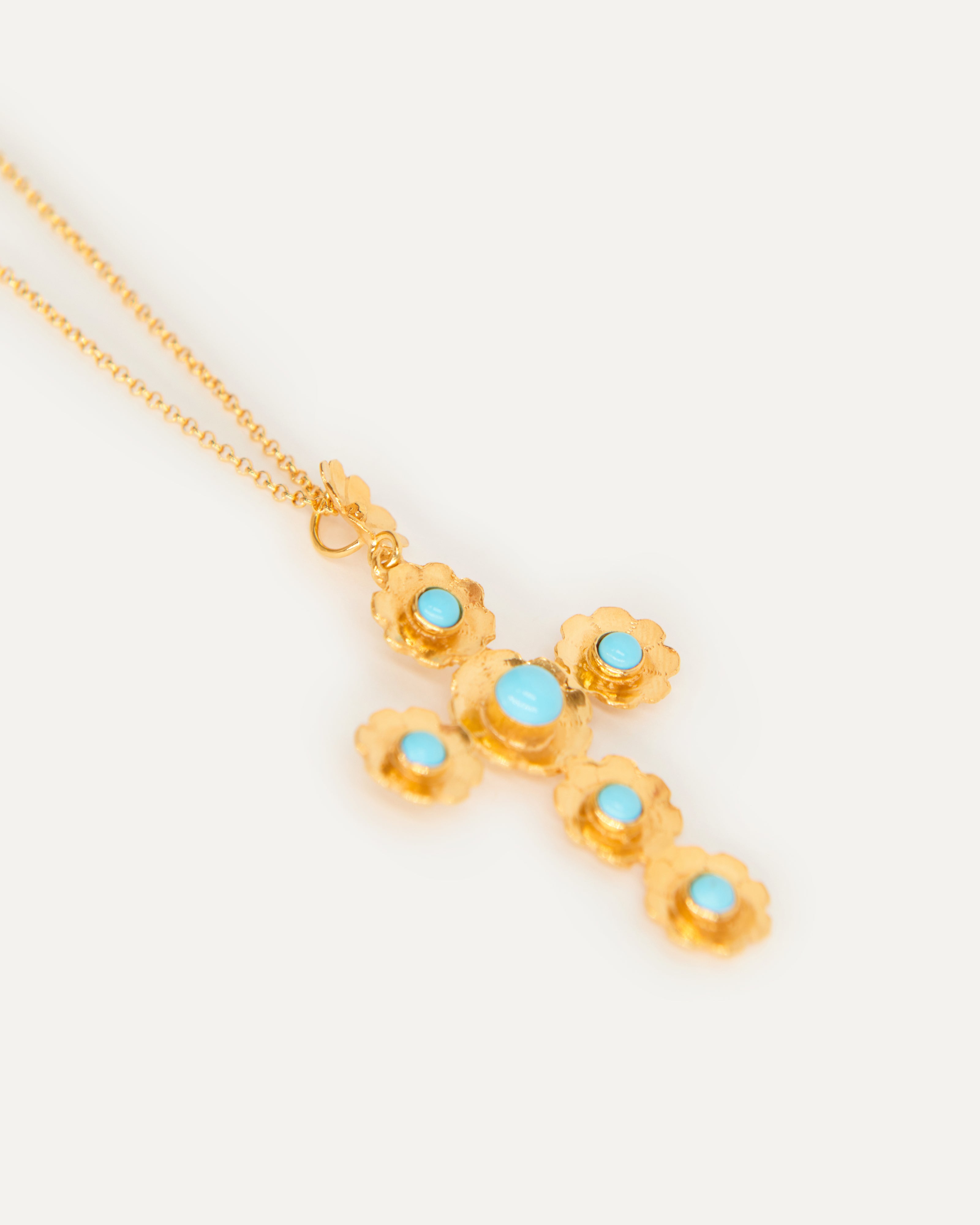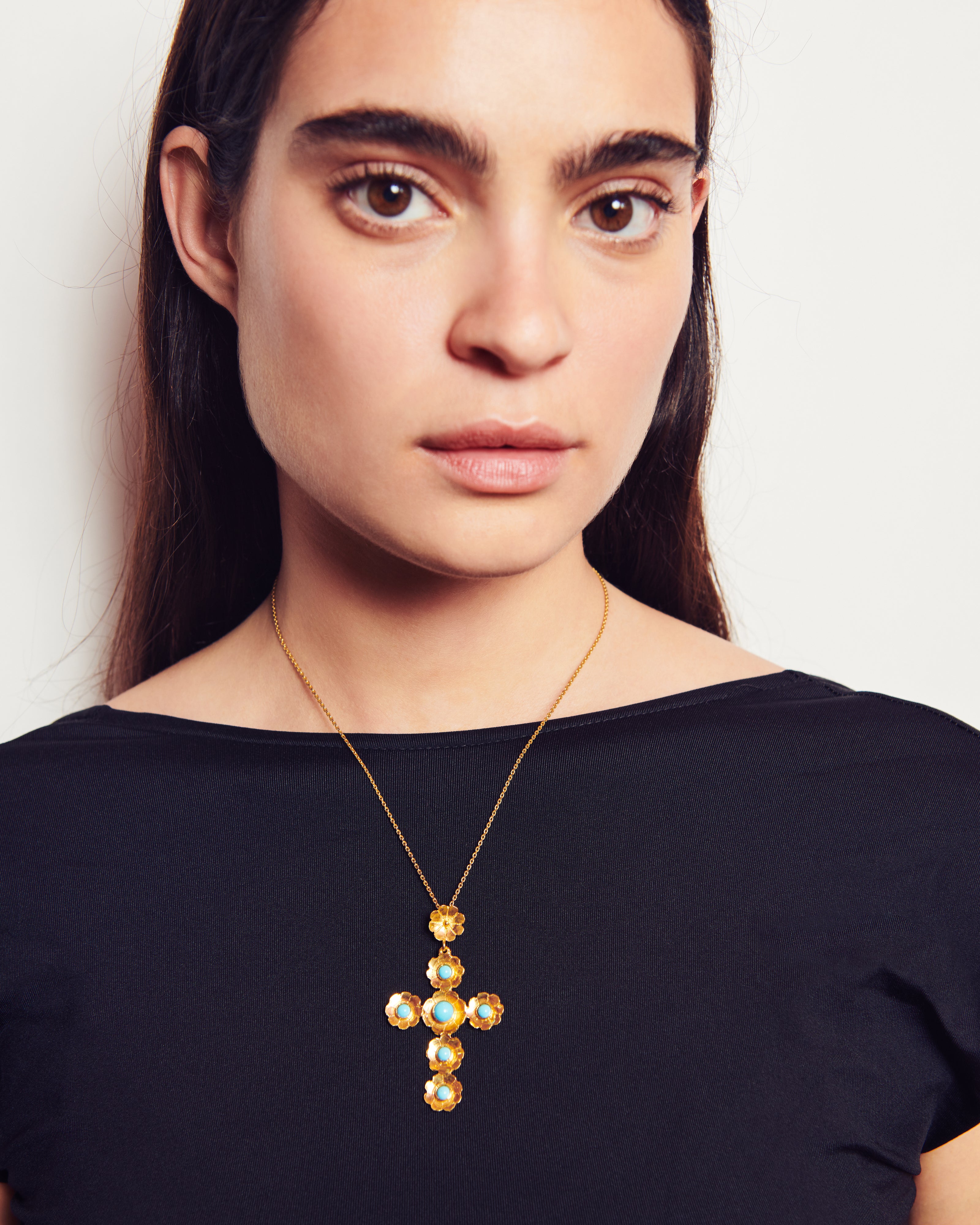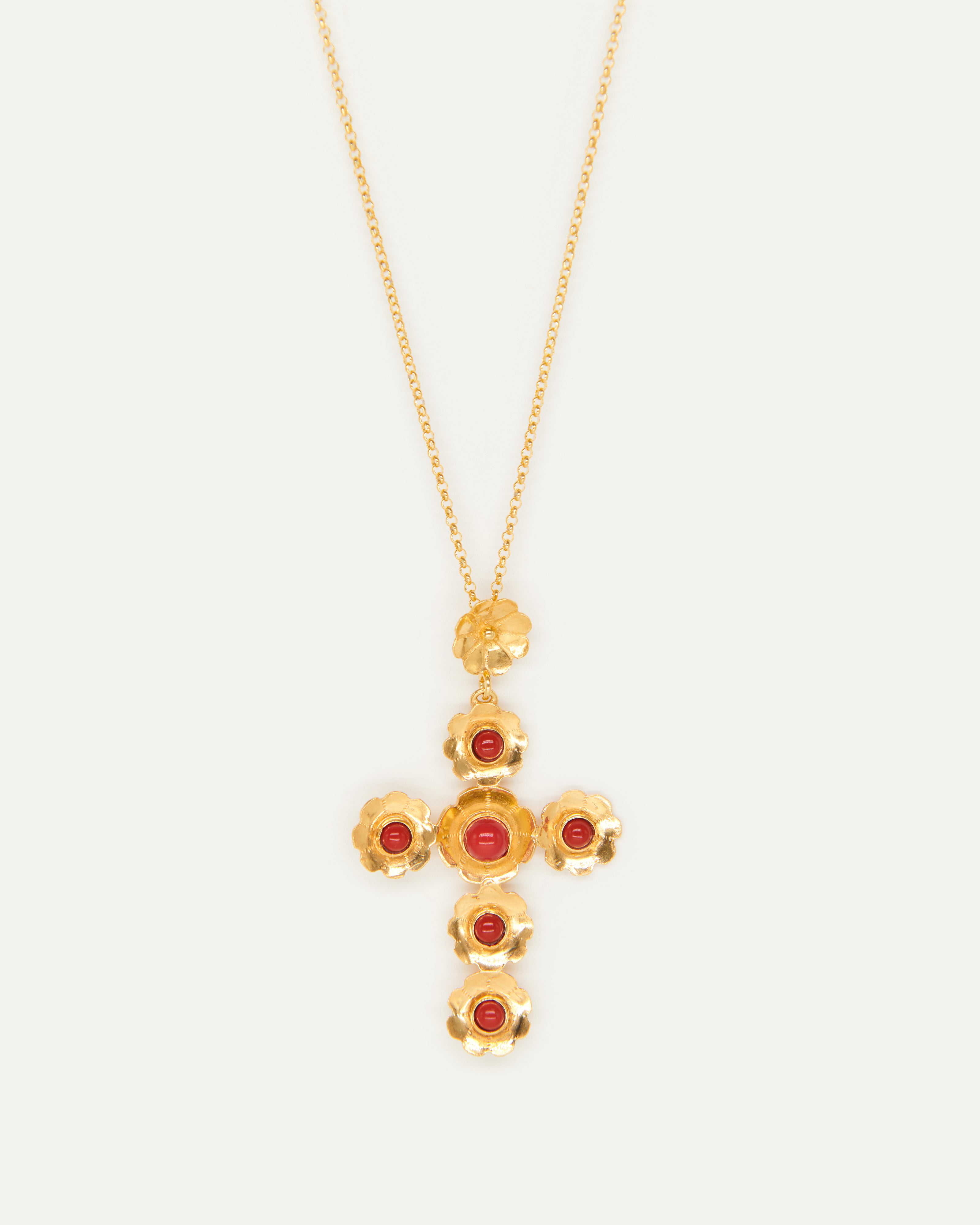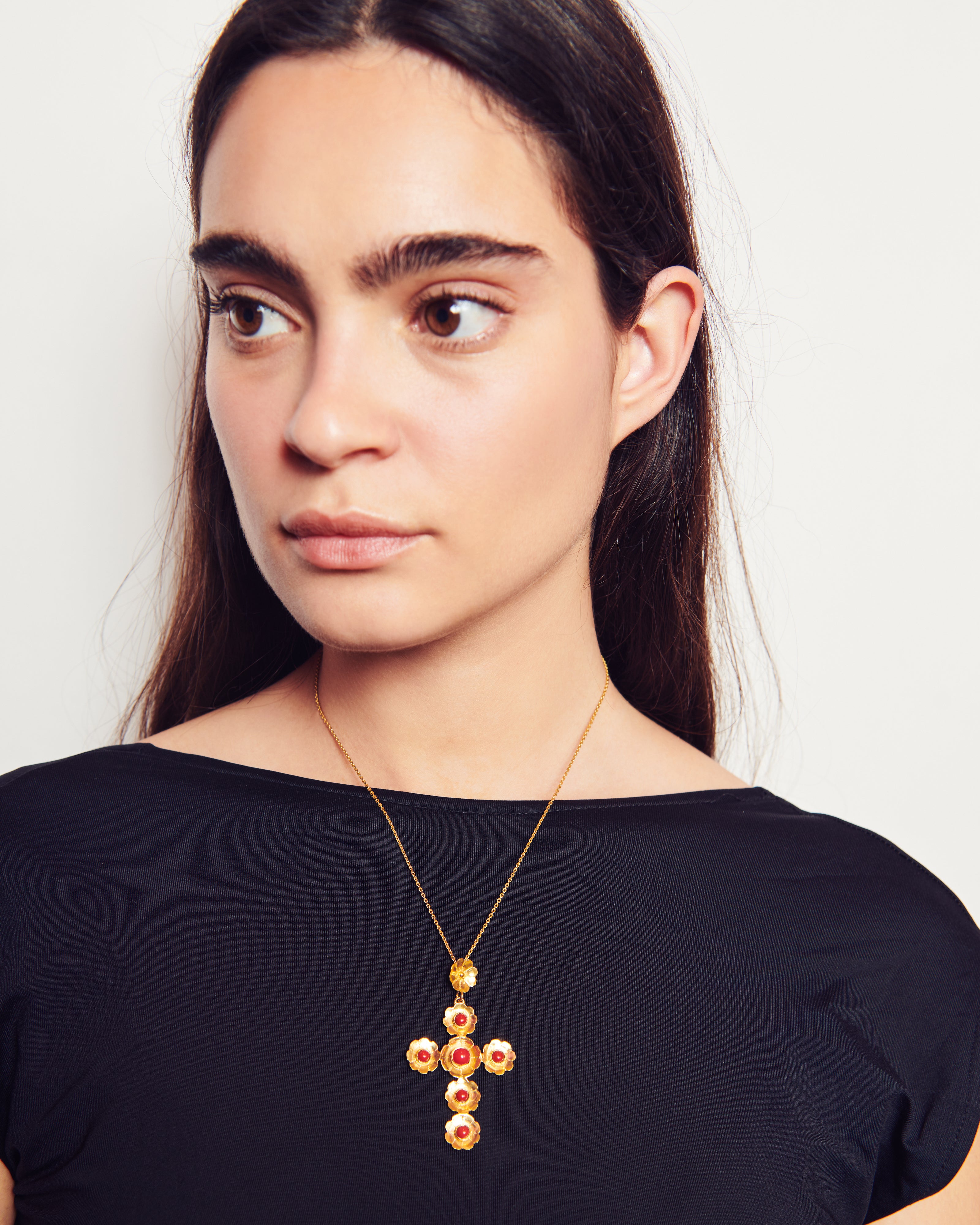 Este colgante es un diseño propio de Elisa basado en tres pilares fundamentales de la tradición ibicenca: la cruz, las flores y el coral. La diseñadora quería dedicarle esta joya a Sant Elm, la iglesia de La Marina donde vive la Virgen del Carmen, patrona y protectora de los marineros y de los amantes del mar, además de ser el lugar donde se casaron los padres de la artista ibicenca y la bautizaron a ella y a sus dos hermanas.