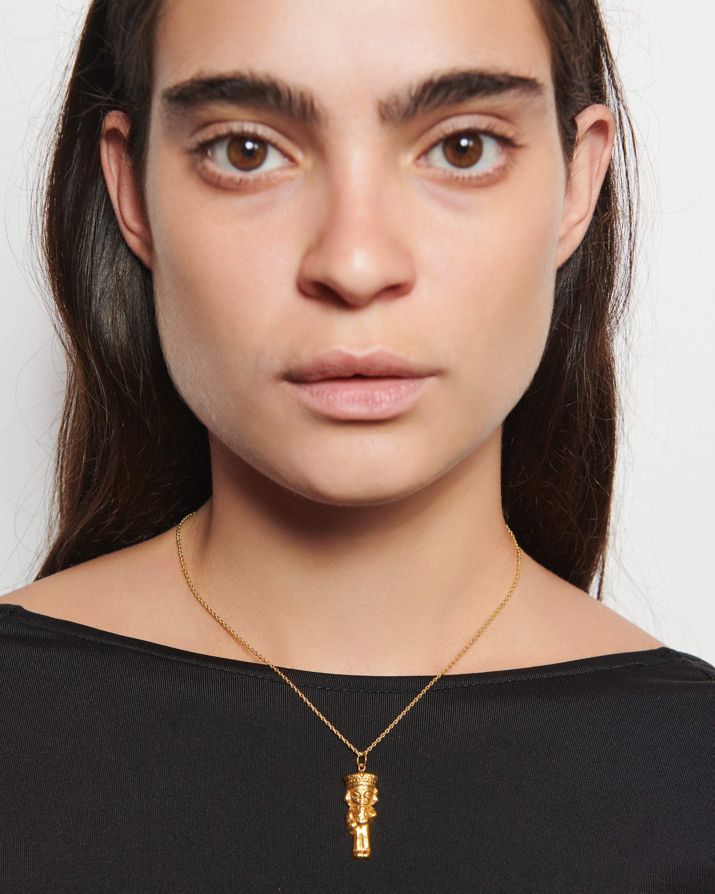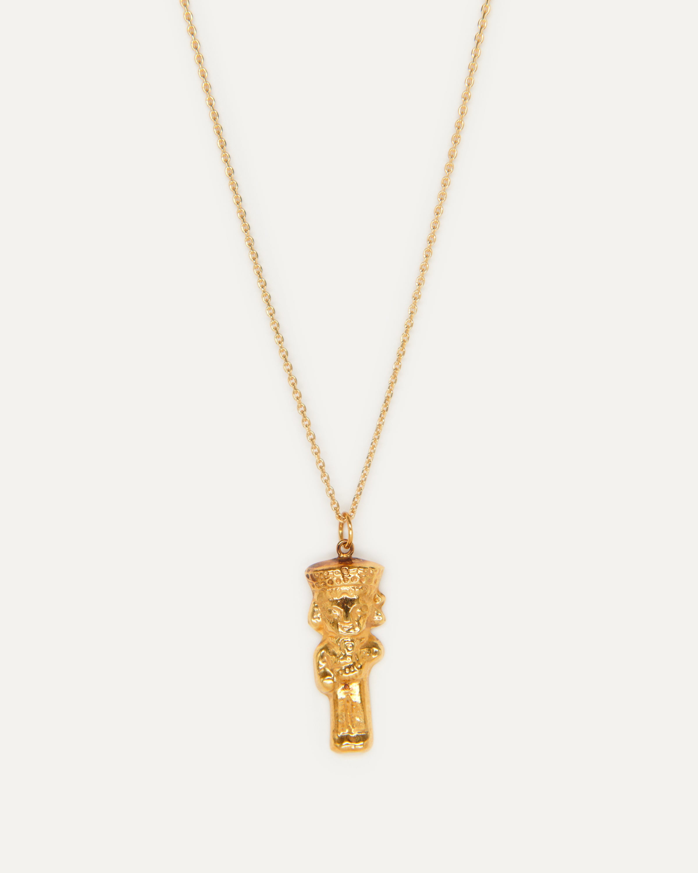 El colgante del Dios Manco se inspira en una antigua estatua encontrada en Ibiza que rendía culto a un dios fenicio, pero con una peculiaridad: le faltaba un brazo. Esta figura incompleta capturó la imaginación local, y en los años 60 la familia Pomar creó un diseño en su honor, simbolizando la belleza en la imperfección y la conexión con el pasado misterioso de la isla. Elisa Pomar ha rescatado este icónico diseño, fusionando historia y leyenda en una joya única que rinde homenaje a las raíces fenicias de Ibiza.