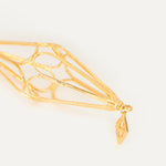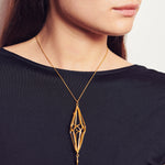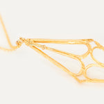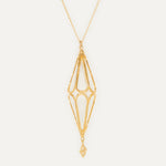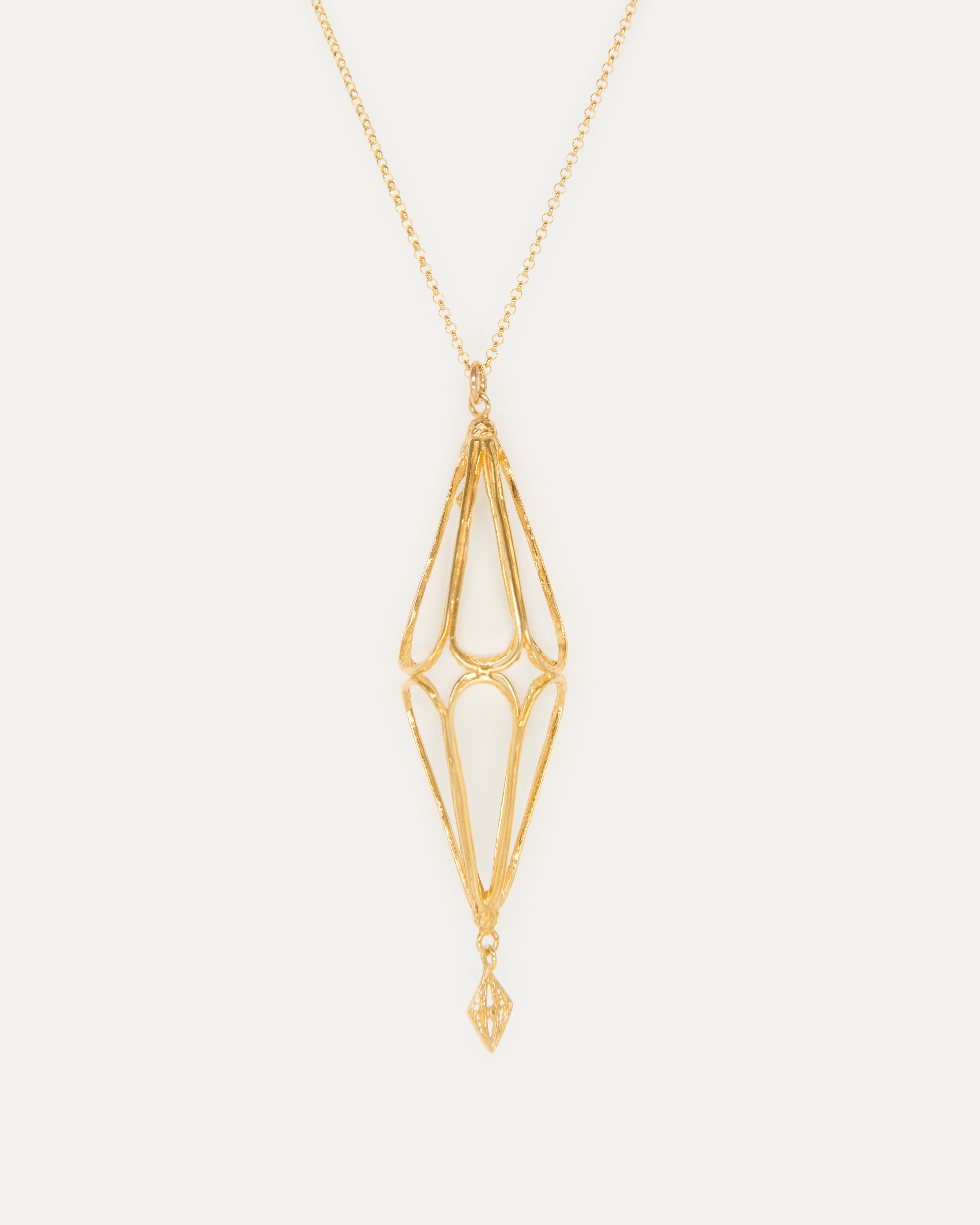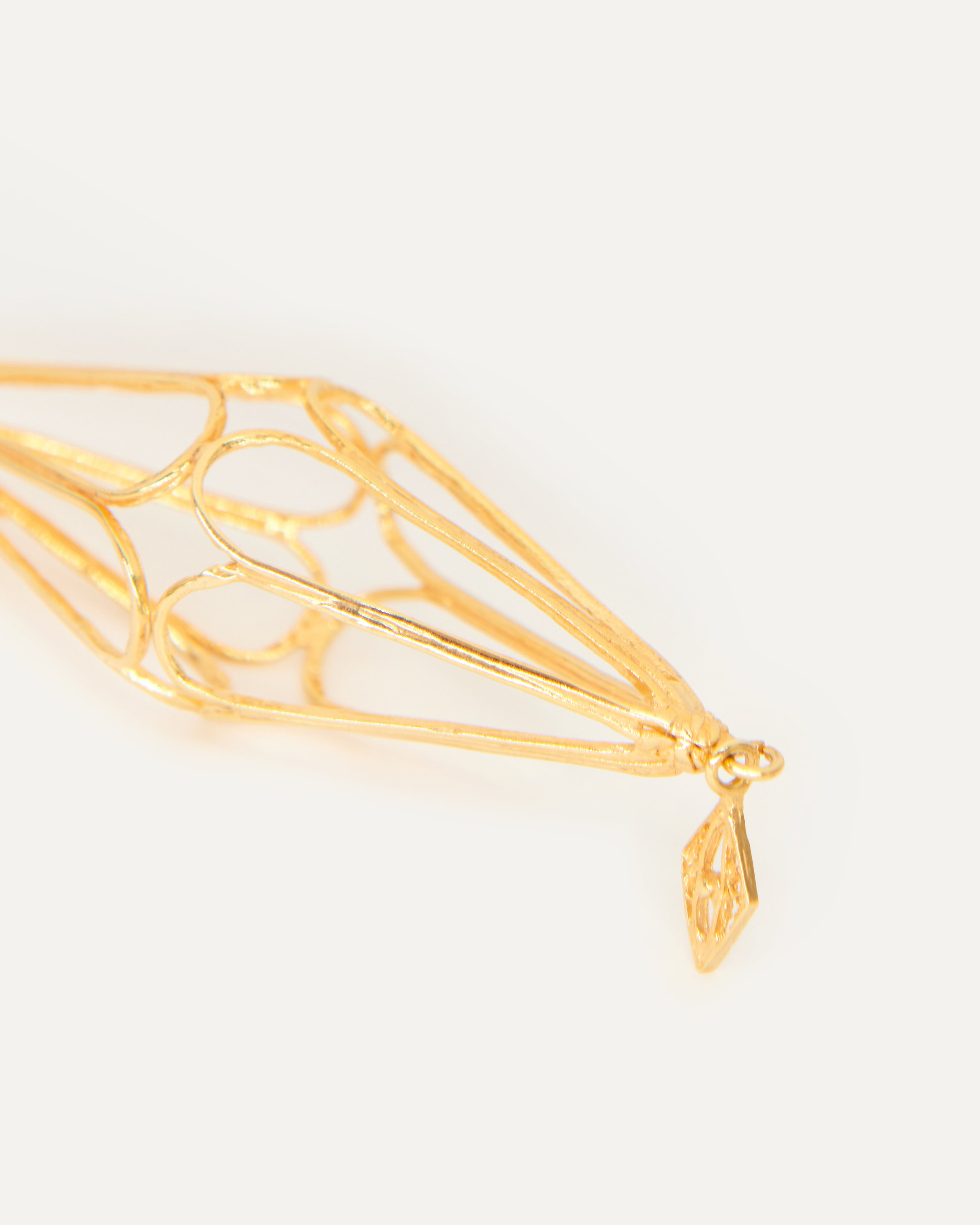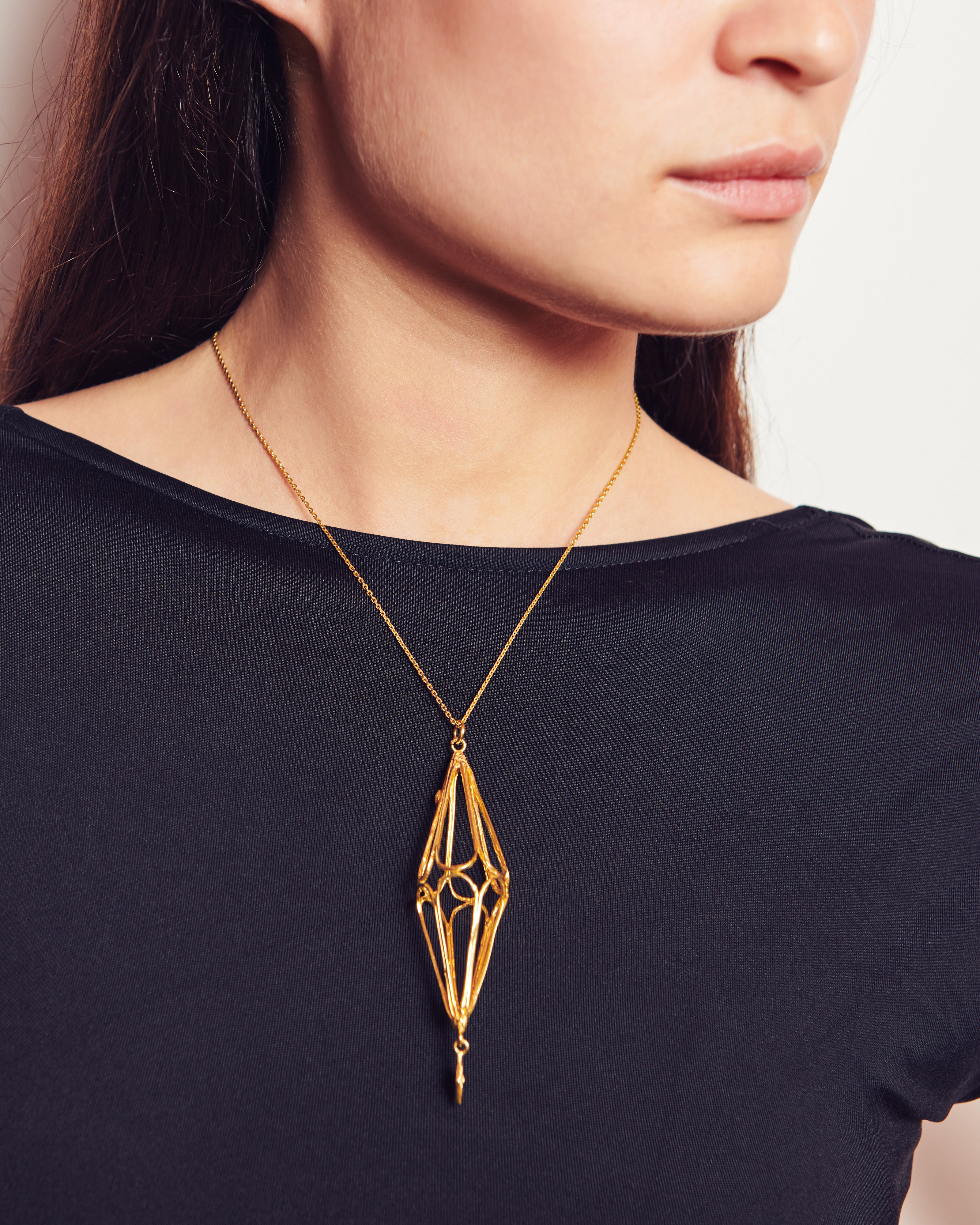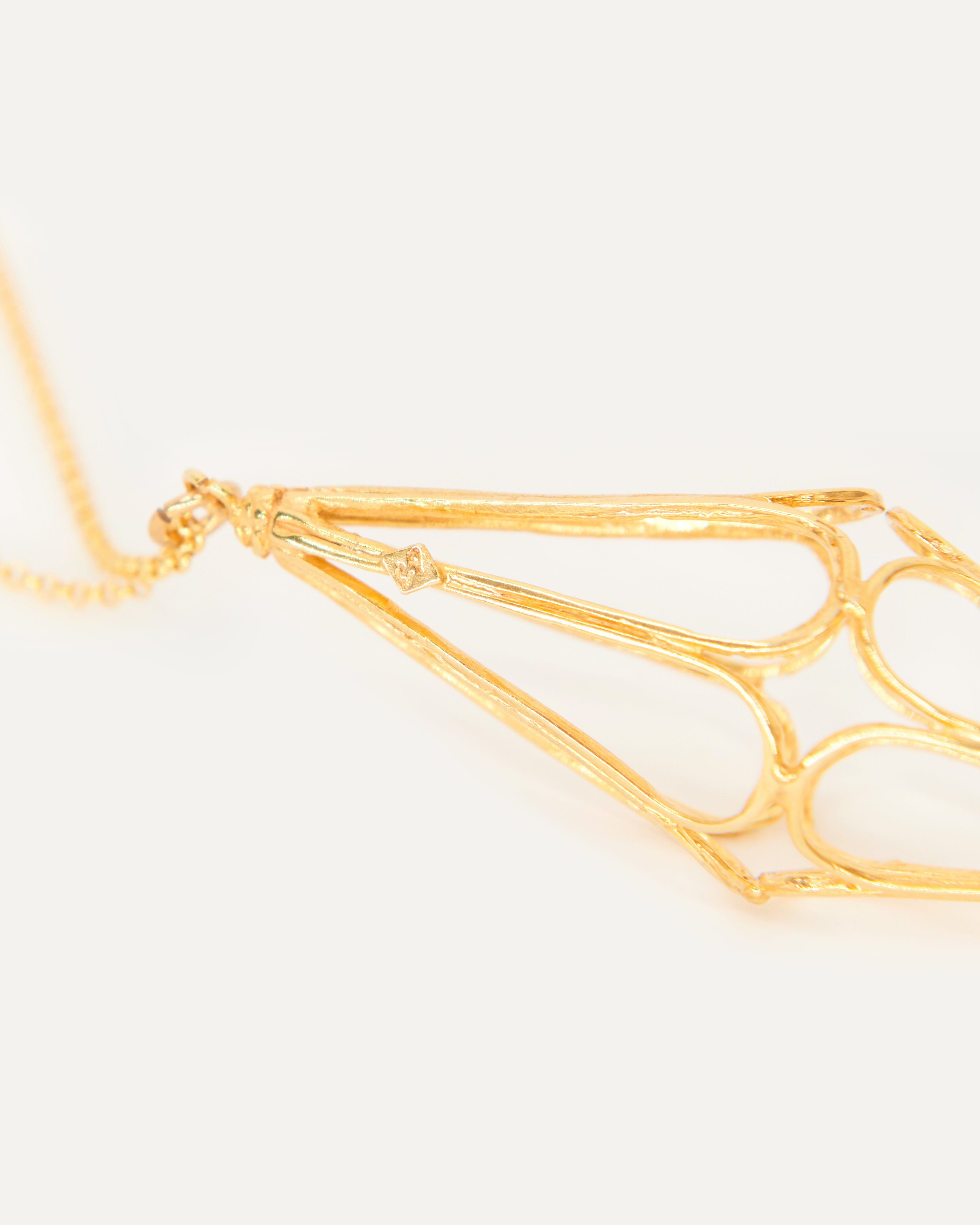 Colgante inspirado en el Gra d'Ordi de la Emprendada. El nombre 'Gra d'Ordi' se debe a la similitud del la joya, que tiene forma de rombo, con el grano de la cebada que tan frecuentada era en los campos ibicencos. Con este diseño, Elisa consigue una forma más estilizada y sencilla, alargando la forma del rombo tradicional con un trabajo hueco y aumentando su tamaño.