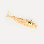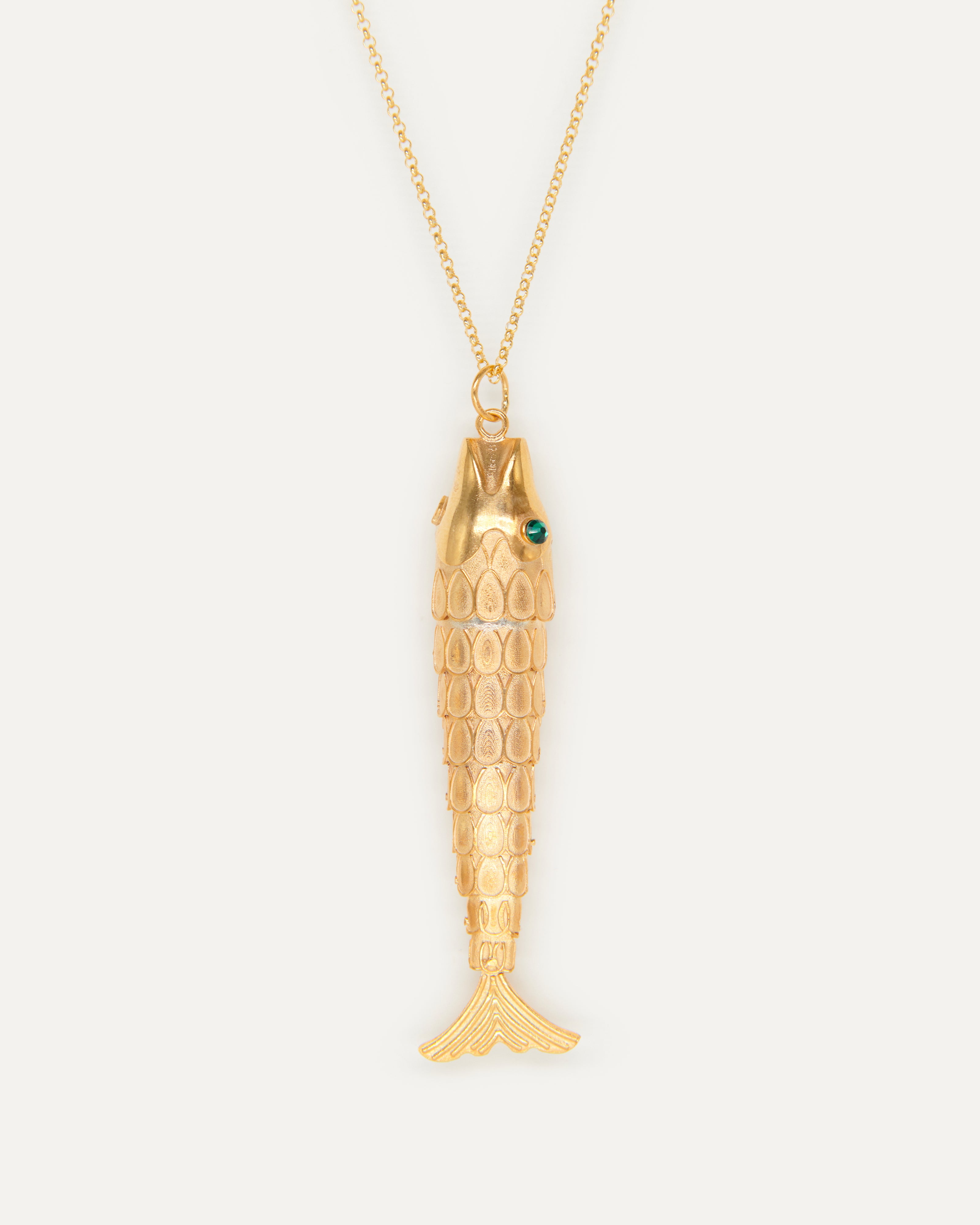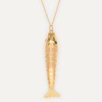 Este colgante es una versión del pez que Pepín, padre de Elisa, le regaló a su hija cuando apenas tenía cinco años como amuleto. Actualmente, Elisa ha transformado esta pieza y le ha dado el nombre de Posidonio, inspirado en el filósofo griego que estudiaba los mares y en honor a los campos de 'posidònia' que hacen que los mares de Ibiza y Formentera sean así de cristalinos. Esta versión XL del diseño es una representación del barroquismo y 'More is 'More' de la marca Elisa Pomar Ibiza.