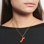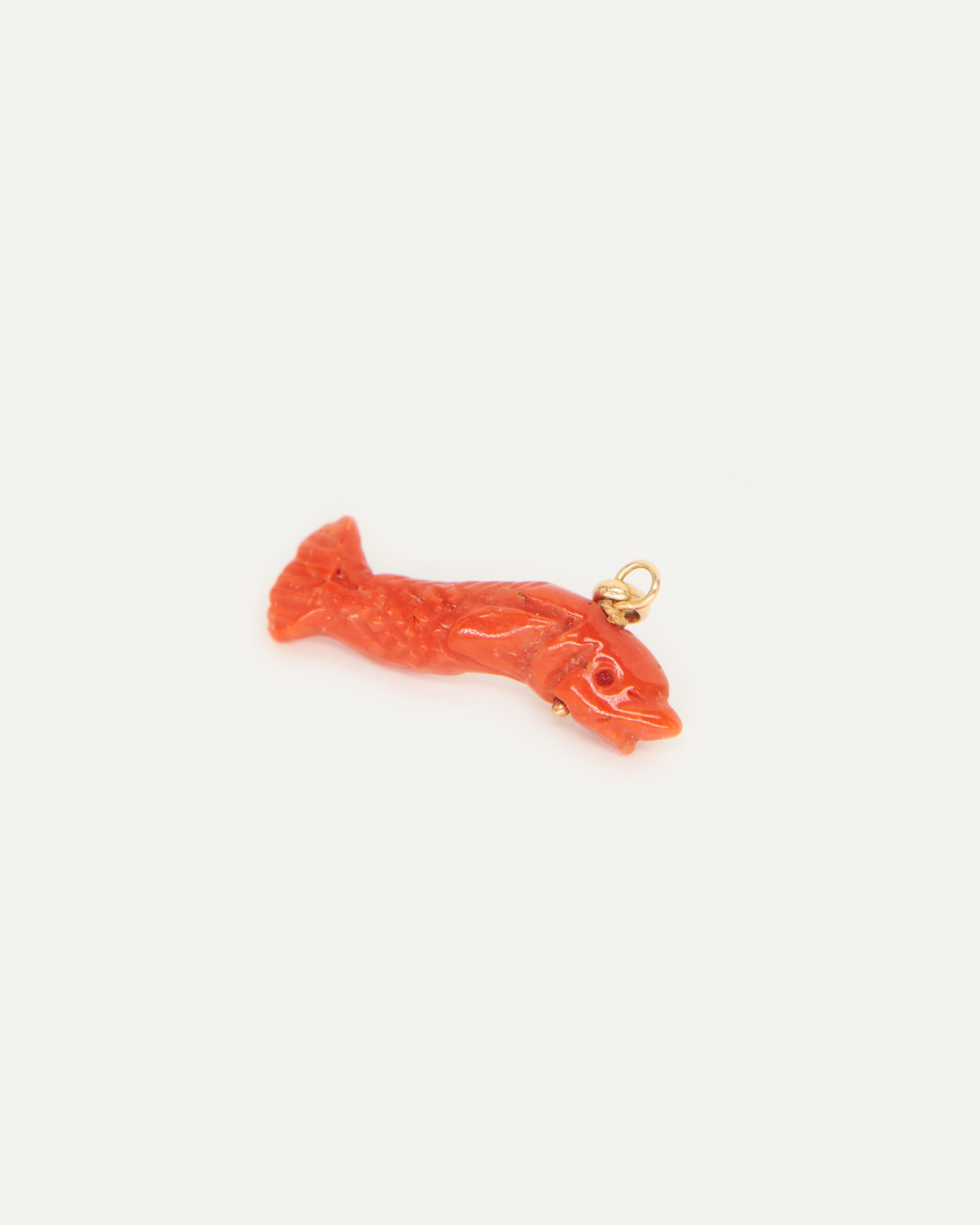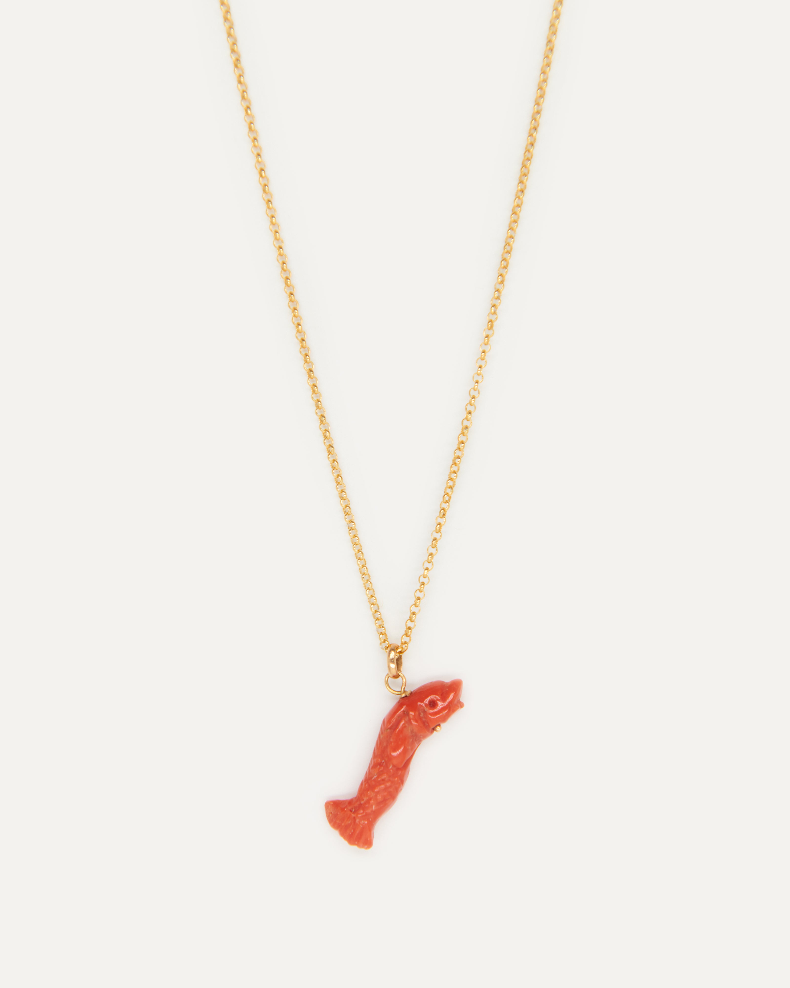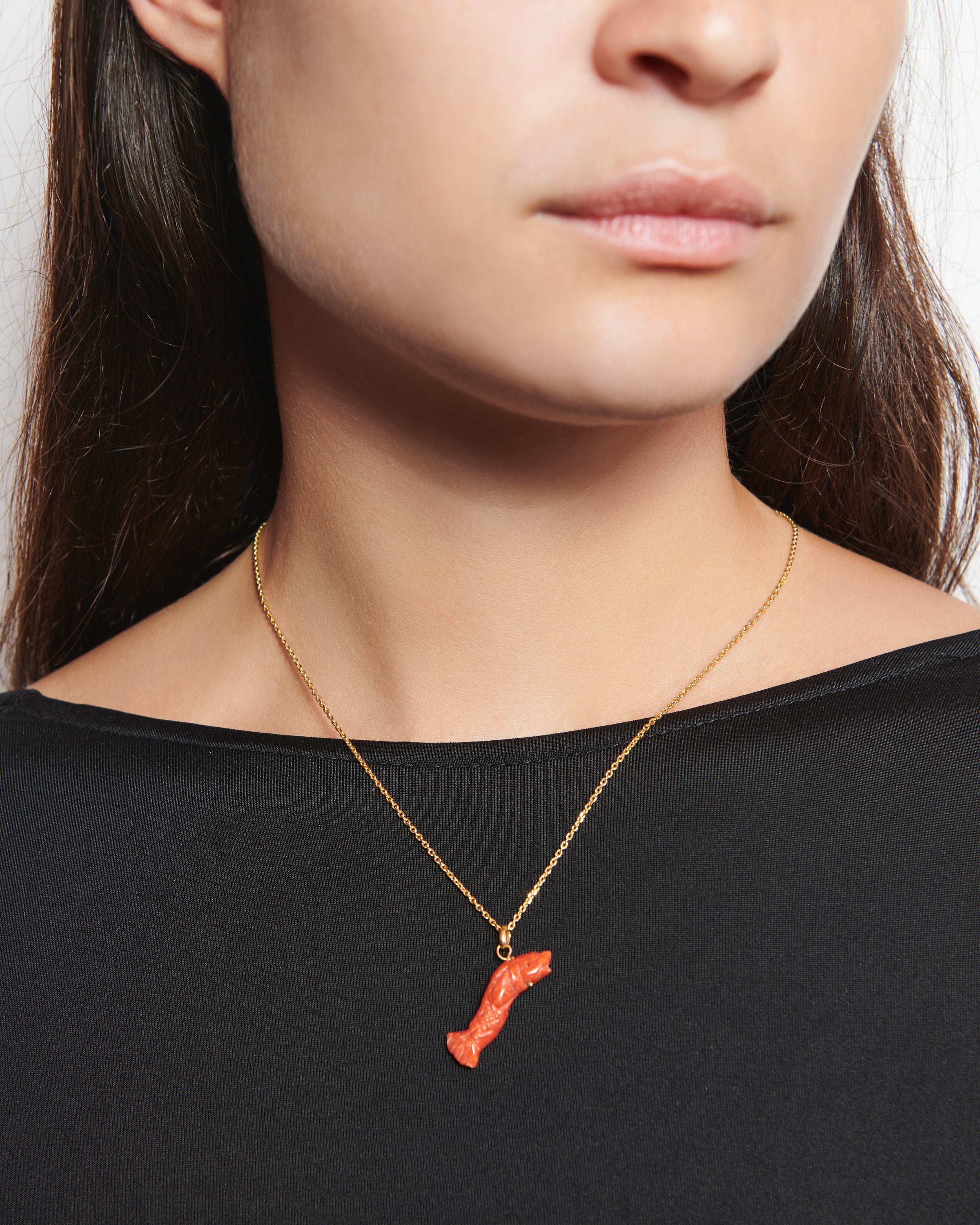 Este colgante es una versión en coral natural del pez que Pepín, padre de Elisa, le regaló a su hija cuando apenas tenía cinco años como amuleto. El coral es un símbolo muy importante en Ibiza y el Mar Mediterráneo, por lo que la diseñadora ha decidido hacer esta versión para los amantes de esta piedra.