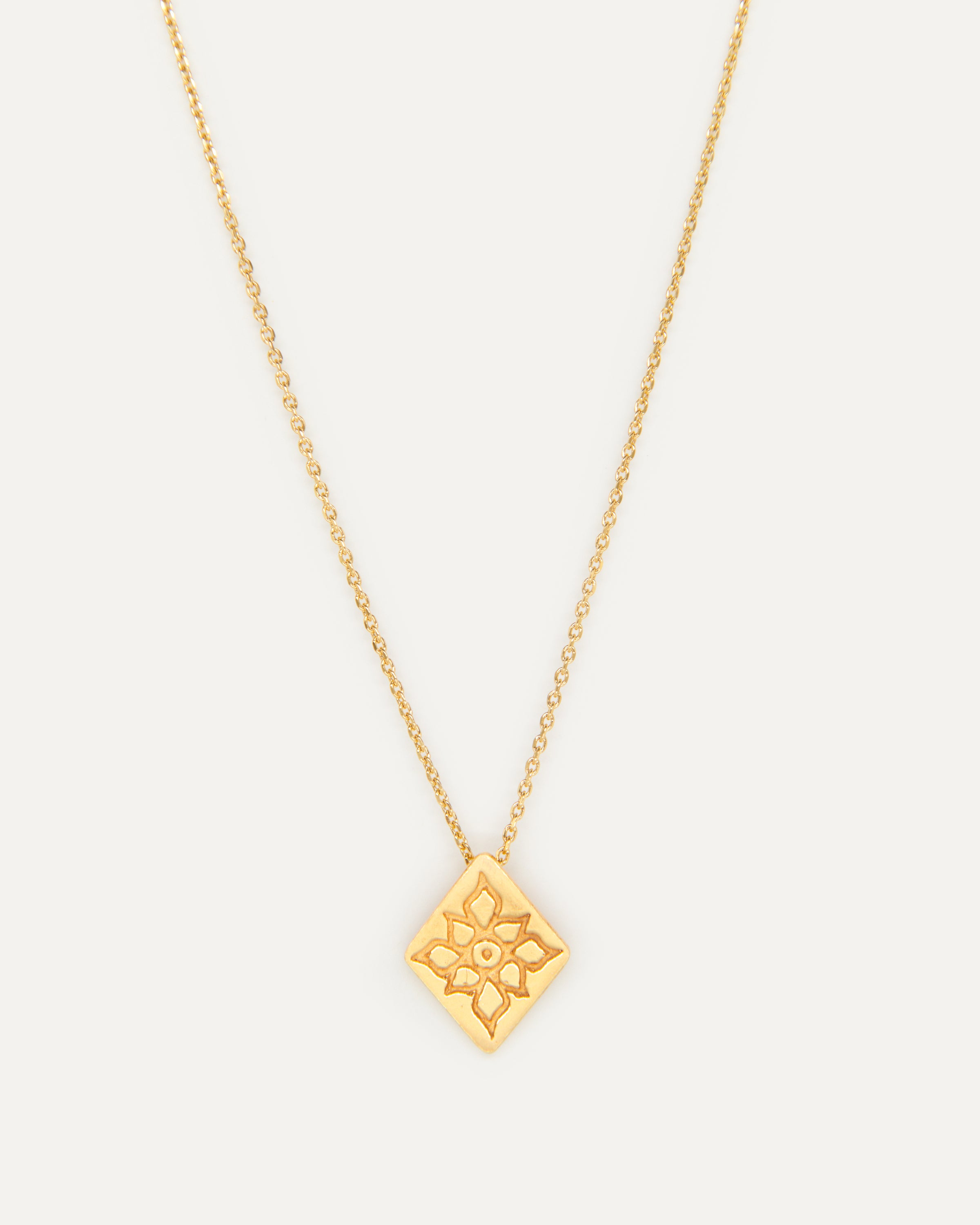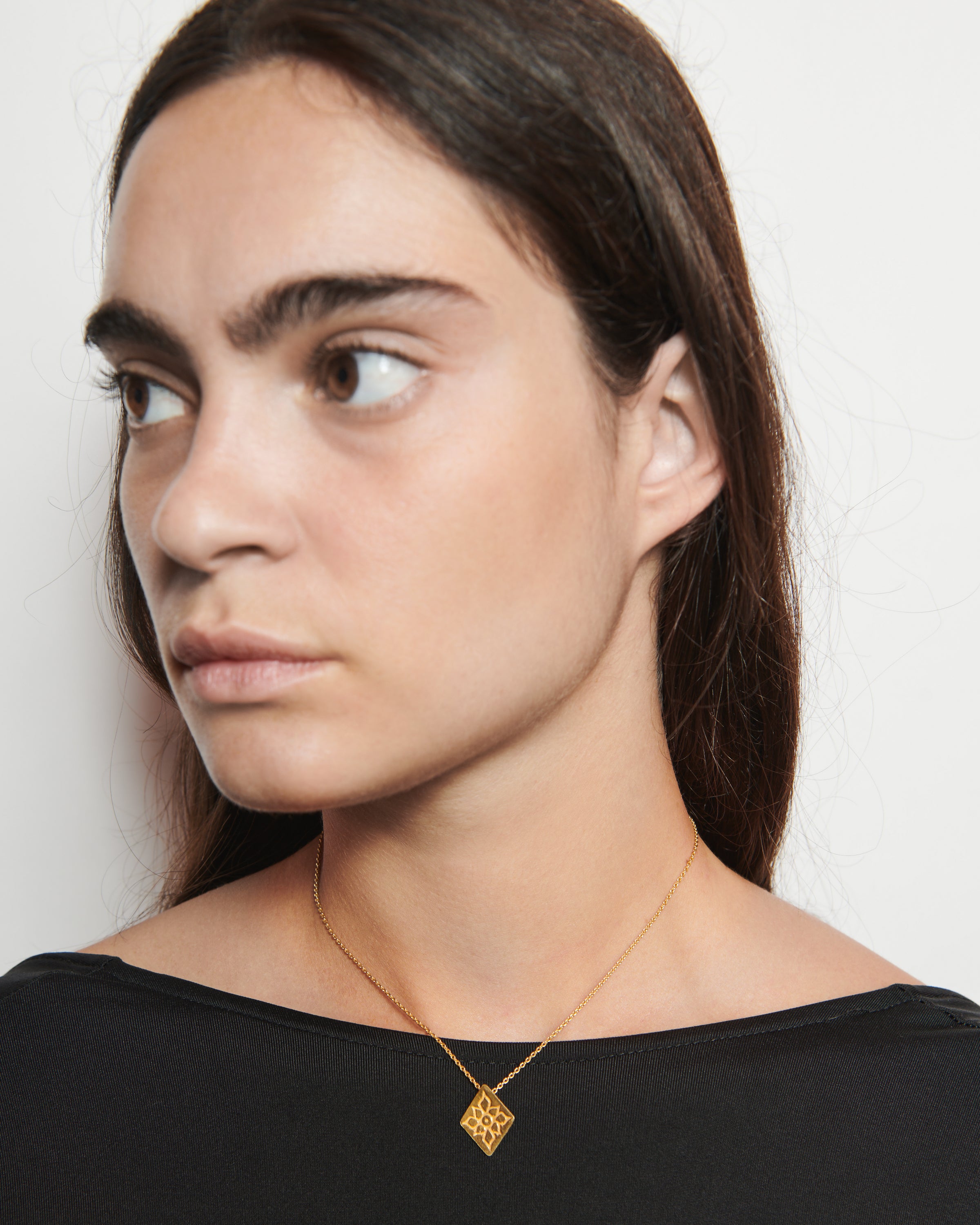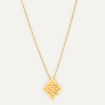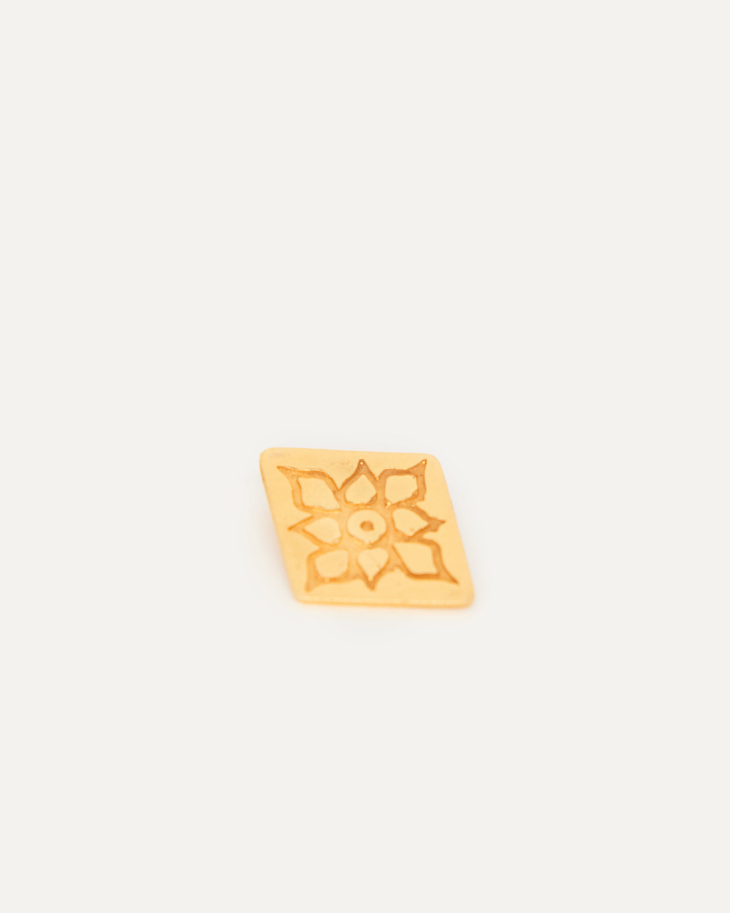 Este colgante pertenece a la edición fenicia, un conjunto de joyas que Elisa crea en honor a la civilización que convirtió Ibiza en un enclave estratégico mundial. Su afán por evolucionar la joyería, el uso de cristales de colores o la fascinación por el oro son rasgos propiamente fenicios que forman parte del ADN de la marca ibicenca. Por esa razón, la diseñadora ha optado por elementos como este rombo grabado para homenajear a este pueblo tan influyente en Ibiza.
