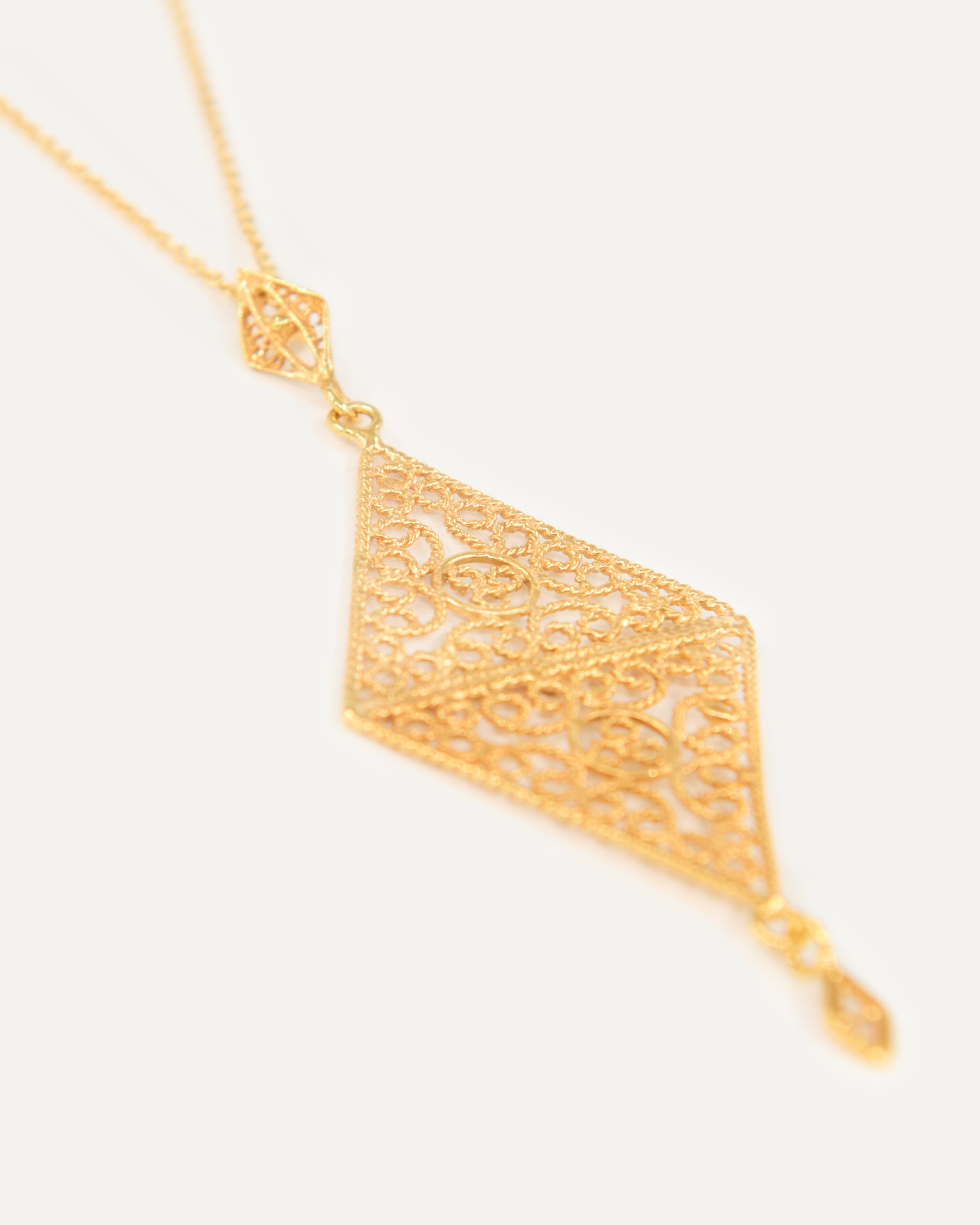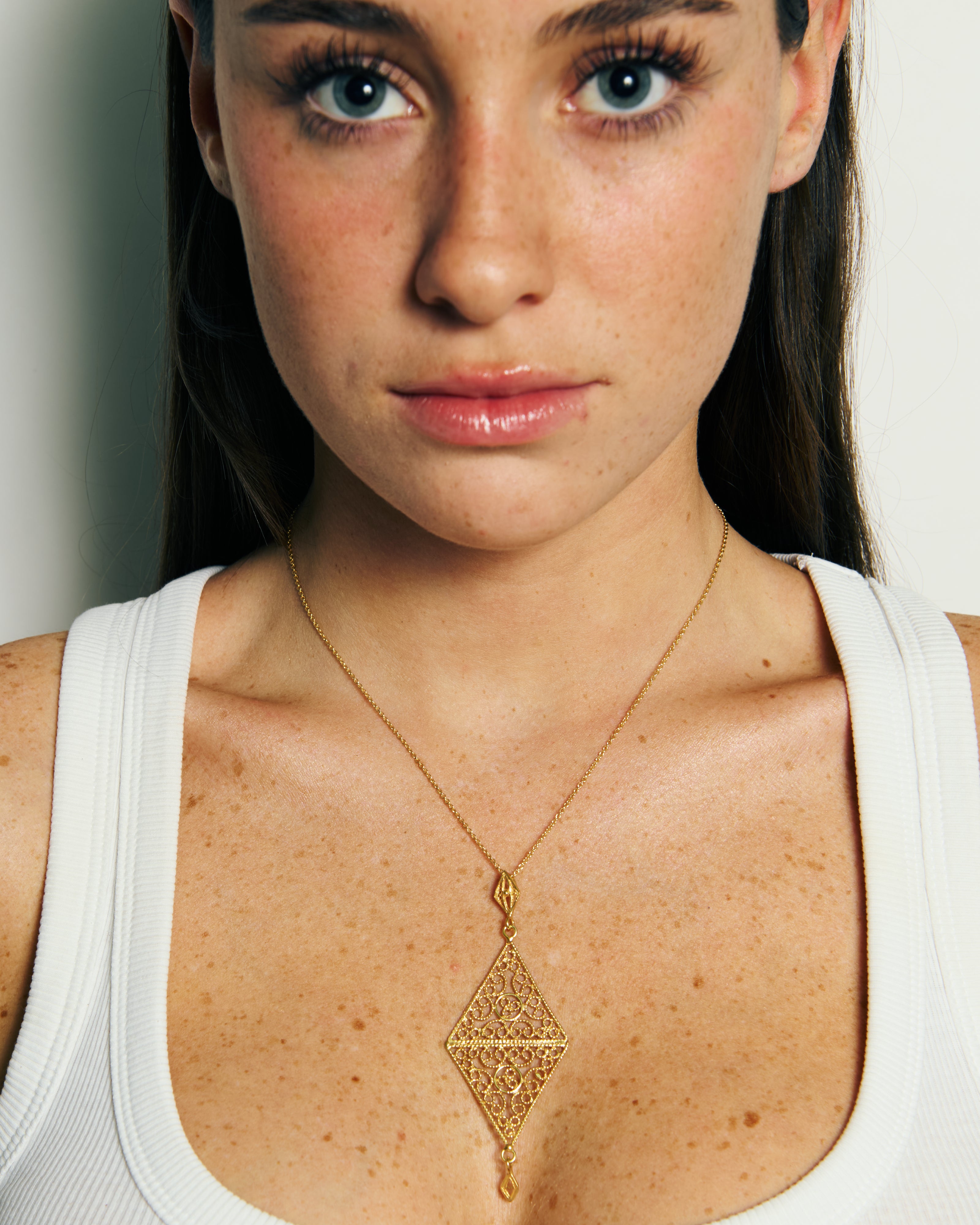 Este colgante recupera la esencia rural de Ibiza y la traduce a un lenguaje contemporáneo. Elisa Pomar reinterpreta la filigrana tradicional de la joyería ibicenca y la transforma en una versión plana y depurada, manteniendo su alma ancestral. Joyas que no adornan: revelan.