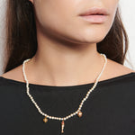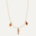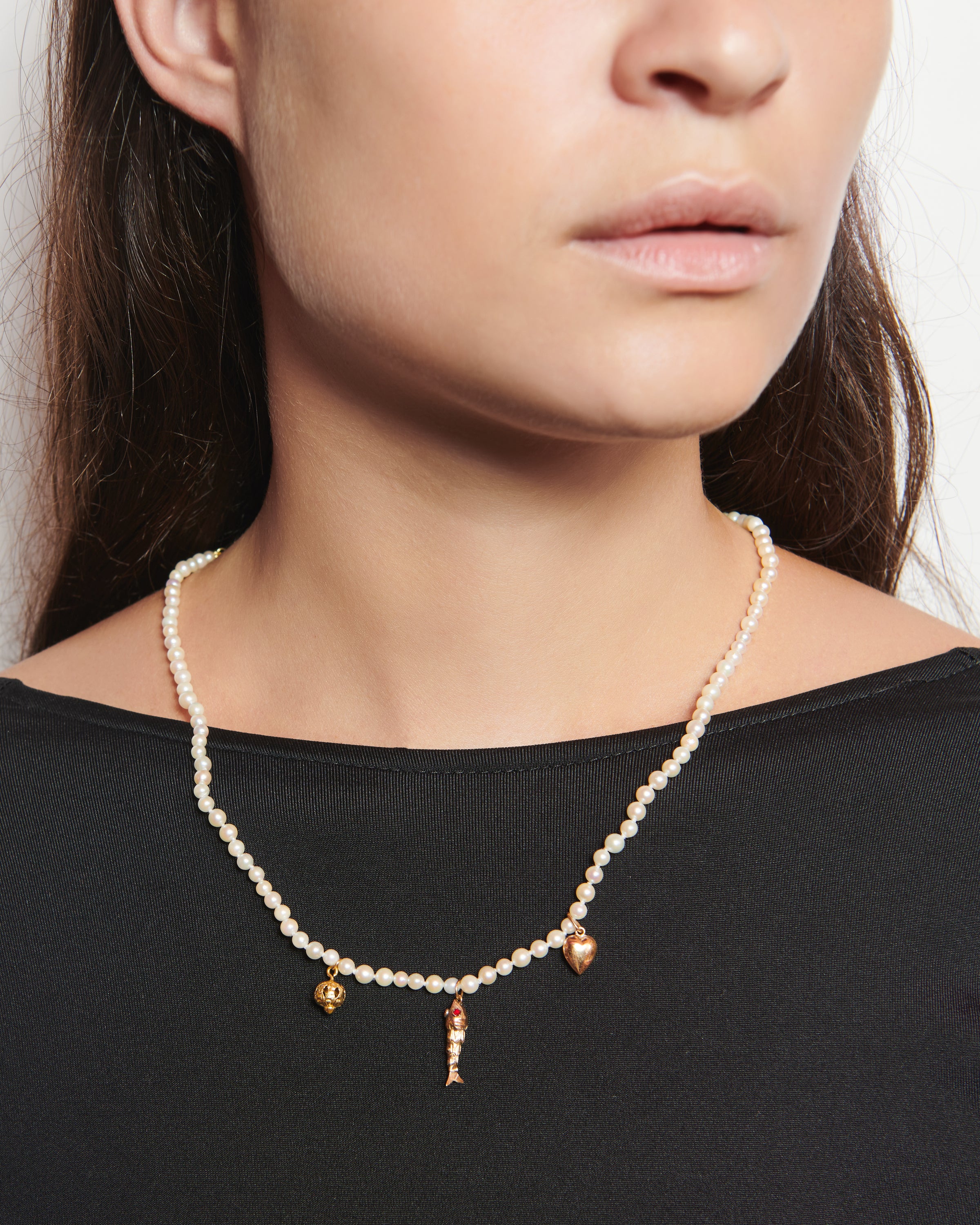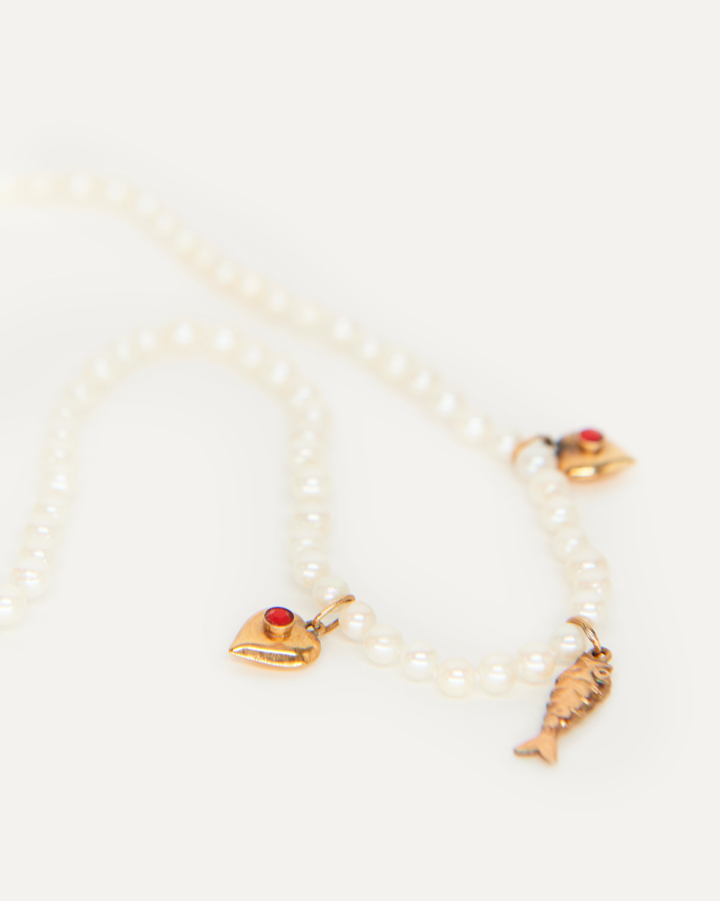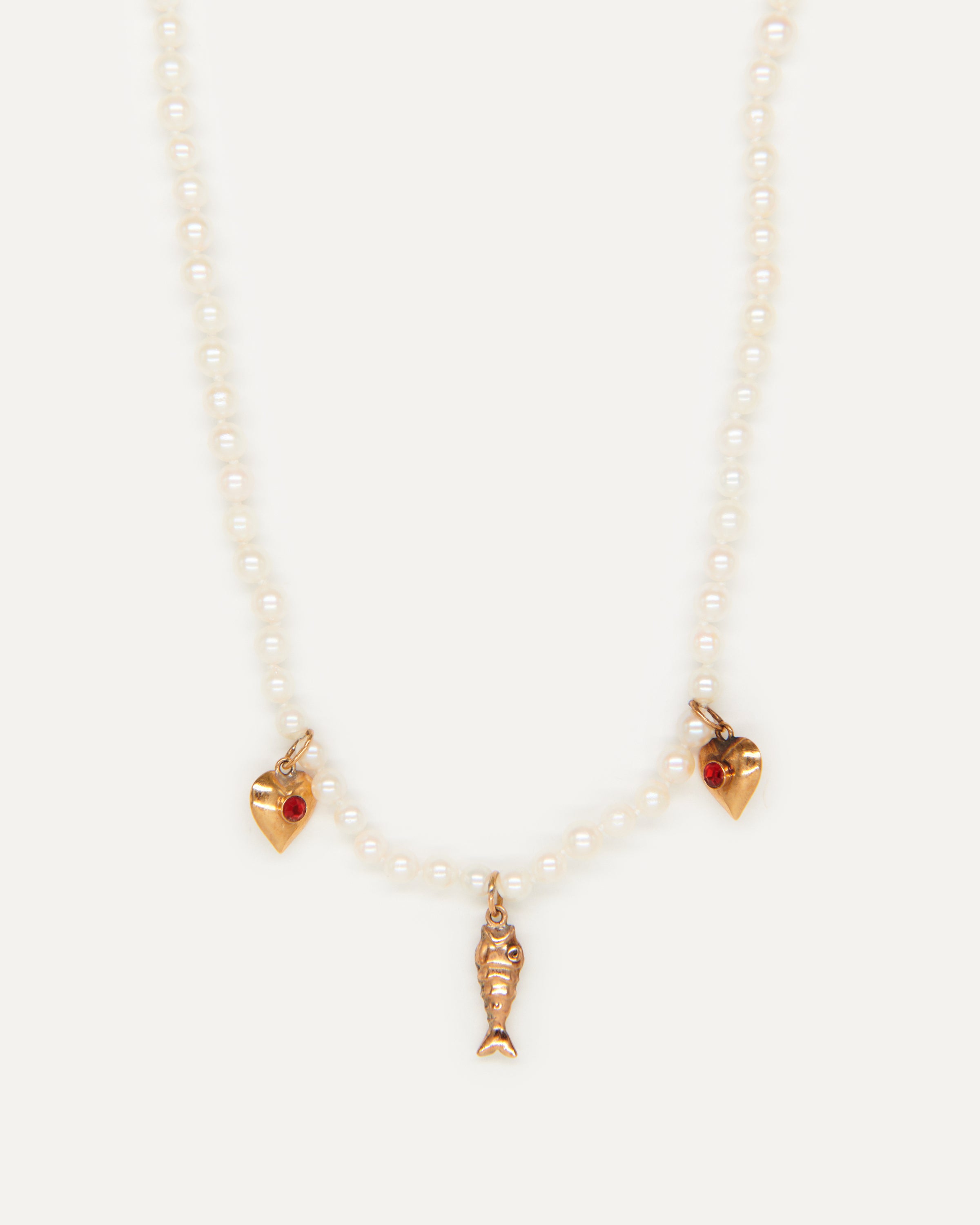 Este colgante es una versión del pez que Pepín, padre de Elisa, le regaló a si hija cuando apenas tenía cinco años como amuleto. Actualmente, Elisa ha transformado esta pieza y le ha dado el nombre de Posidonio, inspirado en el filósofo griego que estudiaba los mares y en honor a los campos de 'posidònia' que hacen que los mares de Ibiza y Formentera sean así de cristalinos. En este caso, la diseñadora ha colgado el pez de una cadena de perlas y le ha añadido dos colgantes.