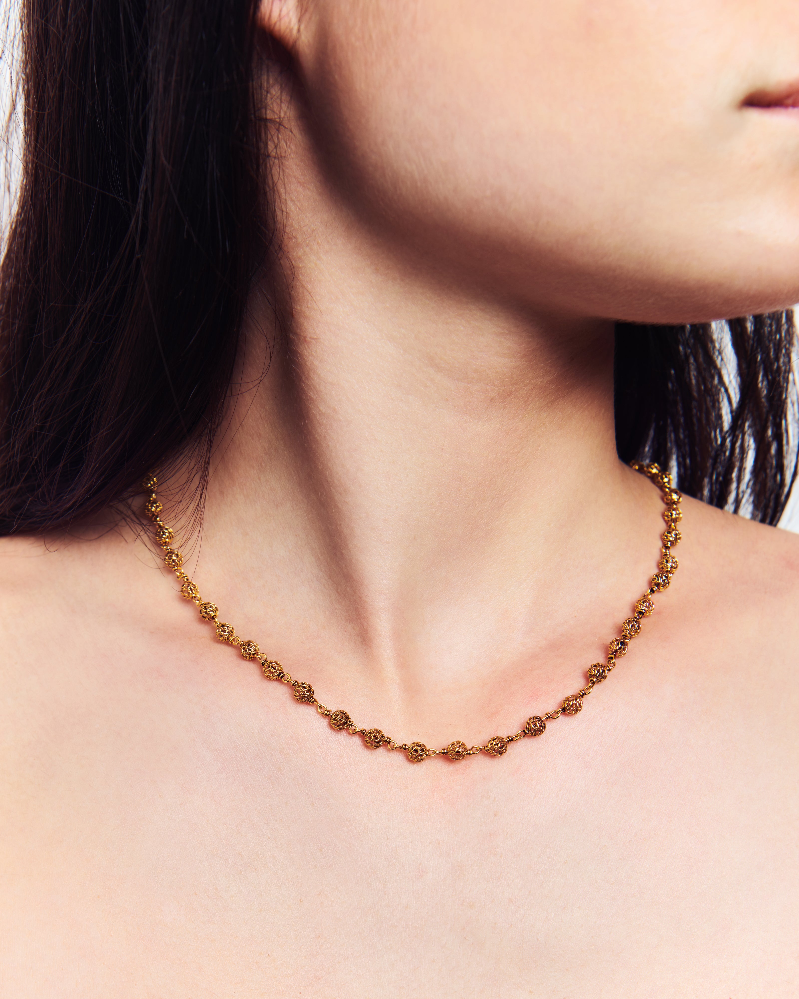 Collar inspirado en el tradicional botón de 'Jupetí'. El 'Jupetí' es el chaleco que usan los hombres para el baile tradicional ibicenco, el 'ball pagès', y que luce 24 botones de plata que van pasando de generación en generación. Con el paso de los años, este botón ha pasado de llevarse solamente en el chaleco a transformarse en todo tipo de pieza: pendientes, collares, pulseras...