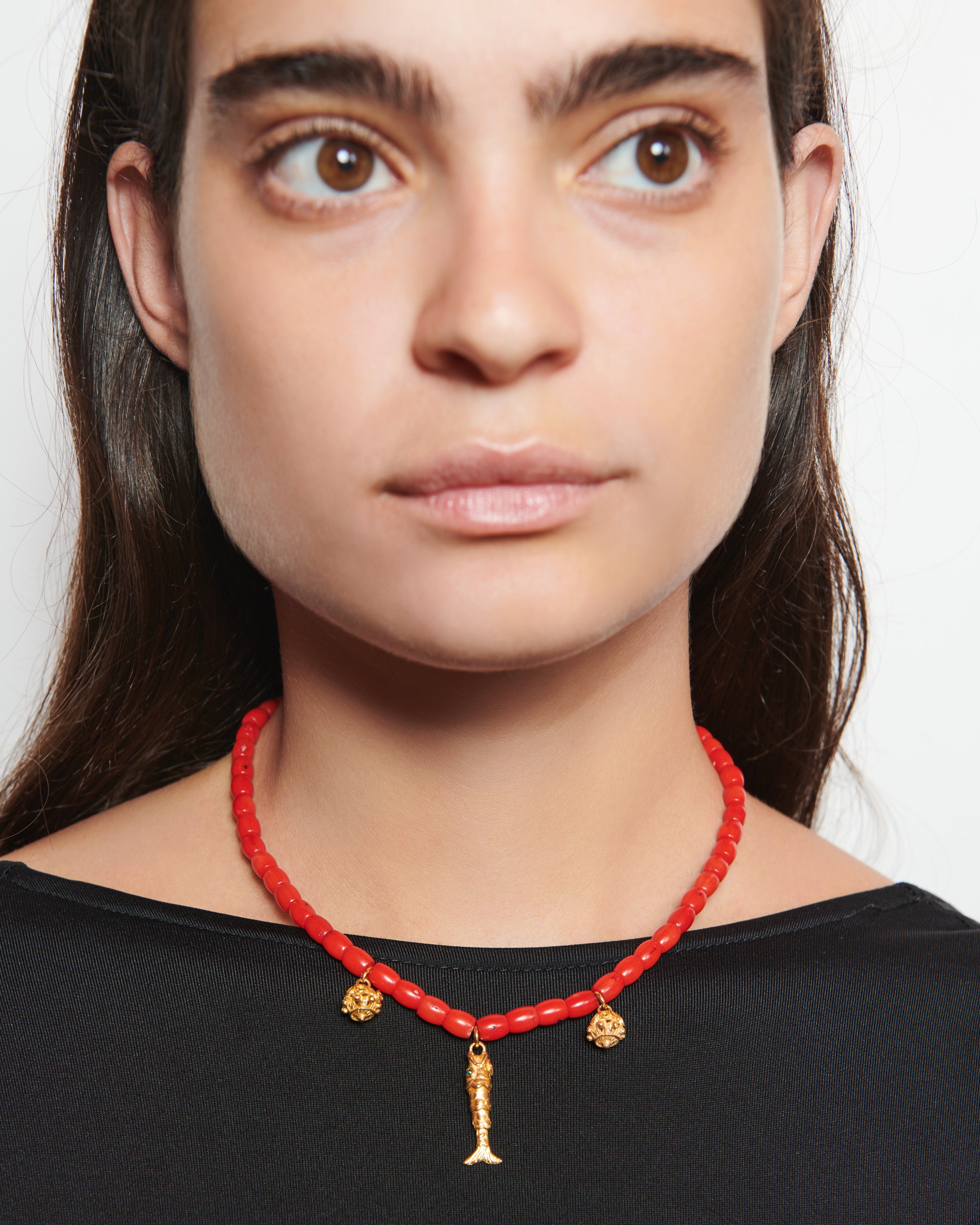 Este colgante es una versión del pez que Pepín, padre de Elisa, le regaló a su hija cuando apenas tenía cinco años como amuleto. Actualmente, Elisa ha transformado esta pieza y le ha dado el nombre de Posidonio, inspirado en el filósofo griego que estudiaba los mares y en honor a los campos de 'posidònia' que hacen que los mares de Ibiza y Formentera sean así de cristalinos. En este diseño, la ibicenca quiere hacerle un guiño a la tradición colgando el pez de una cadena de coral y acompañándolo de dos colgantes de Botón Jupetí.
