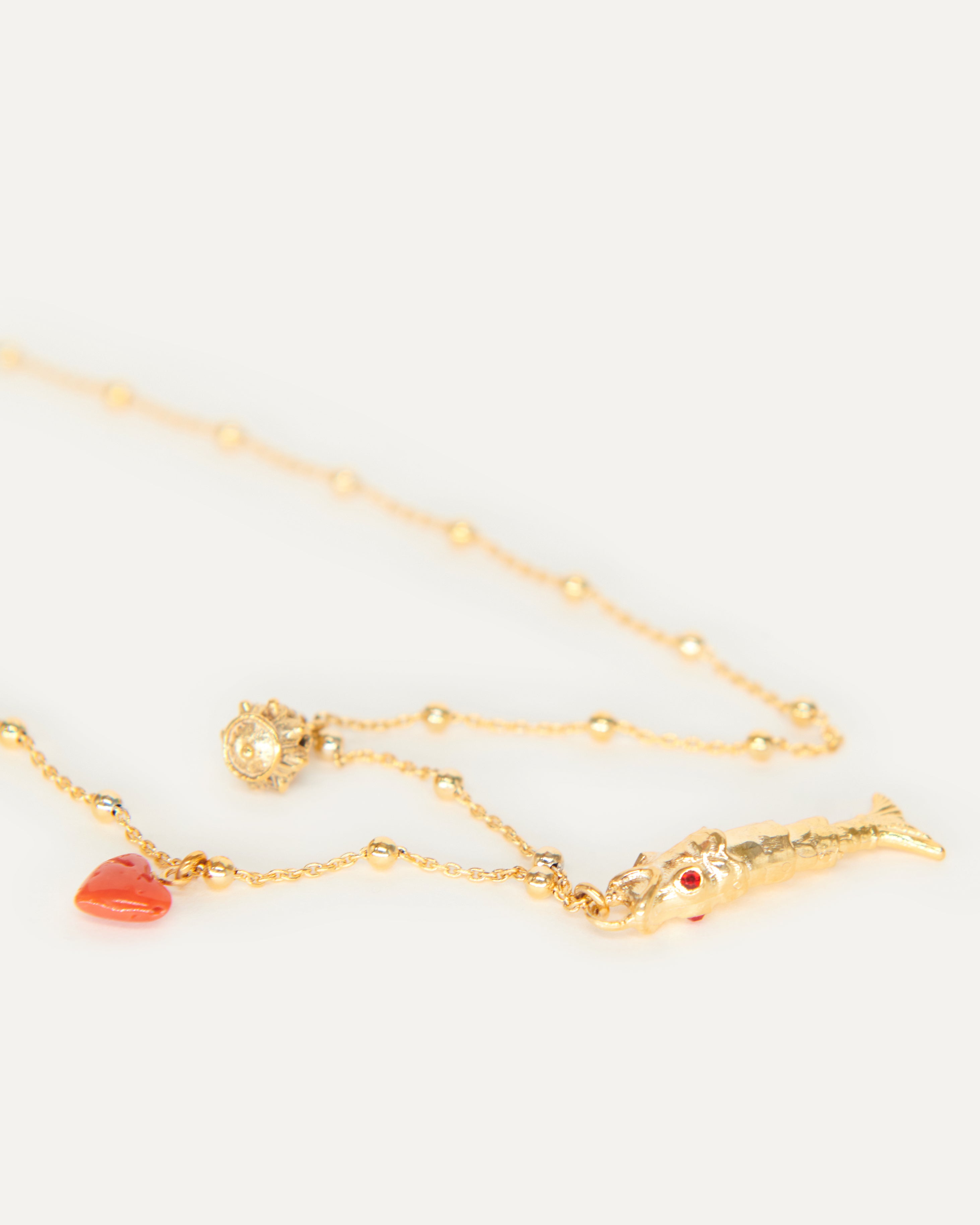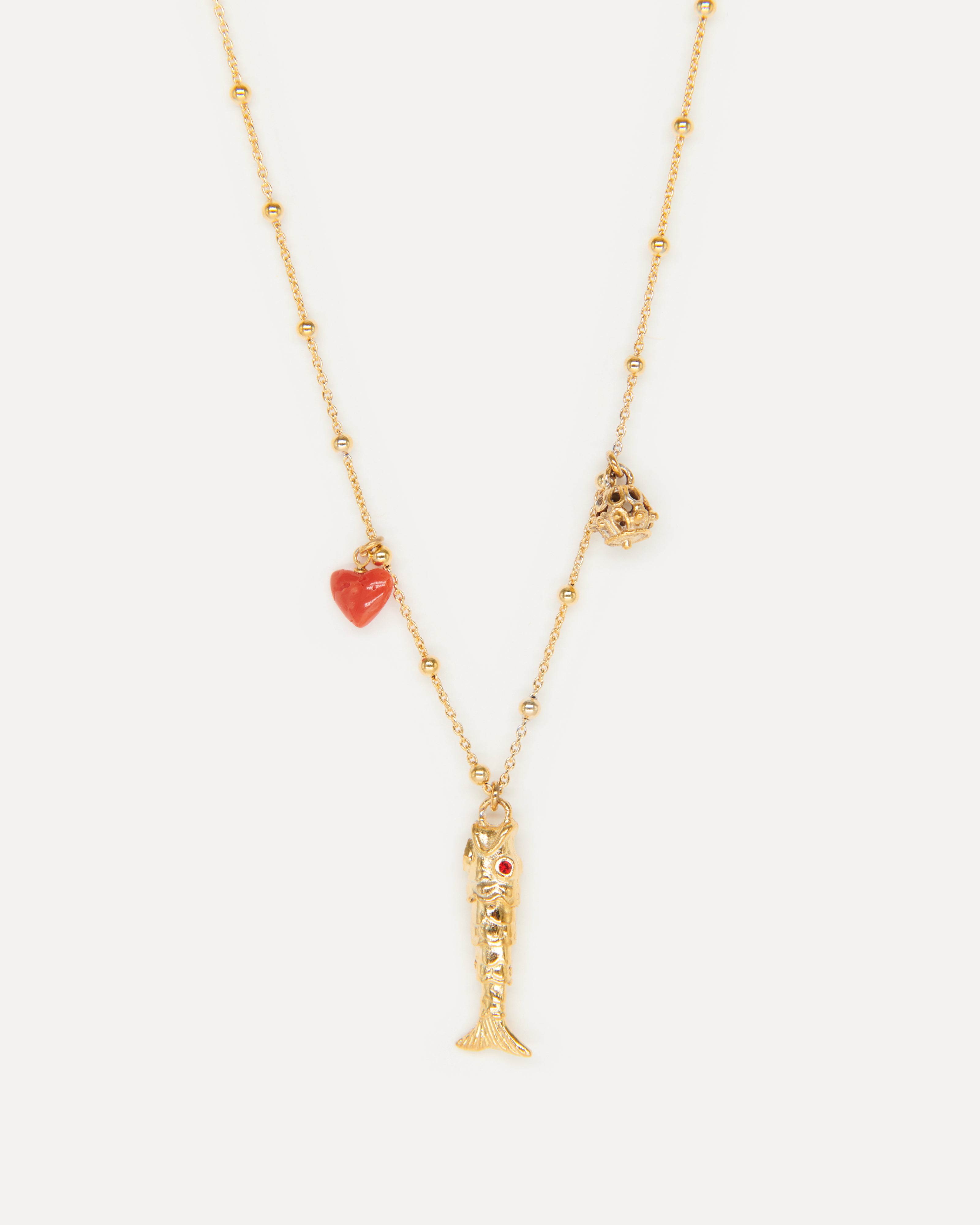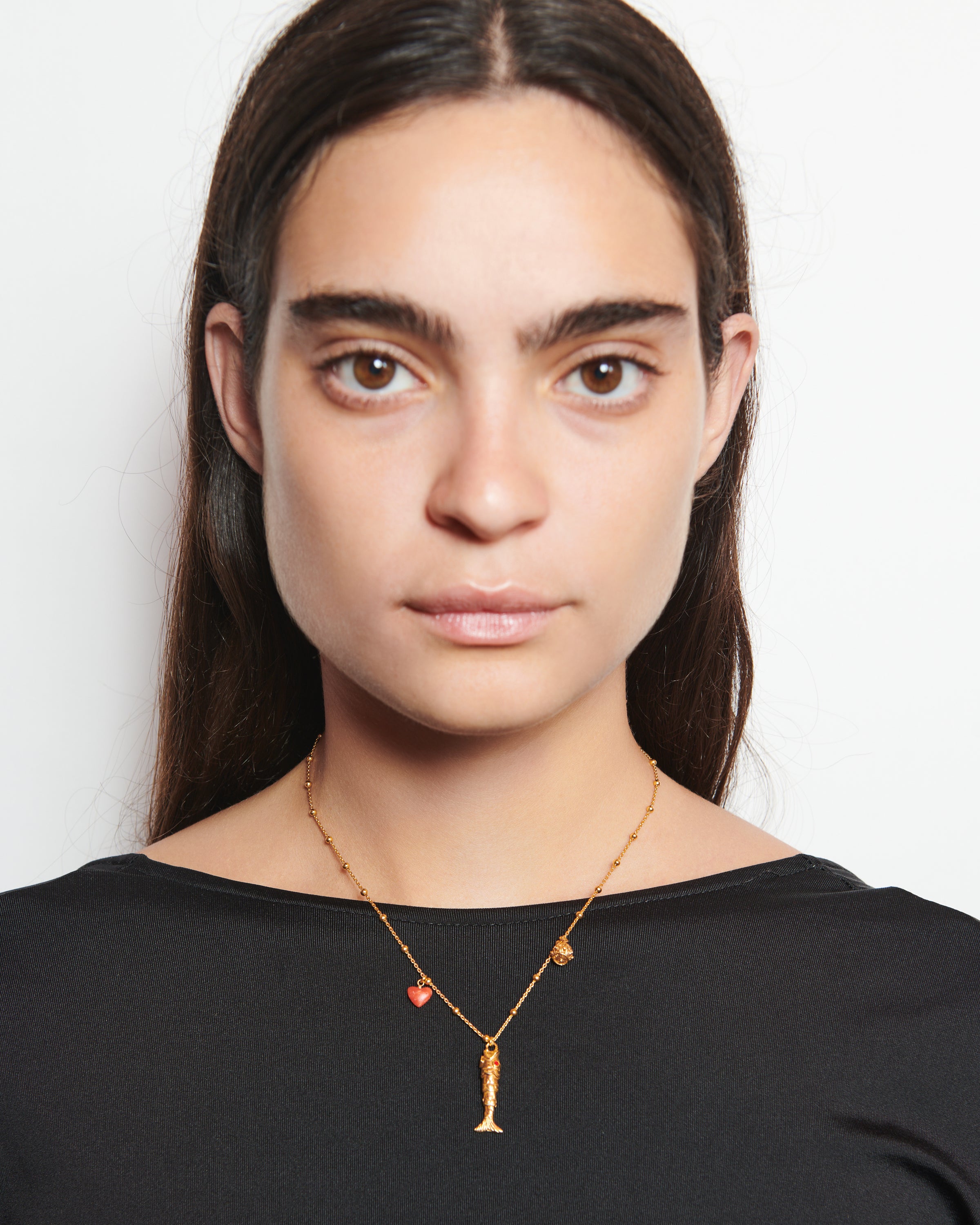Este colgante es una versión del pez que Pepín, padre de Elisa, le regaló a su hija cuando apenas tenía cinco años como amuleto. Actualmente, Elisa ha transformado esta pieza y le ha dado el nombre de Posidonio, inspirado en el filósofo griego que estudiaba los mares y en honor a los campos de 'posidònia' que hacen que los mares de Ibiza y Formentera sean así de cristalinos. En este diseño, la ibicenca quiere hacerle un guiño a la tradición acompañando al pez con un Botón Llis y un corazón.