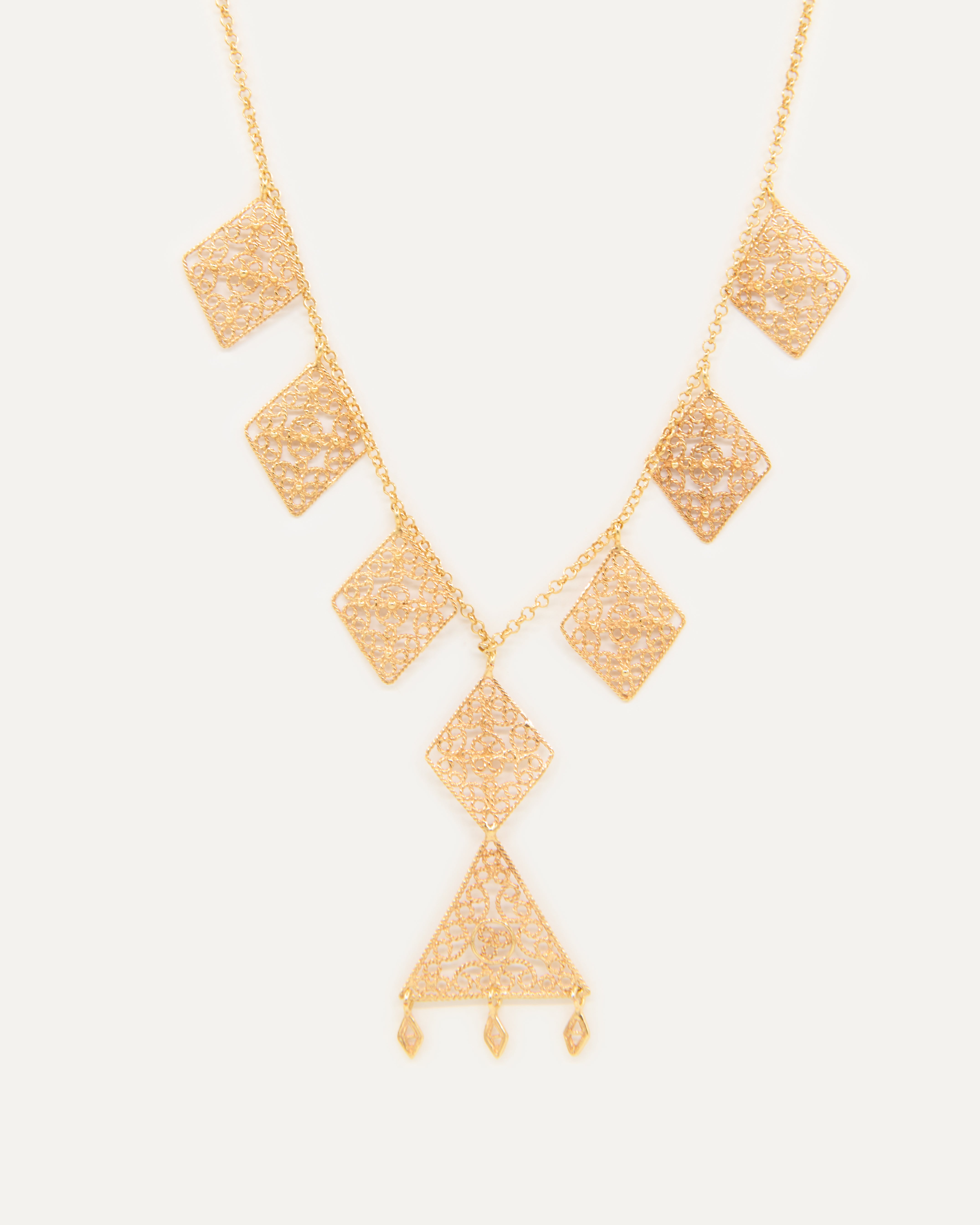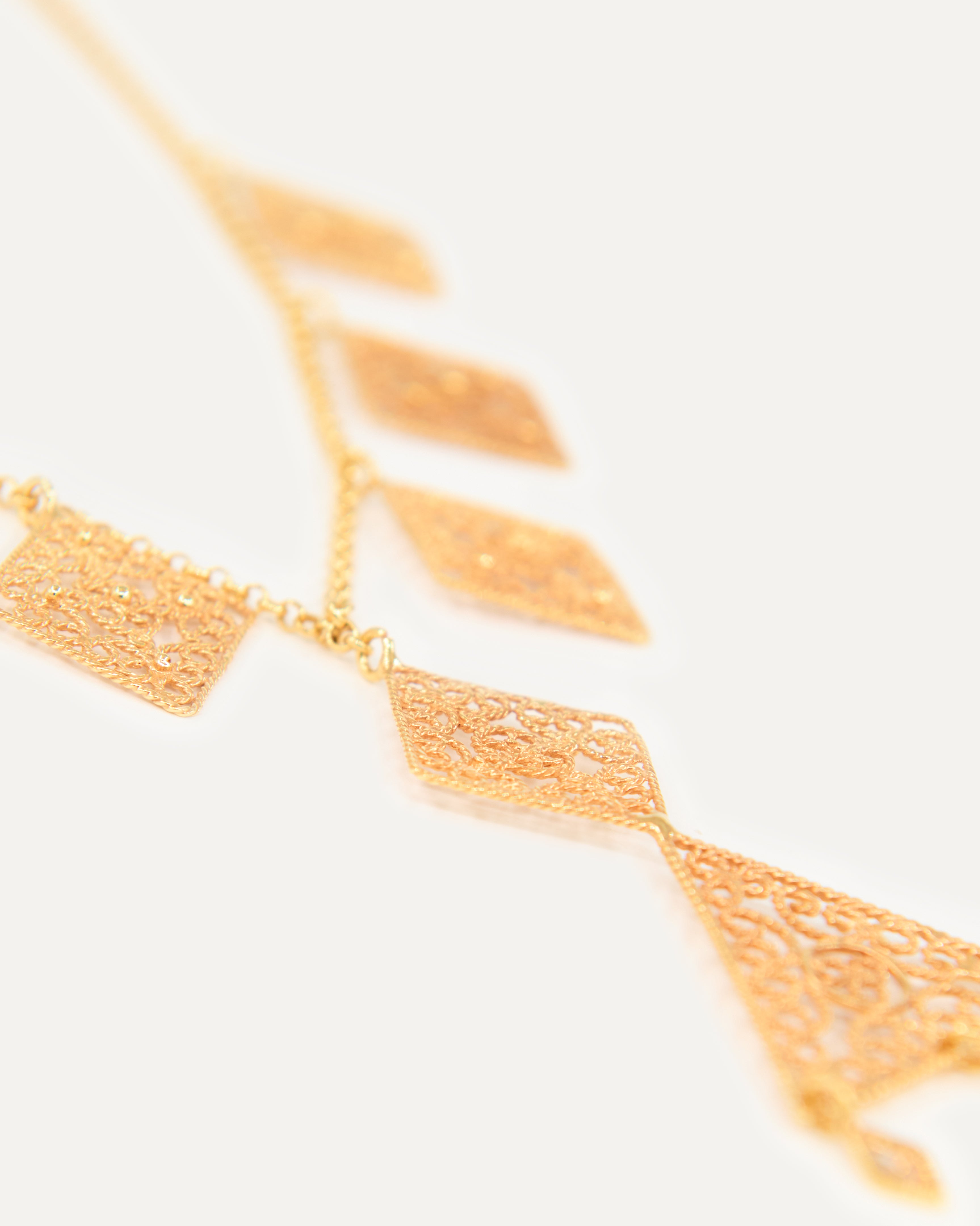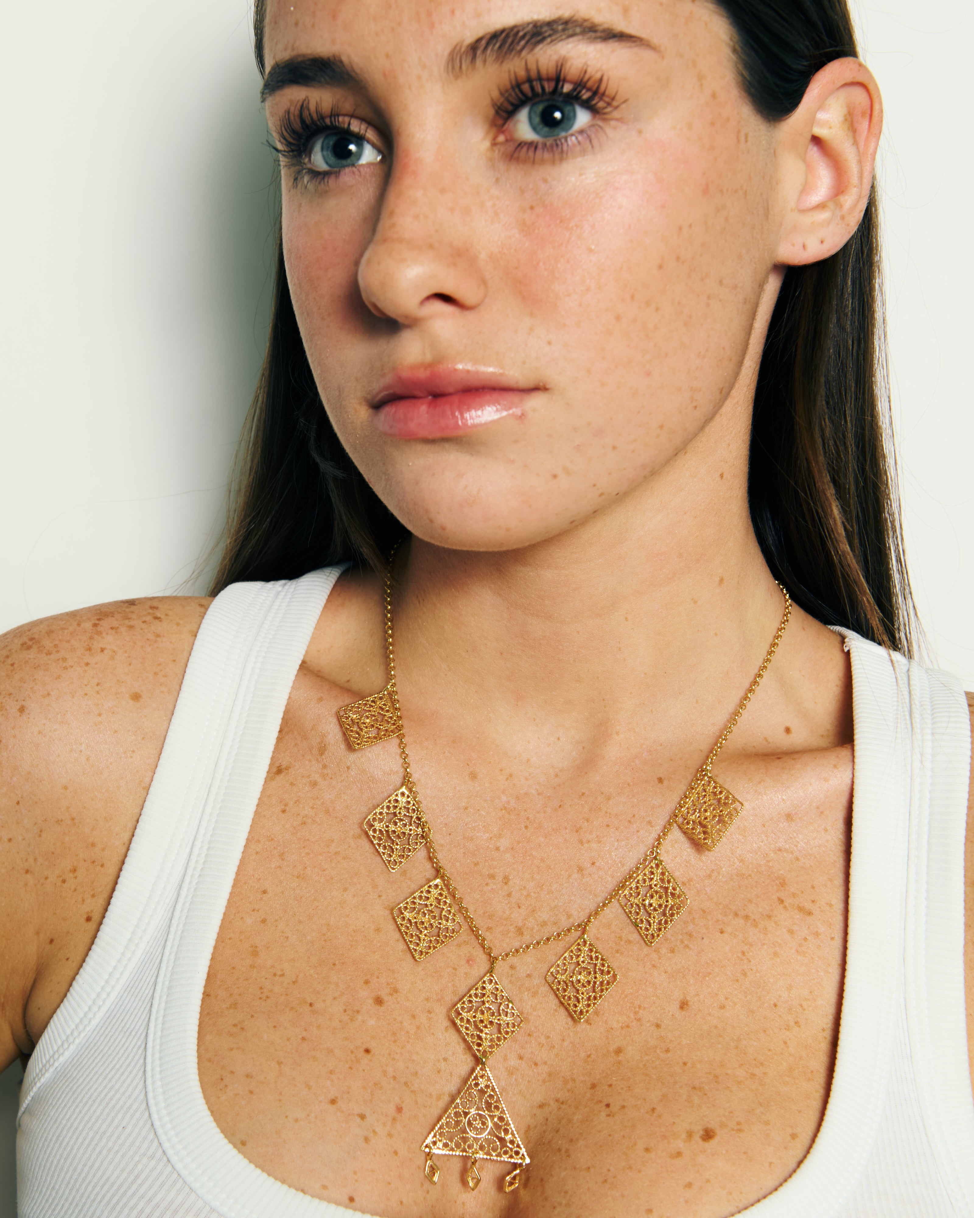 Este collar recupera la esencia rural de Ibiza y la traducen a un lenguaje contemporáneo y barroco. Elisa Pomar reinterpreta la filigrana tradicional de la joyería ibicenca y la transforma en una versión plana y depurada, manteniendo su alma ancestral. Joyas que no adornan: revelan.