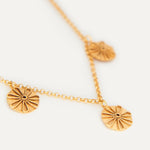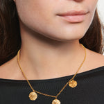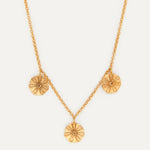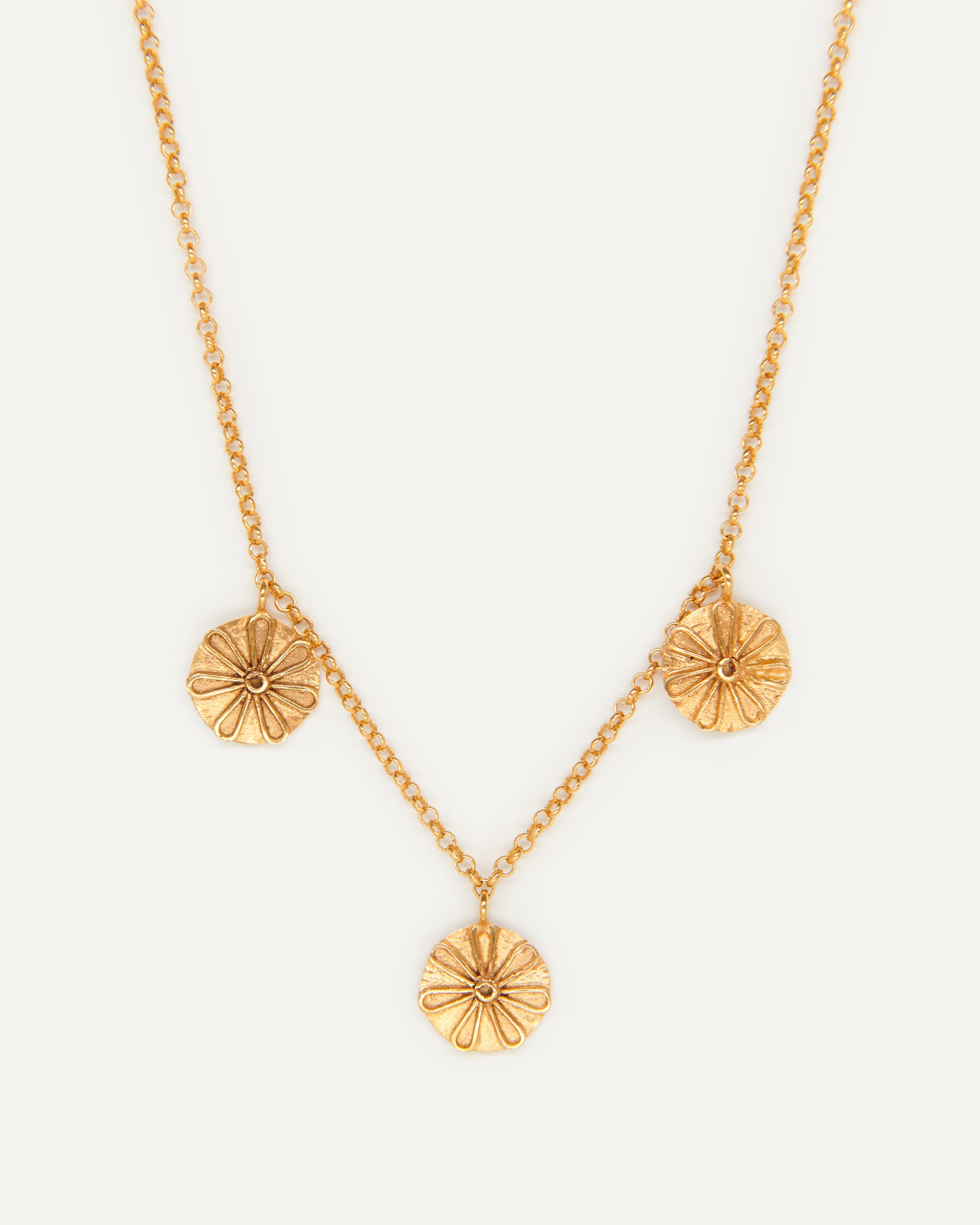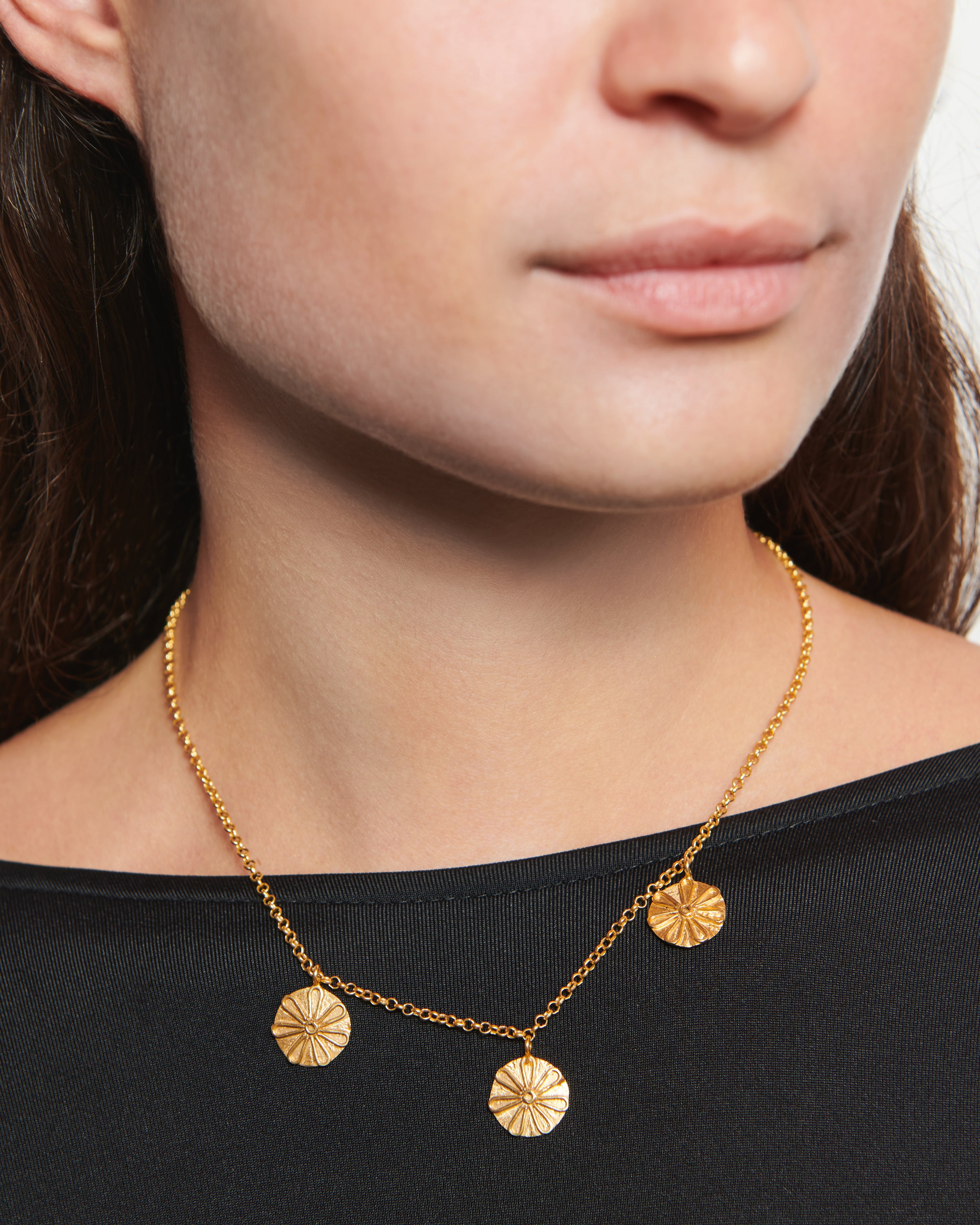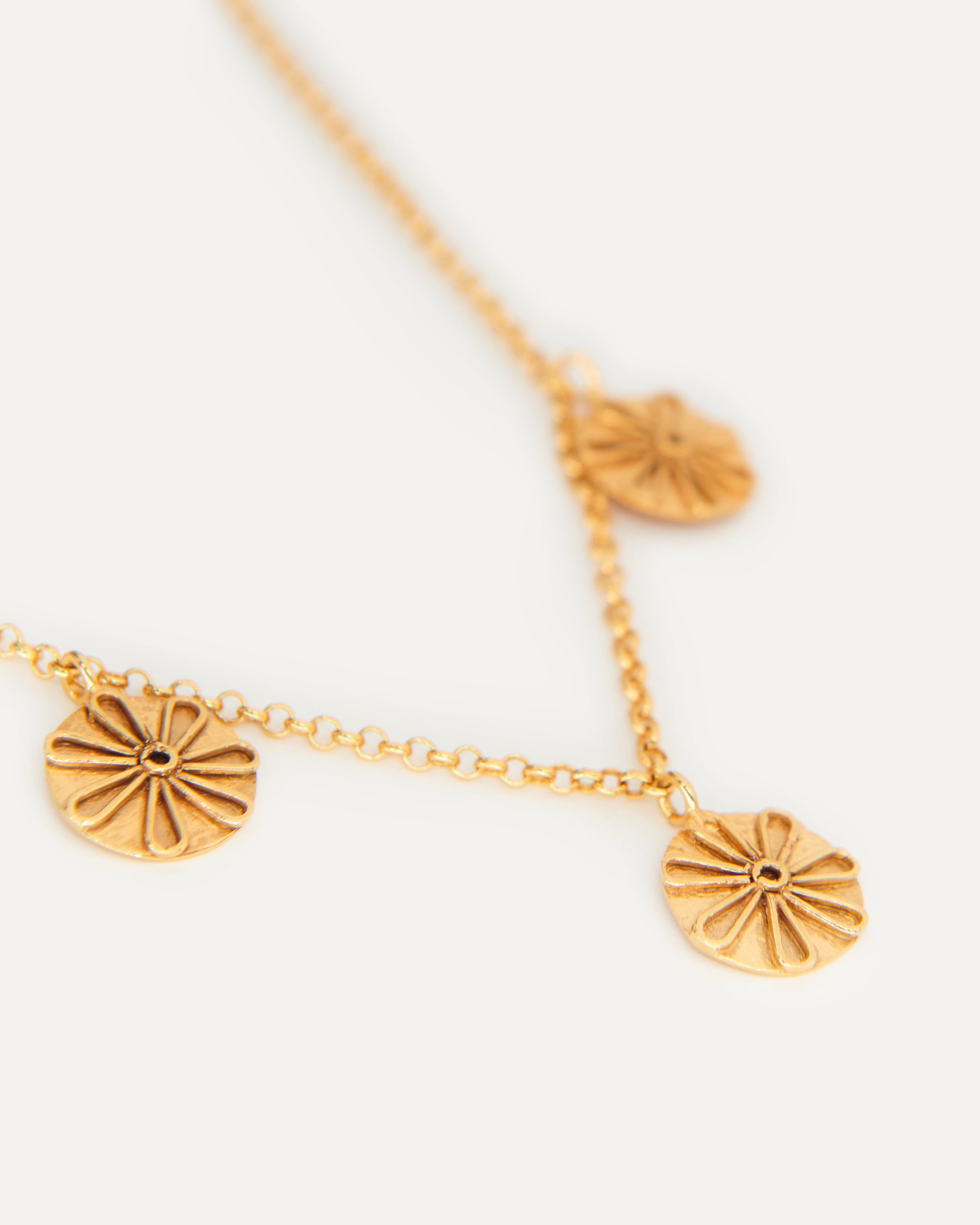 Este collar pertenece a la edición fenicia, un conjunto de joyas que Elisa crea en honor a la civilización que convirtió Ibiza en un enclave estratégico mundial. Su afán por evolucionar la joyería, el uso de cristales de colores o la fascinación por el oro son rasgos propiamente fenicios que forman parte del ADN de la marca ibicenca. Por esa razón, la diseñadora ha optado por elementos como estas tres flores para homenajear a este pueblo tan influyente en Ibiza.