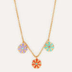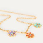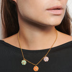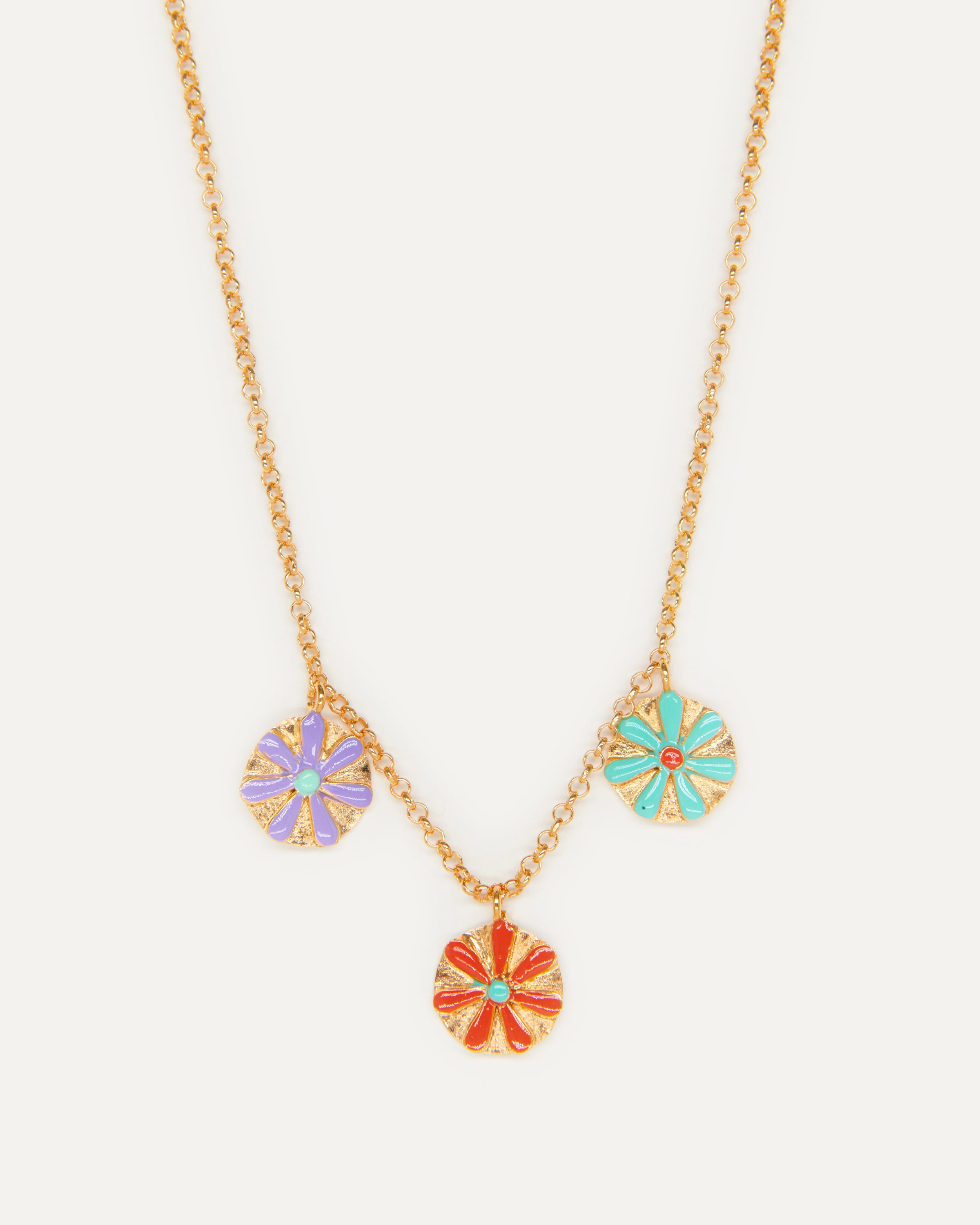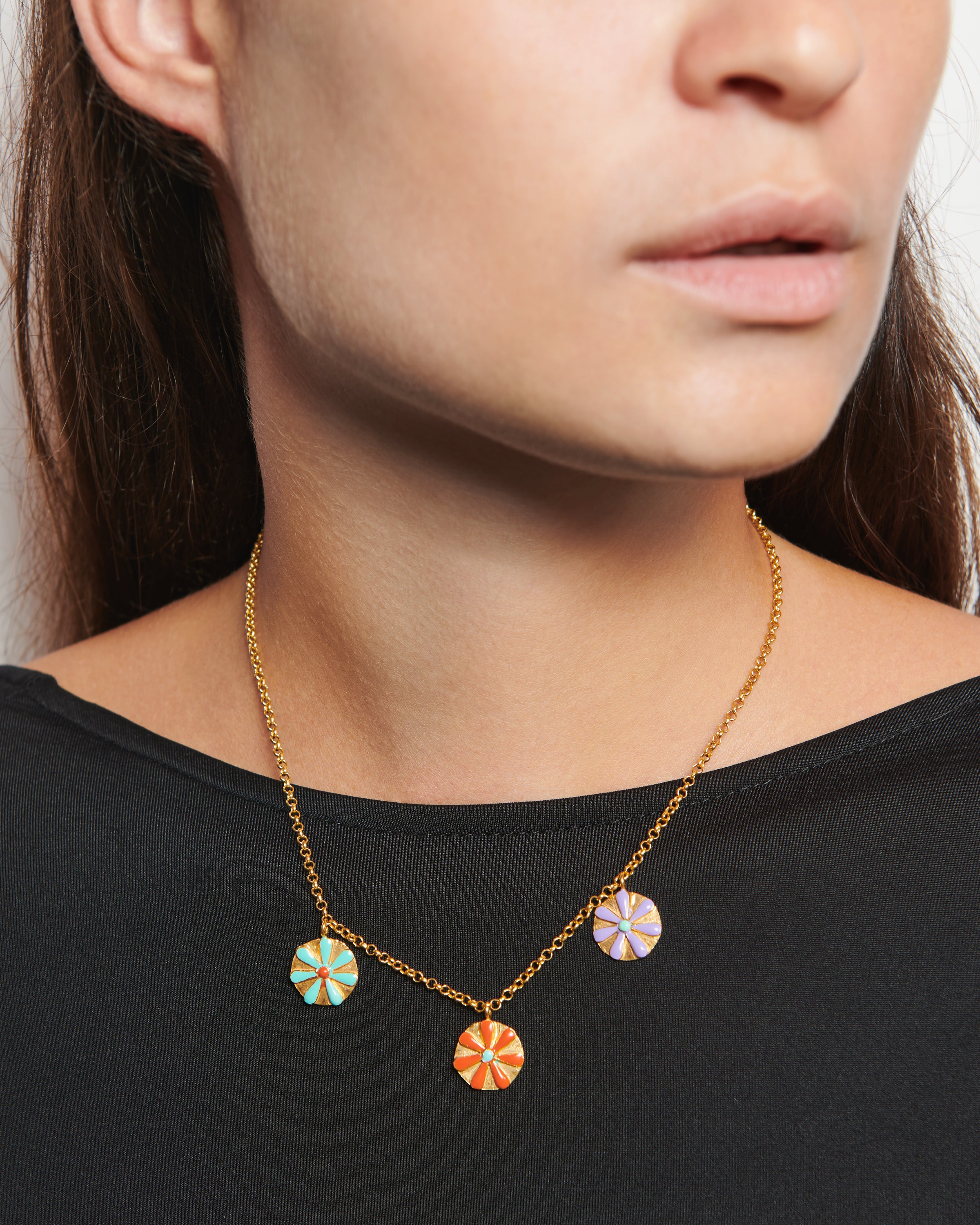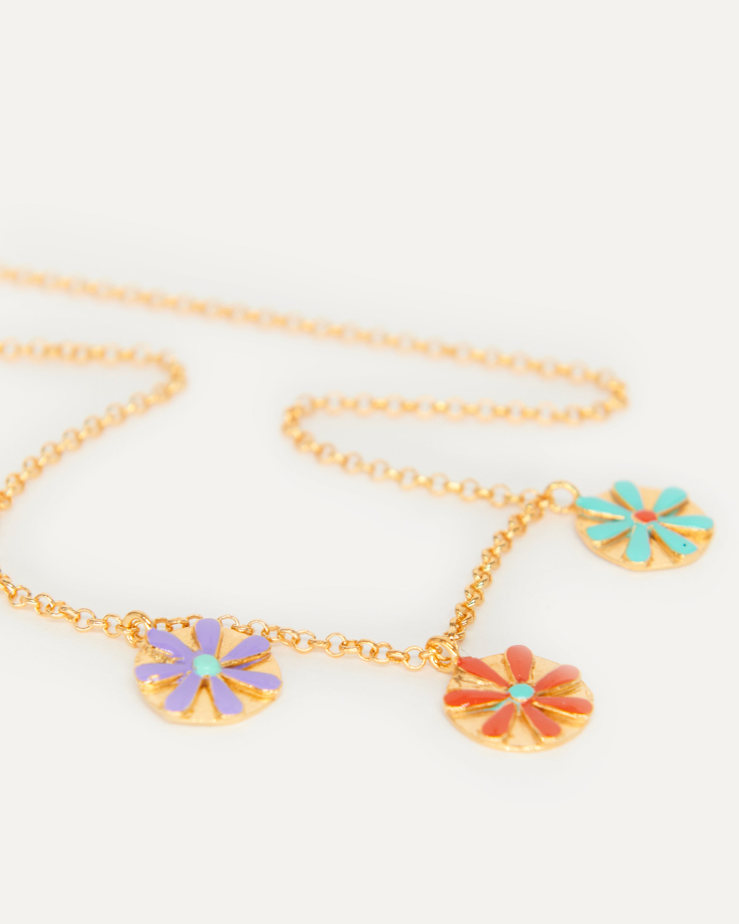 Este collar pertenece a la edición fenicia, un conjunto de joyas que Elisa crea en honor a la civilización que convirtió Ibiza en un enclave estratégico mundial. Su afán por evolucionar la joyería, el uso de cristales de colores o la fascinación por el oro son rasgos propiamente fenicios que forman parte del ADN de la marca ibicenca. Por esa razón, la diseñadora ha optado por elementos como estas tres flores esmaltadas de color para homenajear a este pueblo tan influyente en Ibiza.