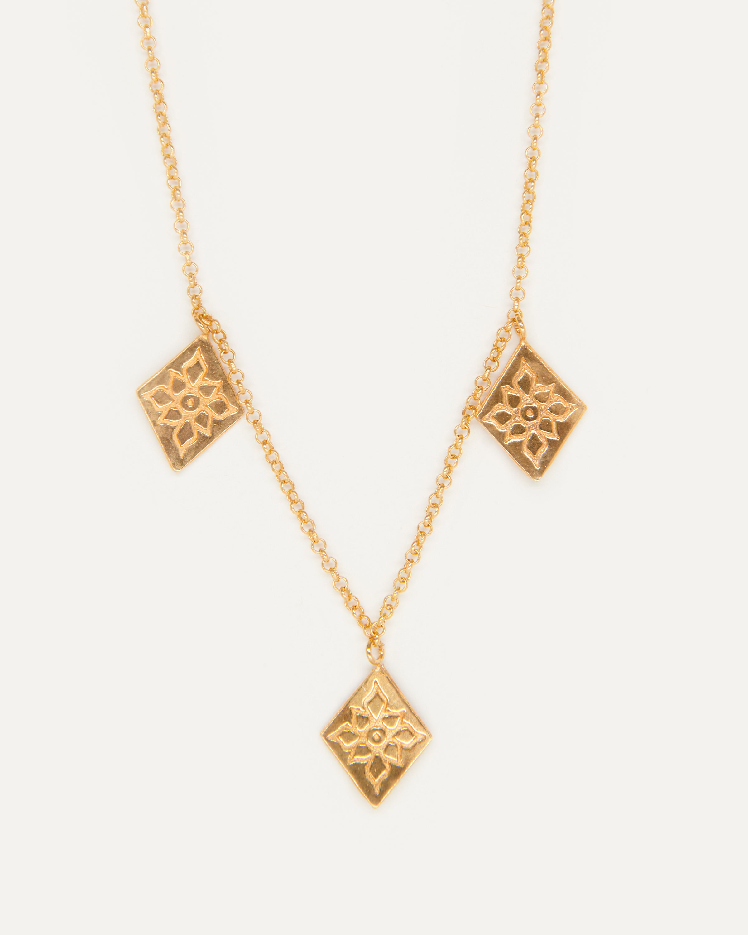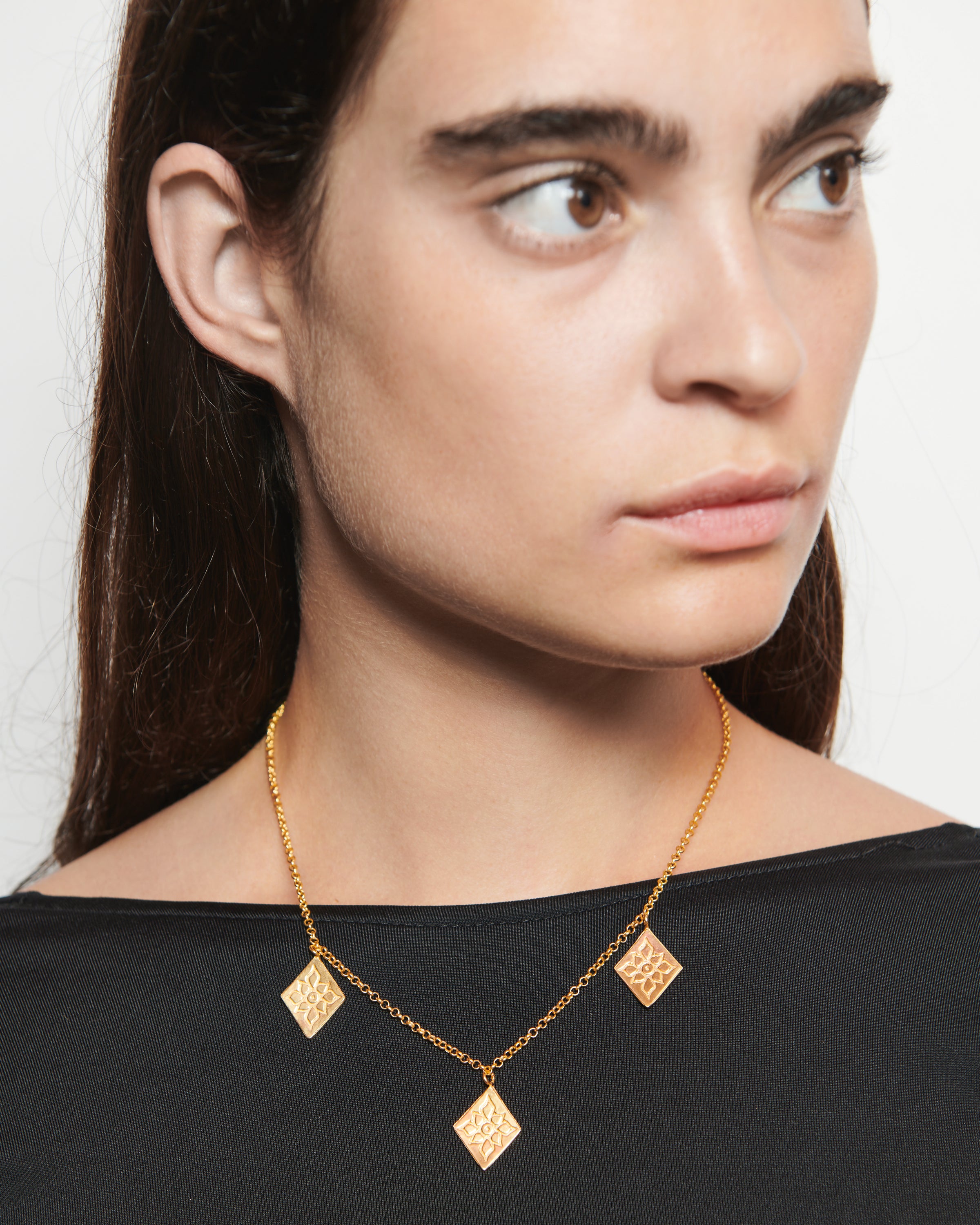 Este collar pertenece a la edición fenicia, un conjunto de joyas que Elisa crea en honor a la civilización que convirtió Ibiza en un enclave estratégico mundial. Su afán por evolucionar la joyería, el uso de cristales de colores o la fascinación por el oro son rasgos propiamente fenicios que forman parte del ADN de la marca ibicenca. Por esa razón, la diseñadora ha optado por elementos como estos tres rombos grabados para homenajear a este pueblo tan influyente en Ibiza.