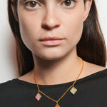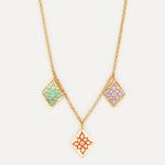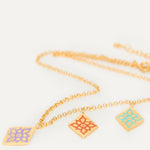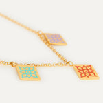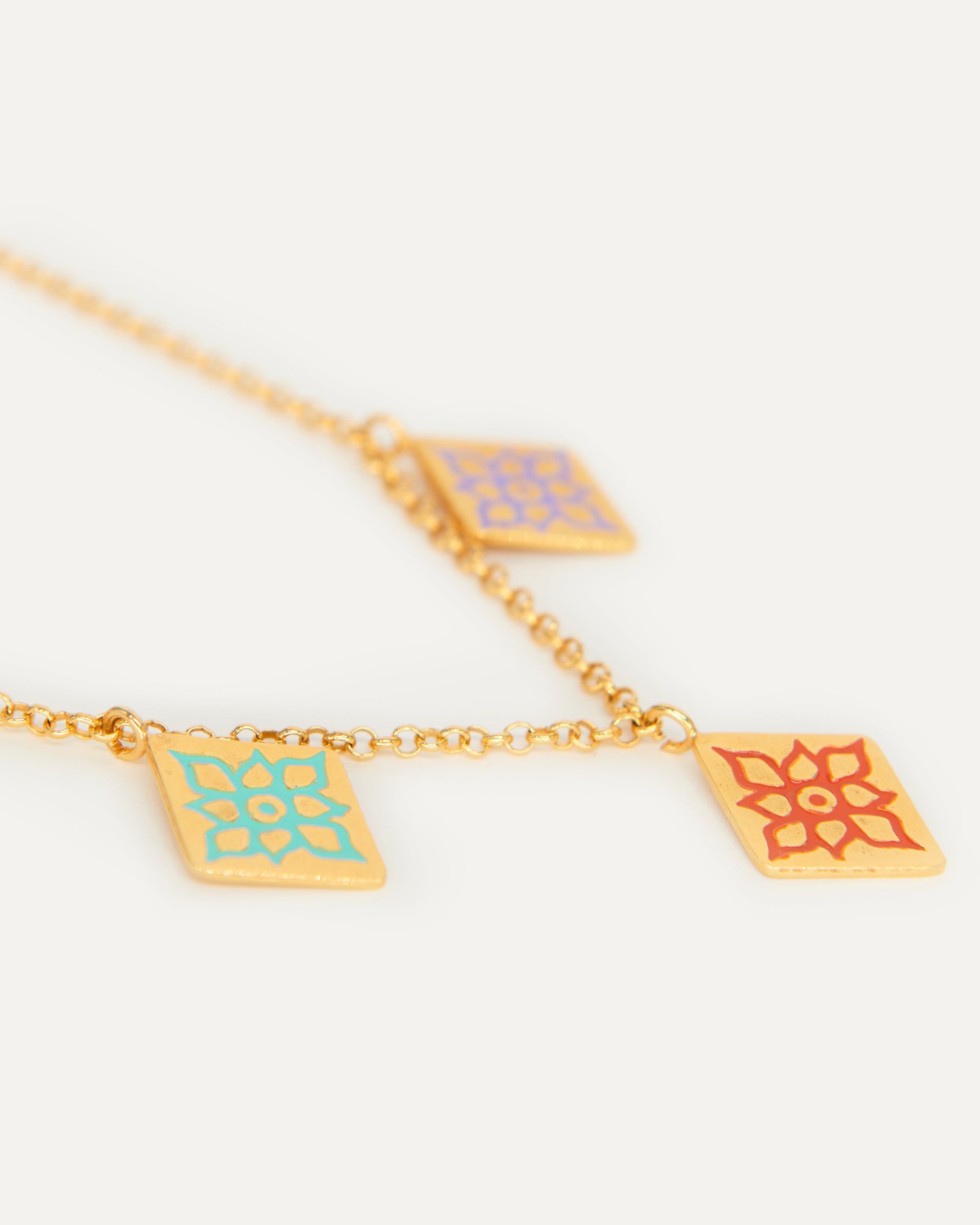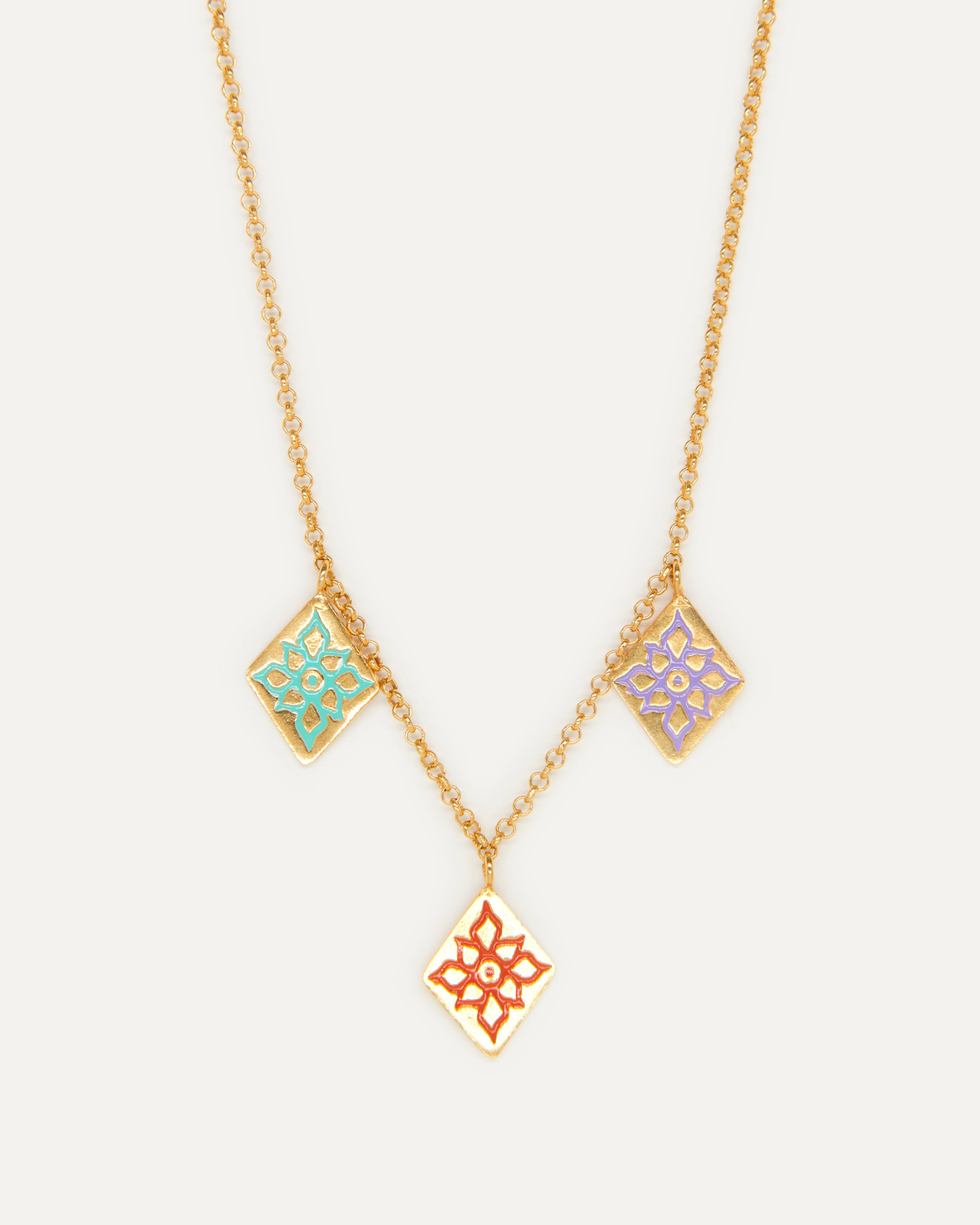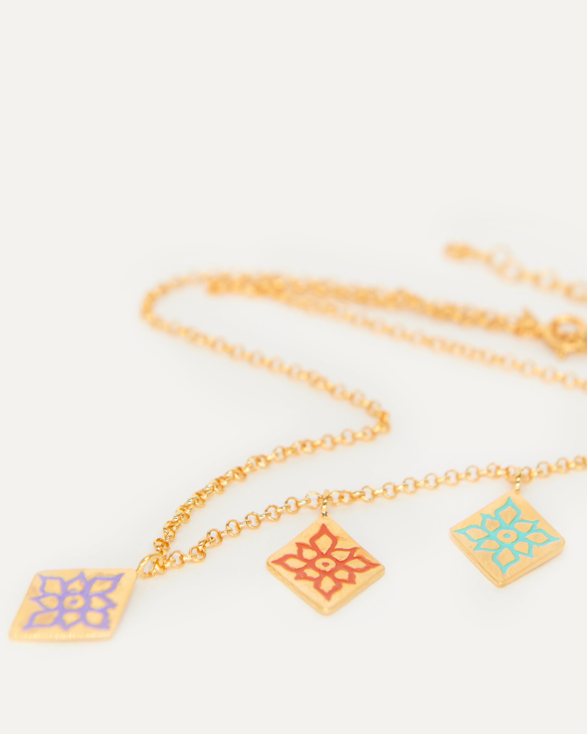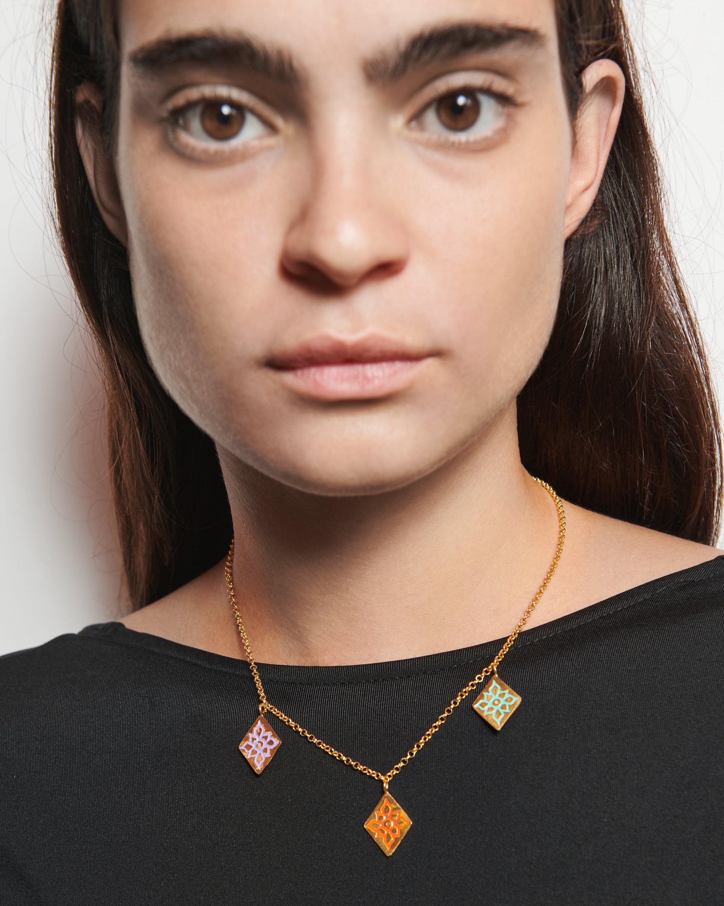 Este collar pertenece a la edición fenicia, un conjunto de joyas que Elisa crea en honor a la civilización que convirtió Ibiza en un enclave estratégico mundial. Su afán por evolucionar la joyería, el uso de cristales de colores o la fascinación por el oro son rasgos propiamente fenicios que forman parte del ADN de la marca ibicenca. Por esa razón, la diseñadora ha optado por elementos como estos tres rombos grabados y con esmalte de diferente color para homenajear a este pueblo tan influyente en Ibiza.