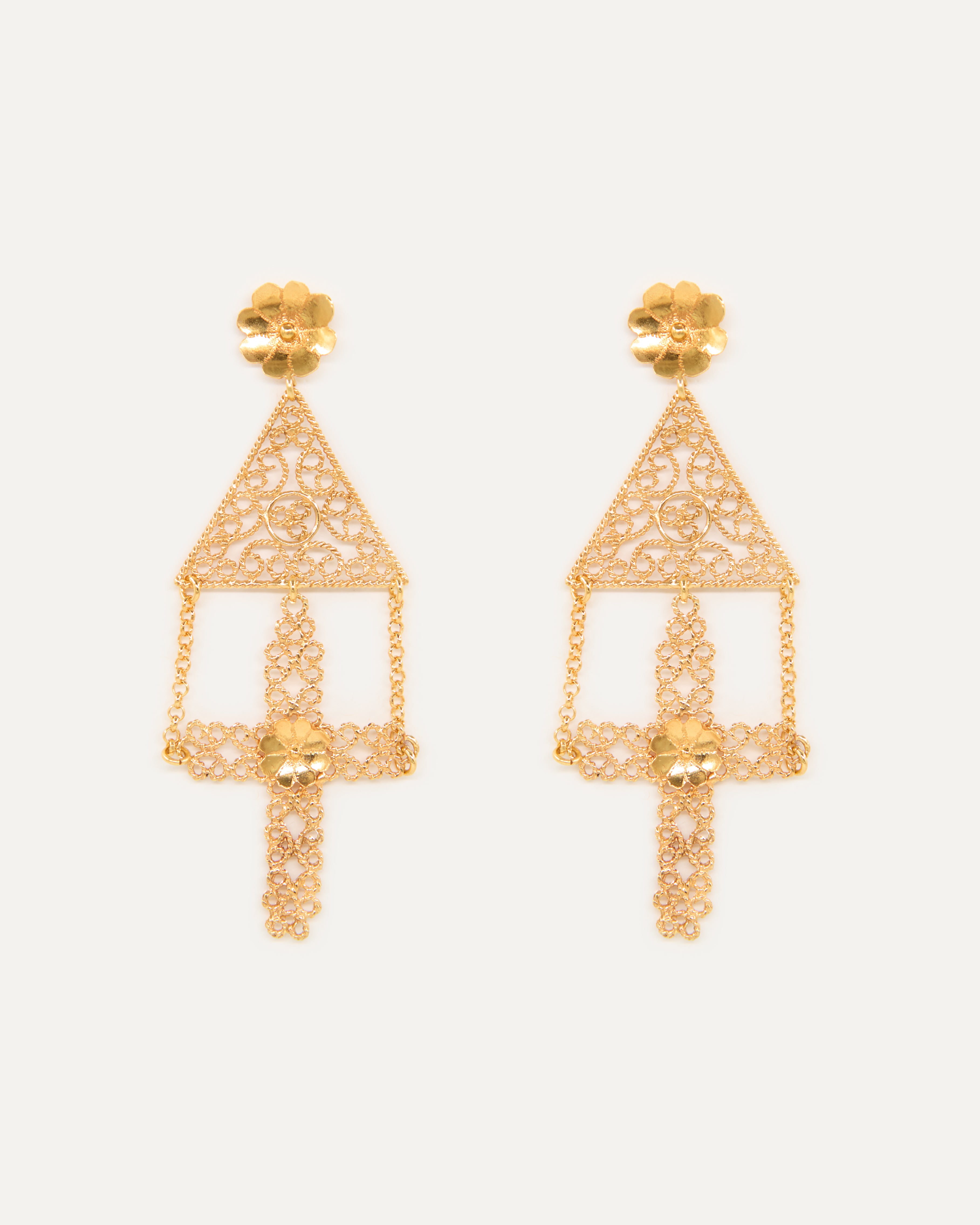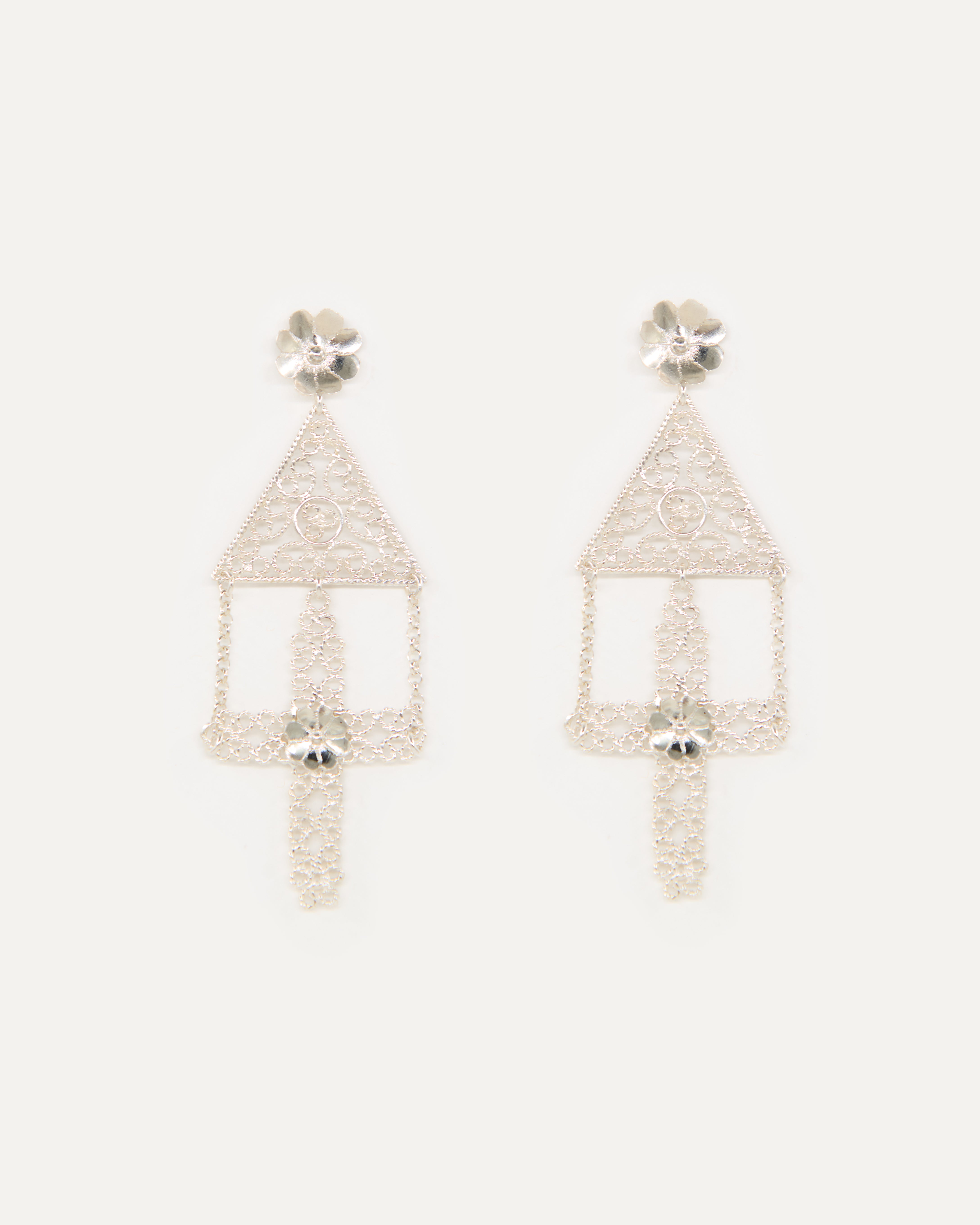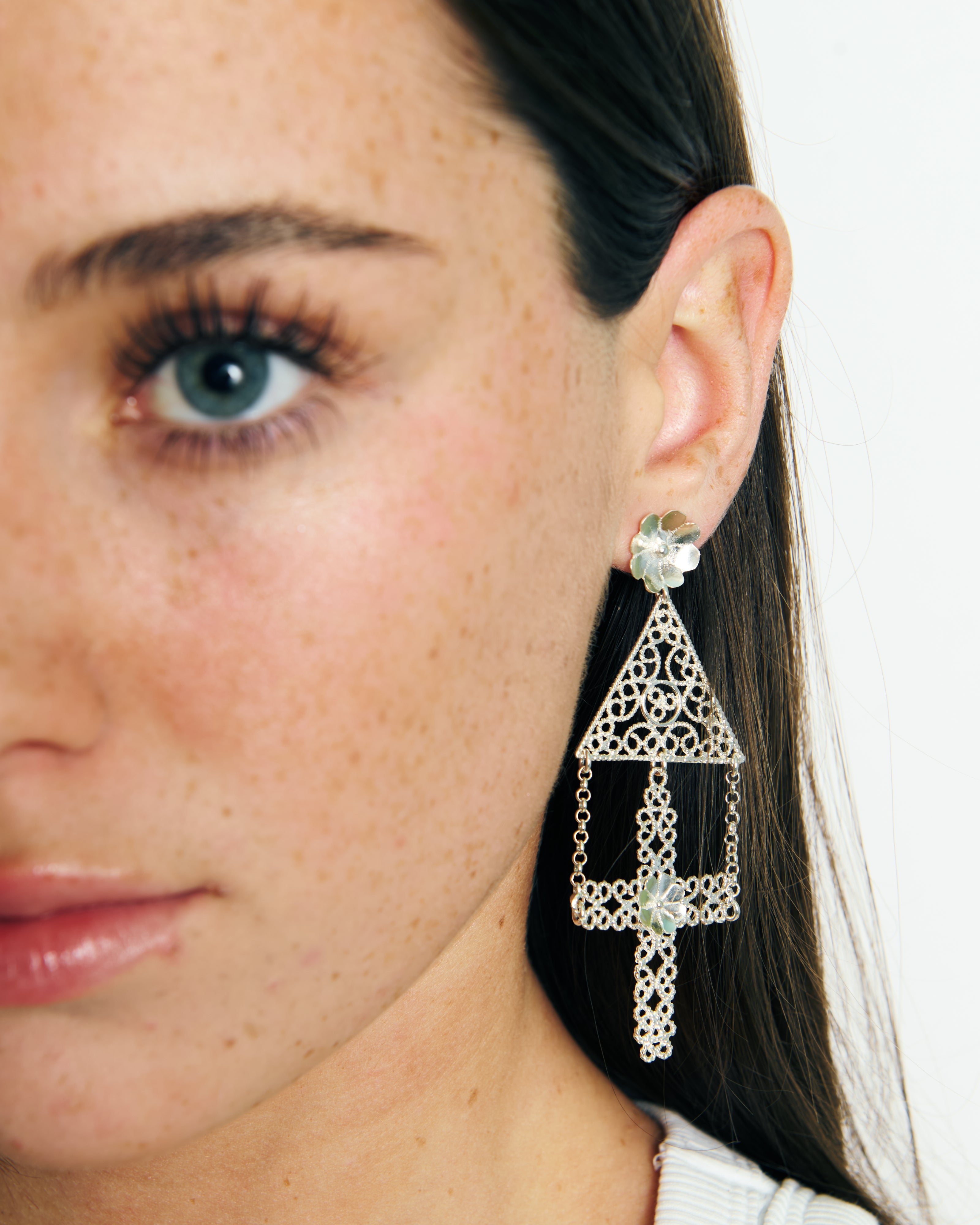 Estos pendientes recuperan la esencia rural de Ibiza y los traducen a un lenguaje contemporáneo. Elisa Pomar reinterpreta los elementos tradicionales como el ave maría, la cruz y filigrana tradicional de la joyería ibicenca y los transforma en una versión plana y depurada, manteniendo su alma ancestral. Joyas que no adornan: revelan.