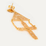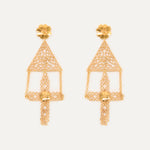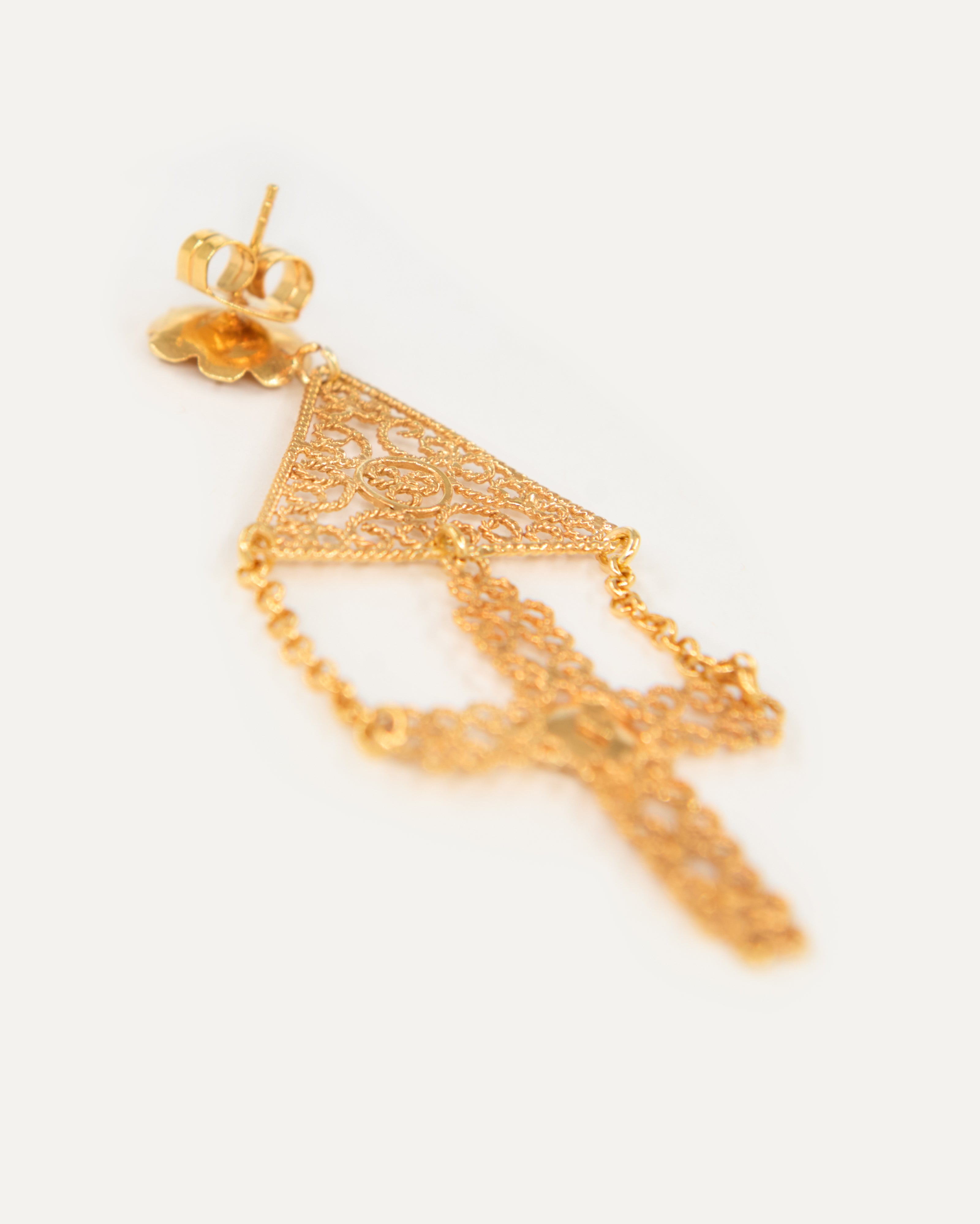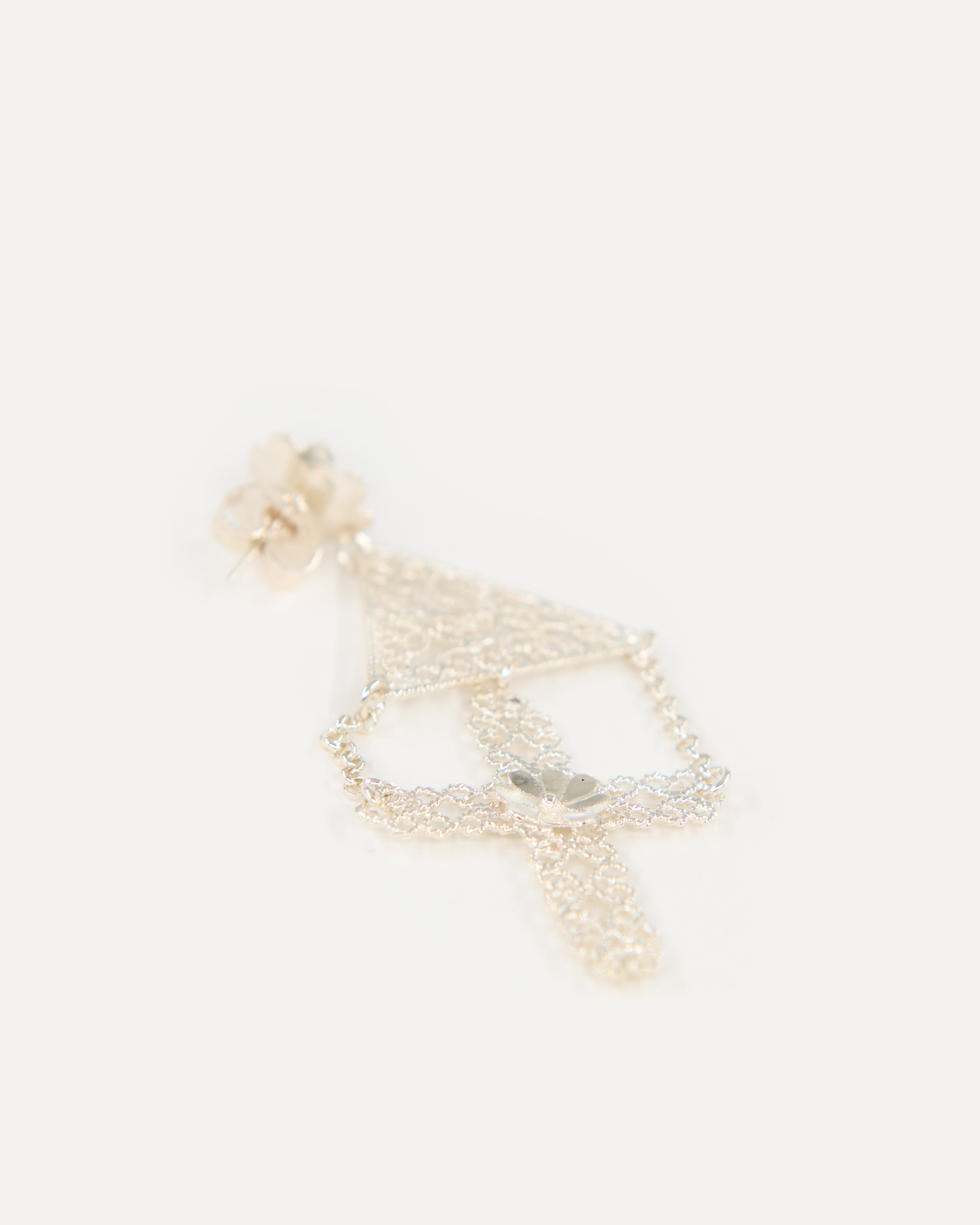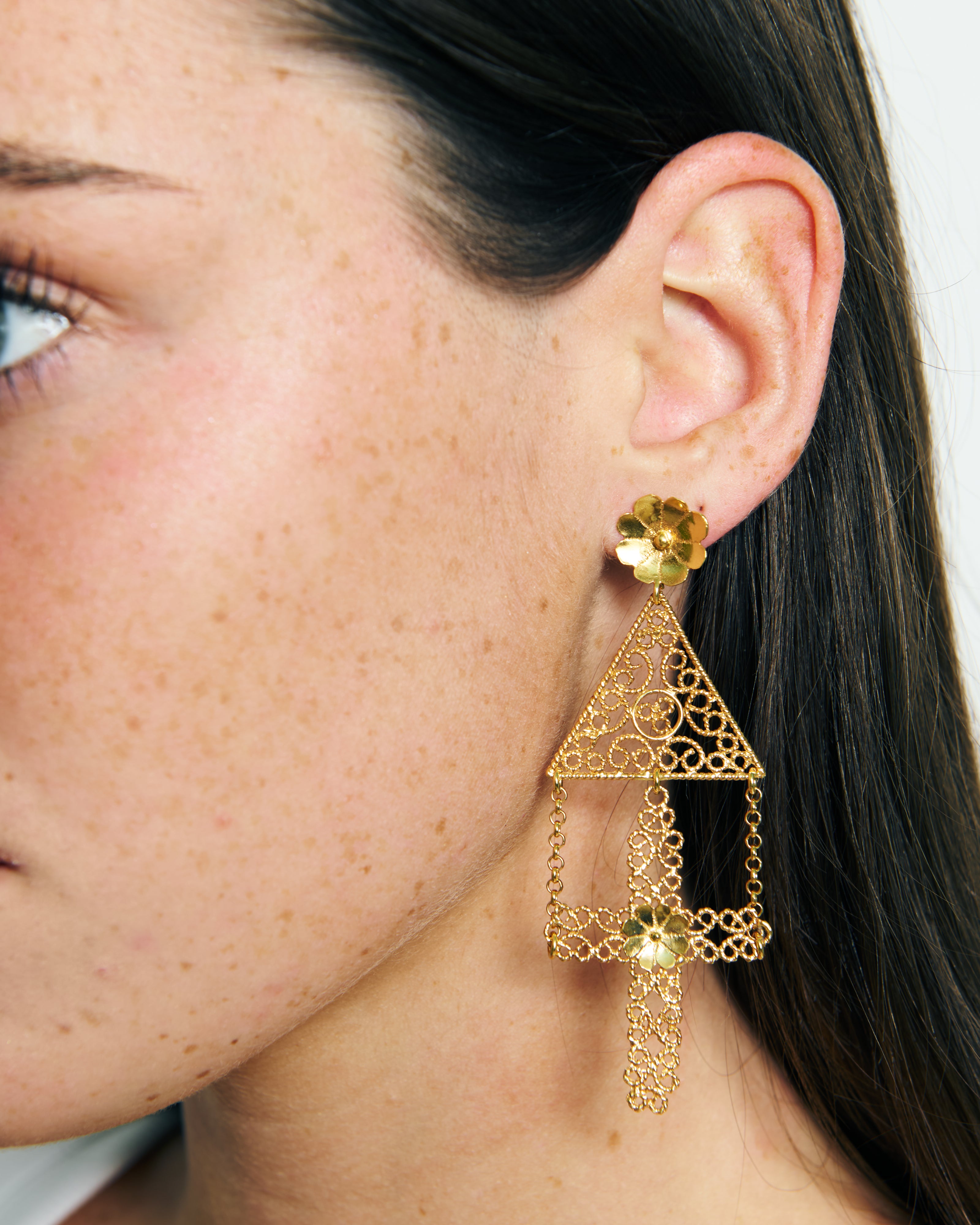 Estos pendientes recuperan la esencia rural de Ibiza y los traducen a un lenguaje contemporáneo. Elisa Pomar reinterpreta los elementos tradicionales como el ave maría, la cruz y filigrana tradicional de la joyería ibicenca y los transforma en una versión plana y depurada, manteniendo su alma ancestral. Joyas que no adornan: revelan.