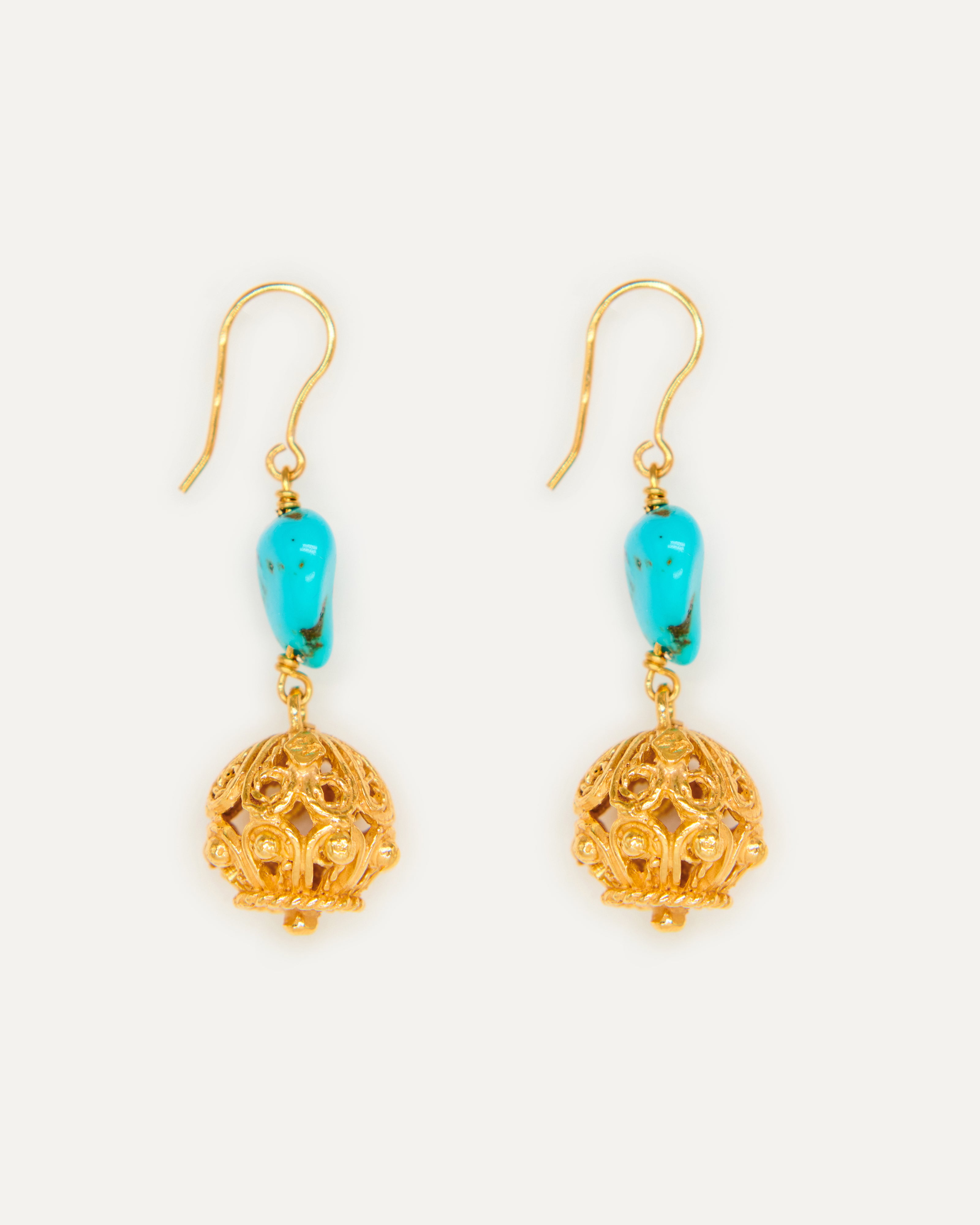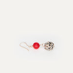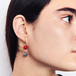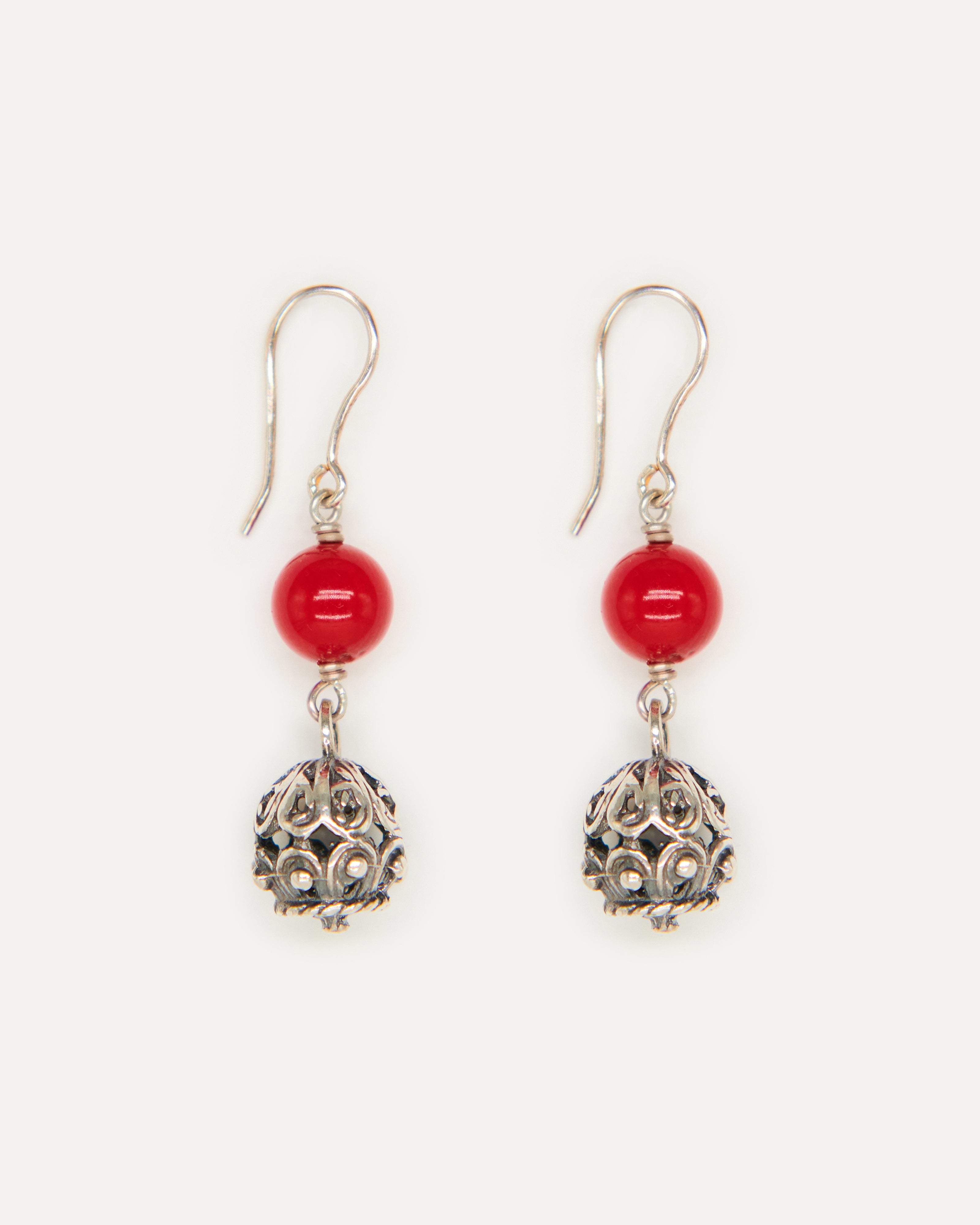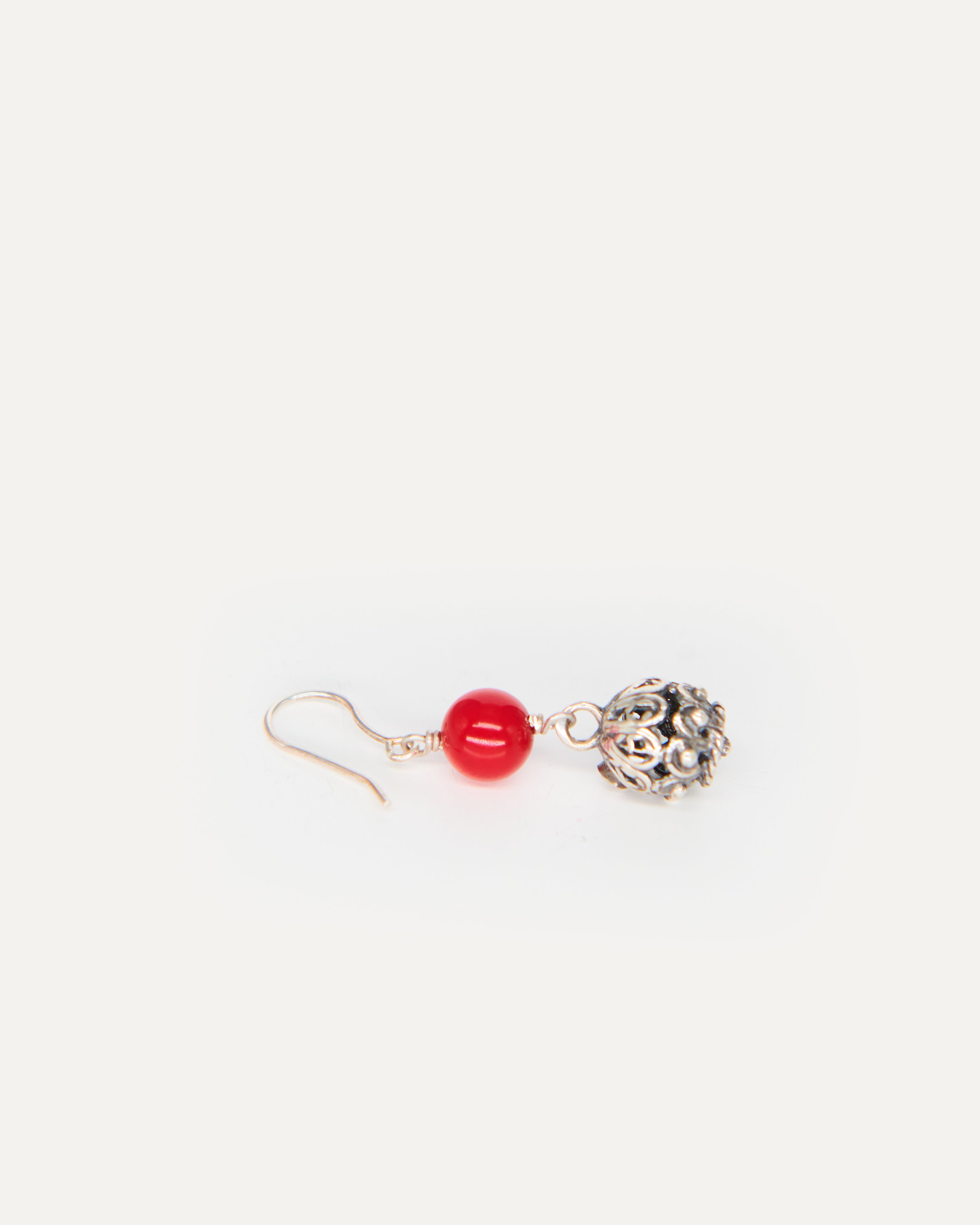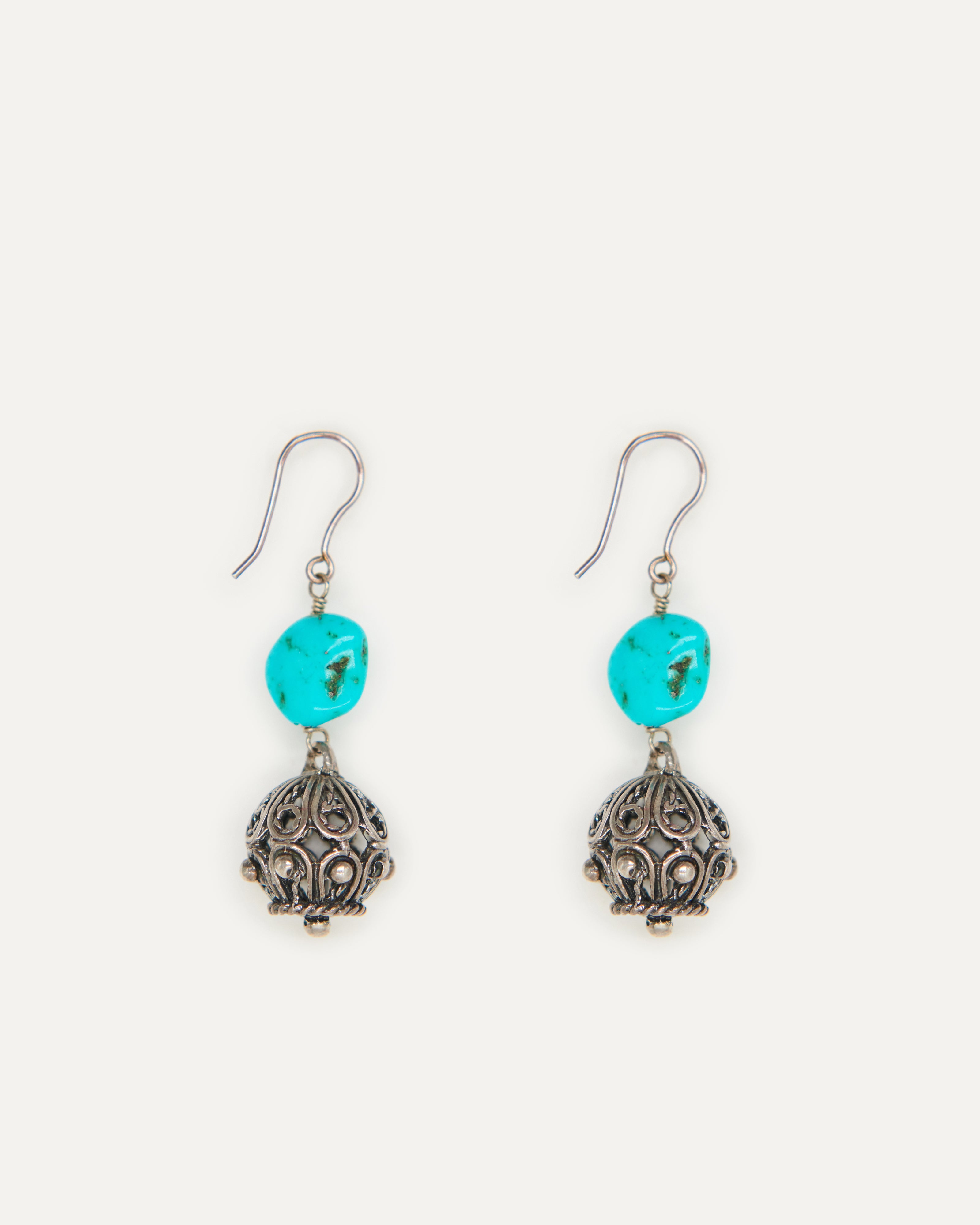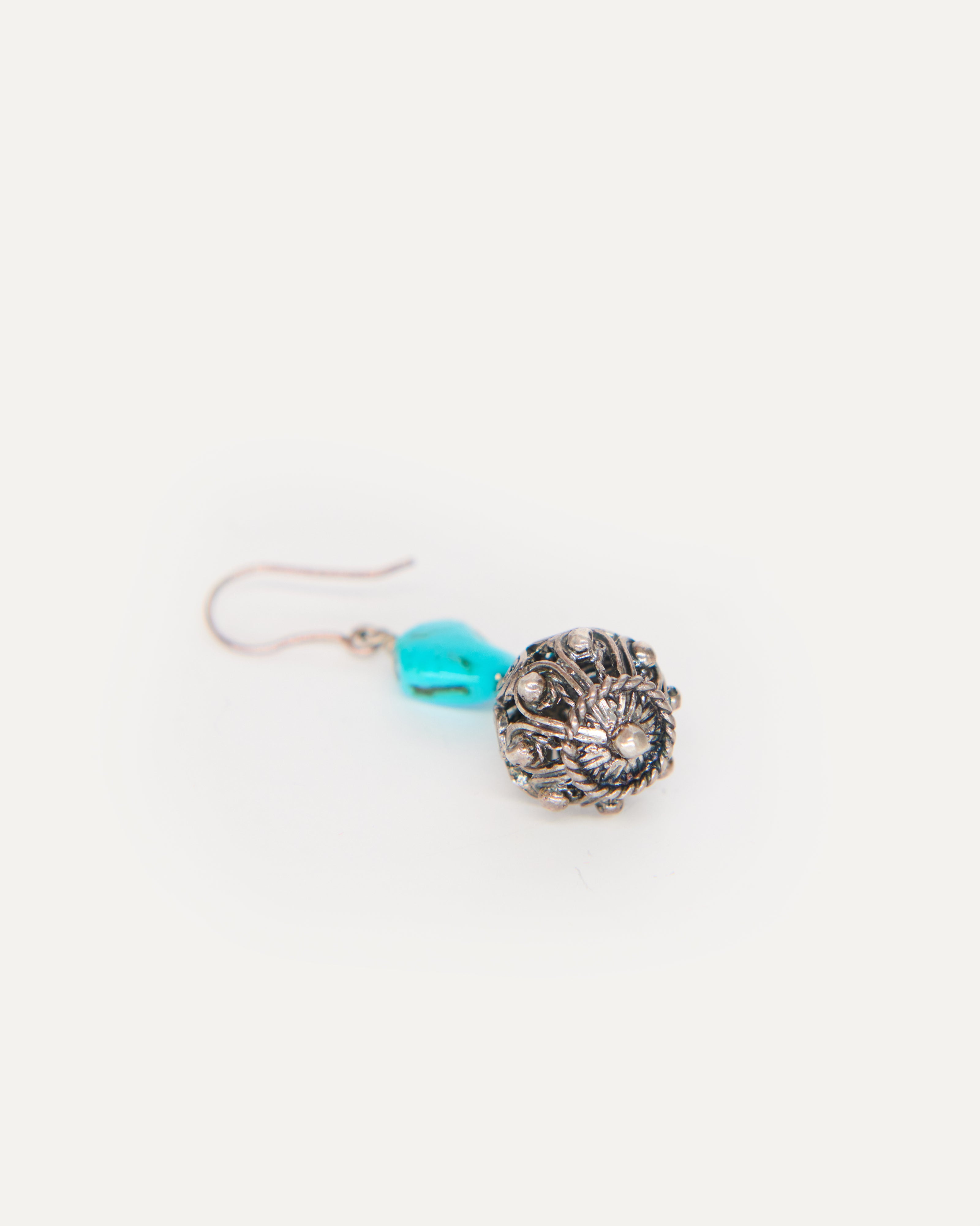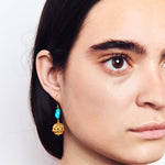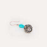 Pendientes inspirados en el tradicional botón de 'Jupetí'. El 'Jupetí' es el chaleco que usan los hombres para el baile tradicional ibicenco, el 'ball pagès', y que luce 24 botones de plata que van pasando de generación en generación. En este caso, Elisa le ha querido dar diferentes toques de color con una piedra semipreciosa.