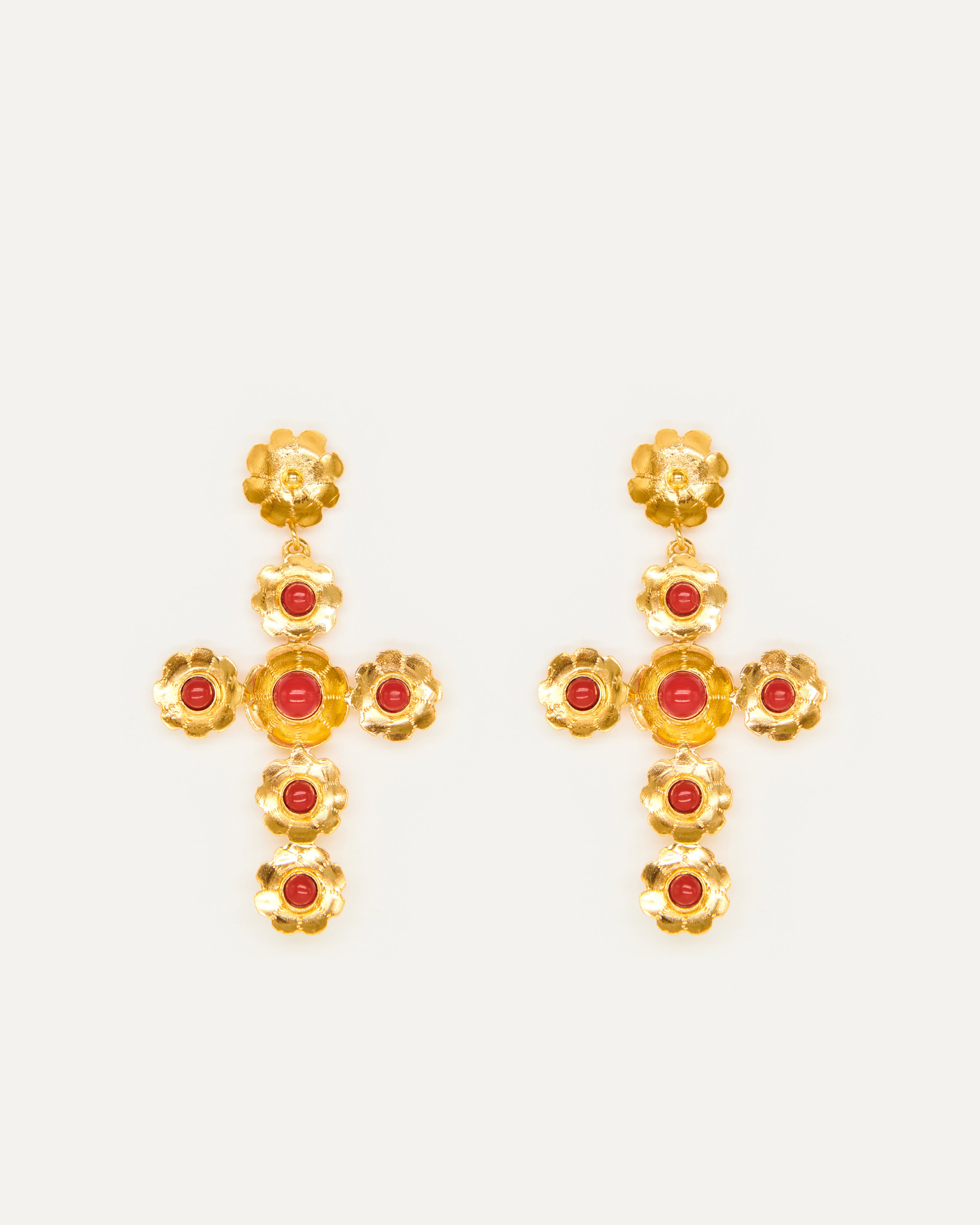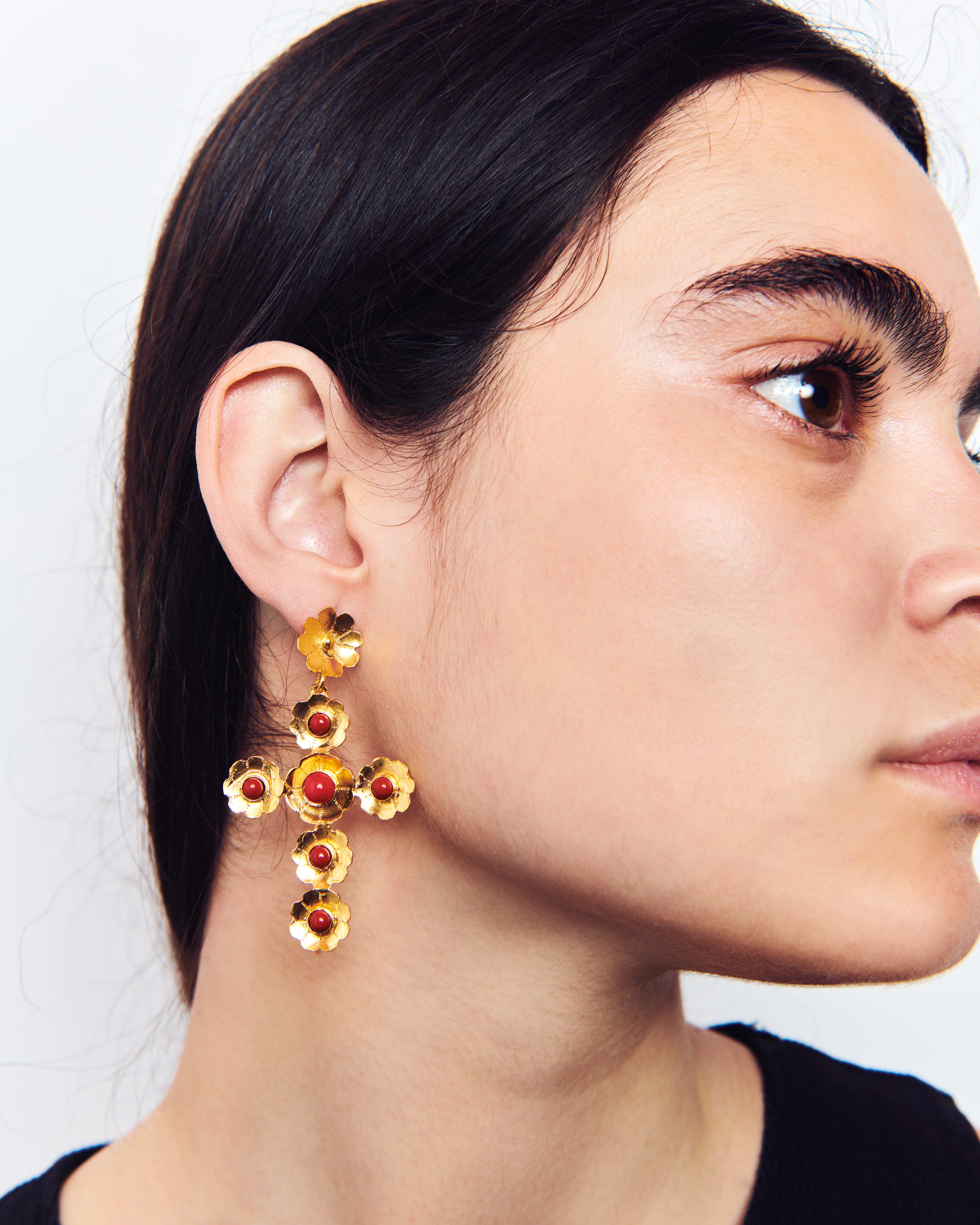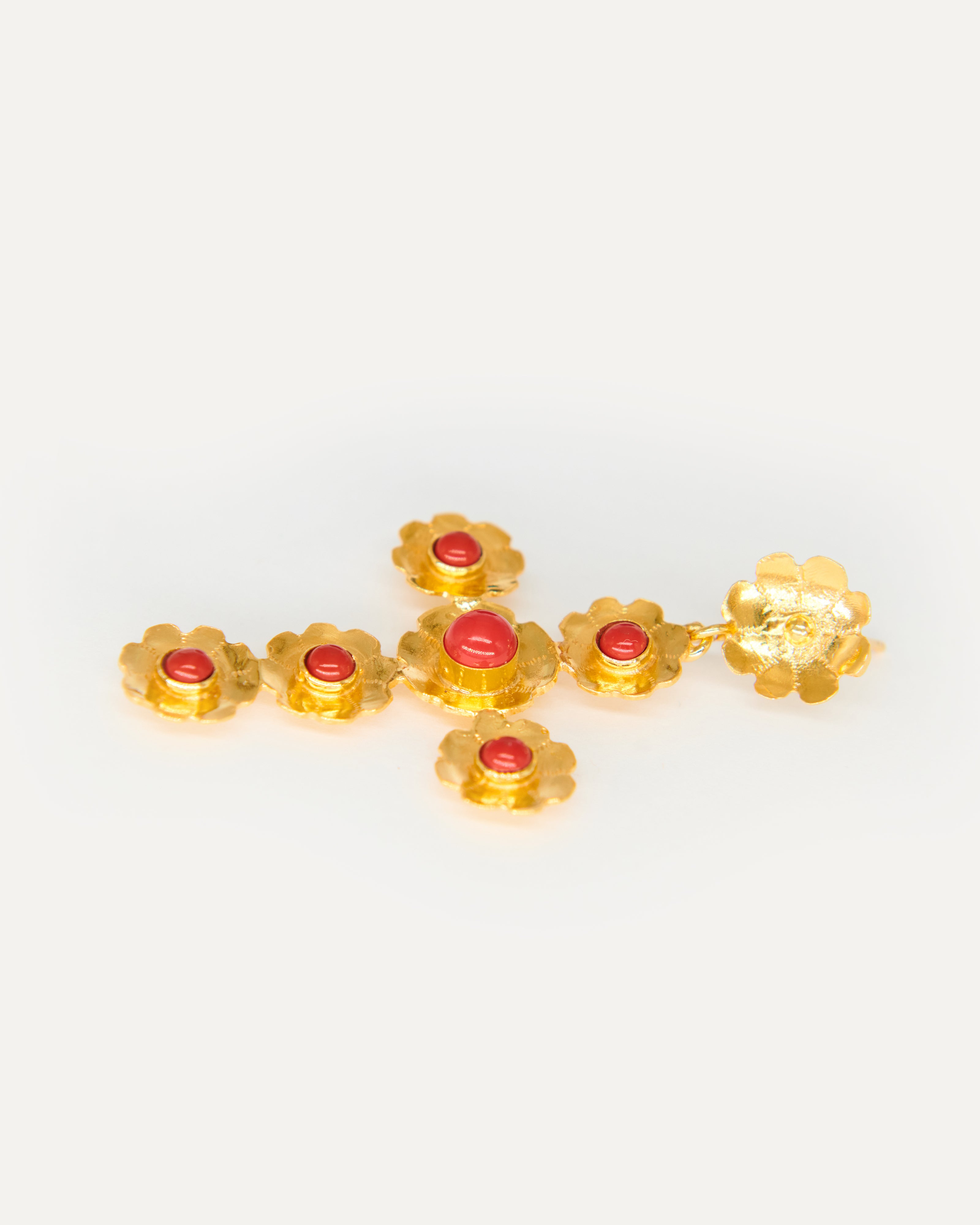 Estos pendientes son un diseño propio de Elisa basado en tres pilares fundamentales de la tradición ibicenca: la cruz, las flores y el coral. La diseñadora quería dedicarle esta joya a Sant Elm, la iglesia de La Marina donde vive la Virgen del Carmen, patrona y protectora de los marineros y de los amantes del mar, además de ser el lugar donde se casaron los padres de la artista ibicenca y la bautizaron a ella y a sus dos hermanas.