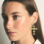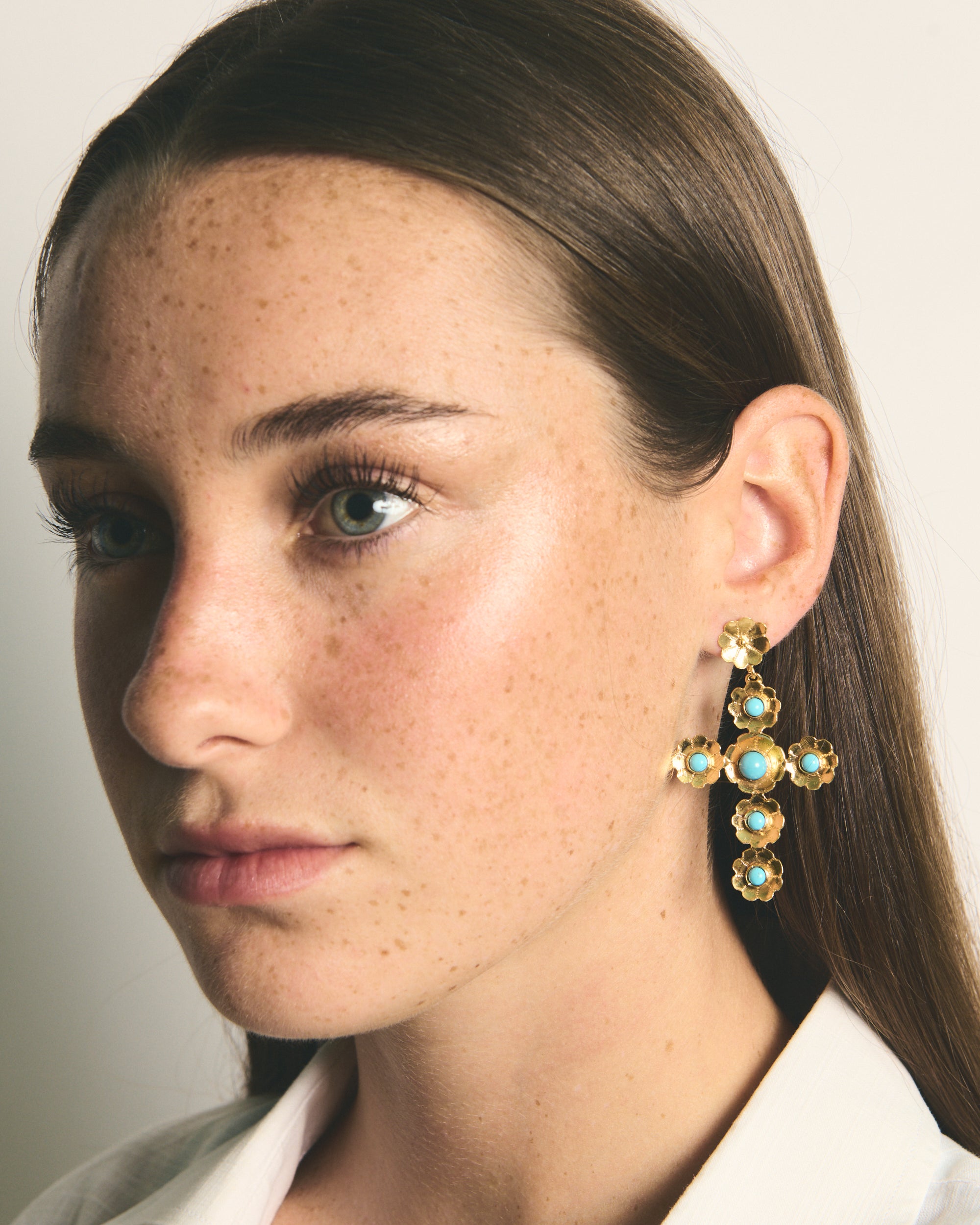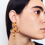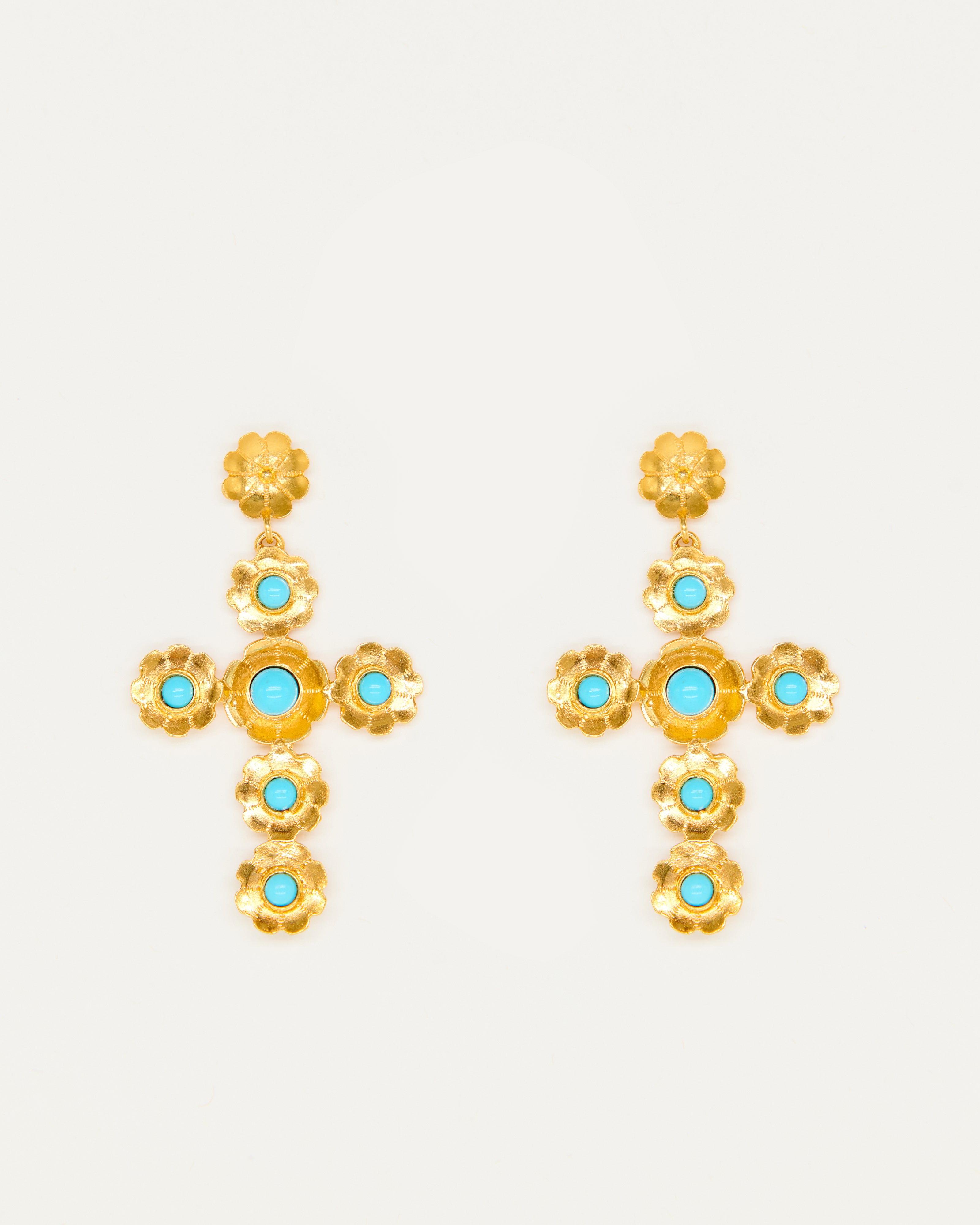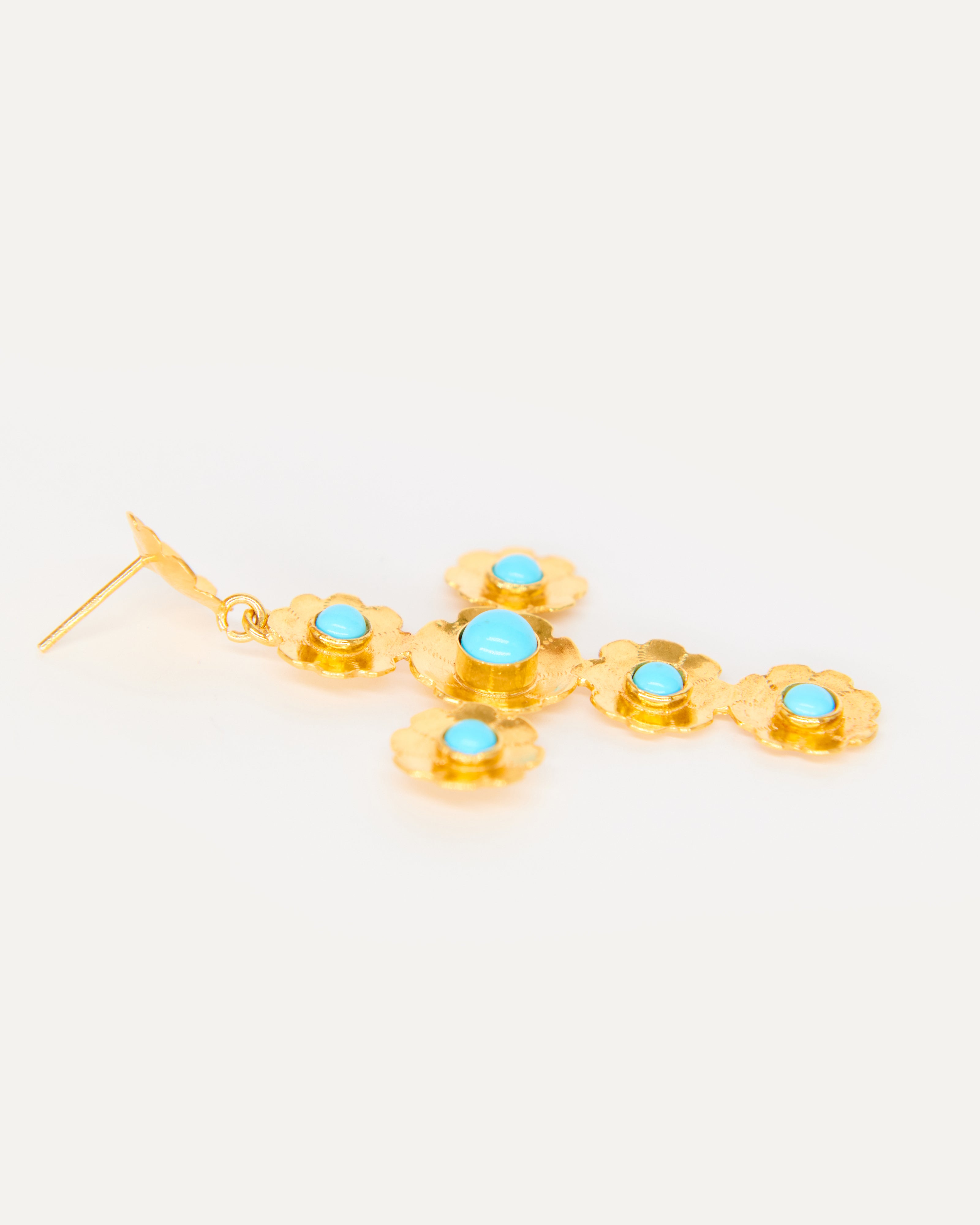 Estos pendientes son un diseño propio de Elisa basado en tres pilares fundamentales de la tradición ibicenca: la cruz, las flores y el coral. La diseñadora quería dedicarle esta joya a Sant Elm, la iglesia de La Marina donde vive la Virgen del Carmen, patrona y protectora de los marineros y de los amantes del mar, además de ser el lugar donde se casaron los padres de la artista ibicenca y la bautizaron a ella y a sus dos hermanas.