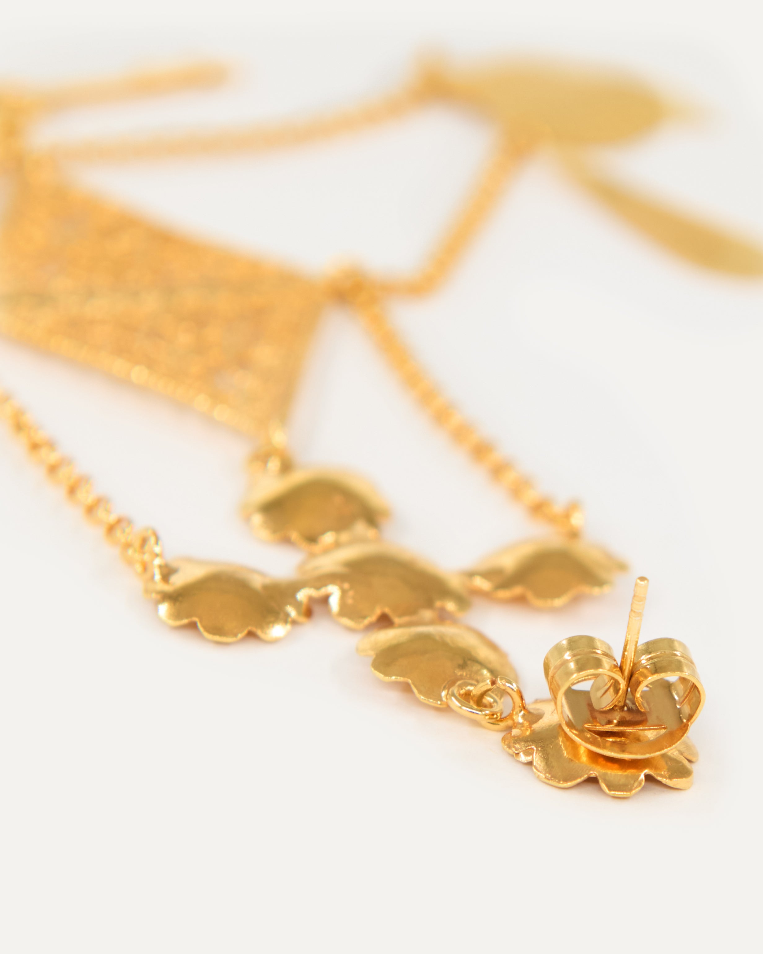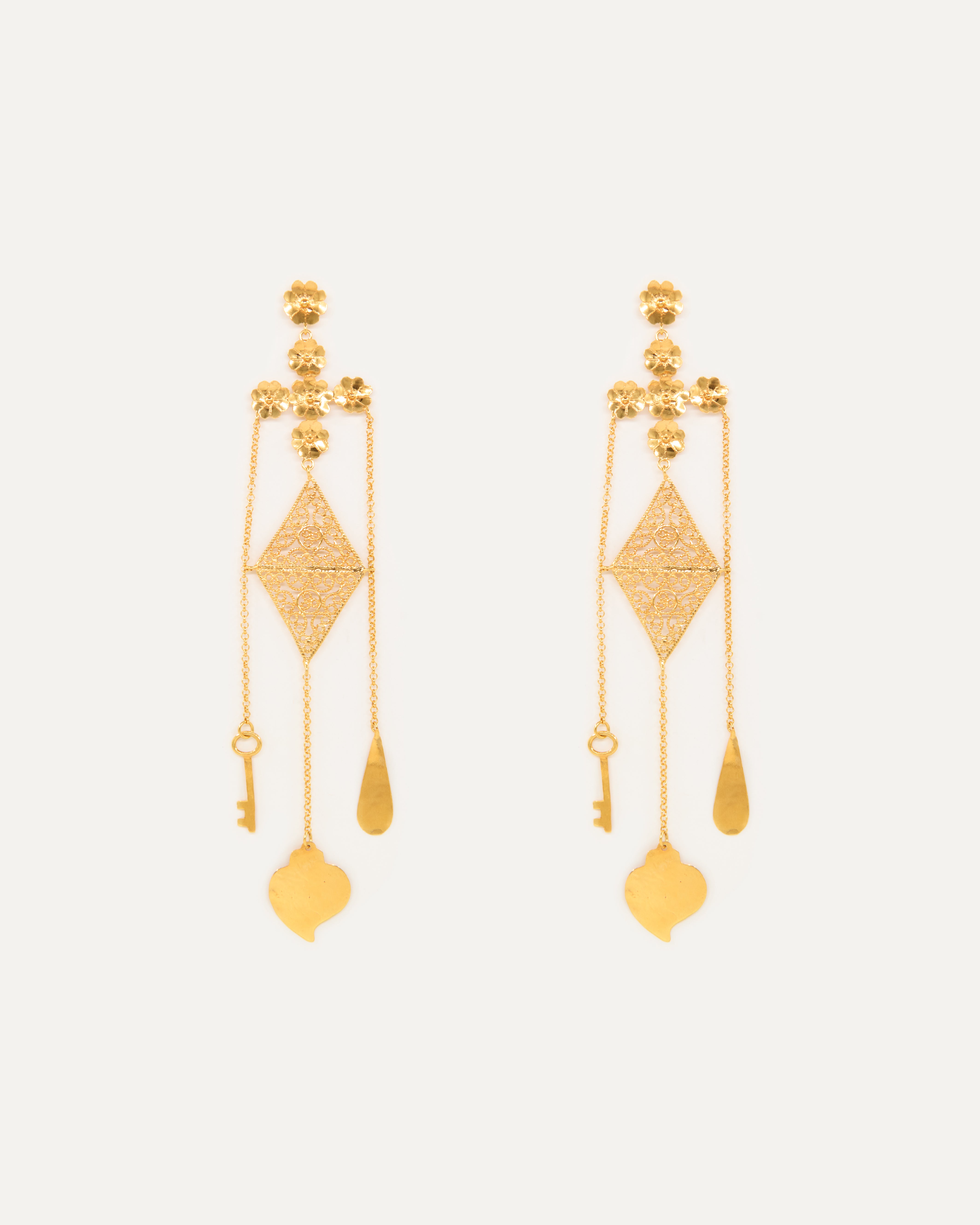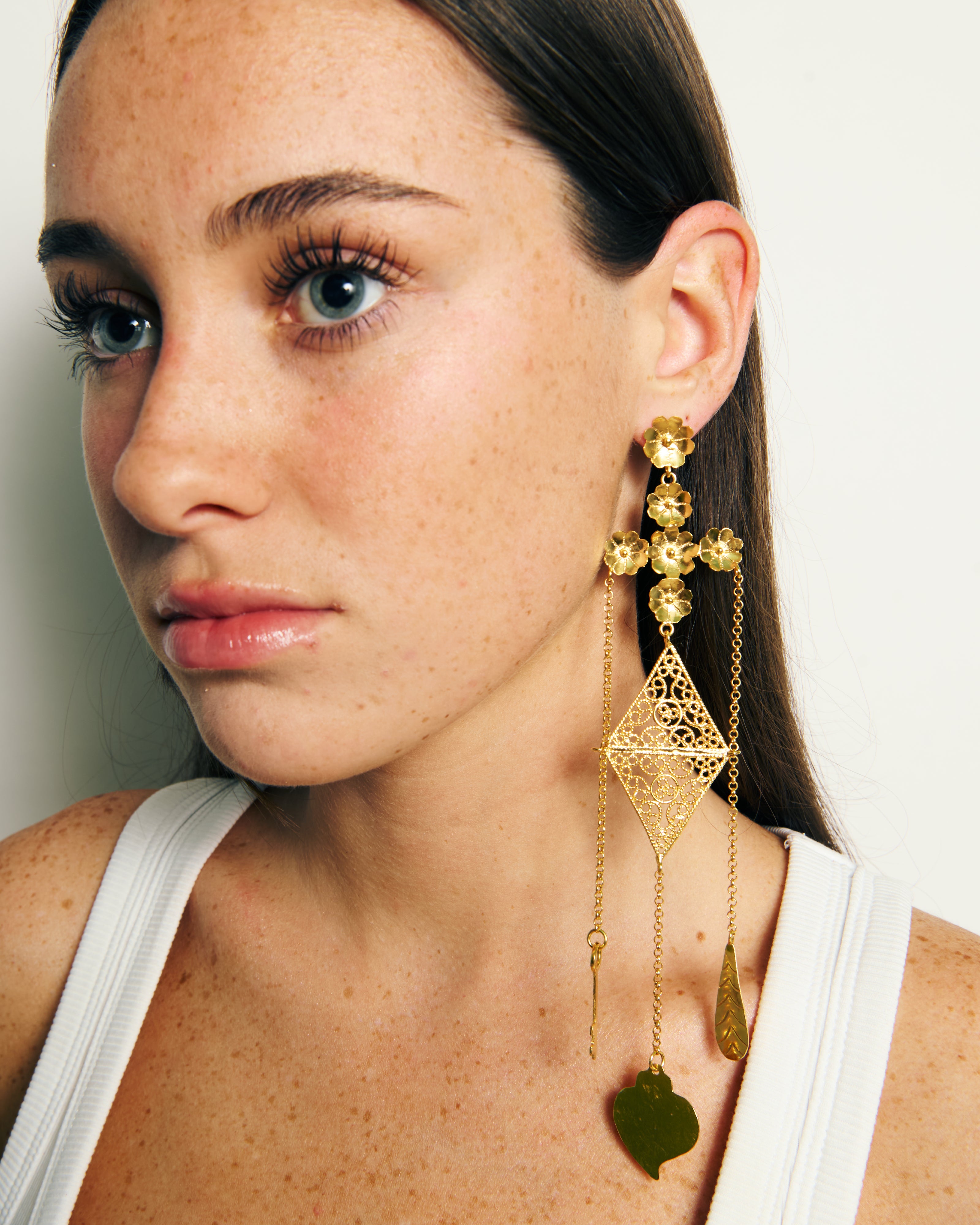 Estos pendientes propios de Elisa son una mezcla entre la cultura egipcia y la ibicenca. La diseñadora quiso combinar elementos tradicionales de la joyería ibicenca para crear una pieza para Bastet, una diosa egipcia de formas felinas y provista de un pendiente de oro que Elisa descubrió en su viaje a Egipto.