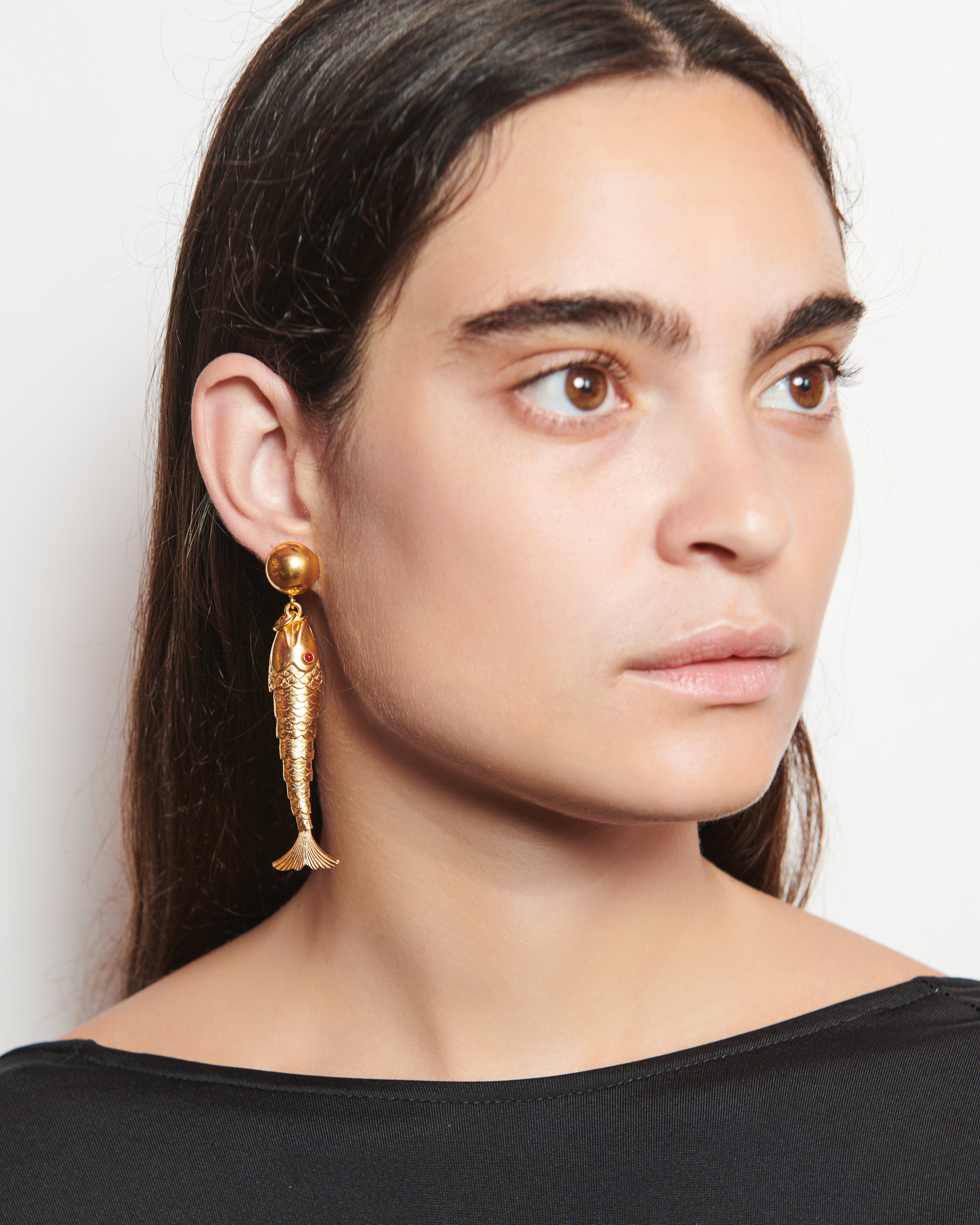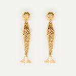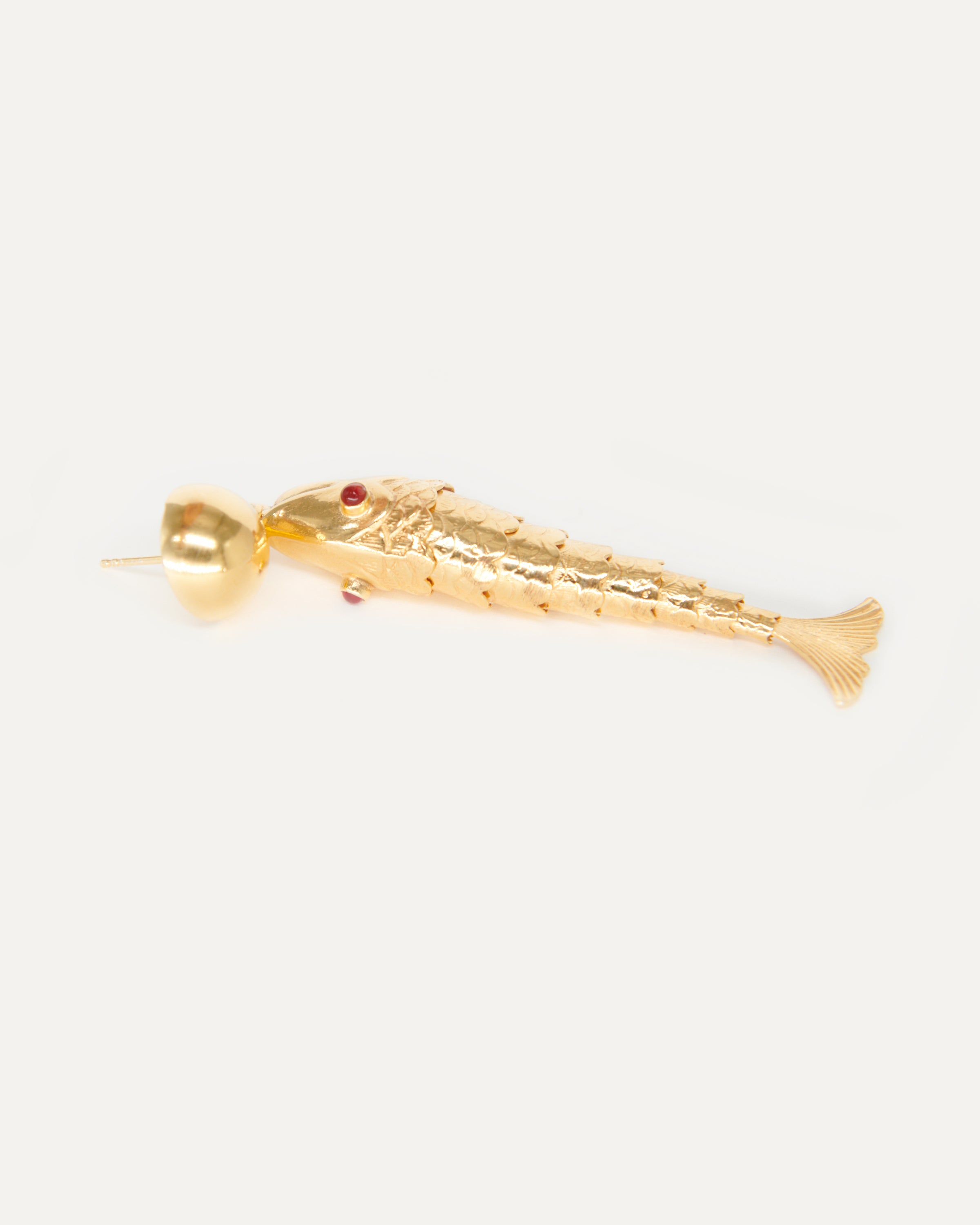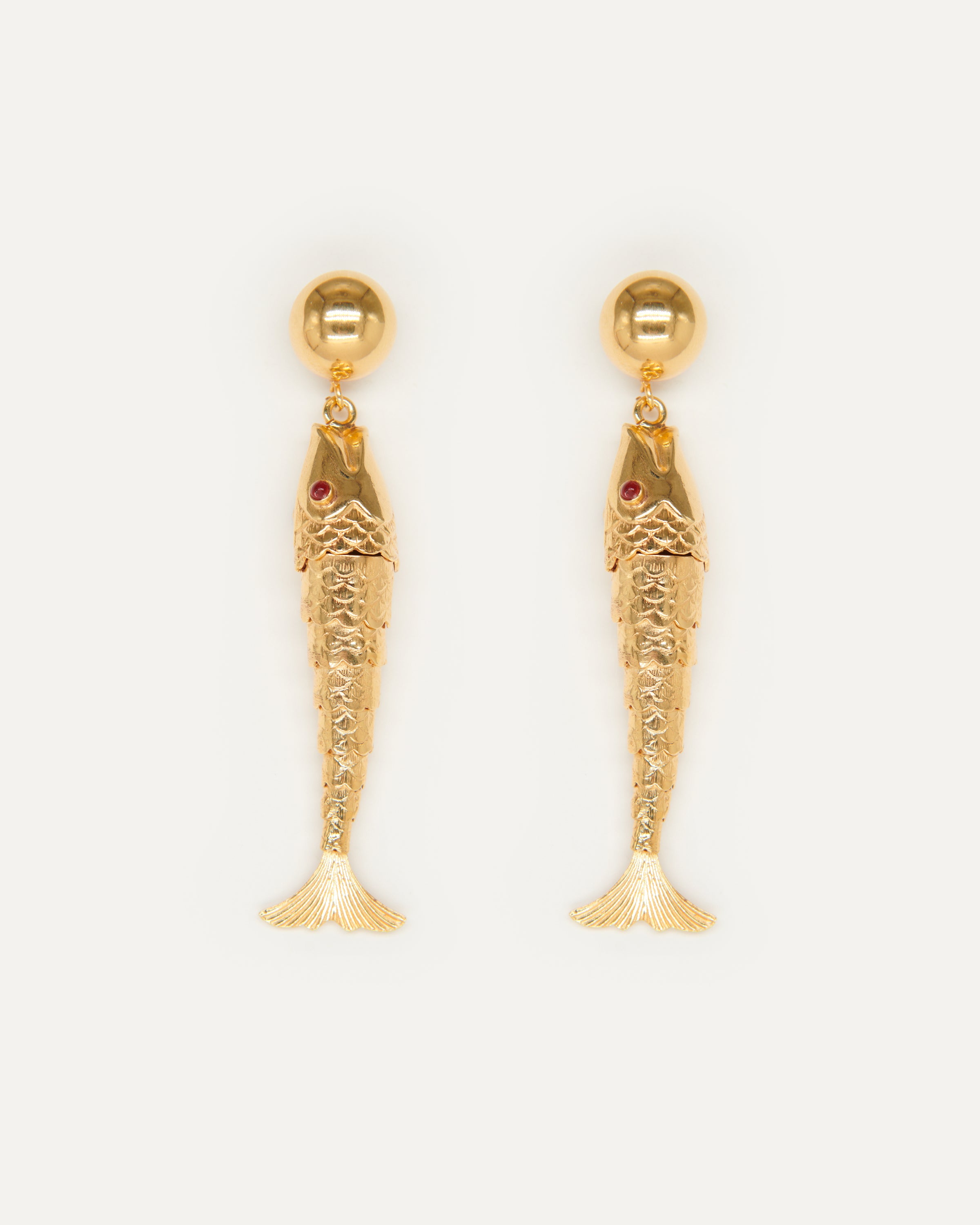 Estos pendientes son una versión del pez que Pepín, padre de Elisa, le regaló a su hija cuando apenas tenía cinco años como amuleto. Actualmente, Elisa ha transformado esta pieza y le ha dado el nombre de Posidonio, inspirado en el filósofo griego que estudiaba los mares y en honor a los campos de 'posidònia' que hacen que los mares de Ibiza y Formentera sean así de cristalinos. En este diseño, Elisa aumenta el tamaño del pez en honor a su eslógan 'More is More' y opta por el cierre en forma de bola, uno de los cierres favoritos de la marca.