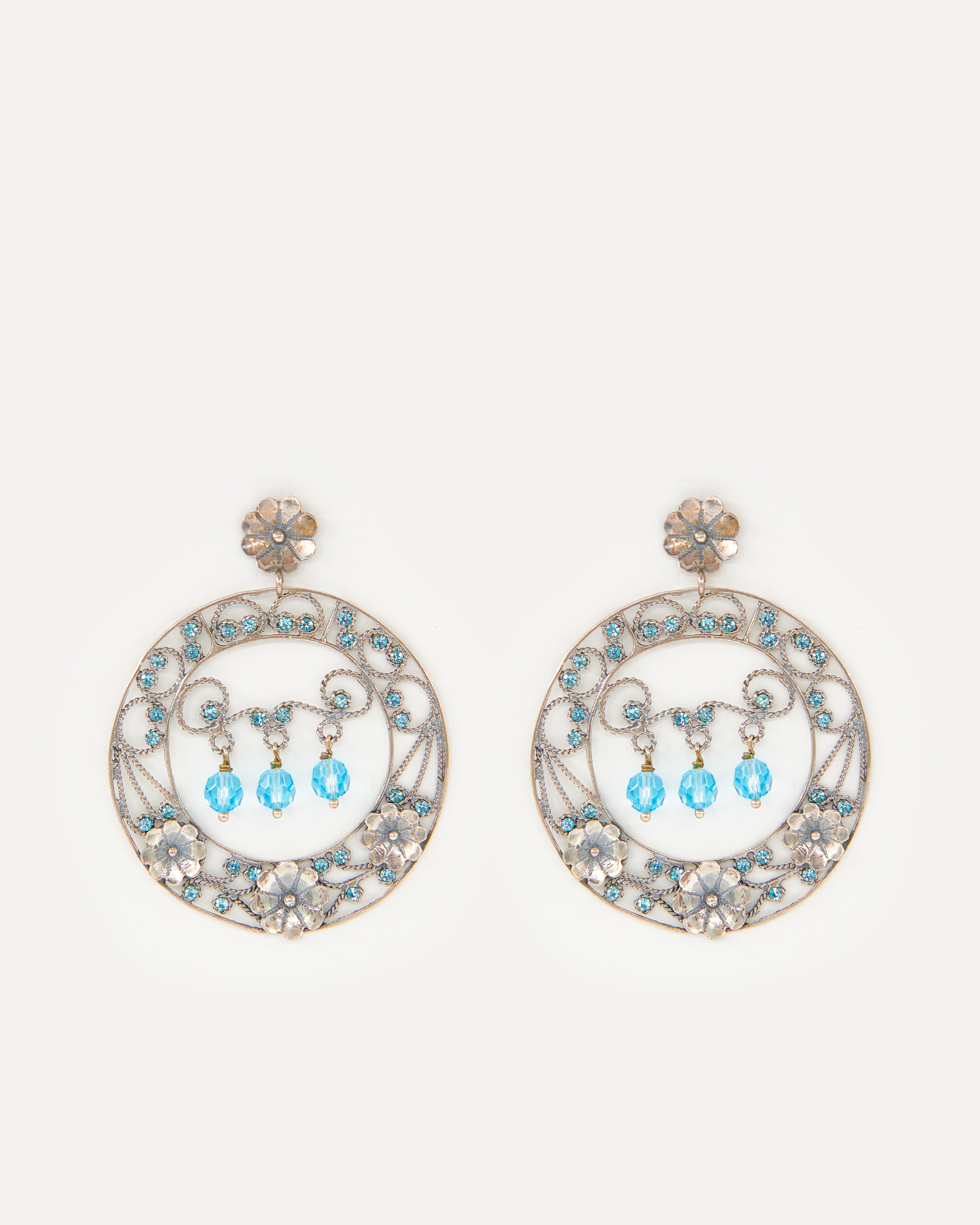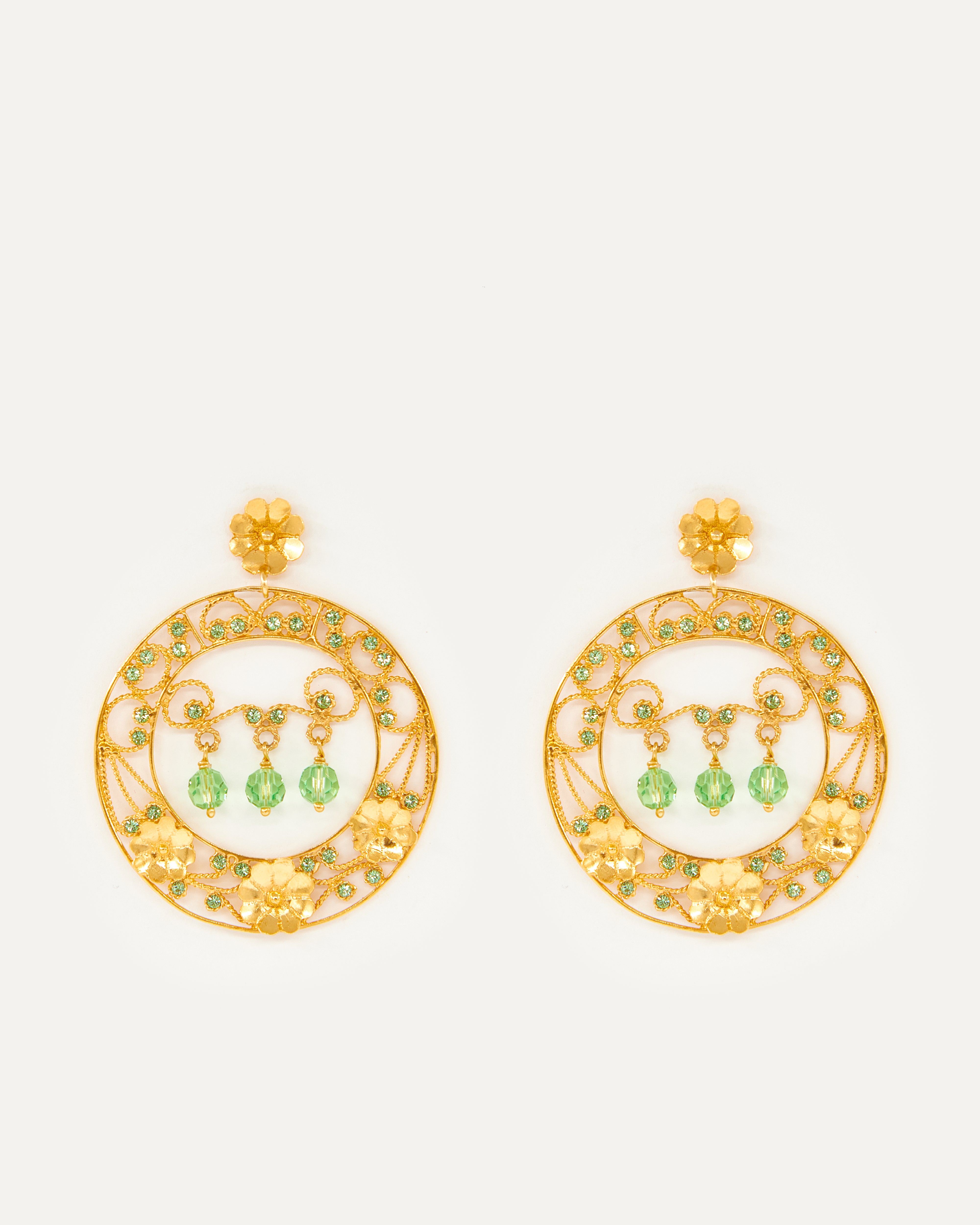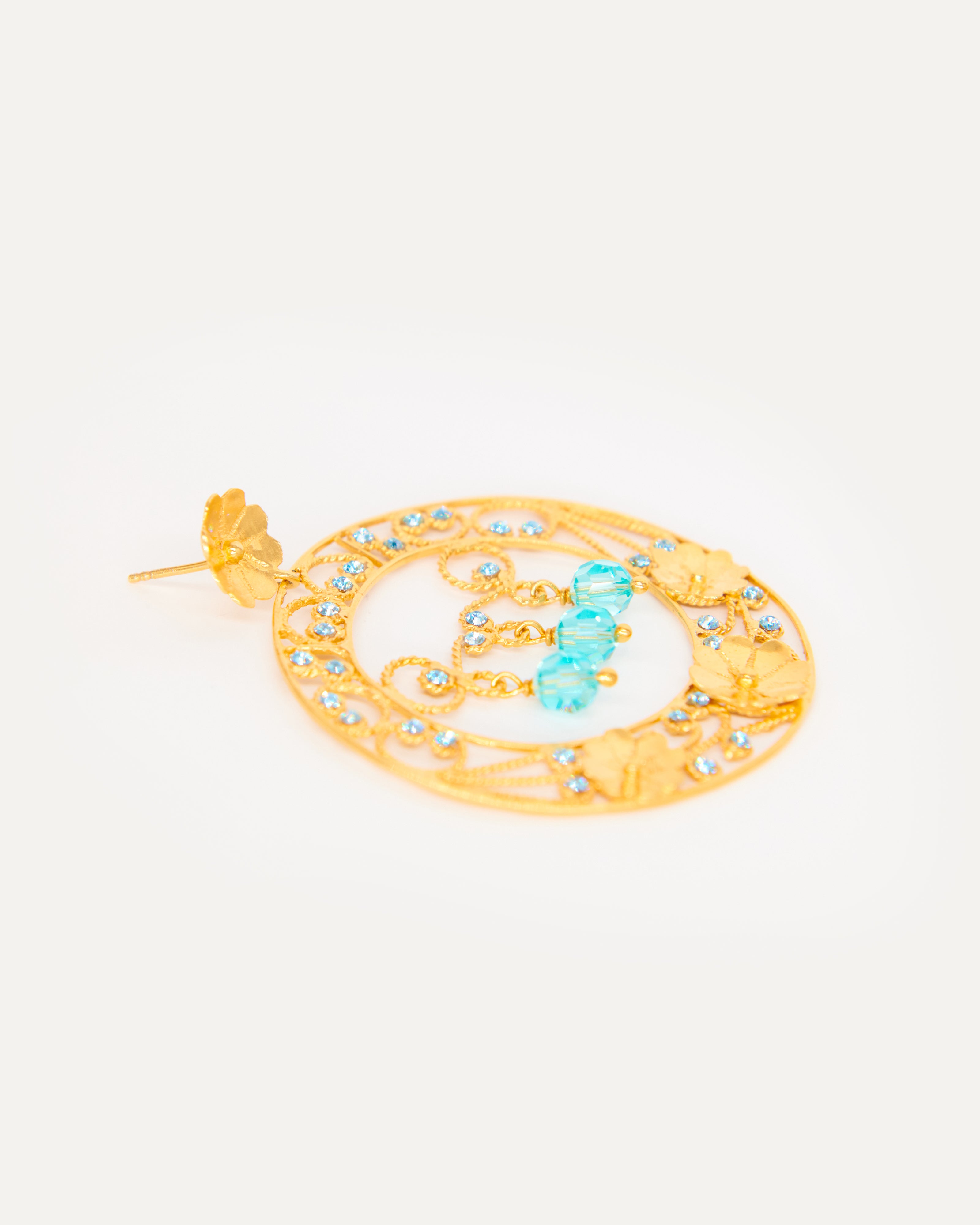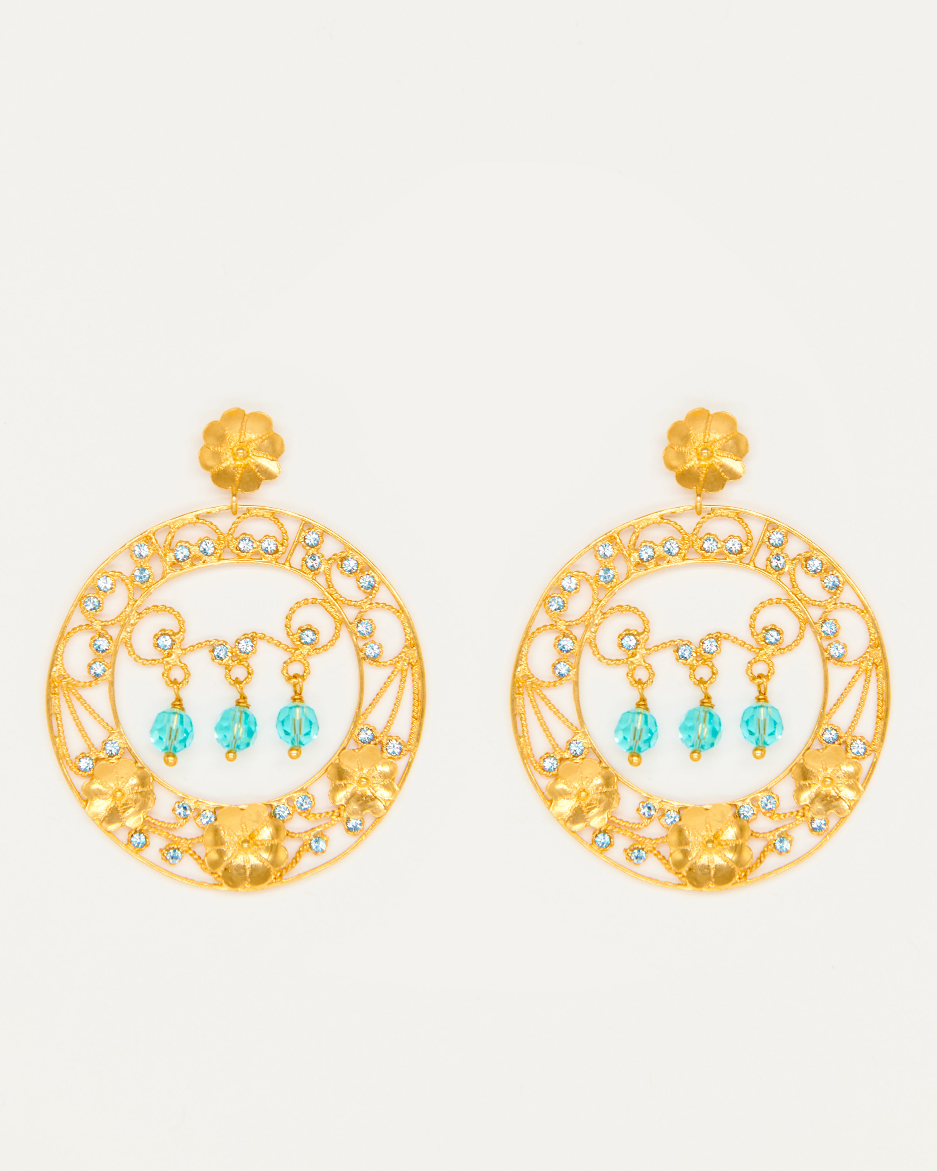 Pendientes inspirados en la clásica 'ferradura' ibicenca. A Elisa, esta tradicional pieza siempre le ha recordado a la Luna, un elemento muy influyente en el movimiento del mar, gran inspiración para la diseñadora. La luna llena de agosto ibicenca siempre ha sido una de las musas de Elisa como una representación total de plenitud y la ha querido transformar en pendientes con este diseño, además de un toque de color con cristales de primera calidad.