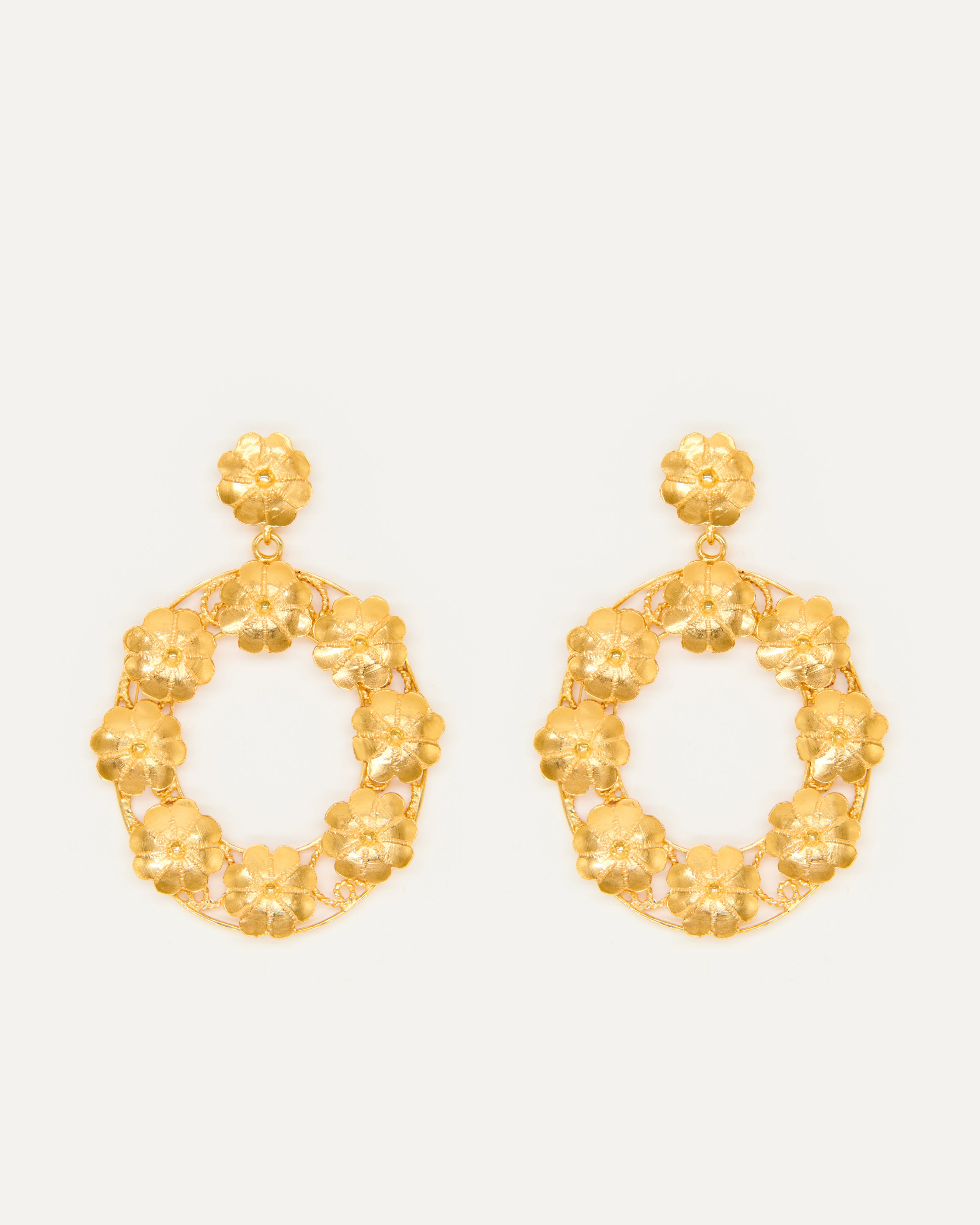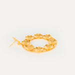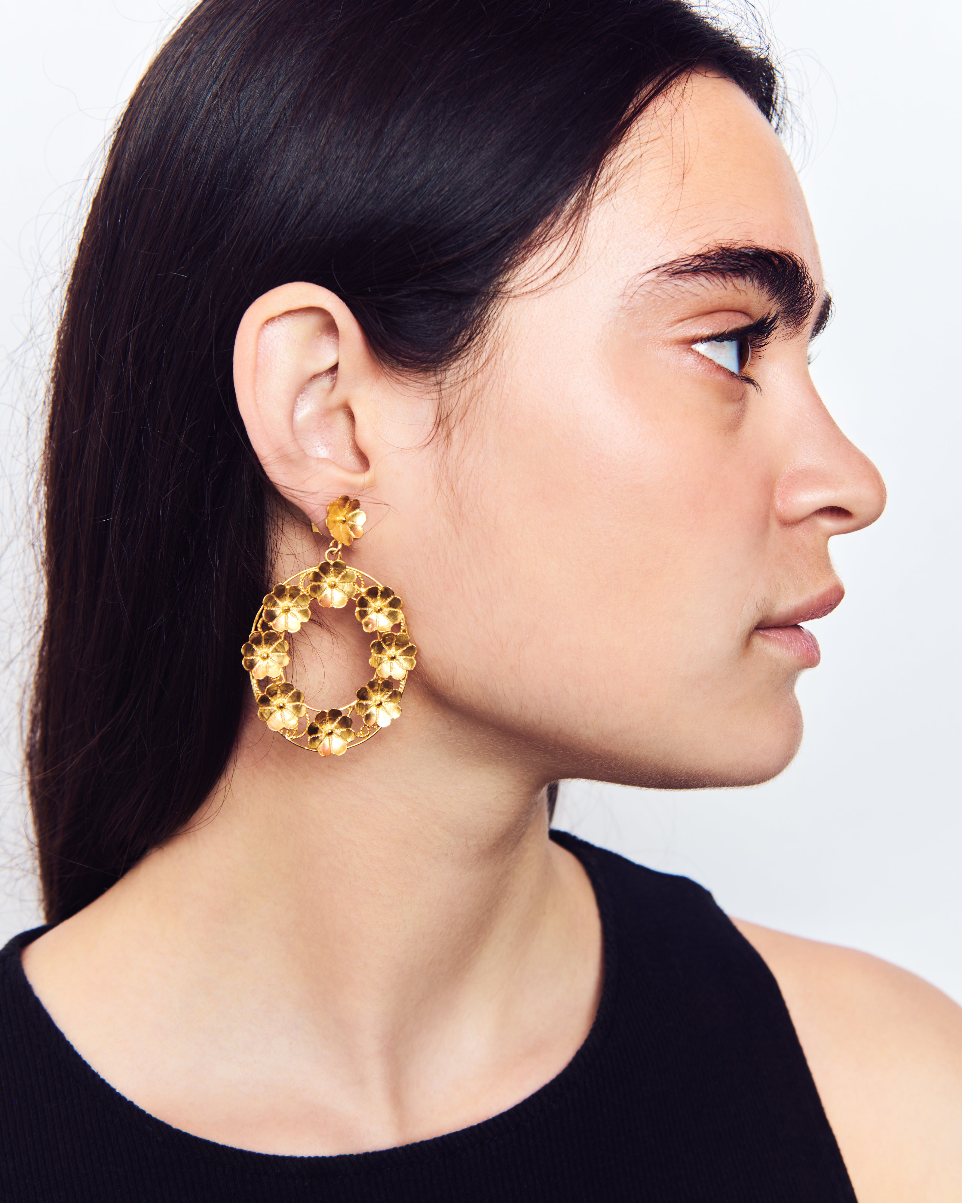 Pendientes inspirados en la clásica 'ferradura' ibicenca. A Elisa, esta tradicional pieza siempre le ha recordado a la Luna, un elemento muy influyente en el movimiento del mar, gran inspiración para la diseñadora y desencadenante de una evolución a diferentes diseños actualmente esenciales para la marca. En estos pendientes, la diseñadora ha utilizado las flores para resaltar el espacio vacío de la Luna Nueva.