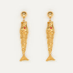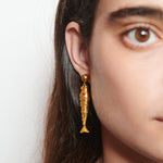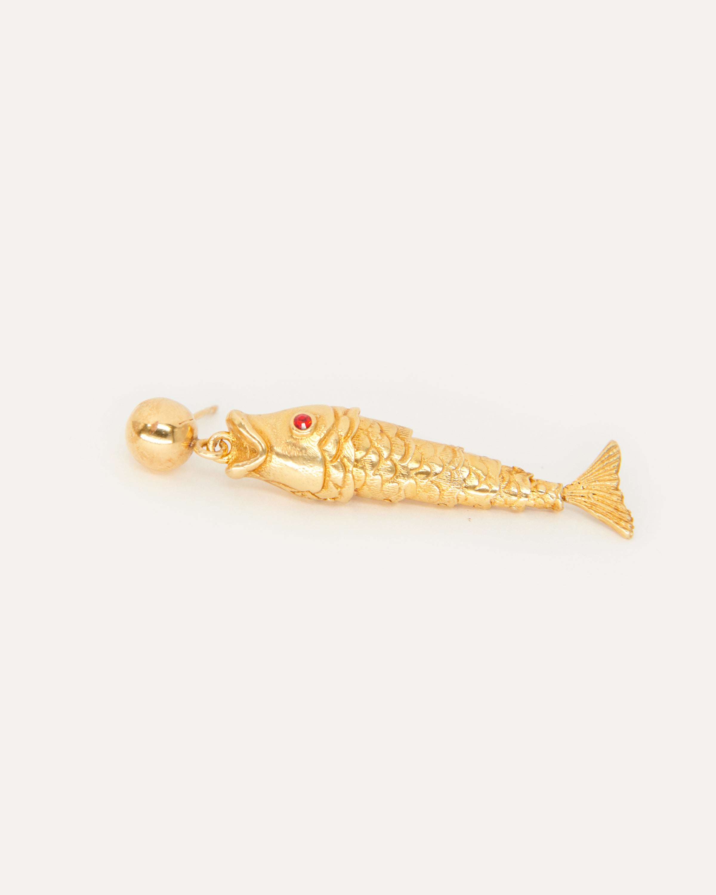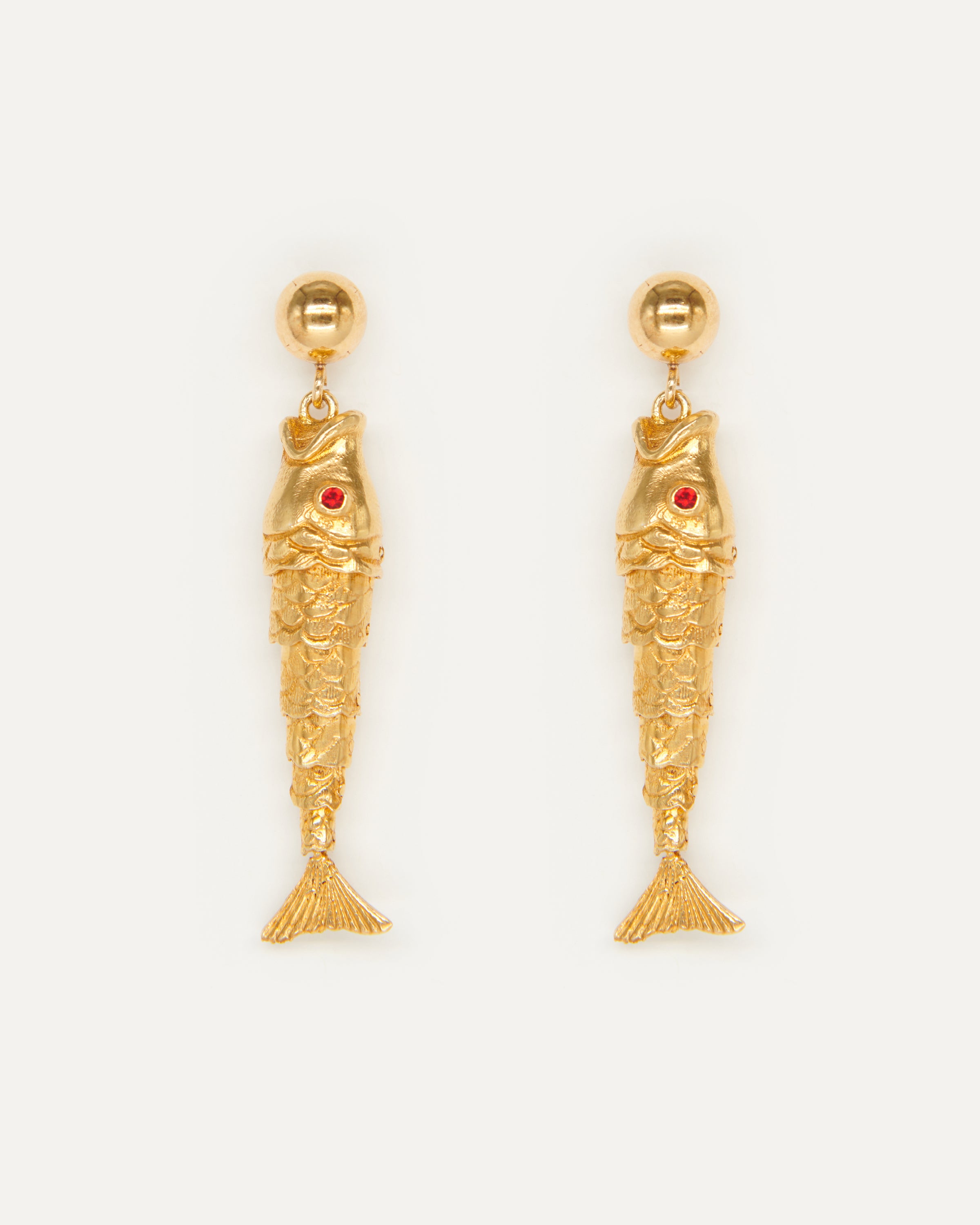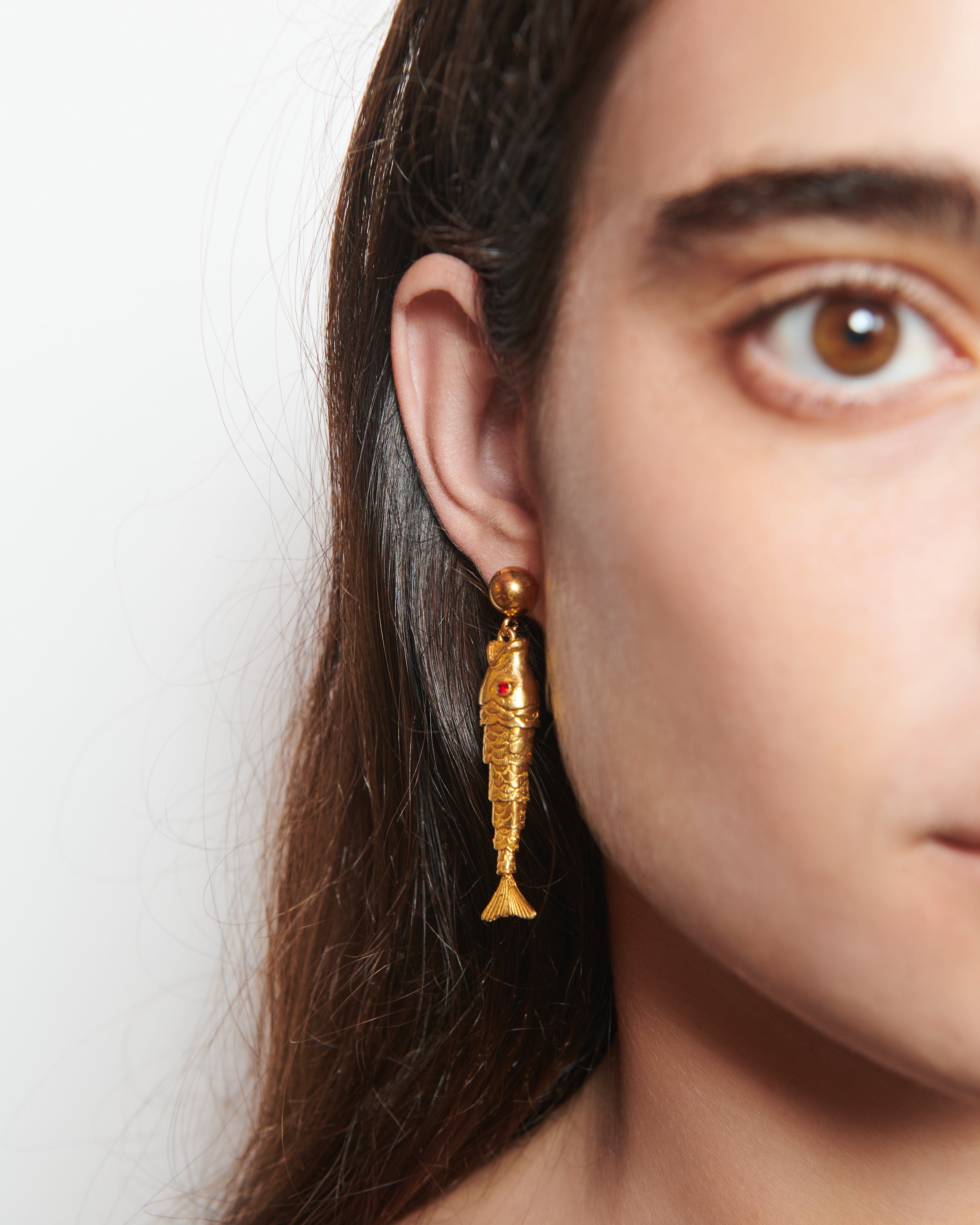 Estos pendientes son una versión del pez que Pepín, padre de Elisa, le regaló a su hija cuando apenas tenía cinco años como amuleto. Actualmente, Elisa ha transformado esta pieza y le ha dado el nombre de Posidonio, inspirado en el filósofo griego que estudiaba los mares y en honor a los campos de 'posidònia' que hacen que los mares de Ibiza y Formentera sean así de cristalinos. En este diseño, Elisa opta por el cierre en forma de bola, uno de los cierres favoritos de la marca.