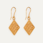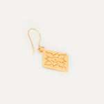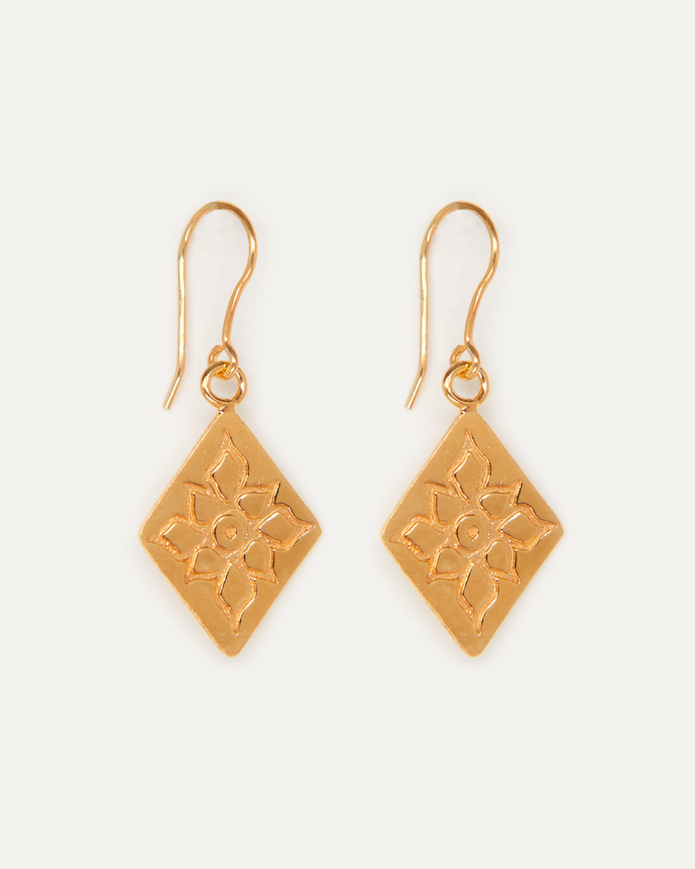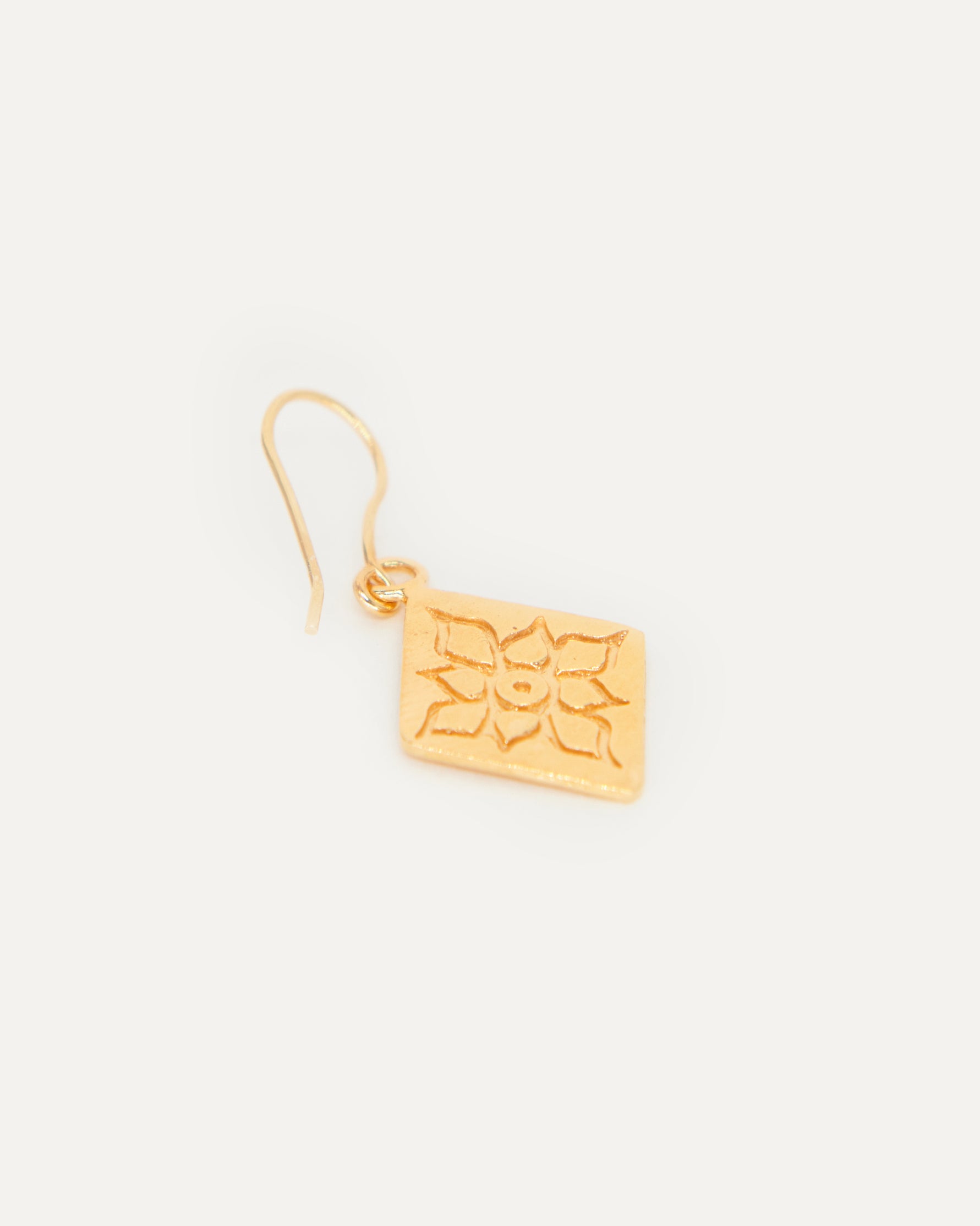 Estos pendientes pertenece a la edición fenicia, un conjunto de joyas que Elisa crea en honor a la civilización que convirtió Ibiza en un enclave estratégico mundial. Su afán por evolucionar la joyería, el uso de cristales de colores o la fascinación por el oro son rasgos propiamente fenicios que forman parte del ADN de la marca ibicenca. Por esa razón, la diseñadora ha optado por elementos como este rombo grabado para homenajear a este pueblo tan influyente en Ibiza.