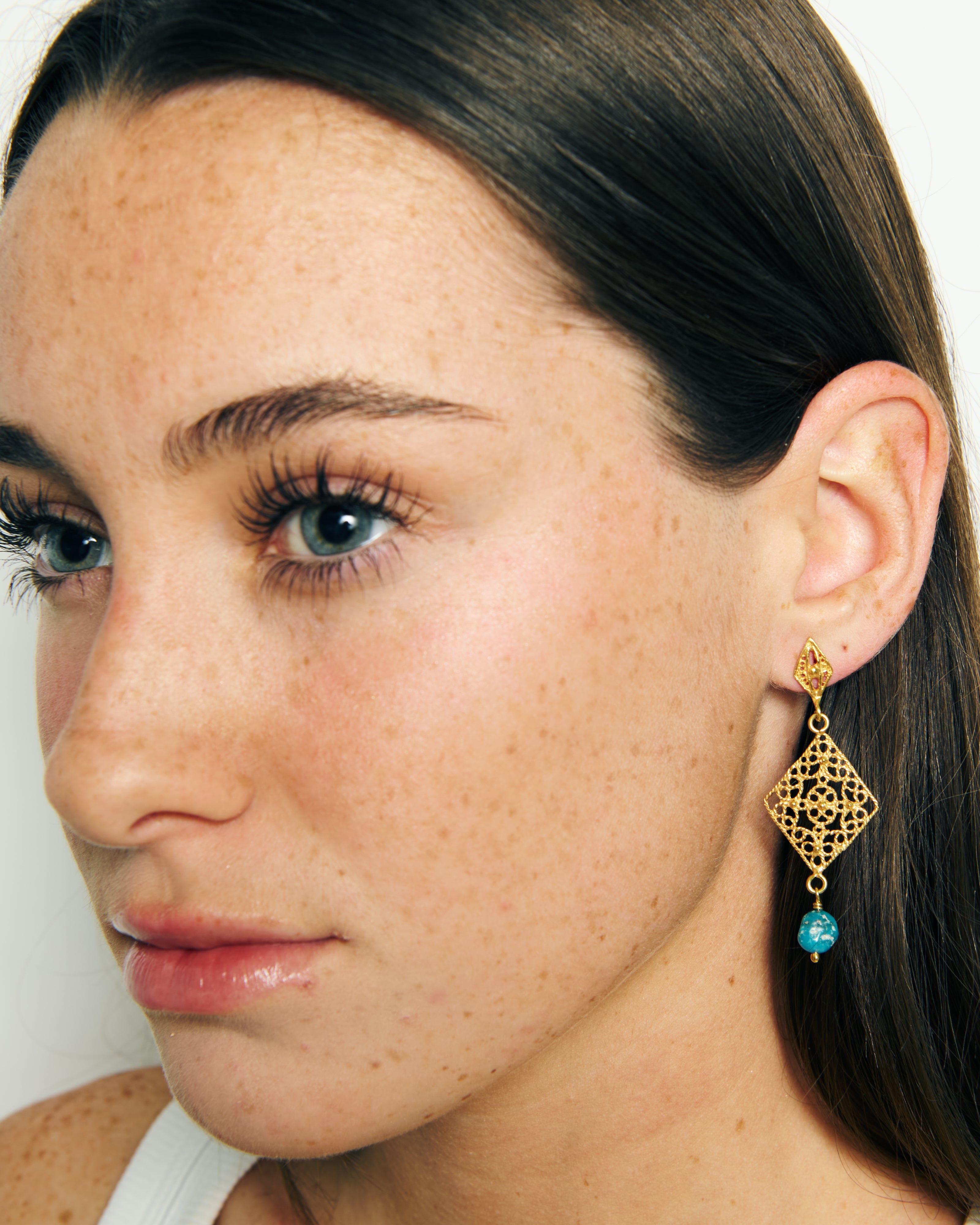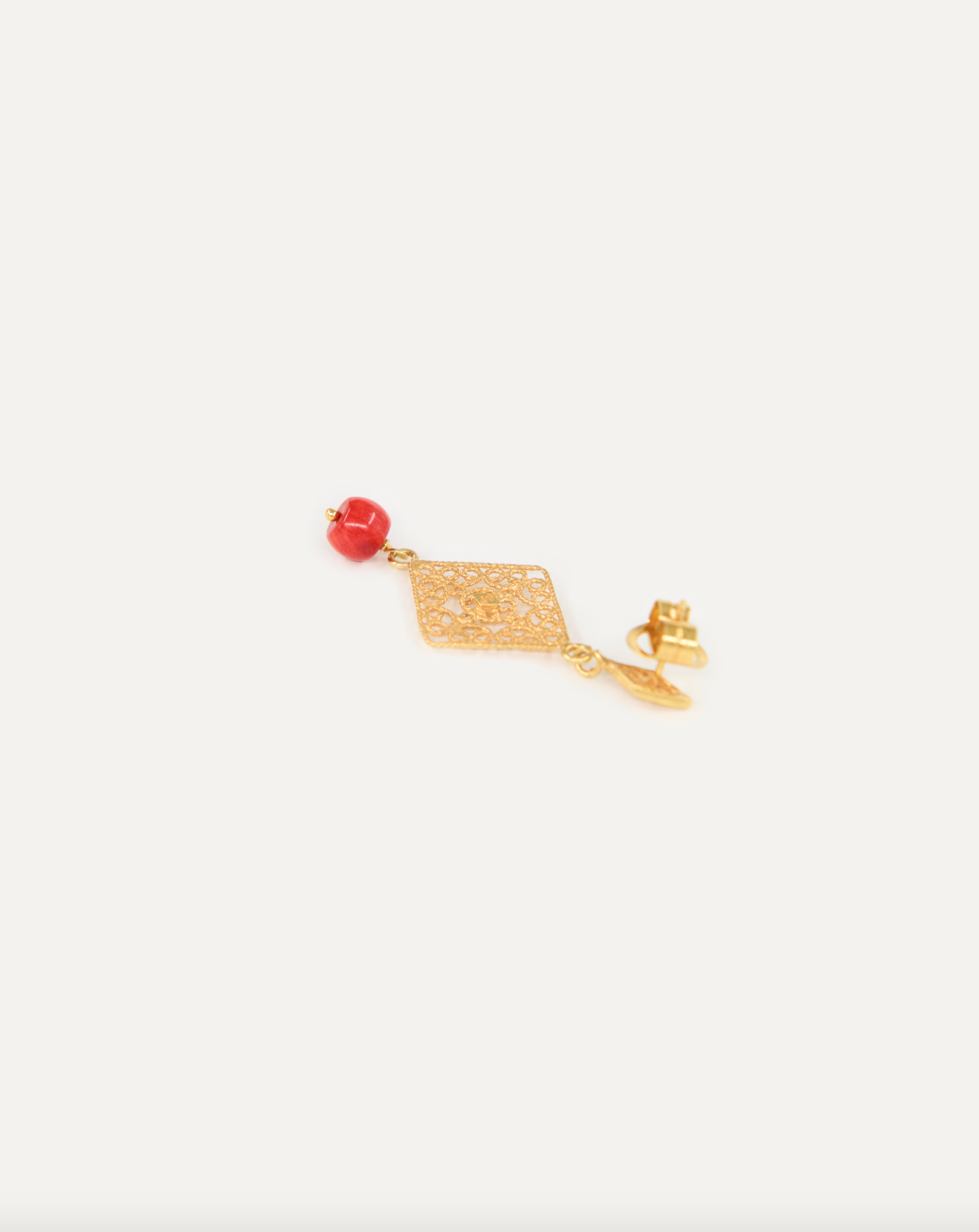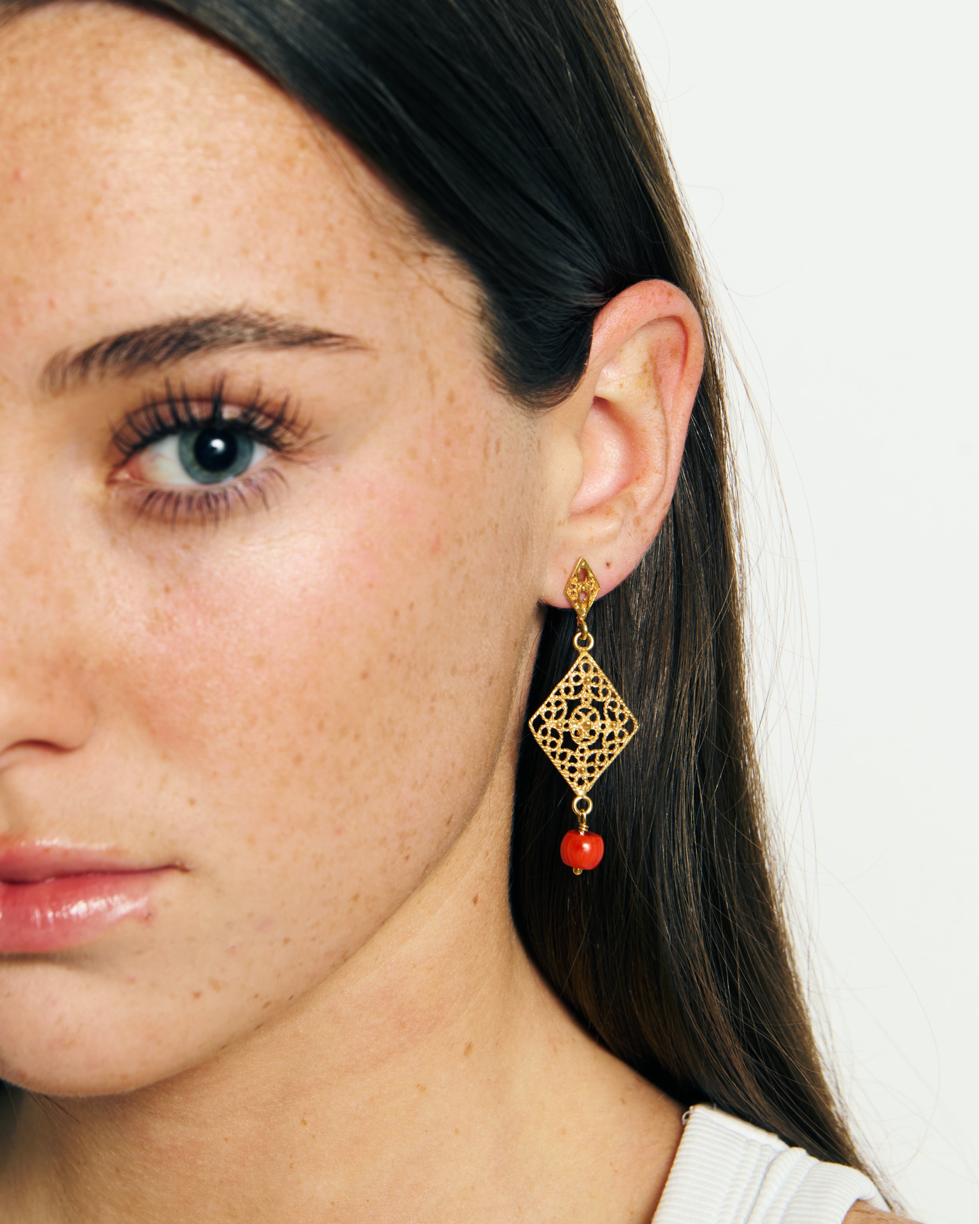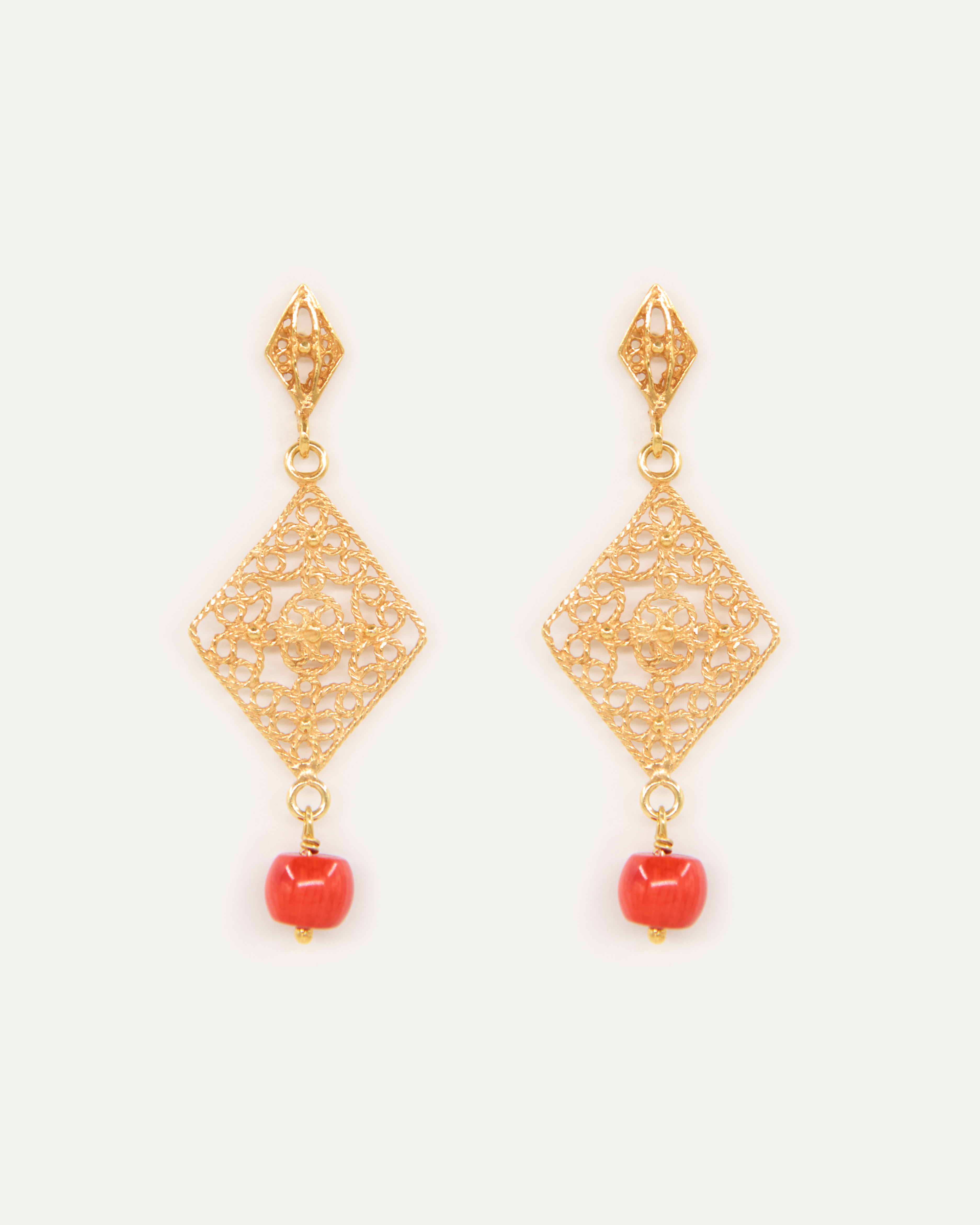 Estos pendientes recuperan la esencia rural de Ibiza y la traducen a un lenguaje contemporáneo. Elisa Pomar reinterpreta la filigrana tradicional de la joyería ibicenca y la transforma en una versión plana y depurada, junto con elementos tan esenciales como el coral o la turquesa manteniendo su alma ancestral. Joyas que no adornan: revelan.